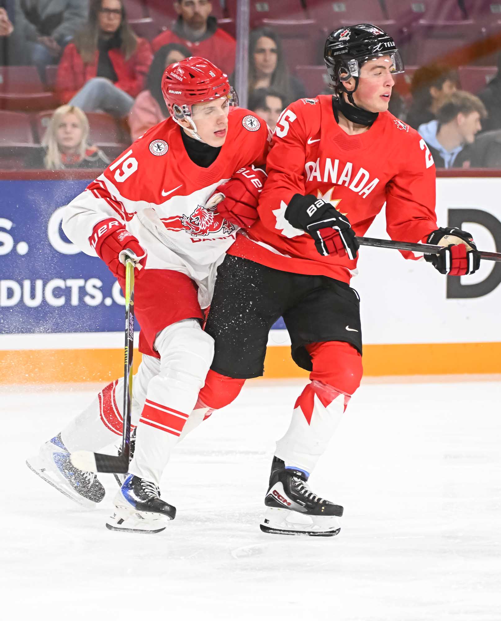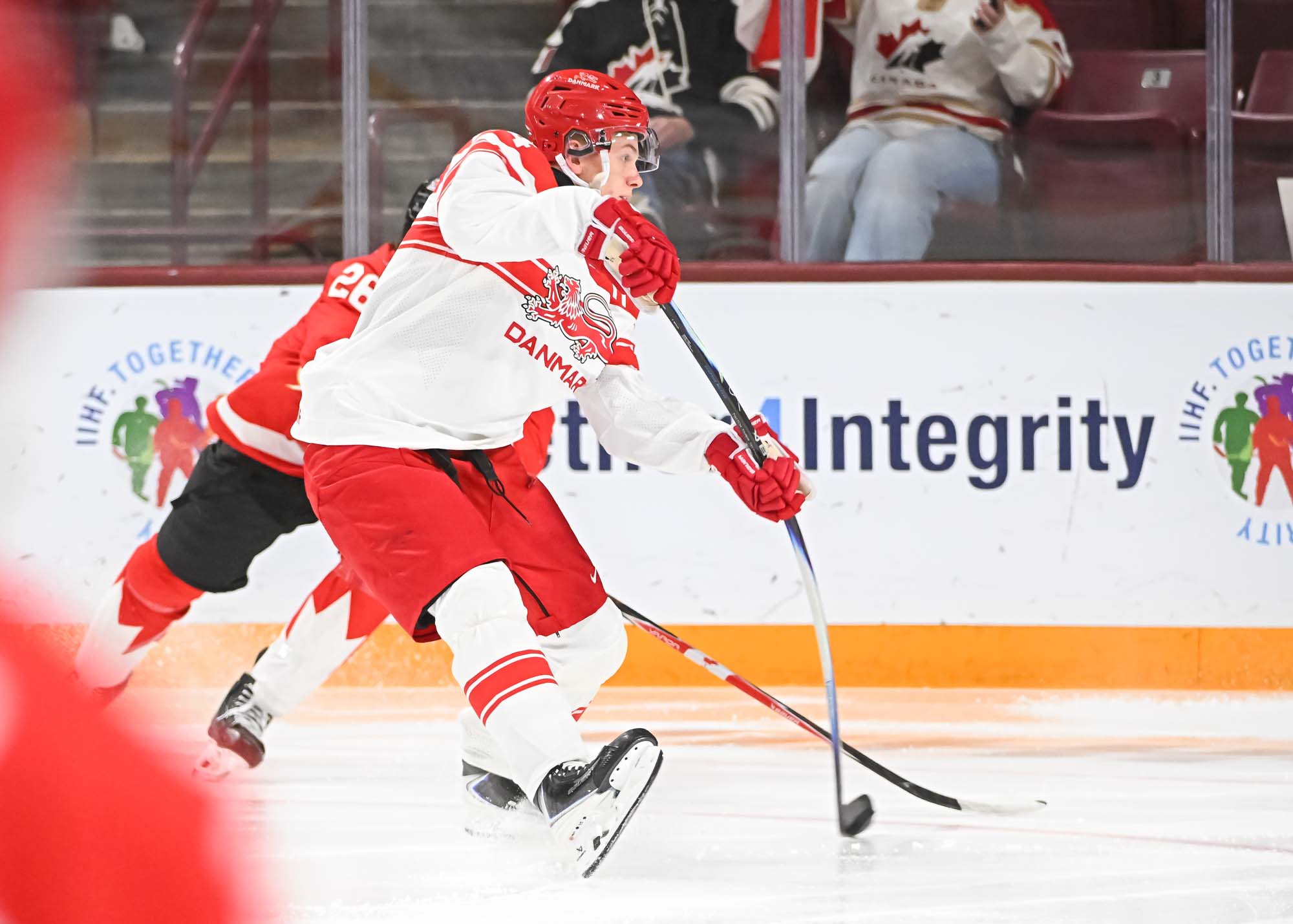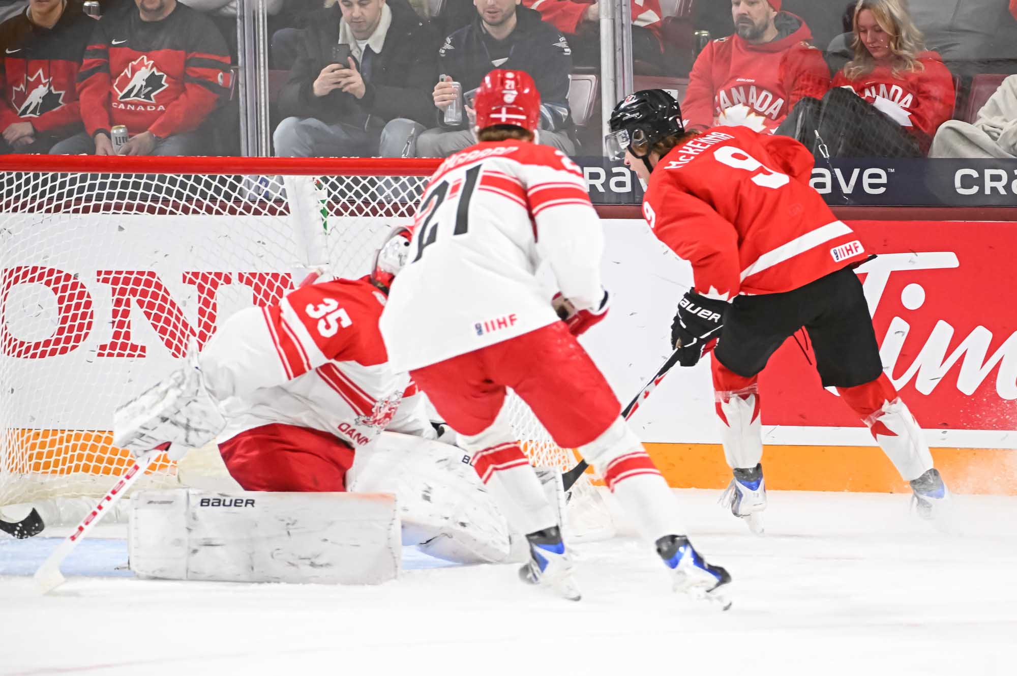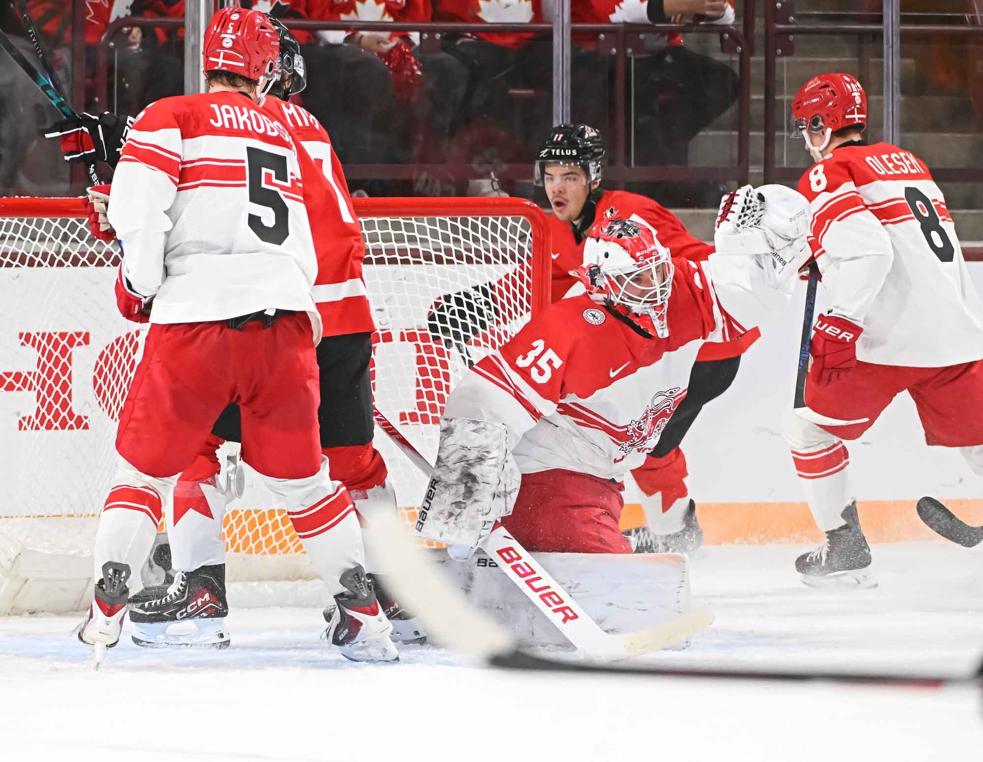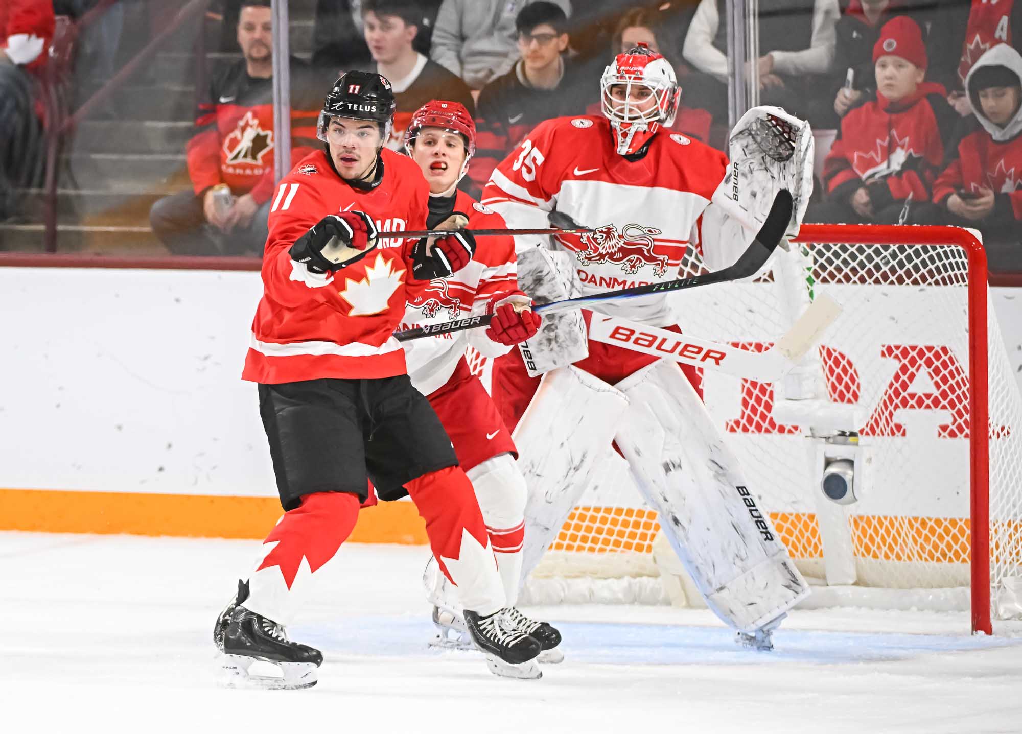 How bad was it for the Danes? Tristan Petersen broke a skate blade deep in the Canada end and struggled mightily to crawl to the bench. He wasn’t halfway there when Canada took advantage of the extra skater. Zayne Parekh finished the play with a high shot that eluded Patrick Tiedjen, who was making his debut with the national team.