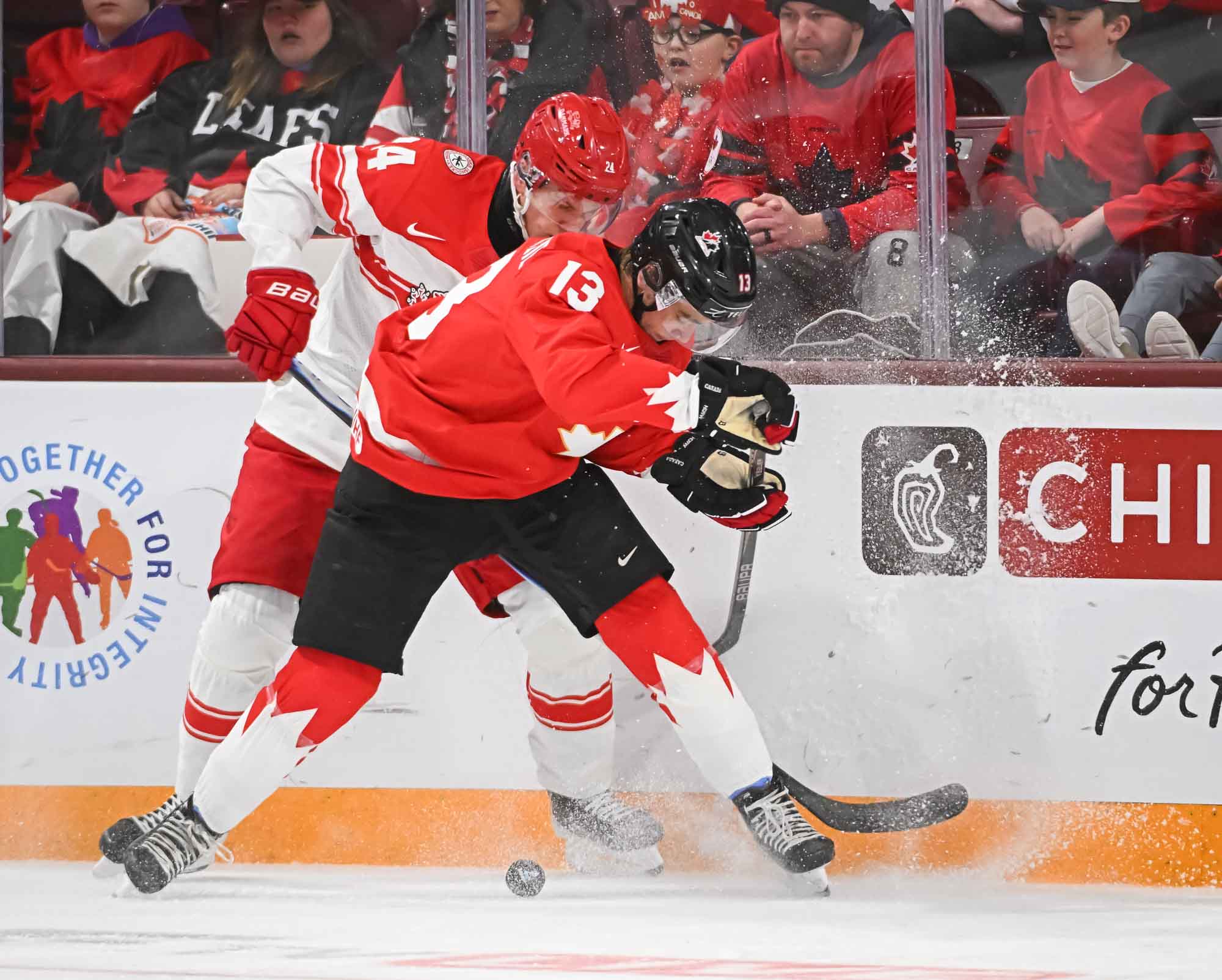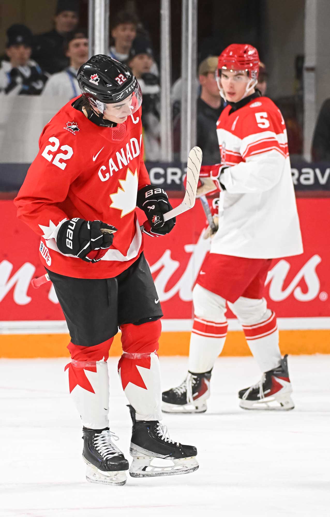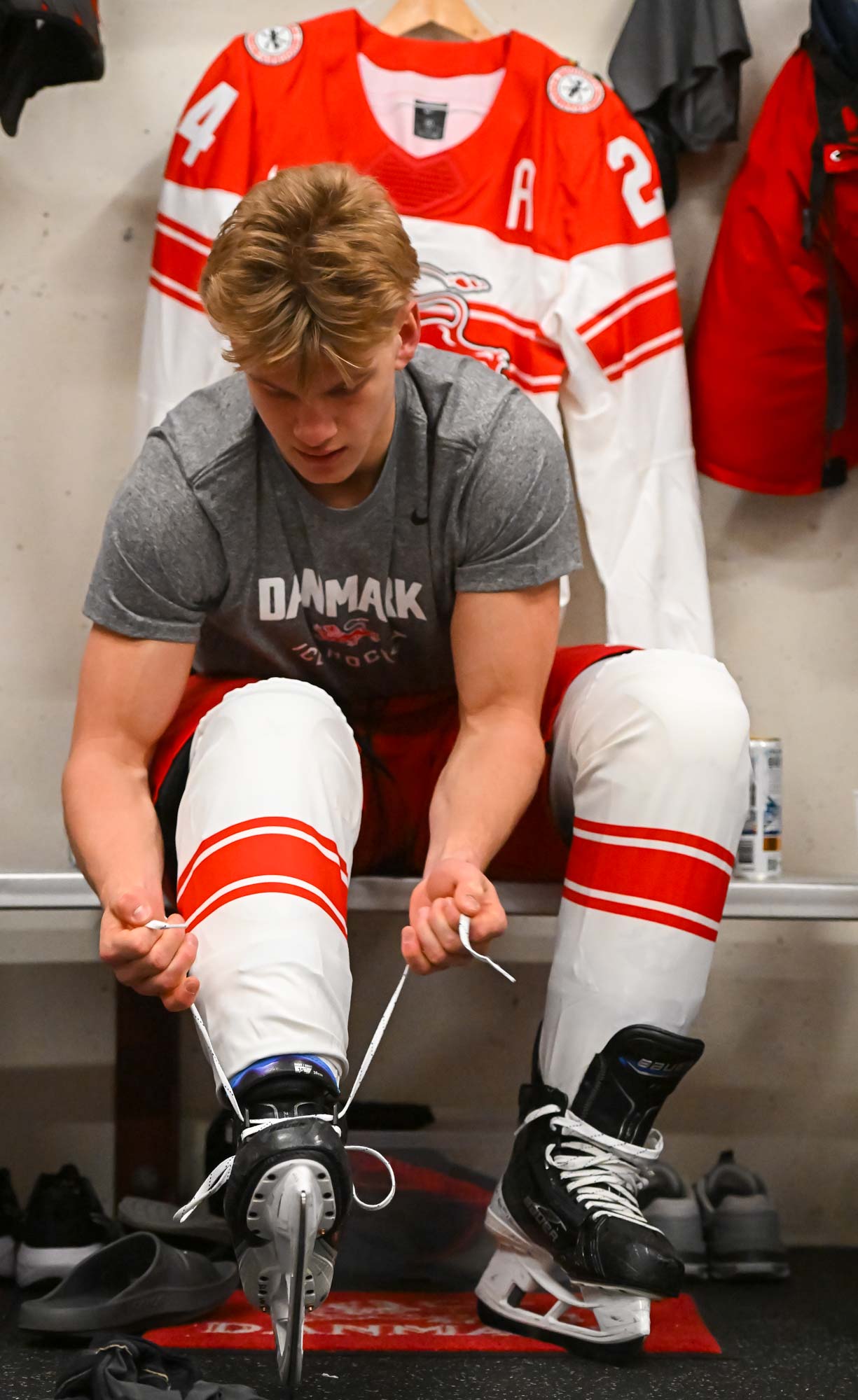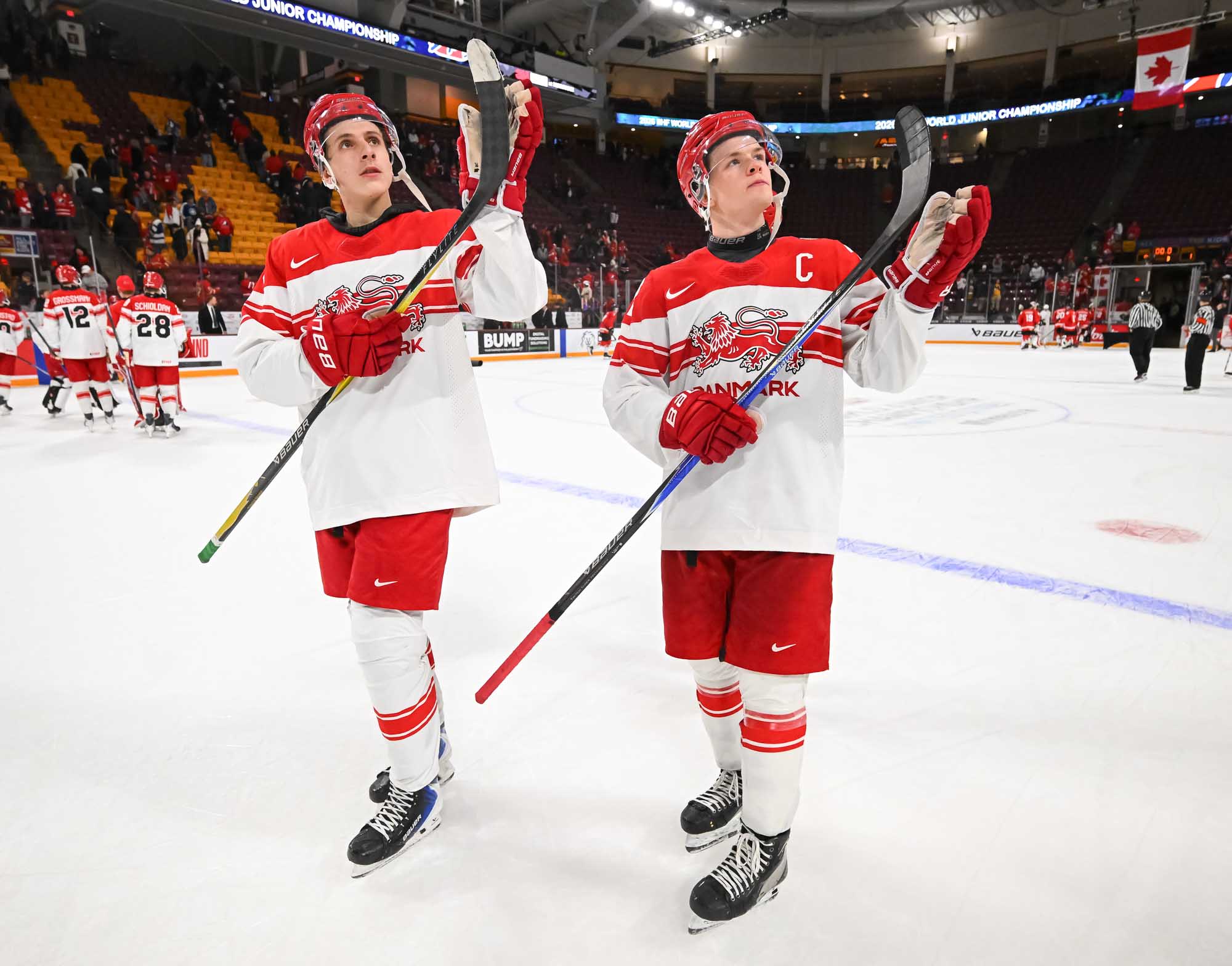How bad was it for the Danes? Tristan Petersen broke a skate blade deep in the Canada end and struggled mightily to crawl to the bench. He wasn’t halfway there when Canada took advantage of the extra skater. Zayne Parekh finished the play with a high shot that eluded Patrick Tiedjen, who was making his debut with the national team.