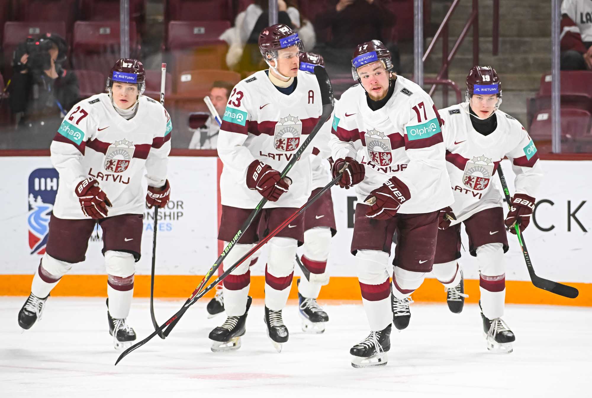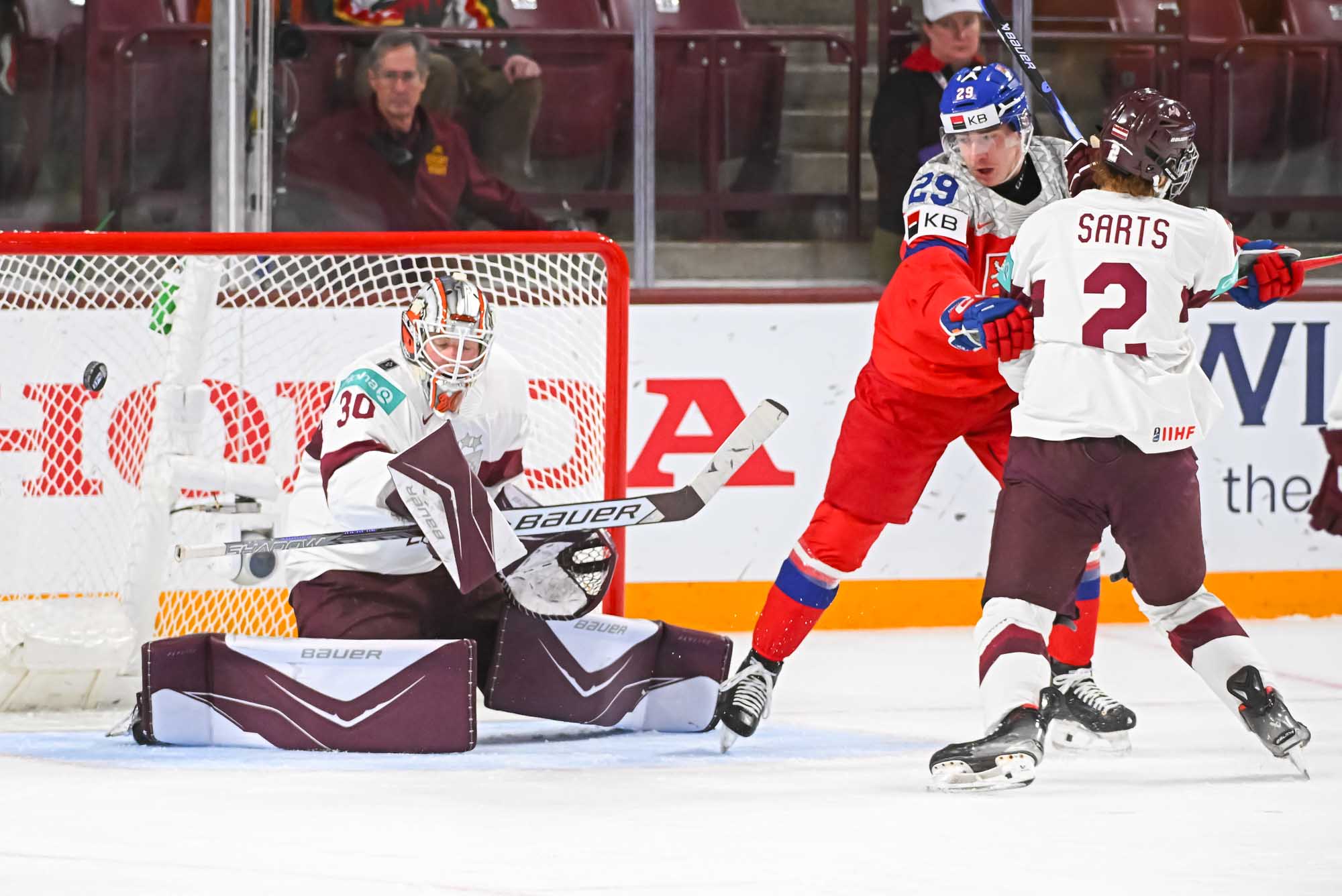 Like Drancak, Latvia’s Martins Klaucans had the goalie beaten moments later but hit the post. Maurins held down the fort at the other end during a late-period Czech push.