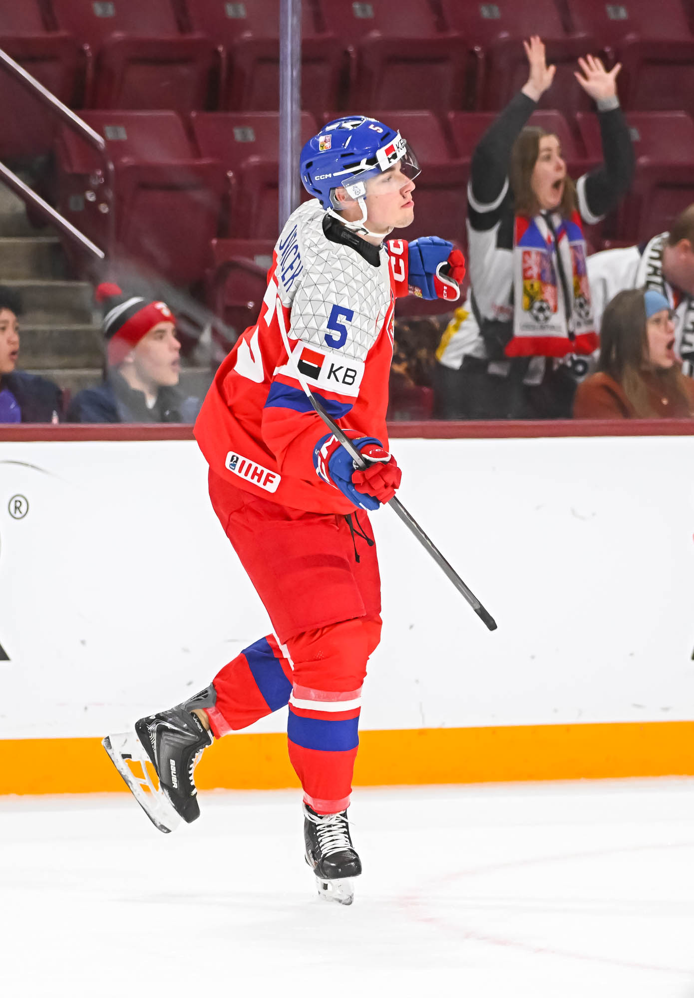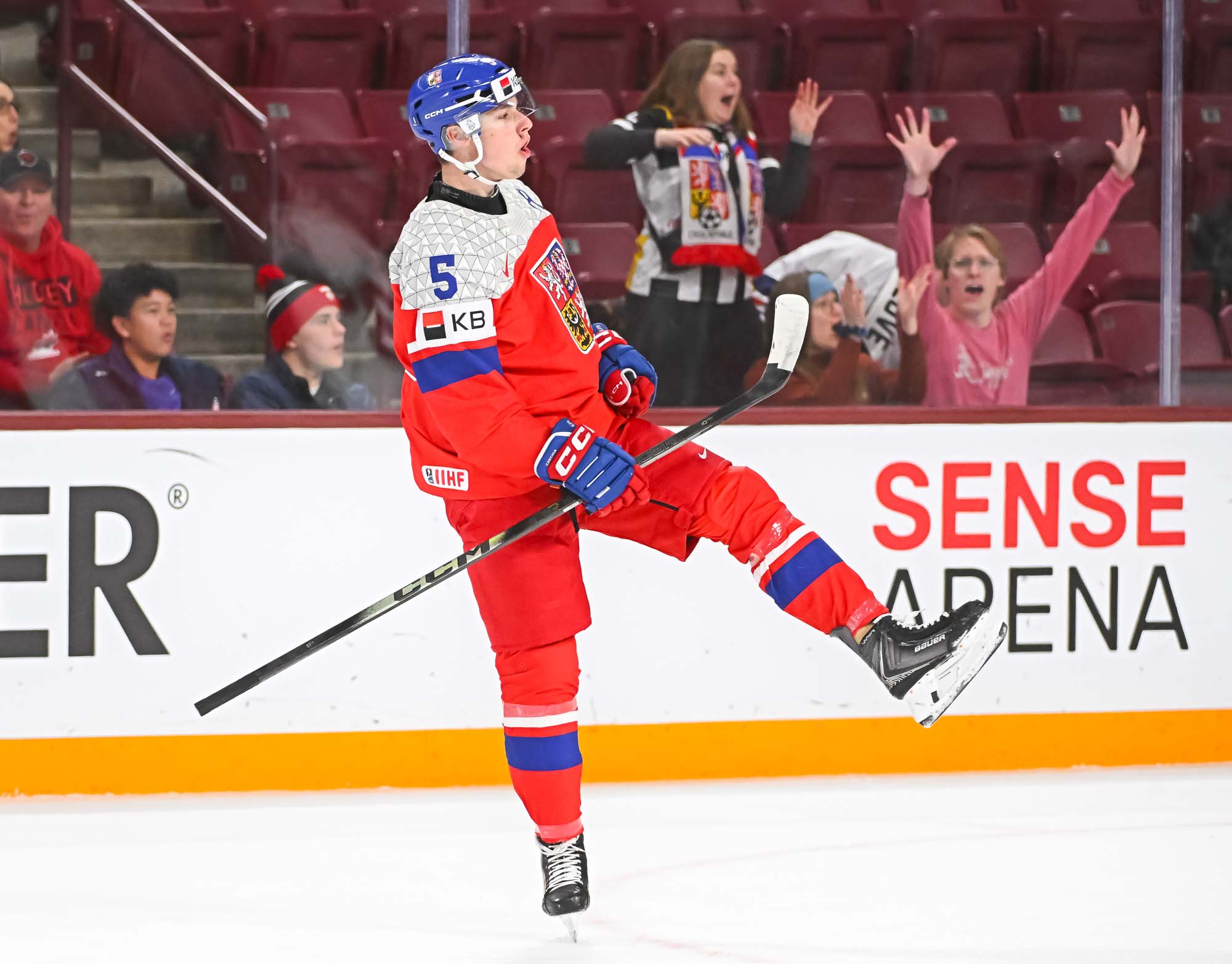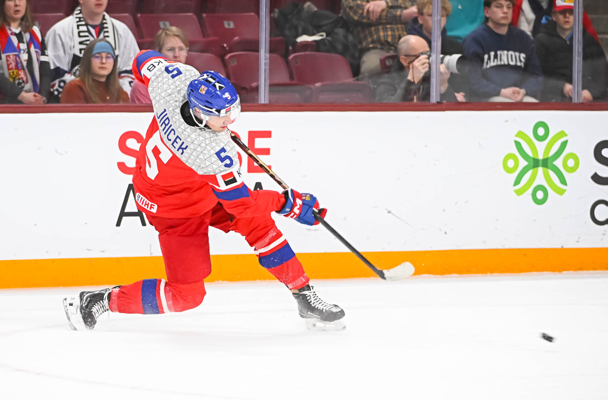 Defender Adam Jiricek (#5) unleashes a one-timer for a first-period power play goal in Czechia's 4-2 win over Latvia at the 2026 IIHF World Junior Championship.
