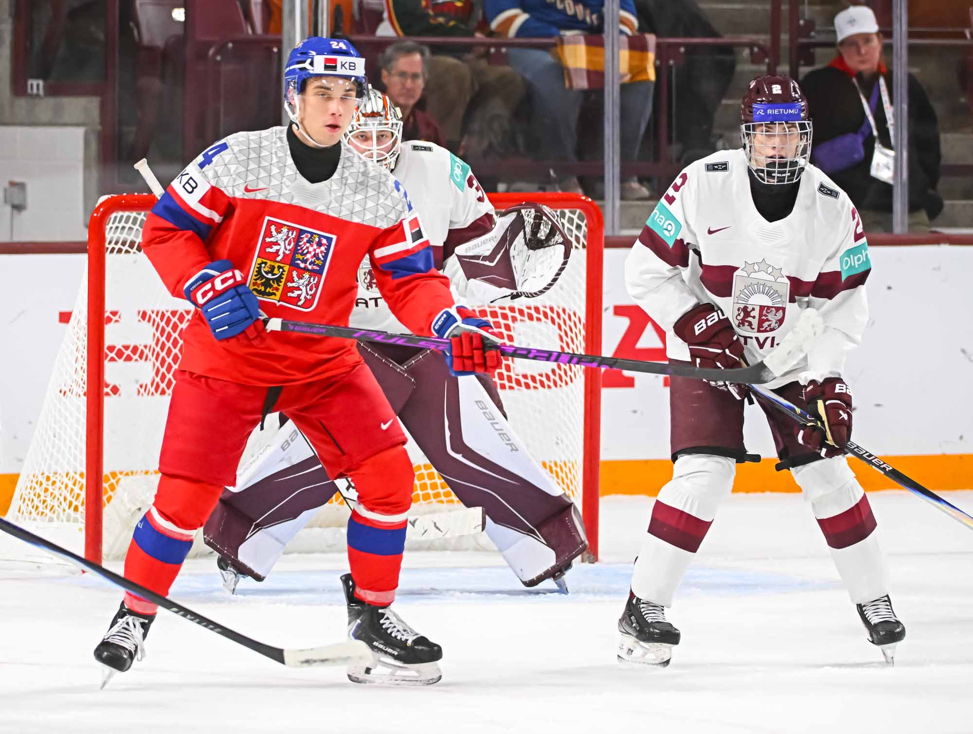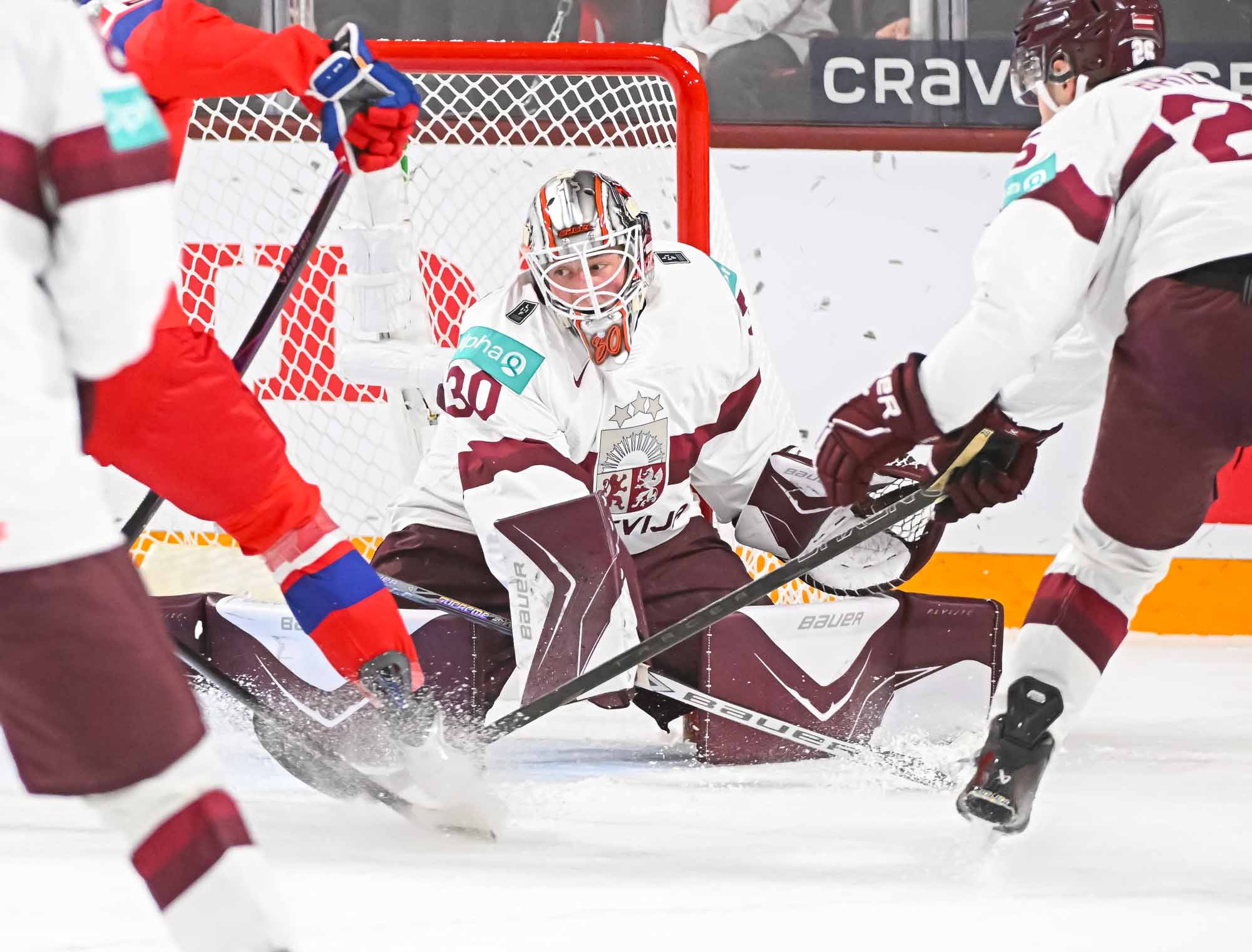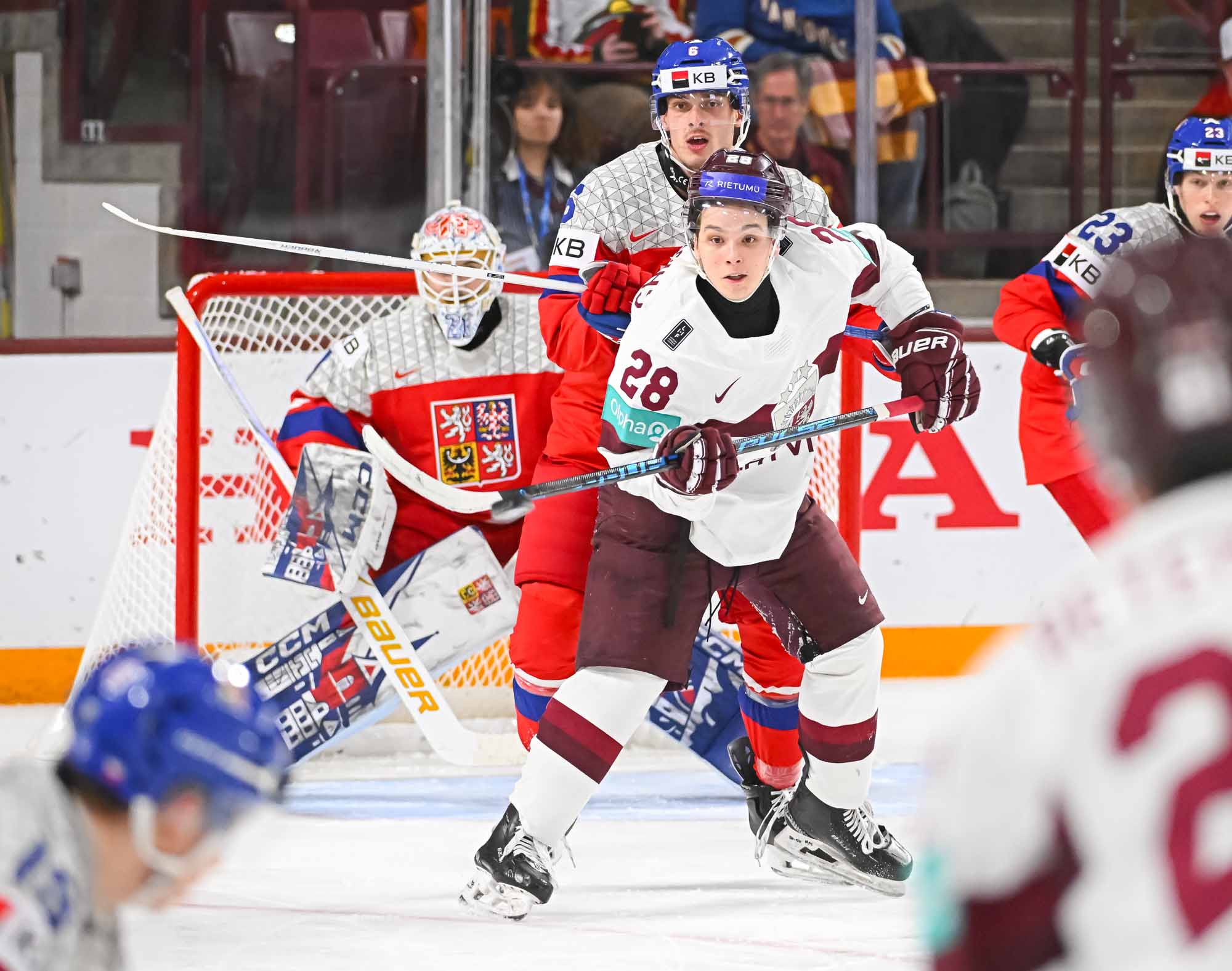 Czechia kept plugging away. At 5:31 of the second period, Psenicka made it 3-1 with a bad-angle shot that deflected in off the leg of Latvian blueliner Harijs Cjunskis, fighting for body position in the crease. Maurins pushed Cjunskis away in annoyance.