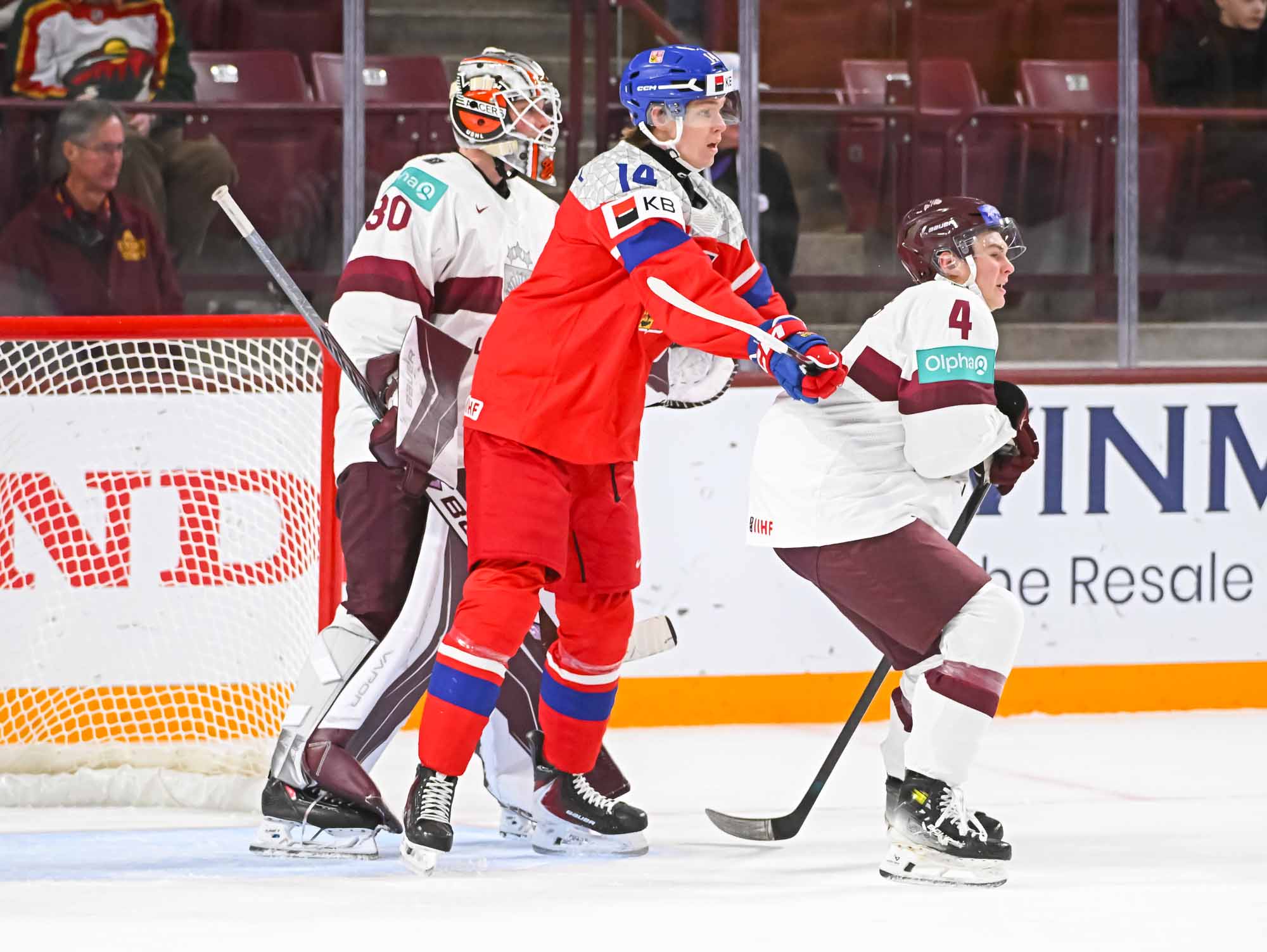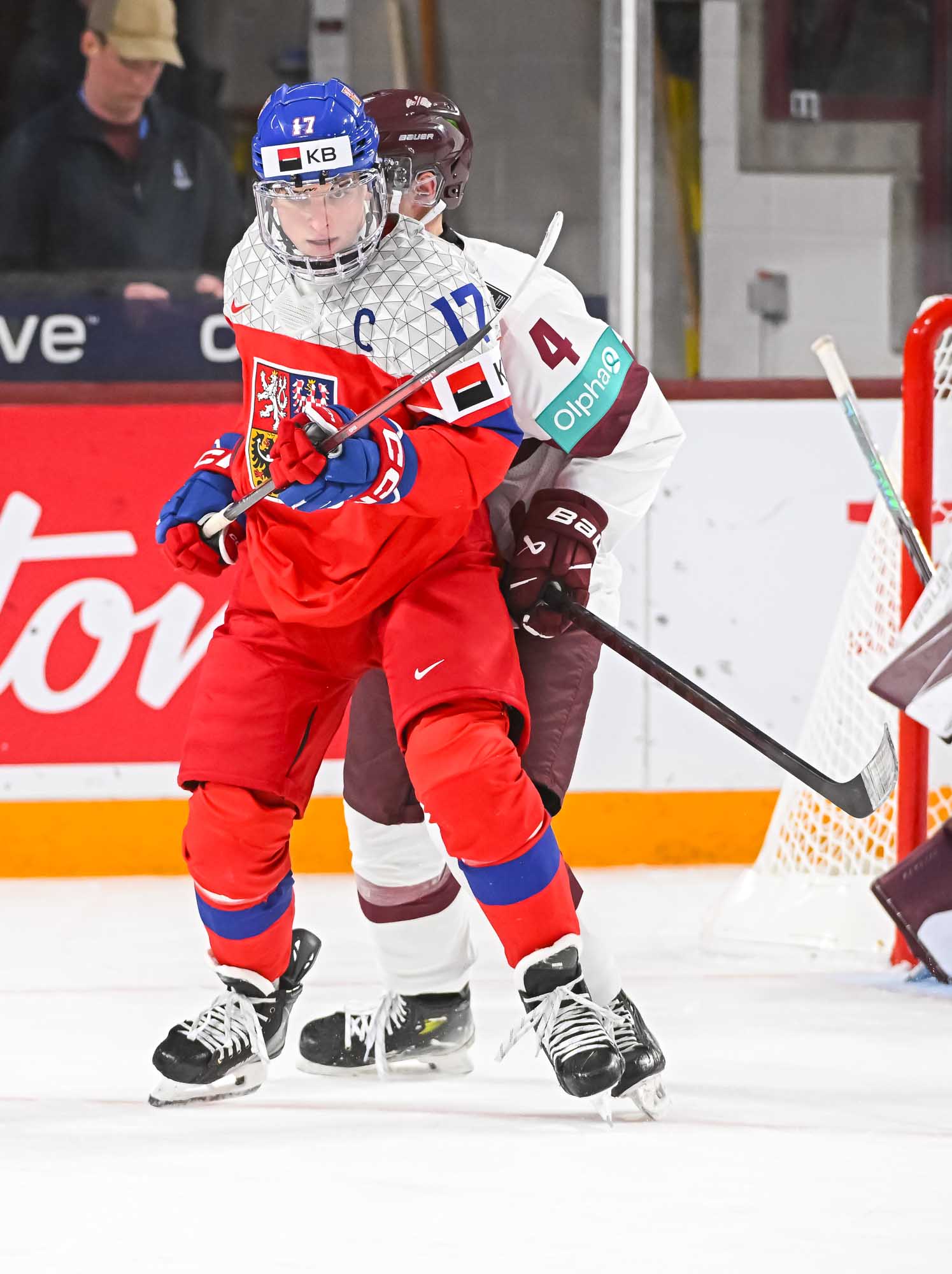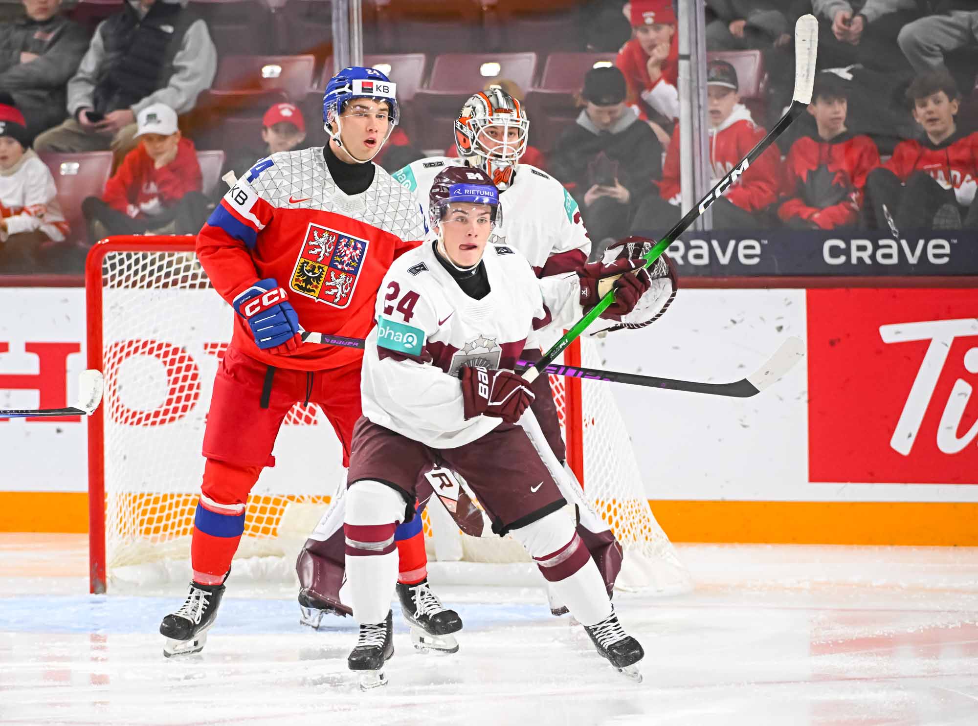Czechia kept plugging away. At 5:31 of the second period, Psenicka made it 3-1 with a bad-angle shot that deflected in off the leg of Latvian blueliner Harijs Cjunskis, fighting for body position in the crease. Maurins pushed Cjunskis away in annoyance.