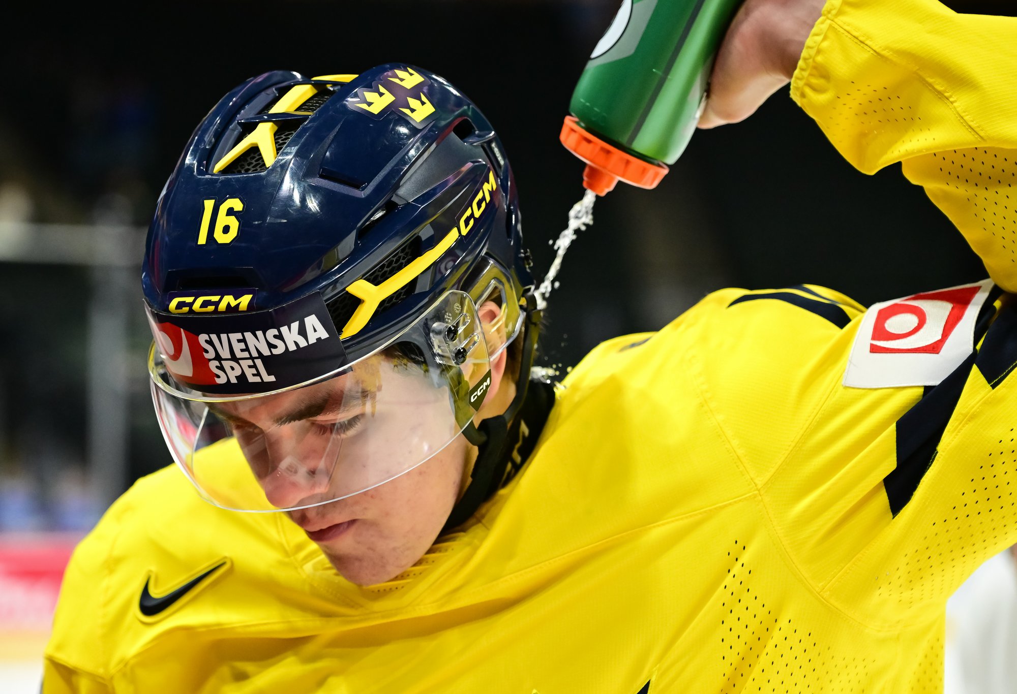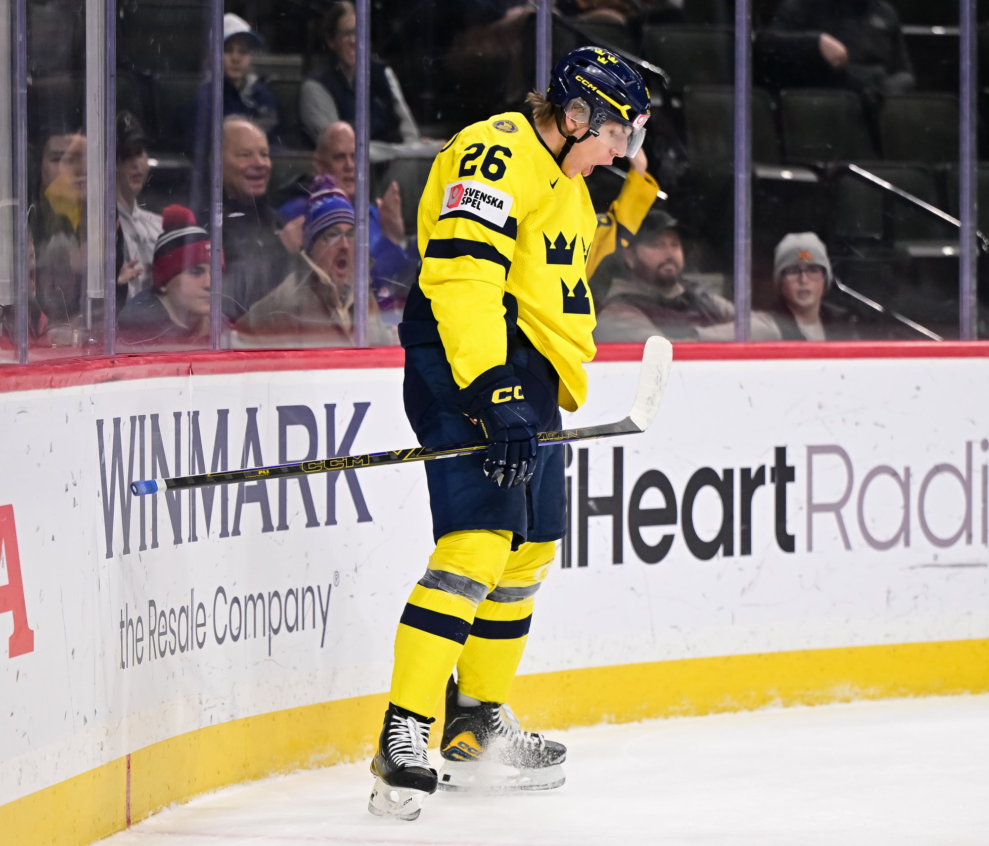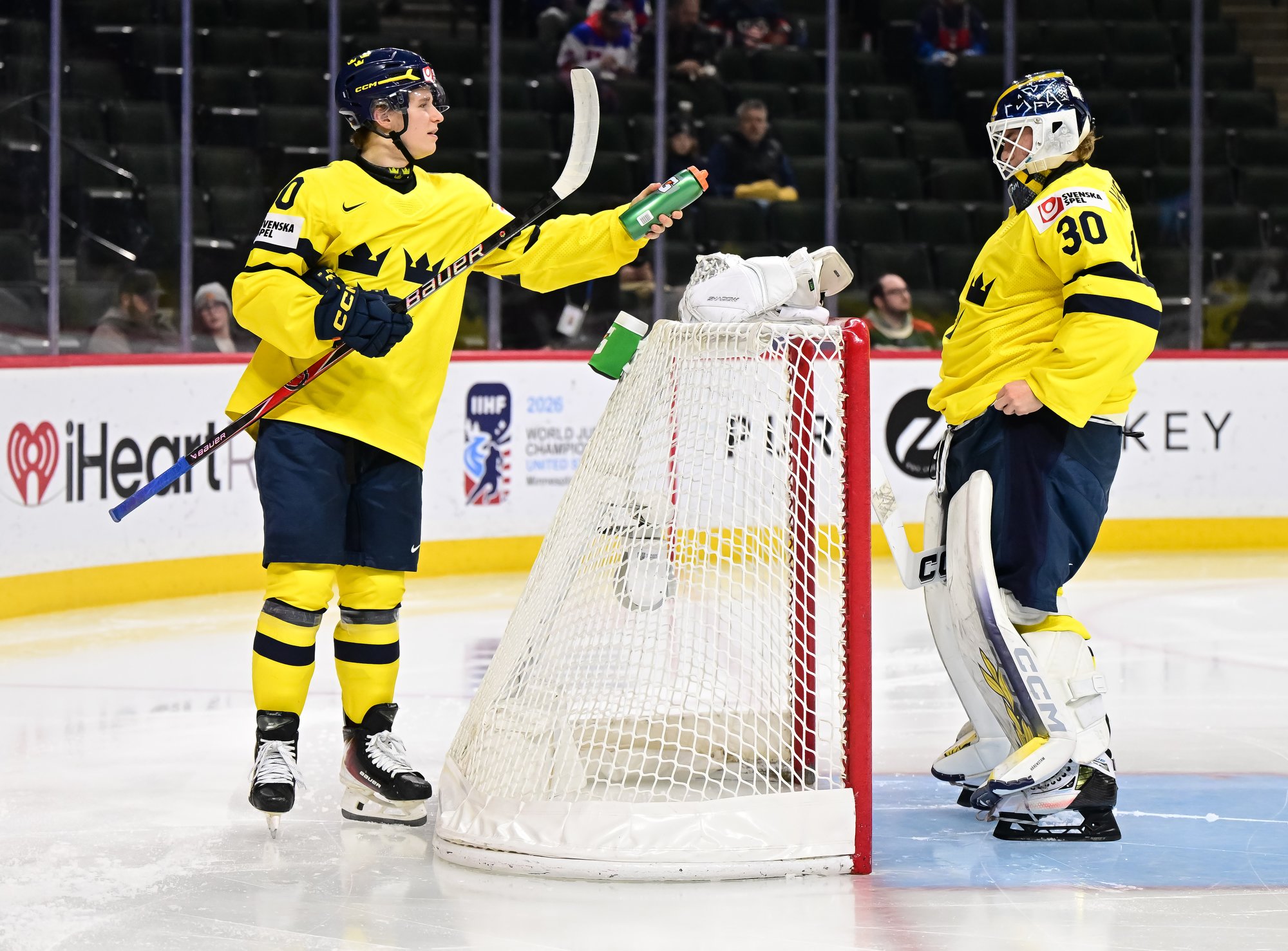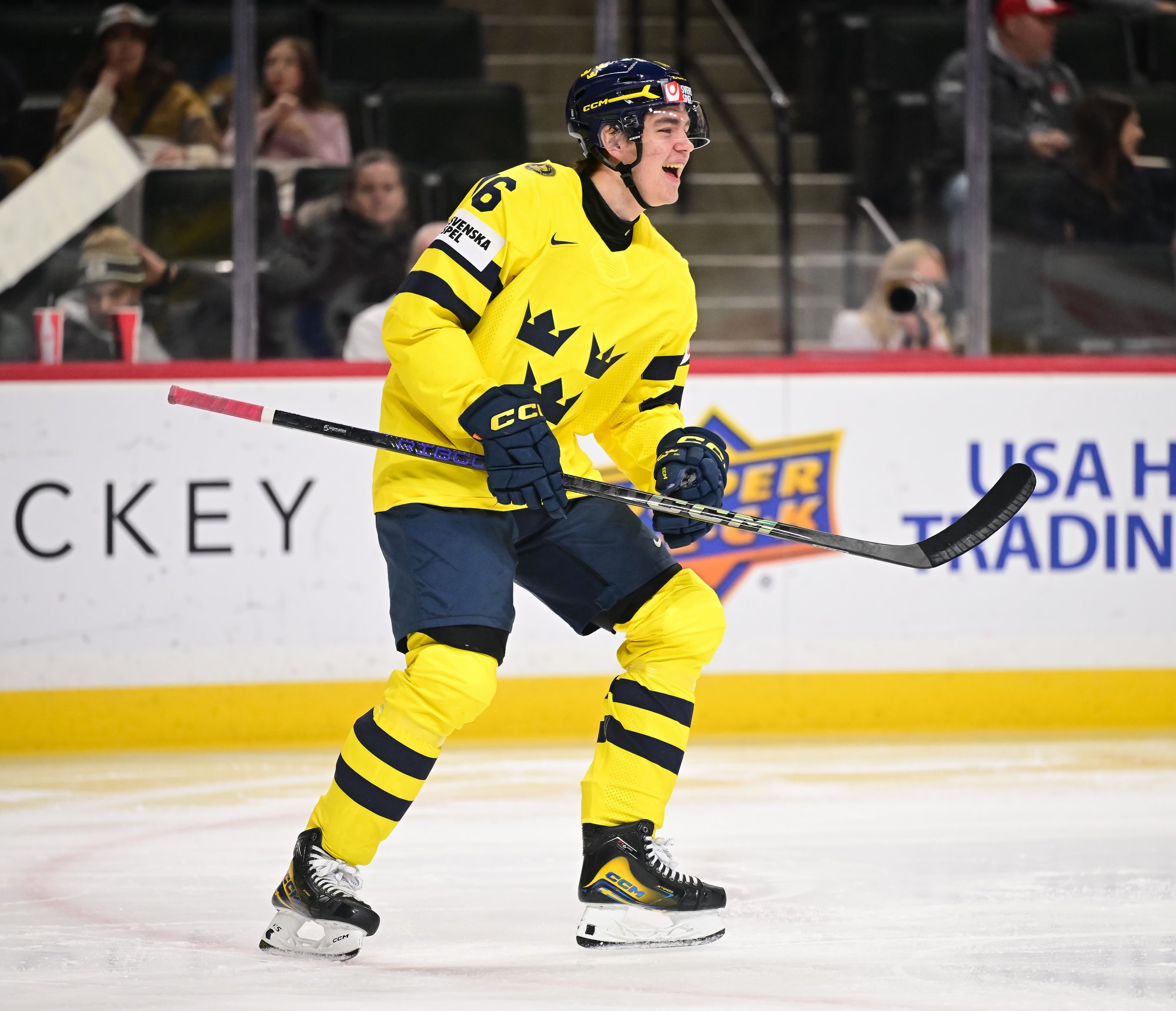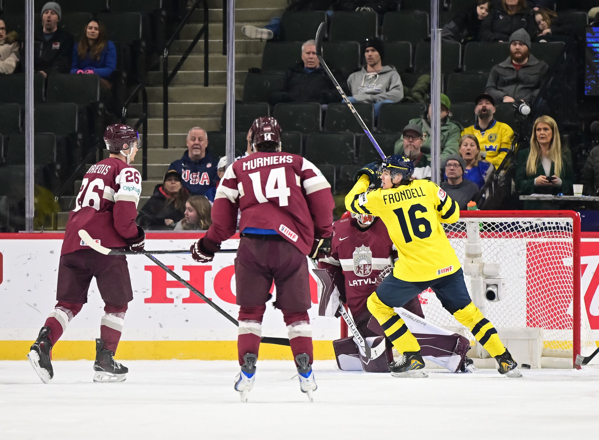 Forward Anton Frondell (#16) sparked Sweden with two goals in a 6-3 quarter-final victory over Latvia at the 2026 World Juniors in St. Paul, Minnesota.