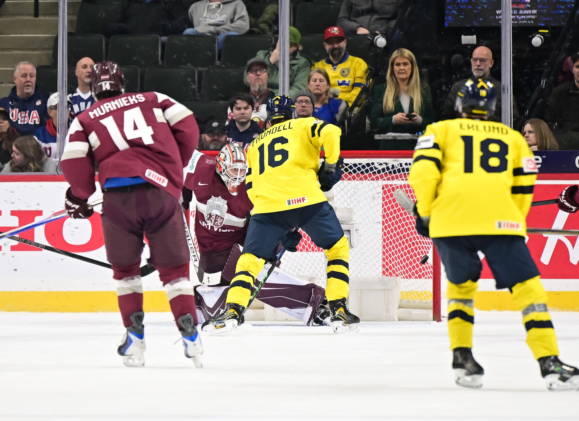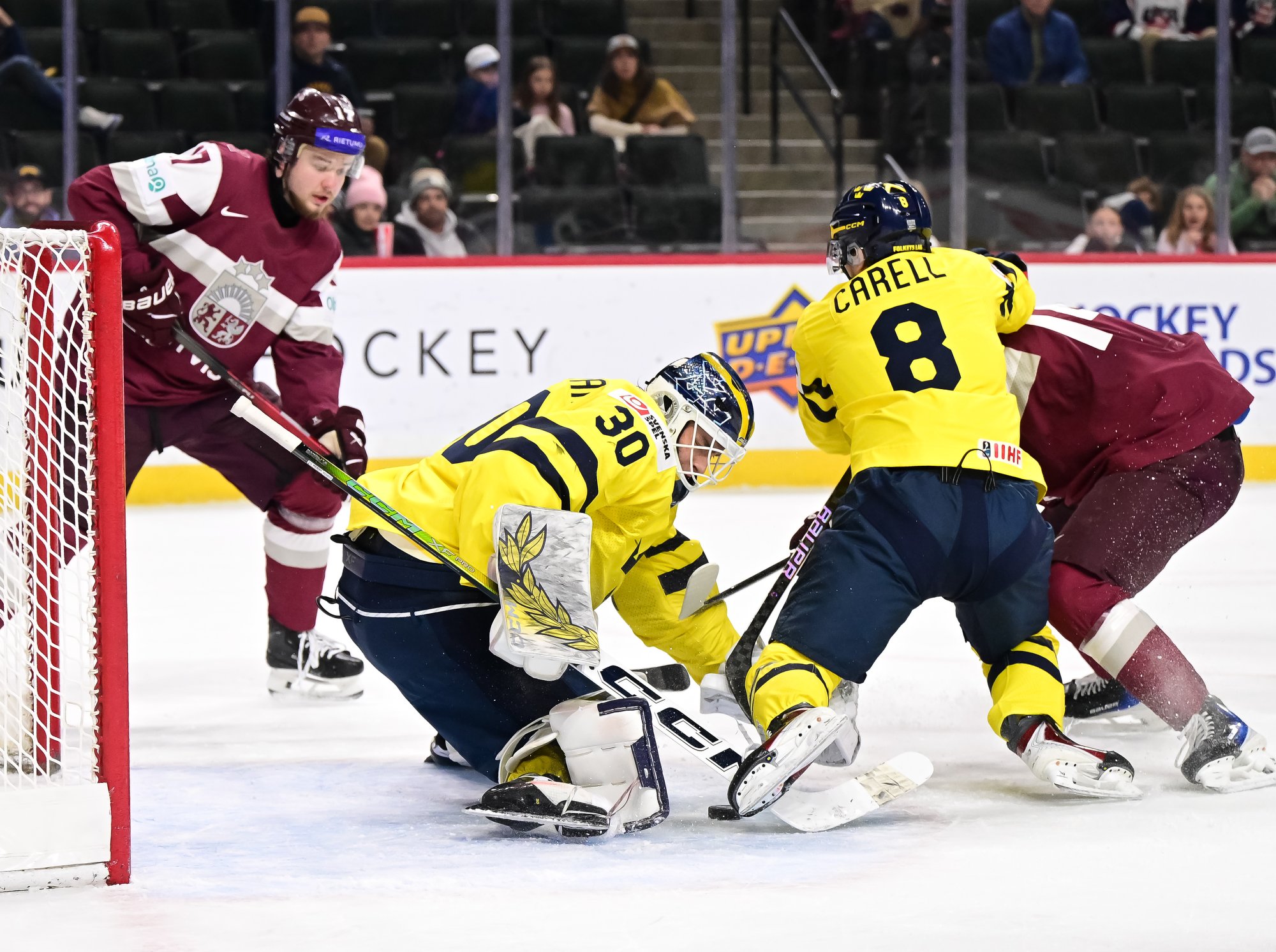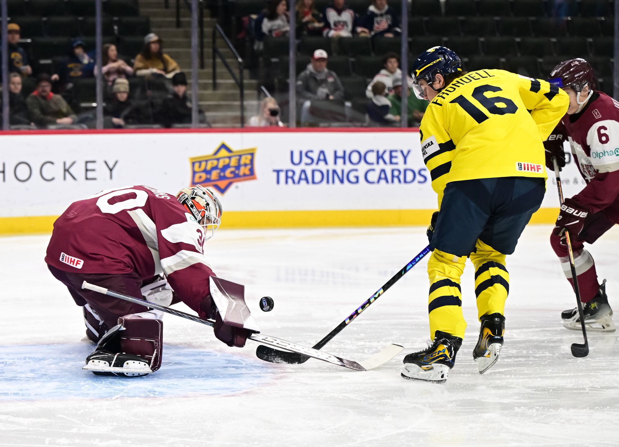 Sweden outshot Latvia 38-16. Swedish coach Magnus Havelid gave the nod to starter Love Harenstam in net, while Abols went with Nils Maurins.