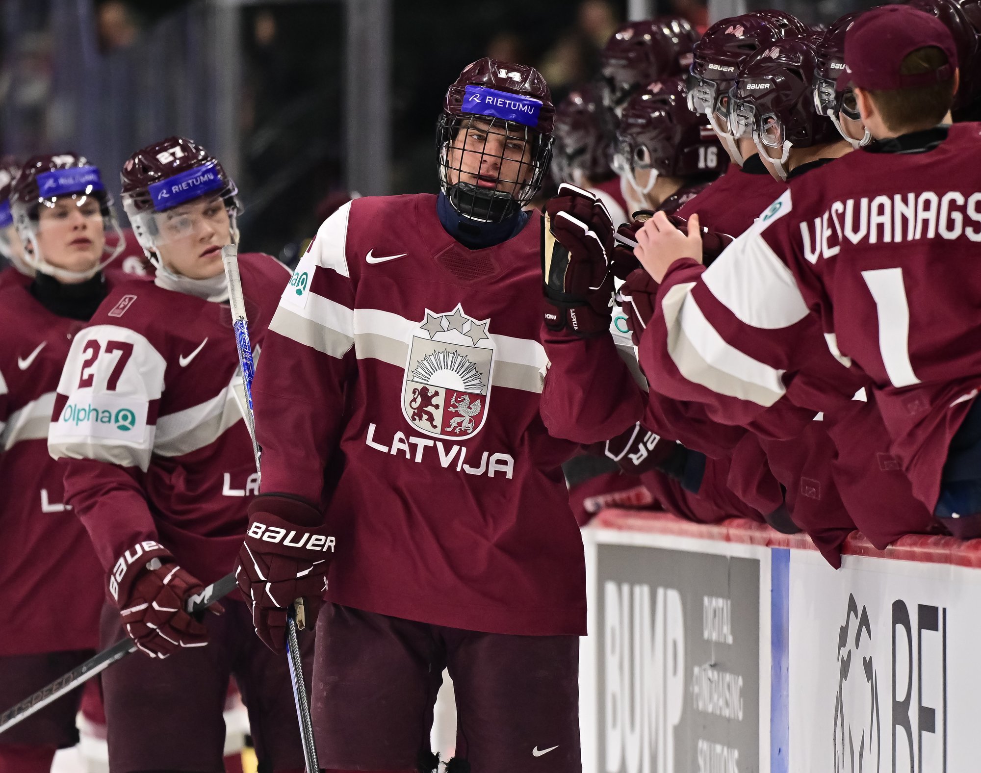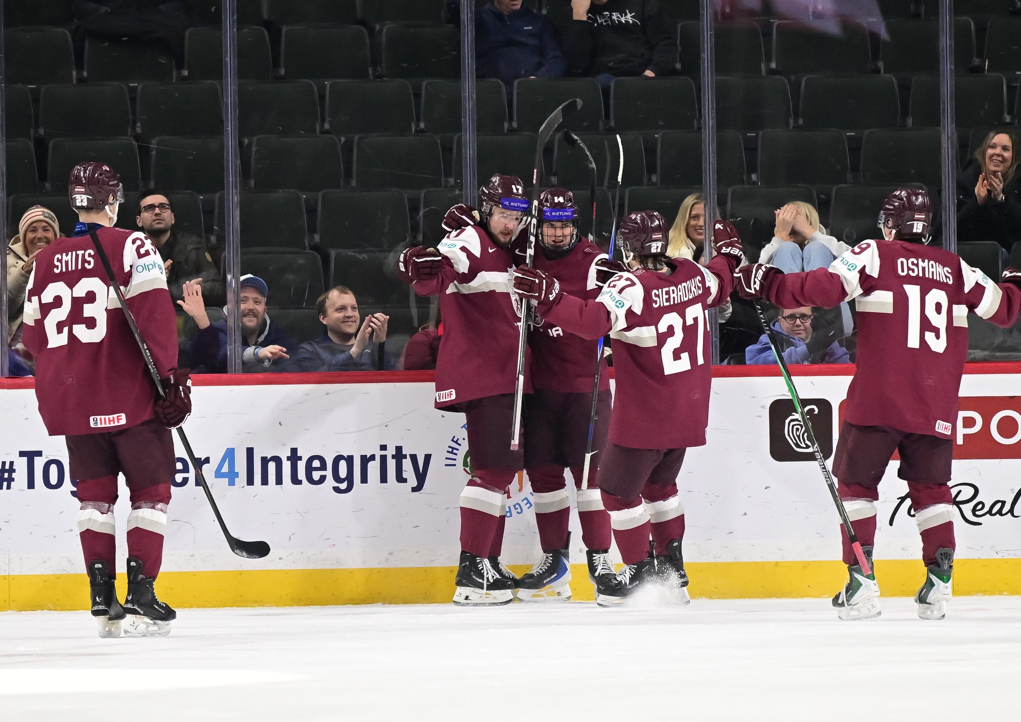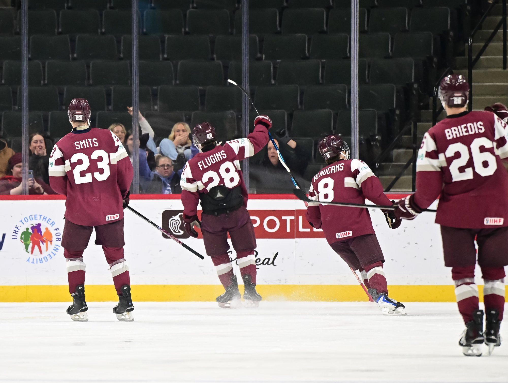 Kristers Ansons, Karlis Flugins, and Olivers Murnieks replied for Latvia. Brunos Osmanis assisted on both Latvian power play goals.