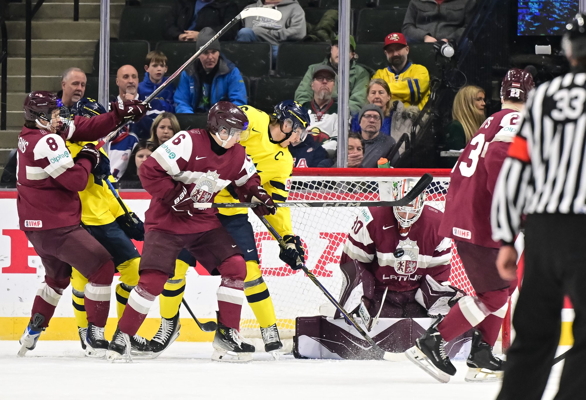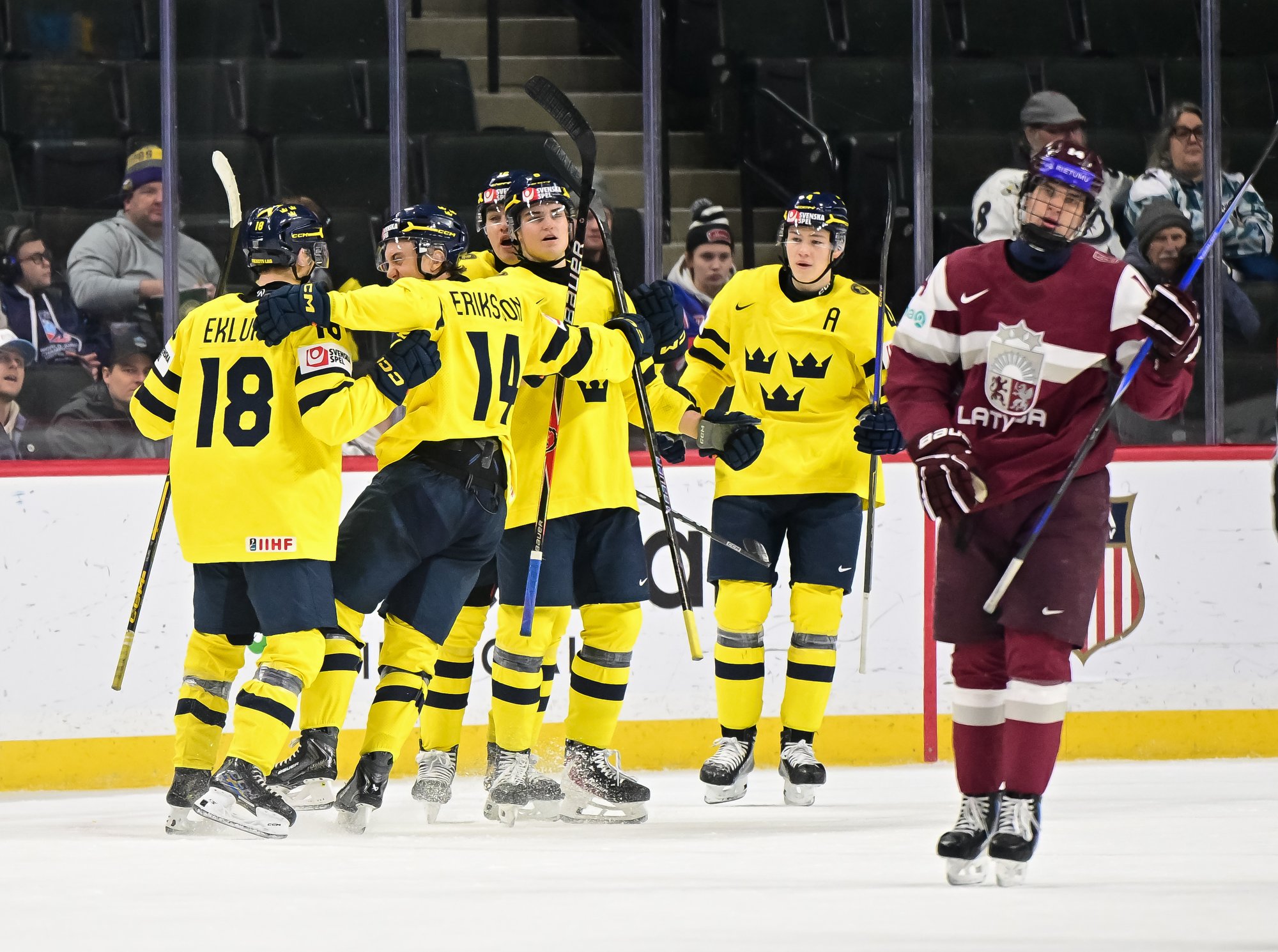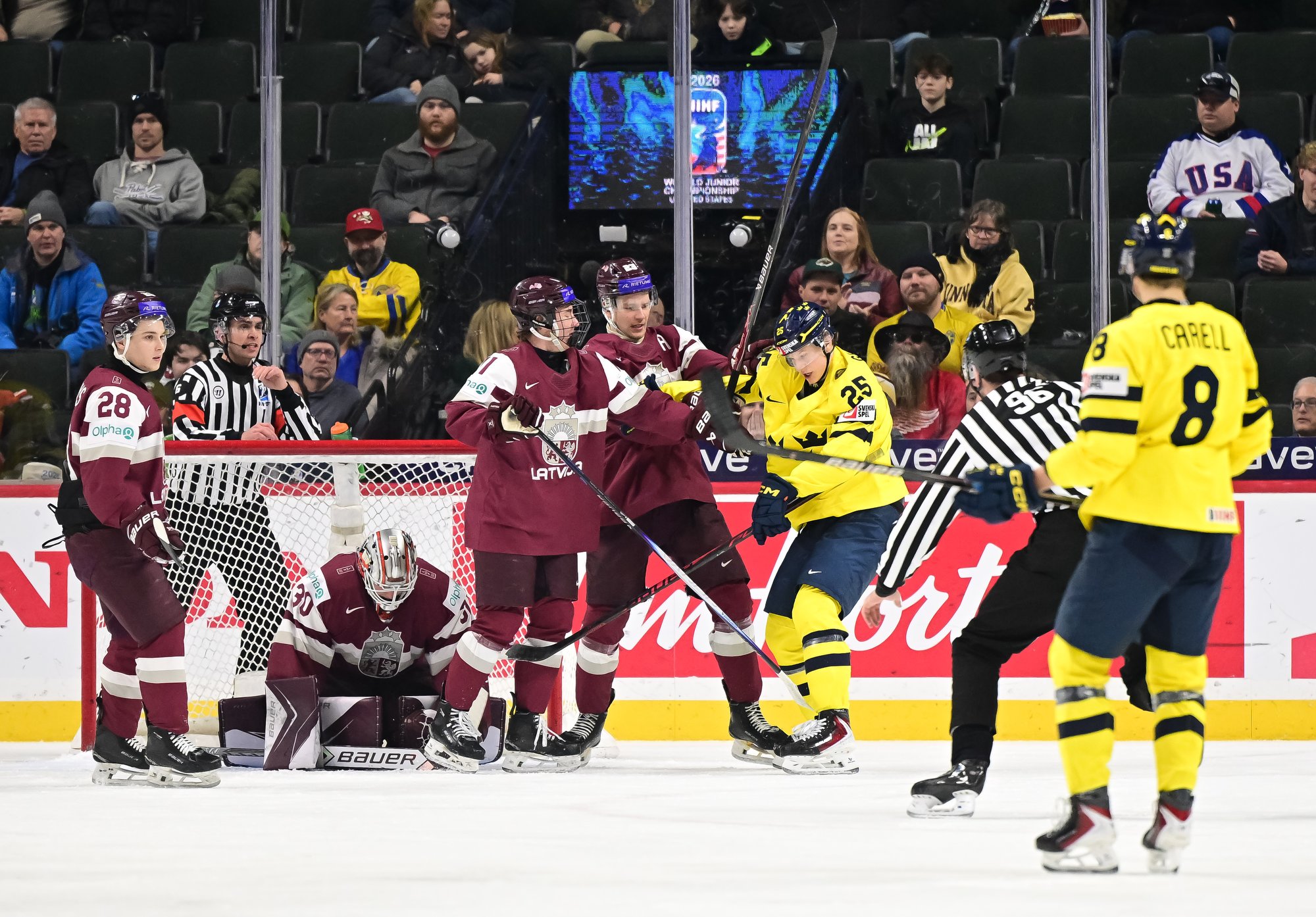 It was business as usual. Undefeated Sweden employed a balanced attack to down Latvia 6-3 in the first quarter-final of the 2026 IIHF World Junior Championship on Friday.