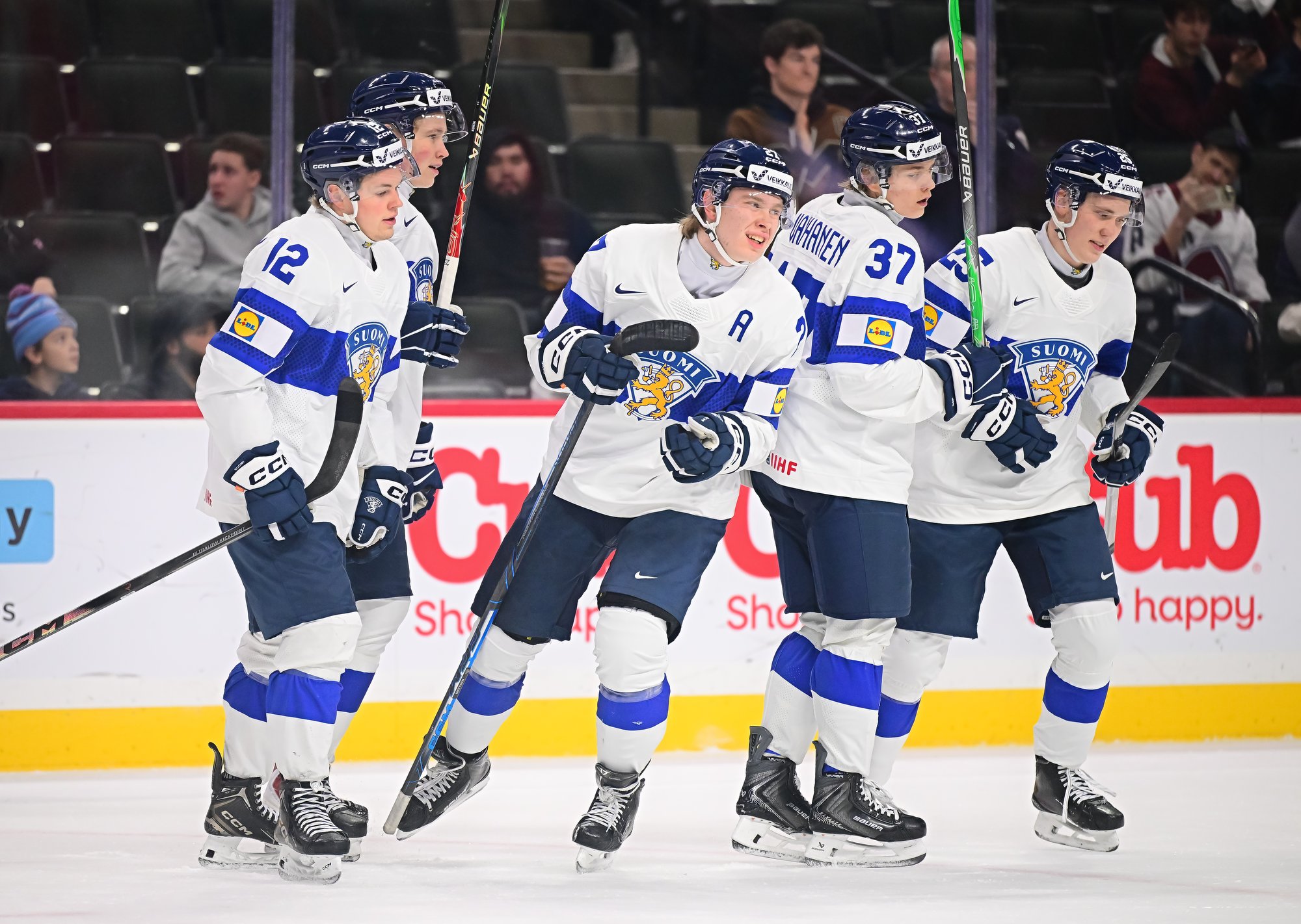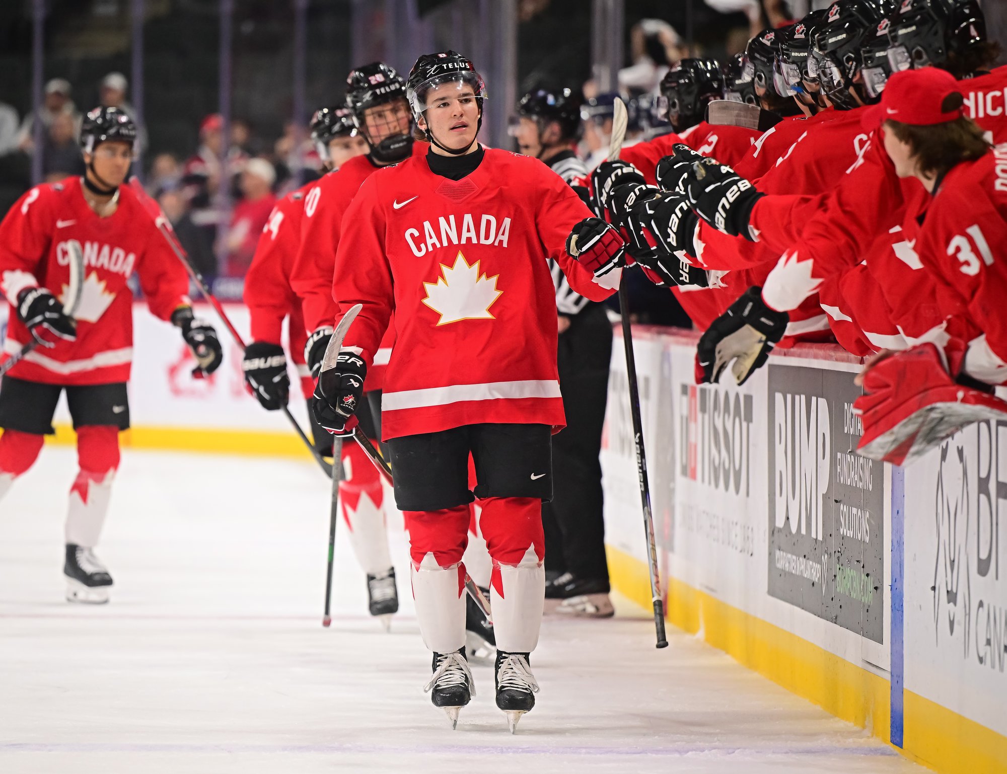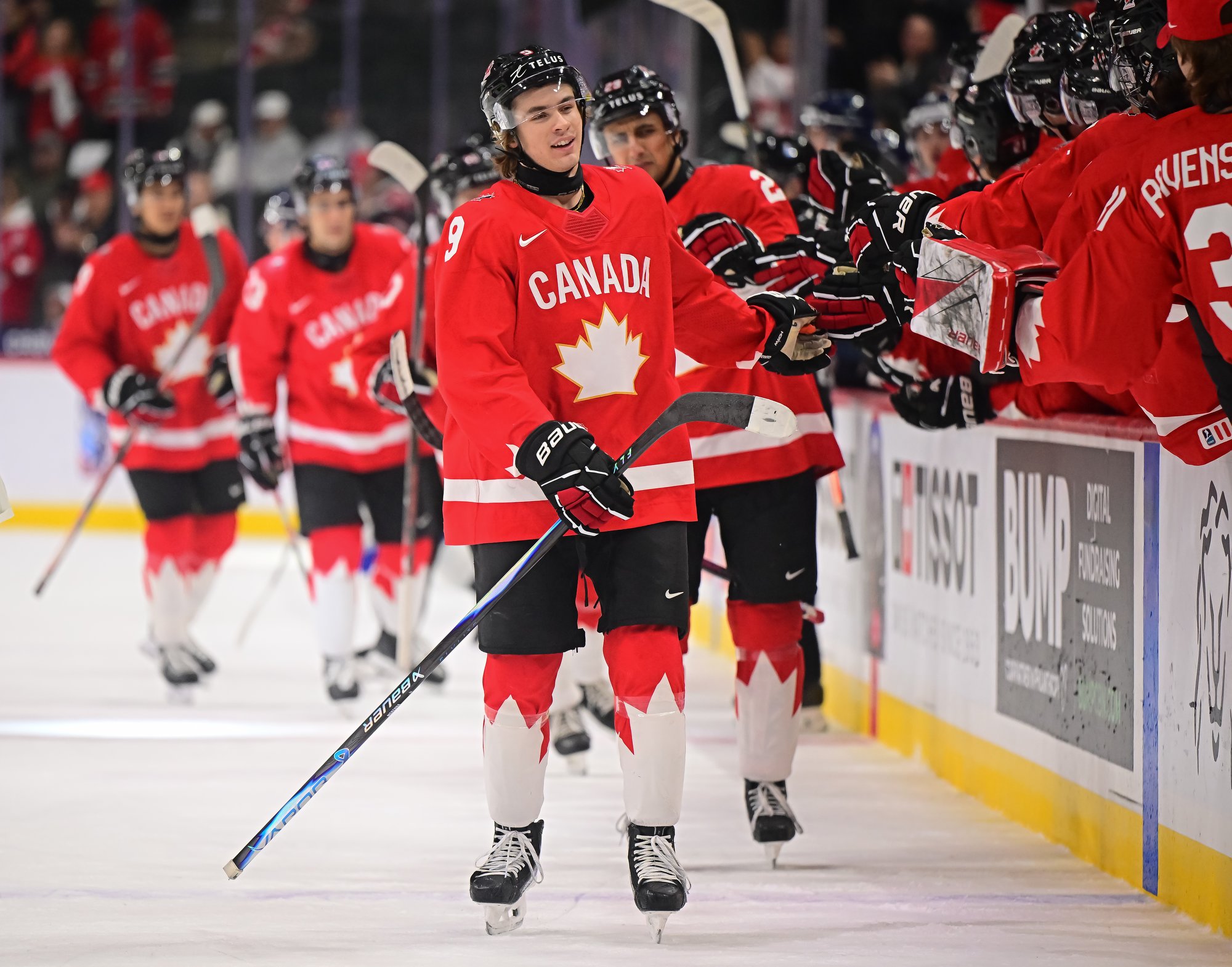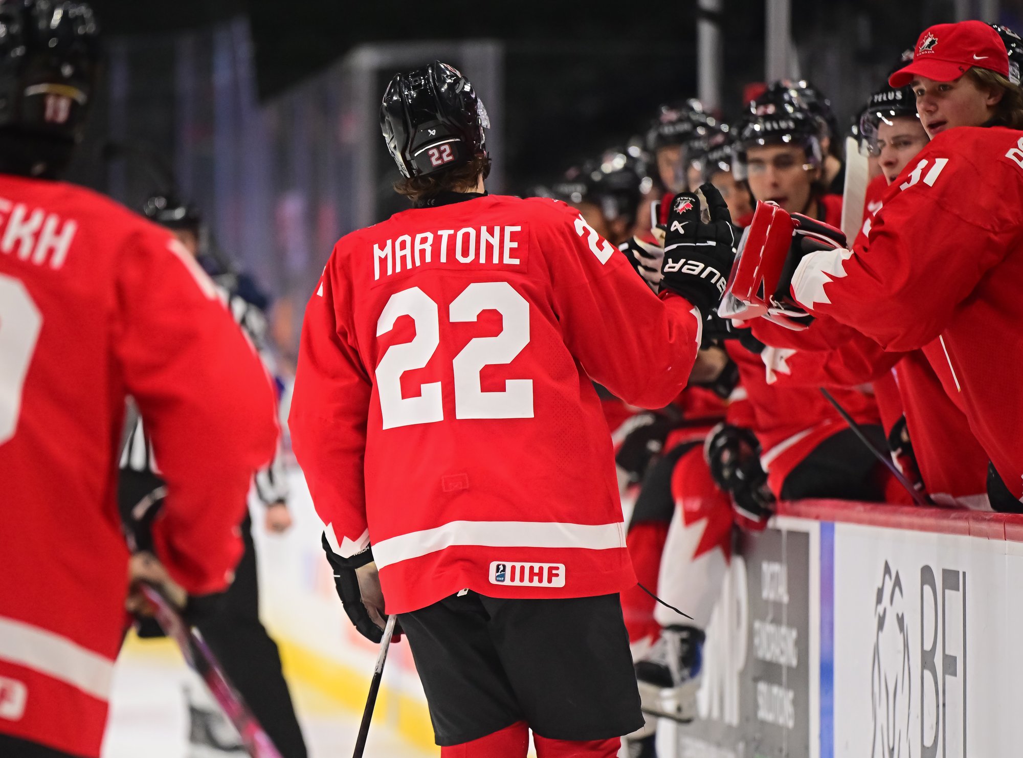 Canada's Sam O'Reilly (#23, centre) accepts congratulations from his teammates after scoring the first goal in a 6-3 bronze medal victory over Finland at the 2026 World Juniors.