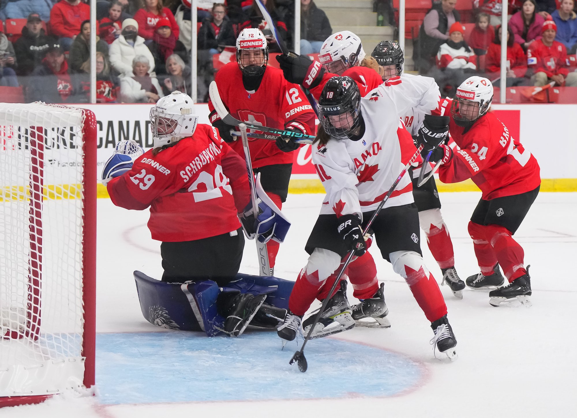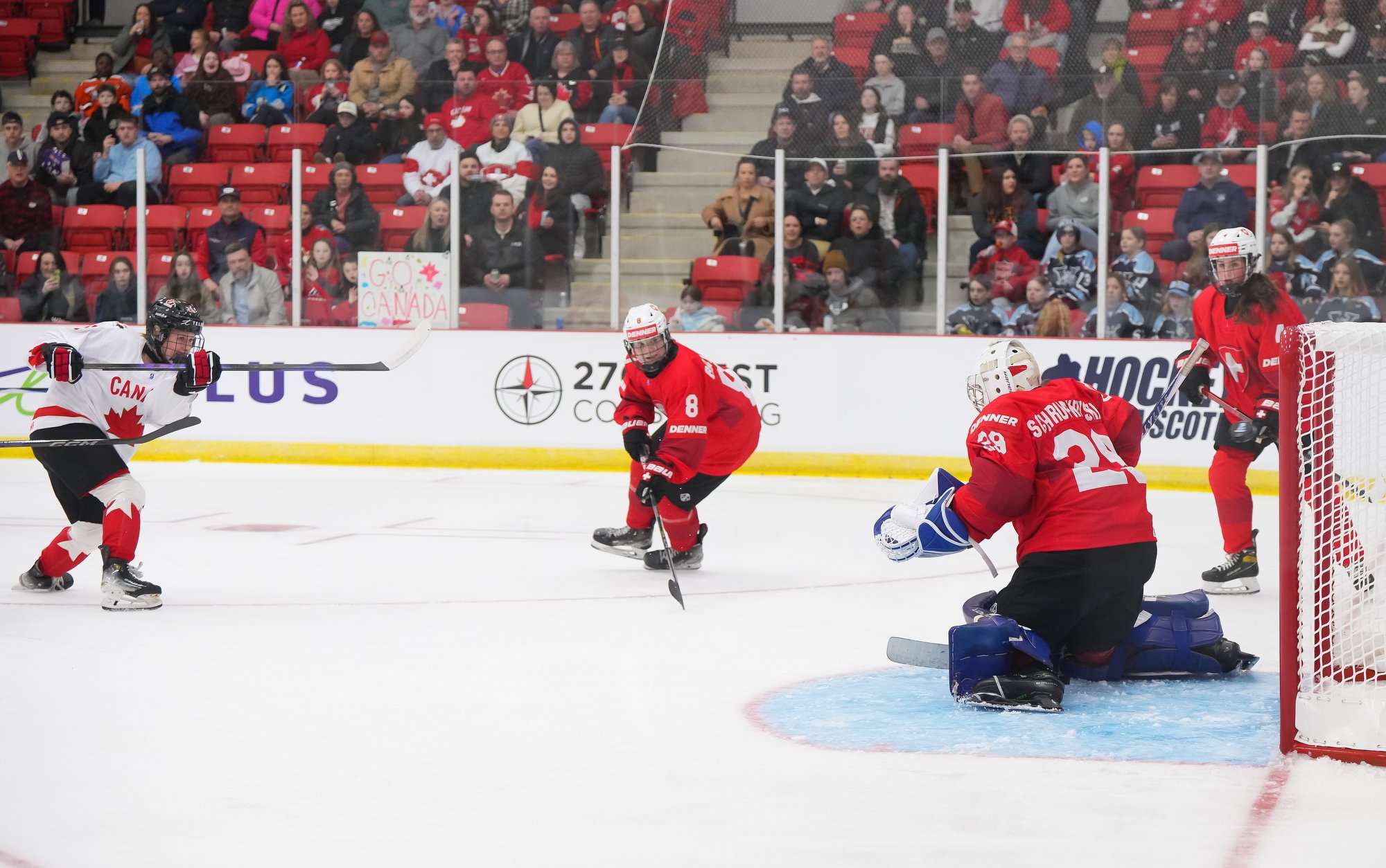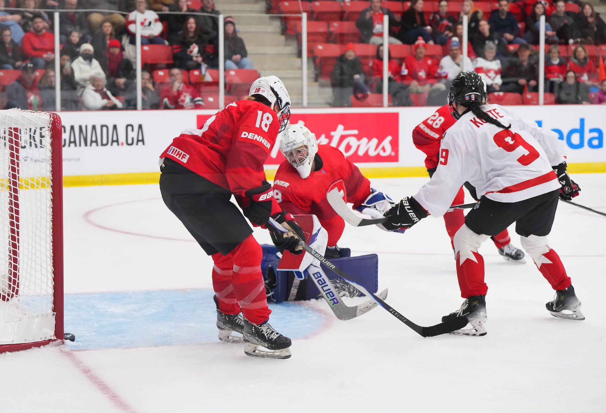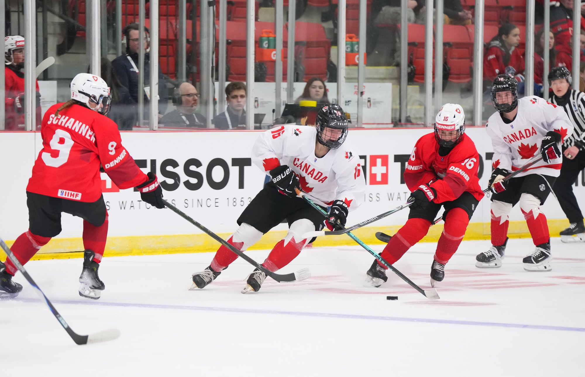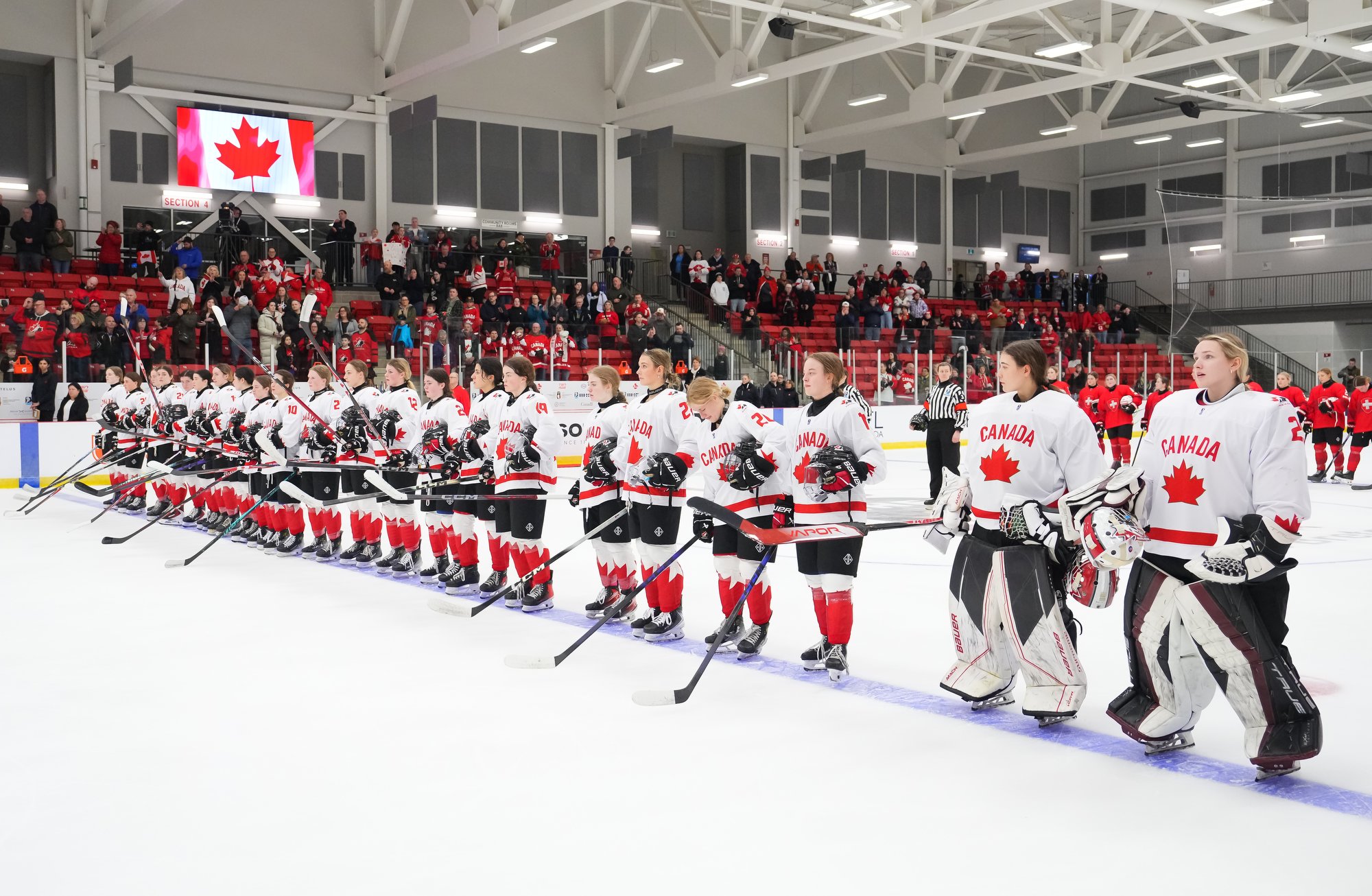 It was a sea of red and white on the ice and in the stands at the Sport and Wellness Centre in Membertou, Nova Scotia as Canada started its gold-medal defense at the 2026 U18 Women’s World Championship with a convincing 9-0 win over Switzerland to close out Day 1 of round-robin action.