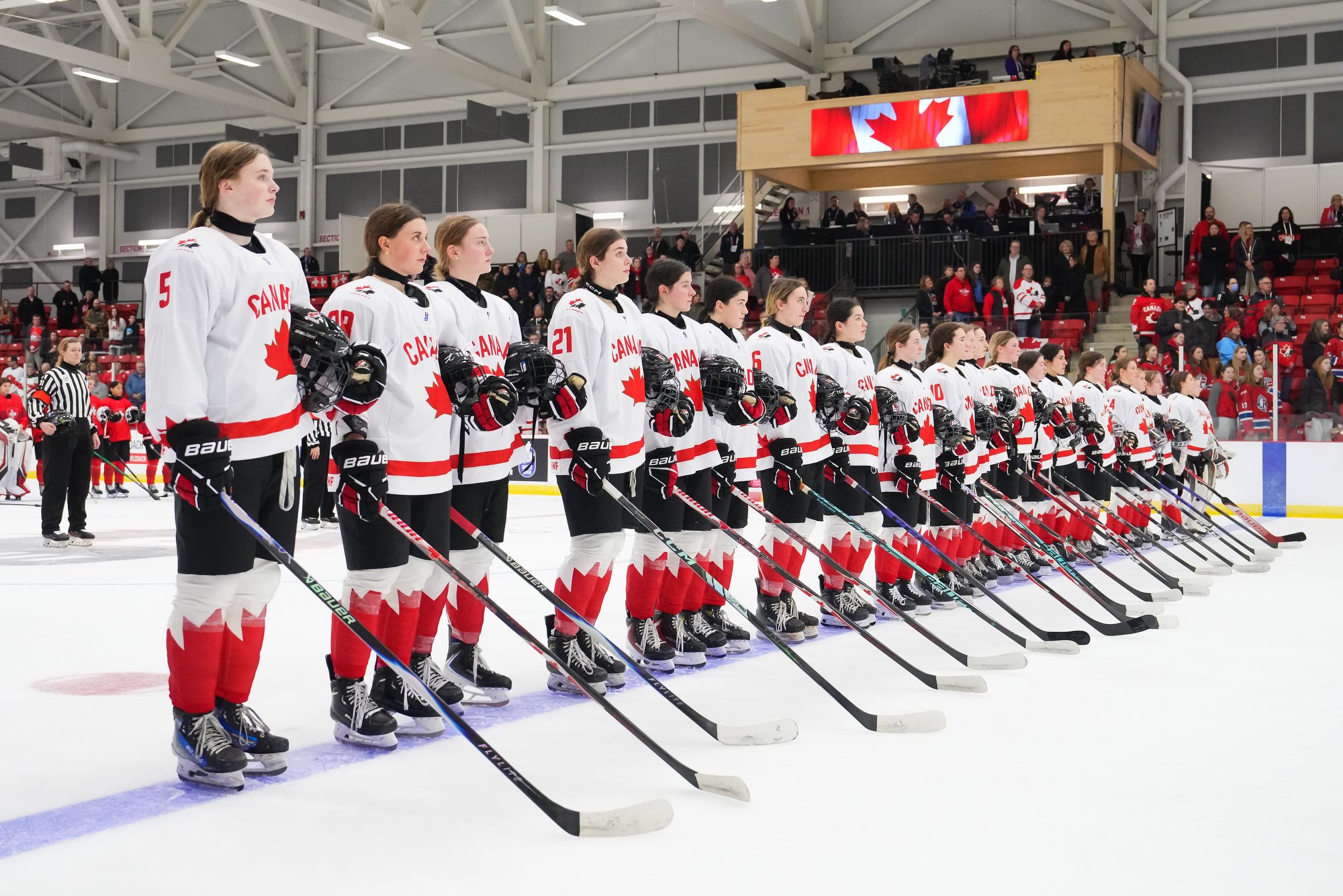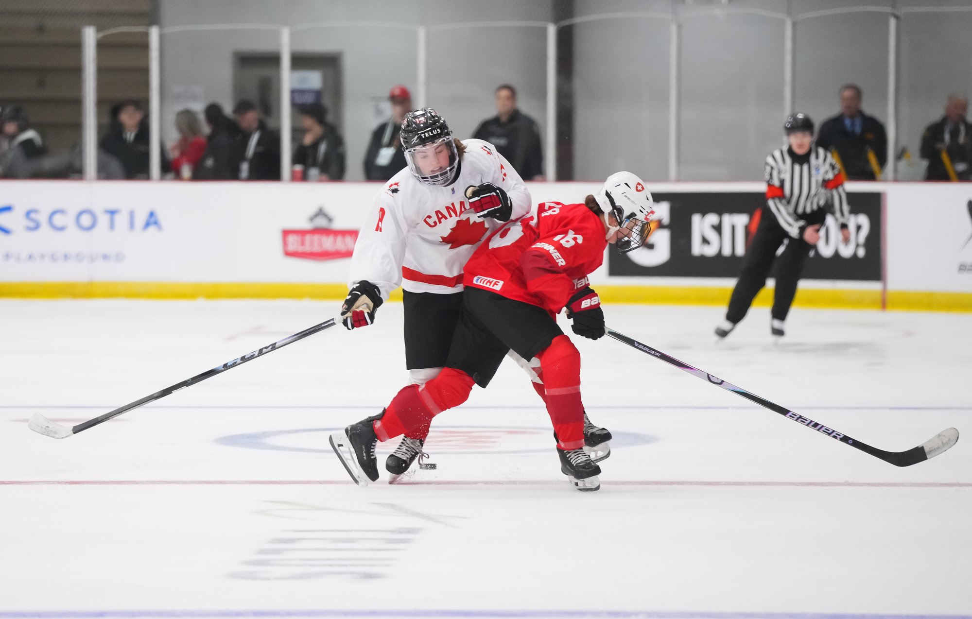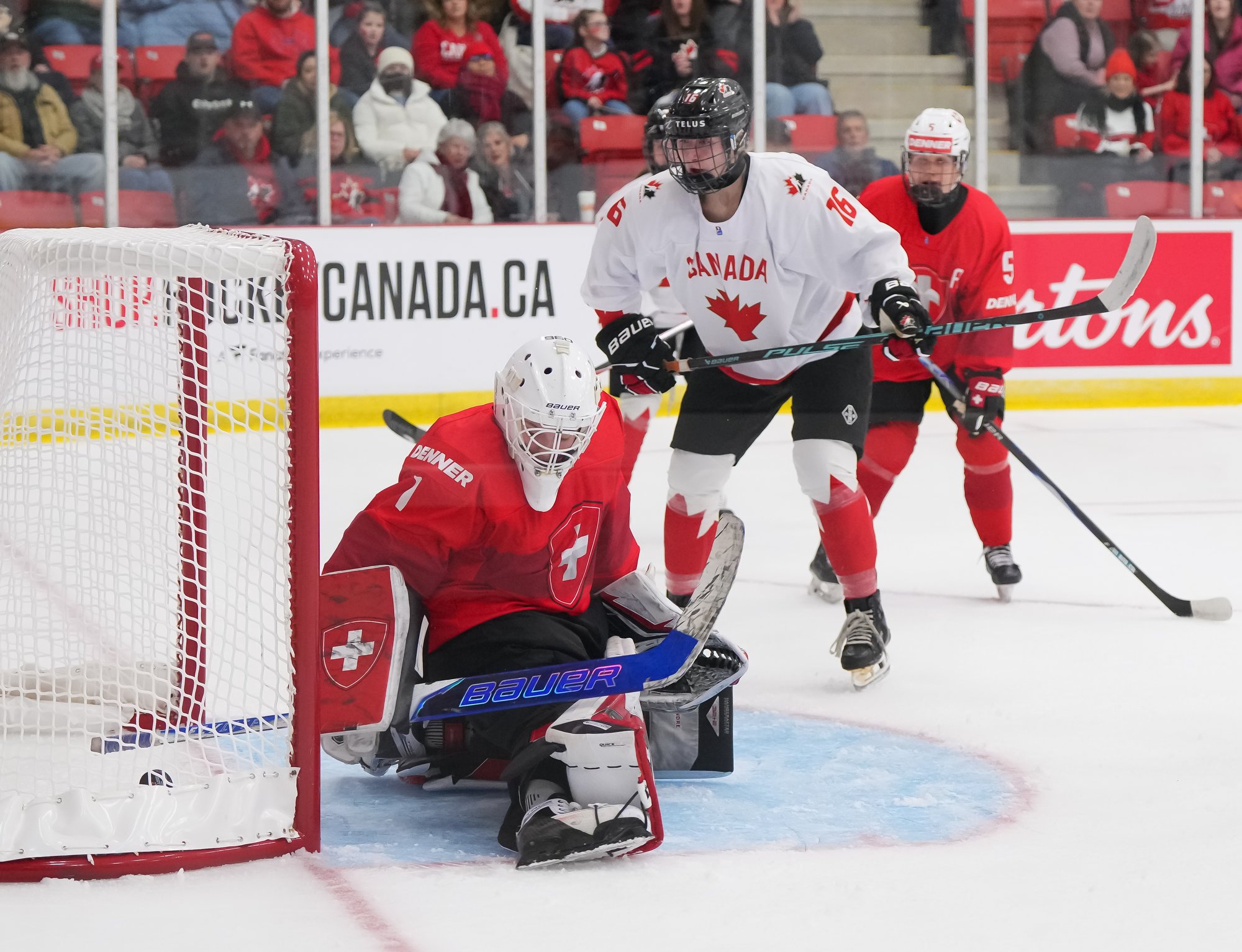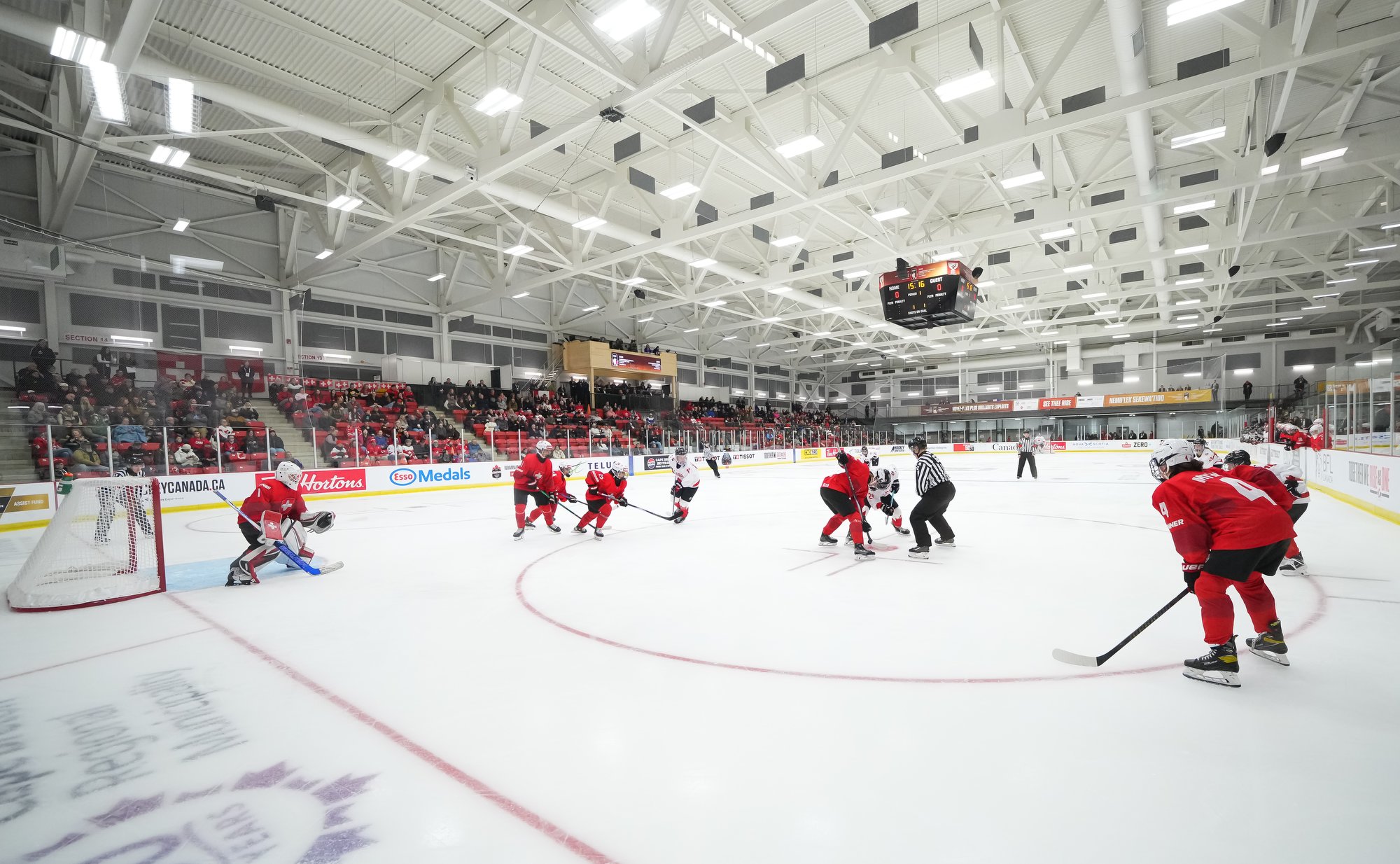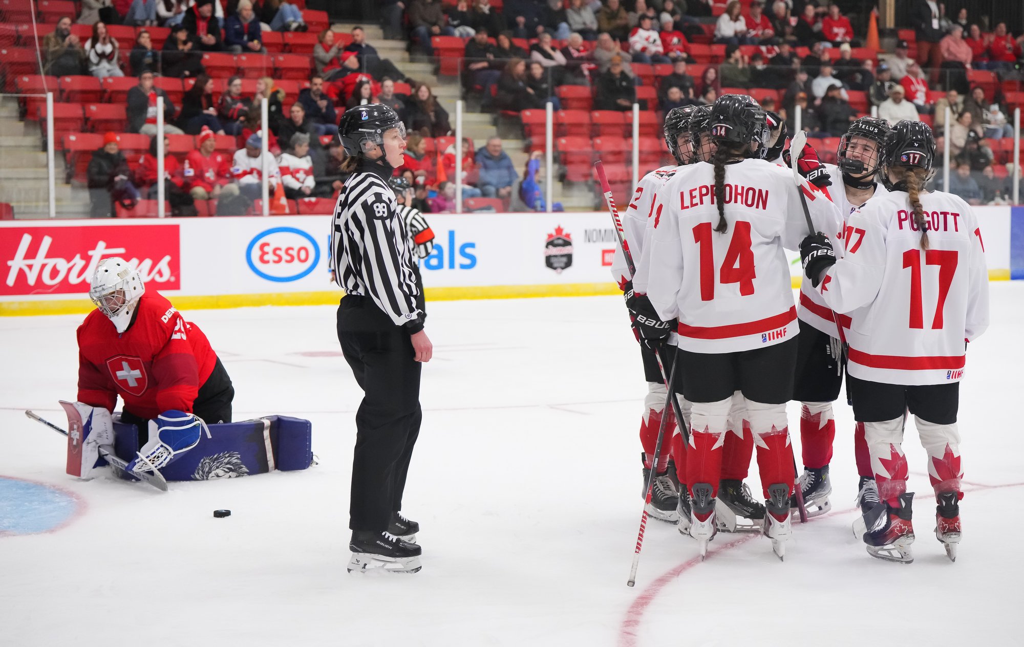 It was a sea of red and white on the ice and in the stands at the Sport and Wellness Centre in Membertou, Nova Scotia as Canada started its gold-medal defense at the 2026 U18 Women’s World Championship with a convincing 9-0 win over Switzerland to close out Day 1 of round-robin action.