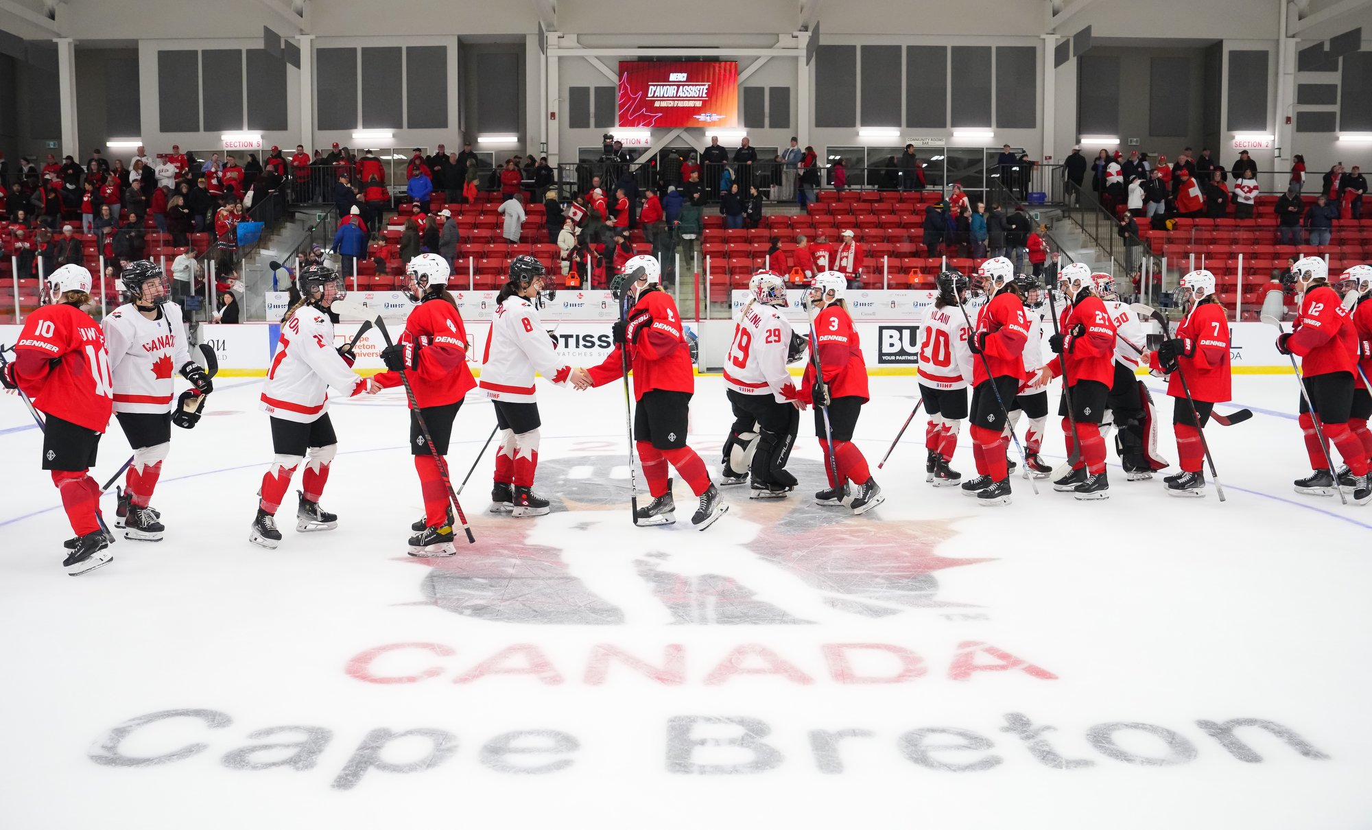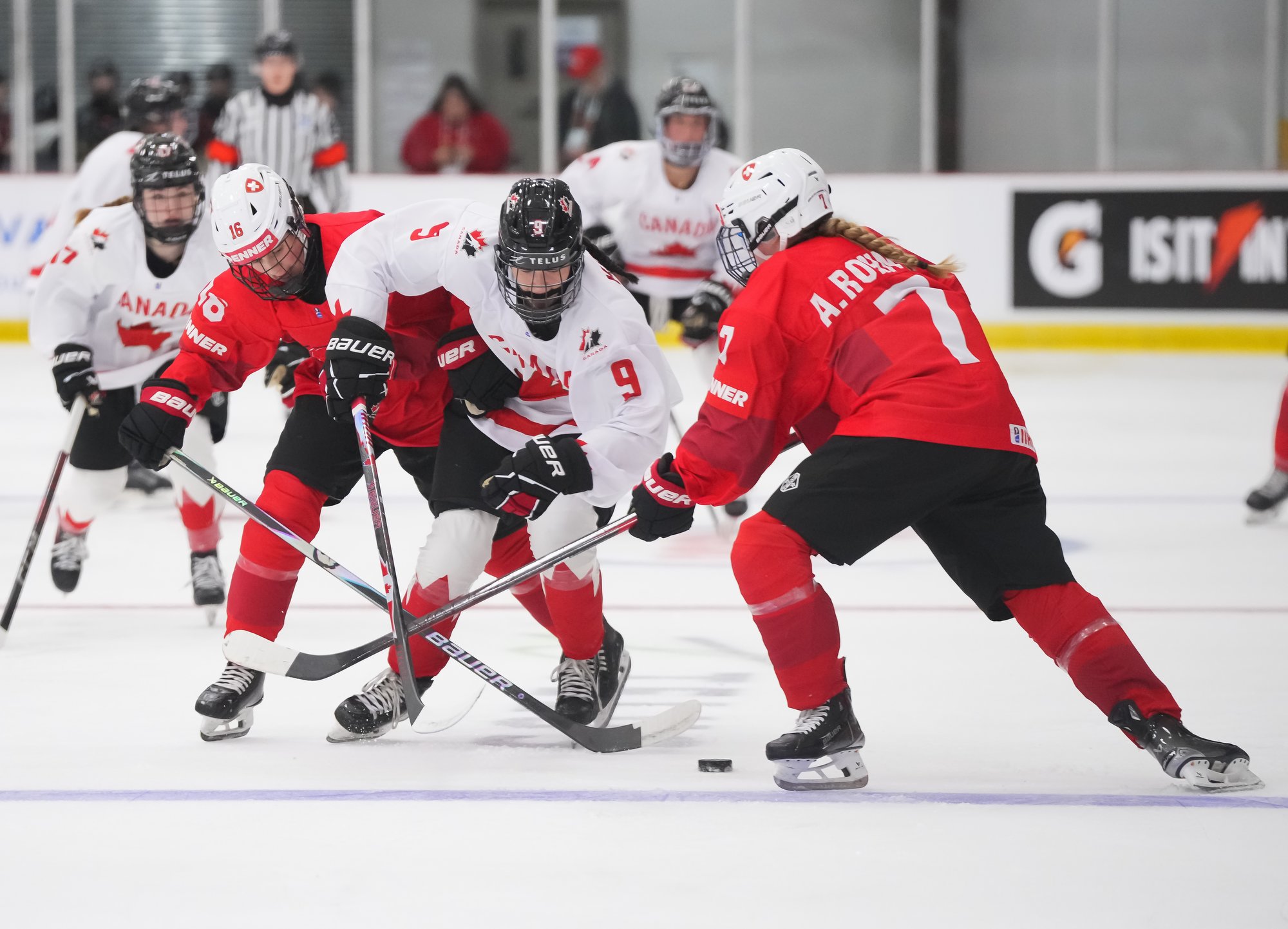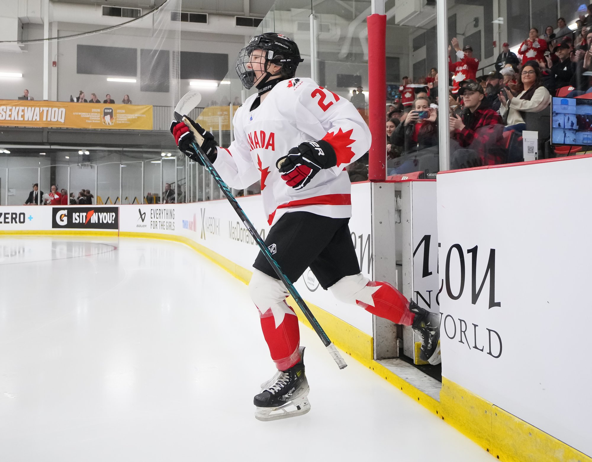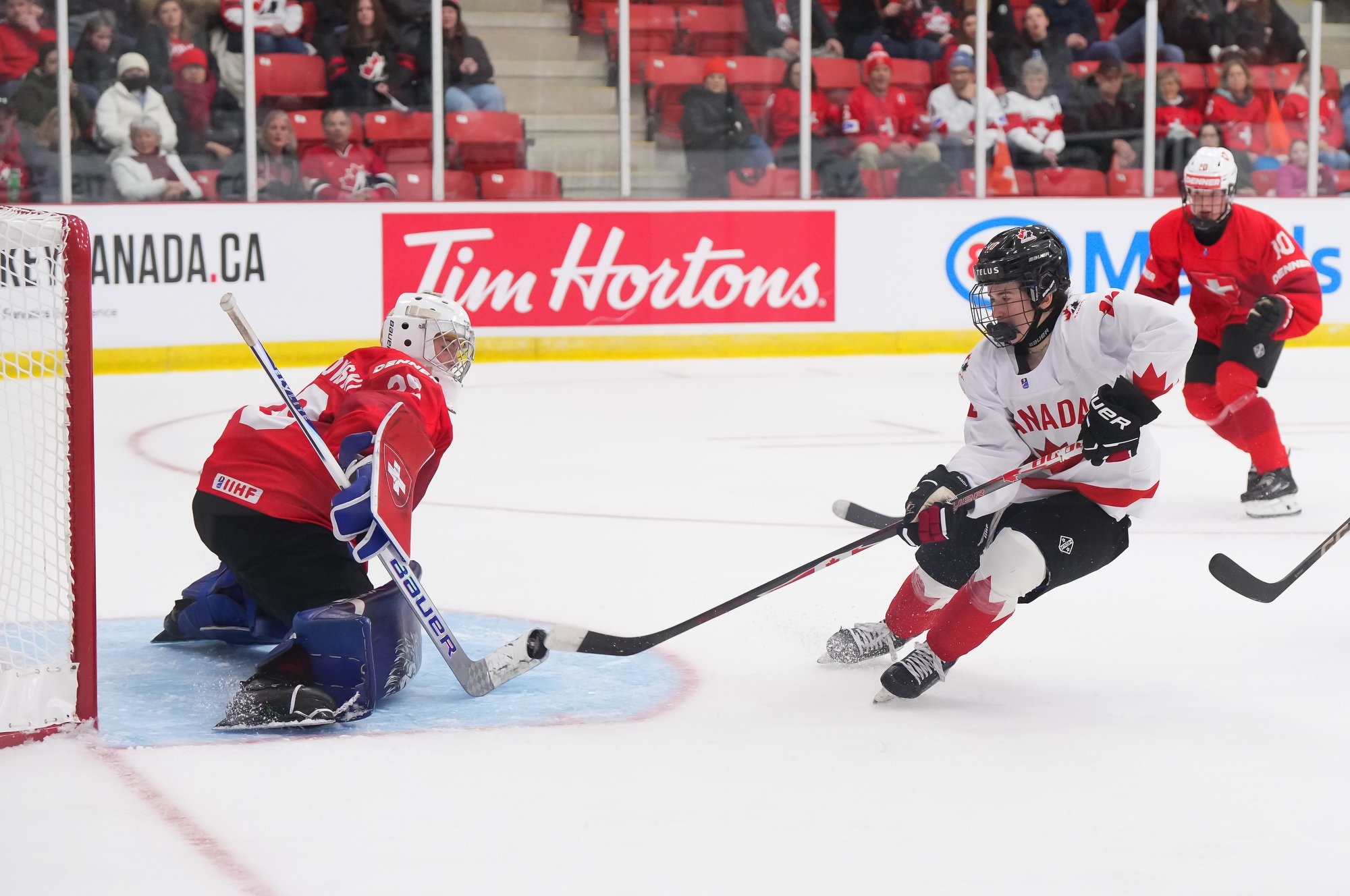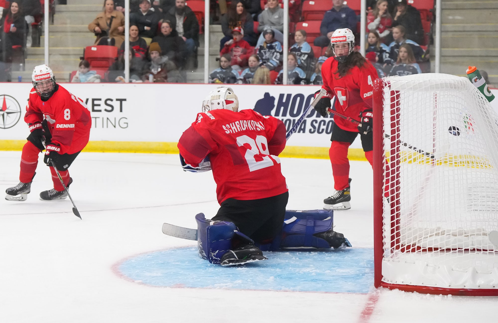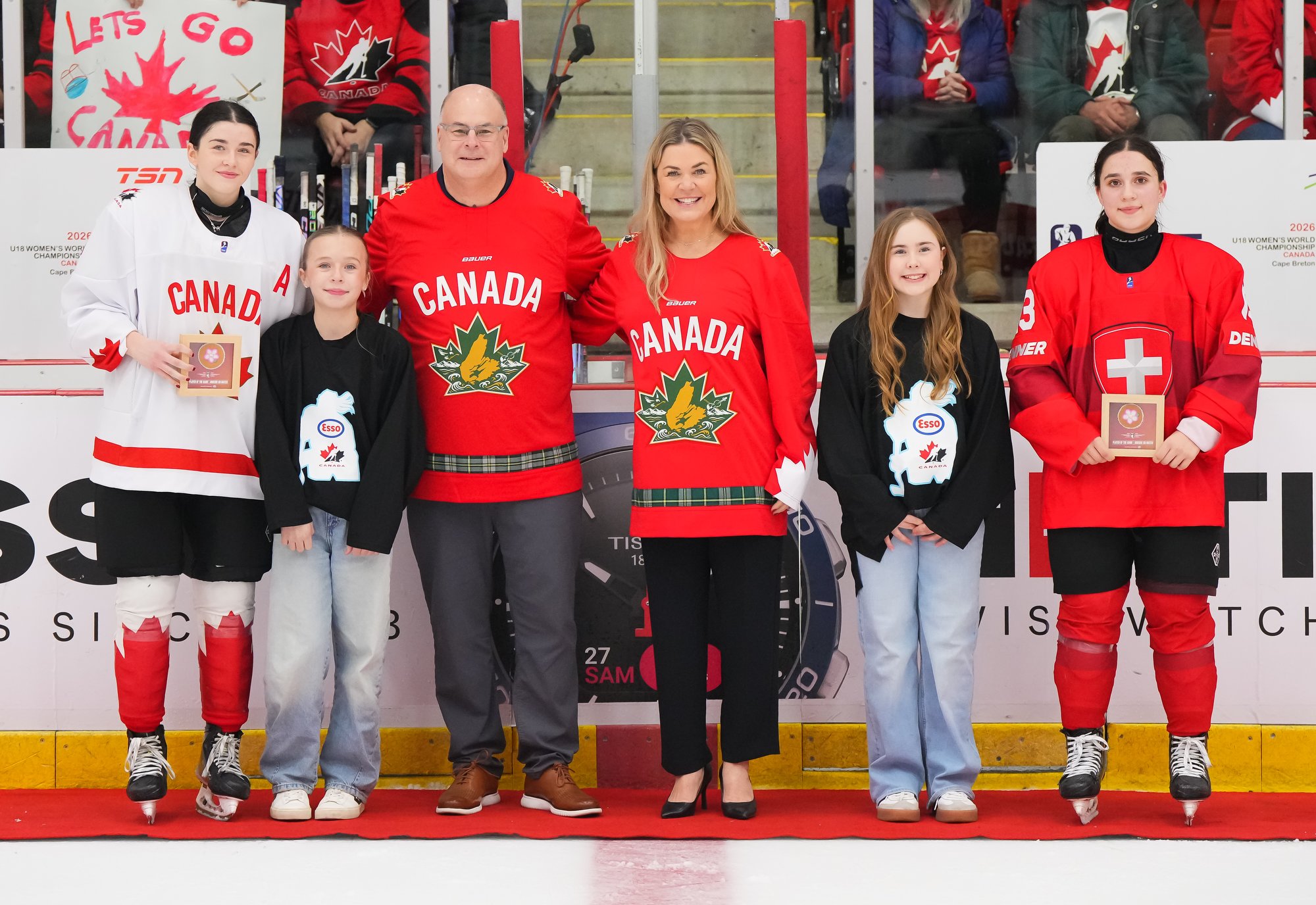 It was a sea of red and white on the ice and in the stands at the Sport and Wellness Centre in Membertou, Nova Scotia as Canada started its gold-medal defense at the 2026 U18 Women’s World Championship with a convincing 9-0 win over Switzerland to close out Day 1 of round-robin action.