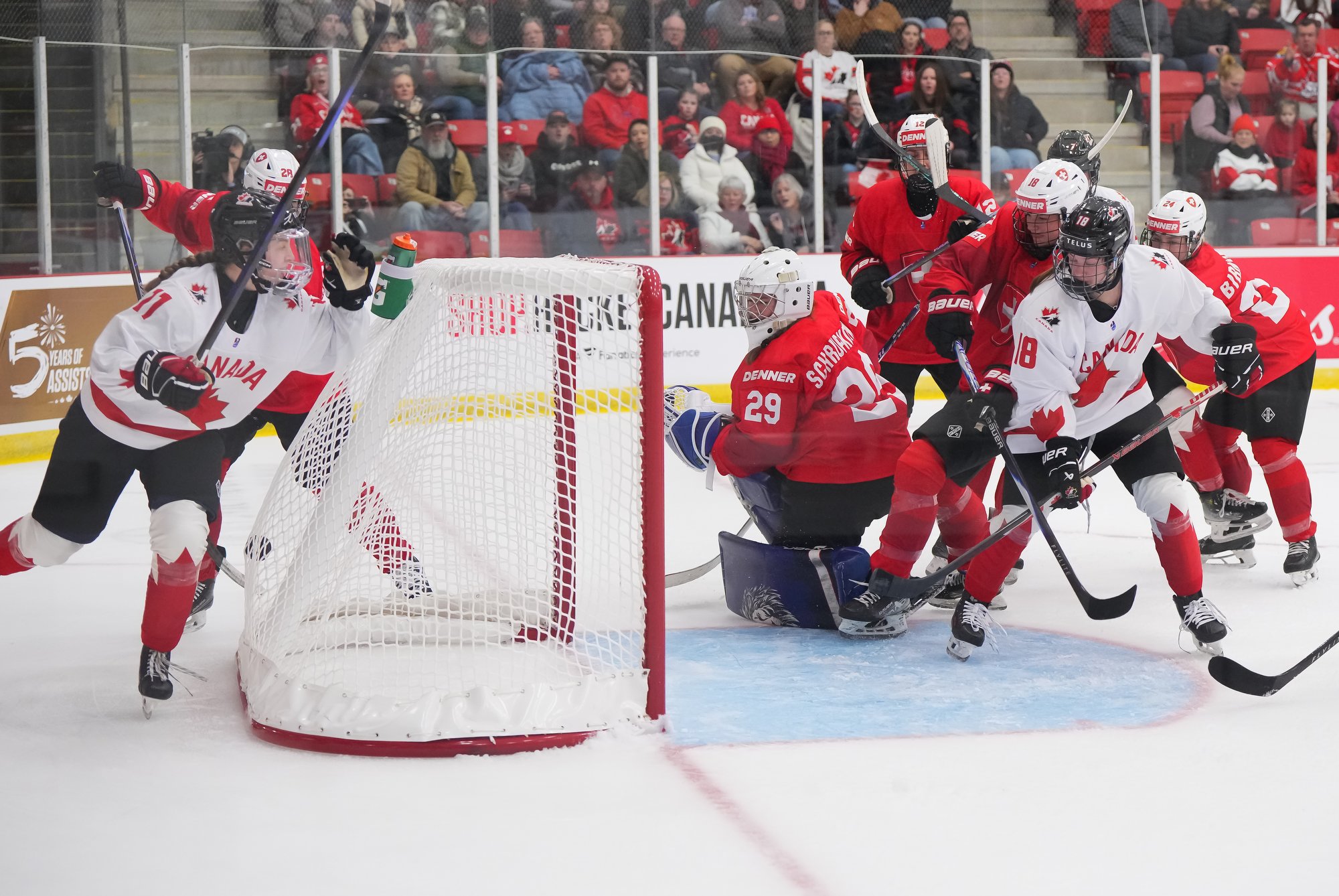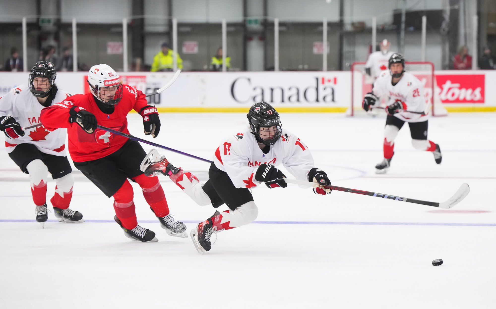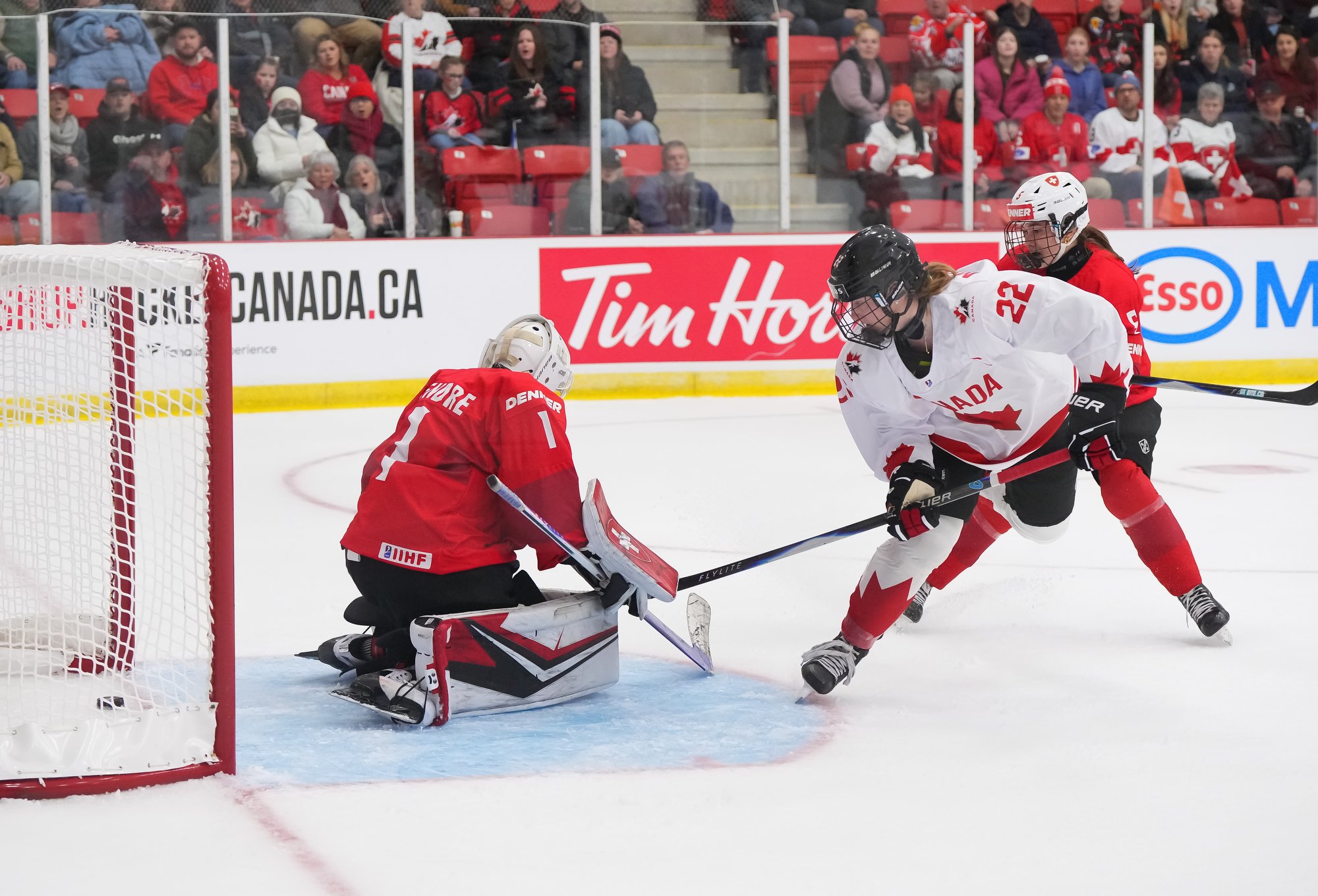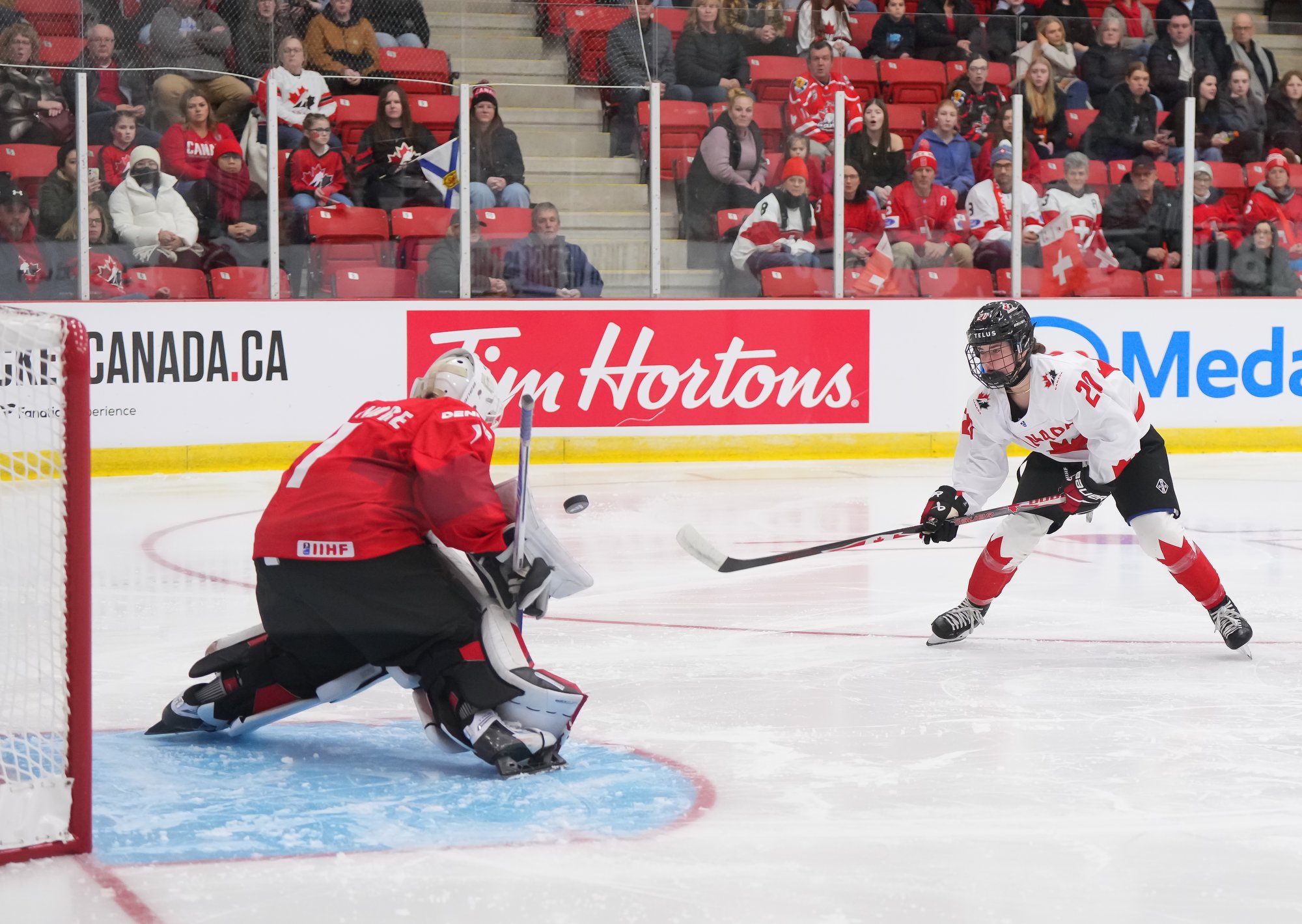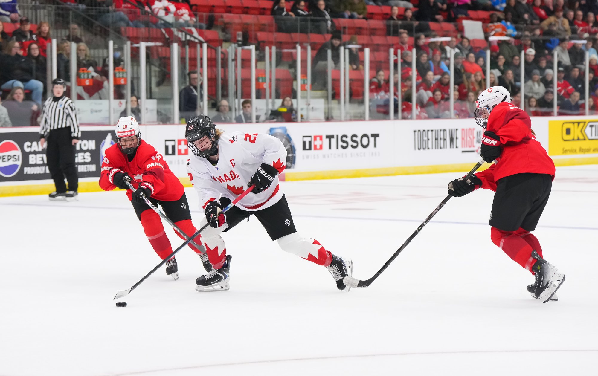 It was a sea of red and white on the ice and in the stands at the Sport and Wellness Centre in Membertou, Nova Scotia as Canada started its gold-medal defense at the 2026 U18 Women’s World Championship with a convincing 9-0 win over Switzerland to close out Day 1 of round-robin action.
