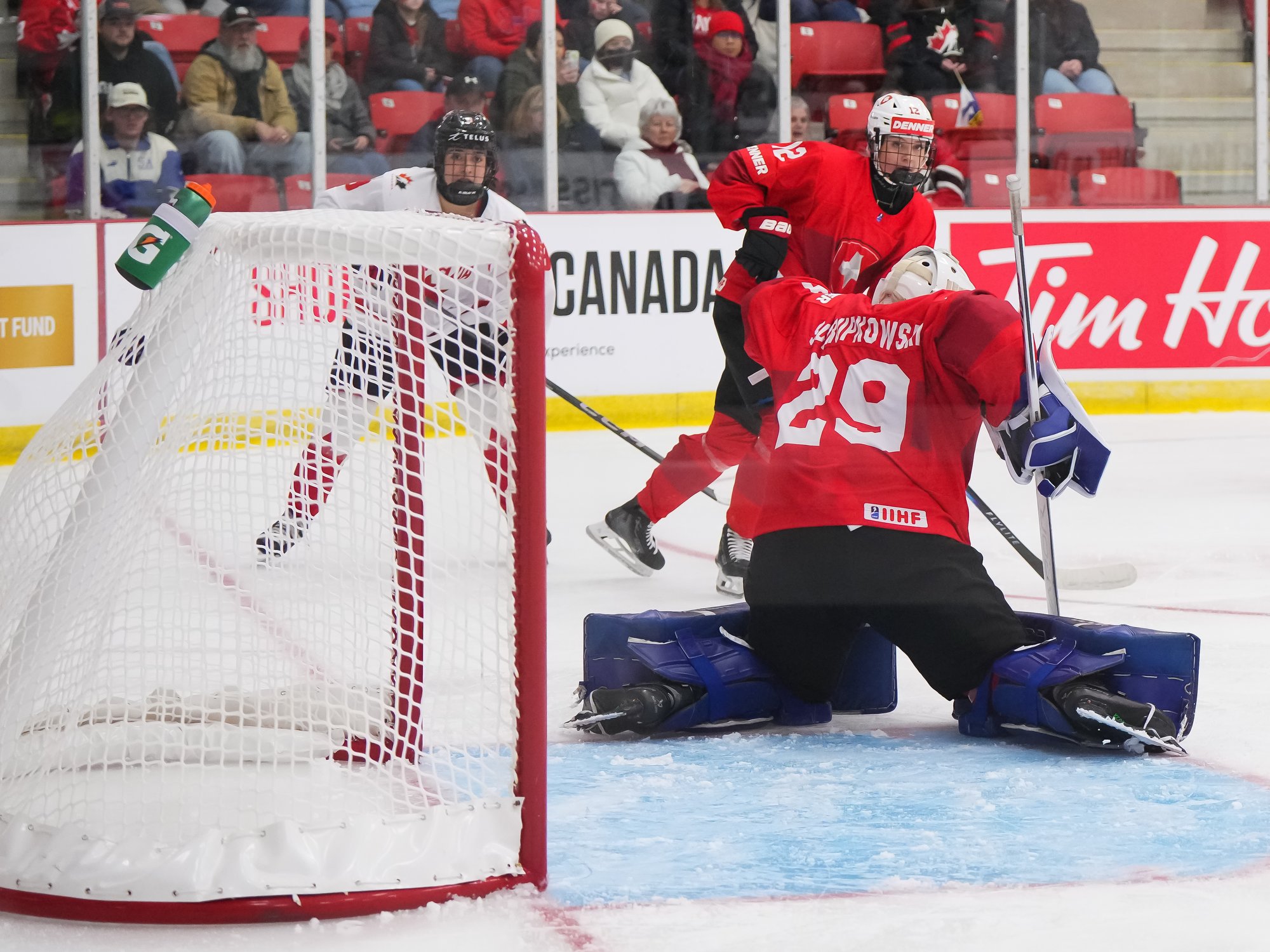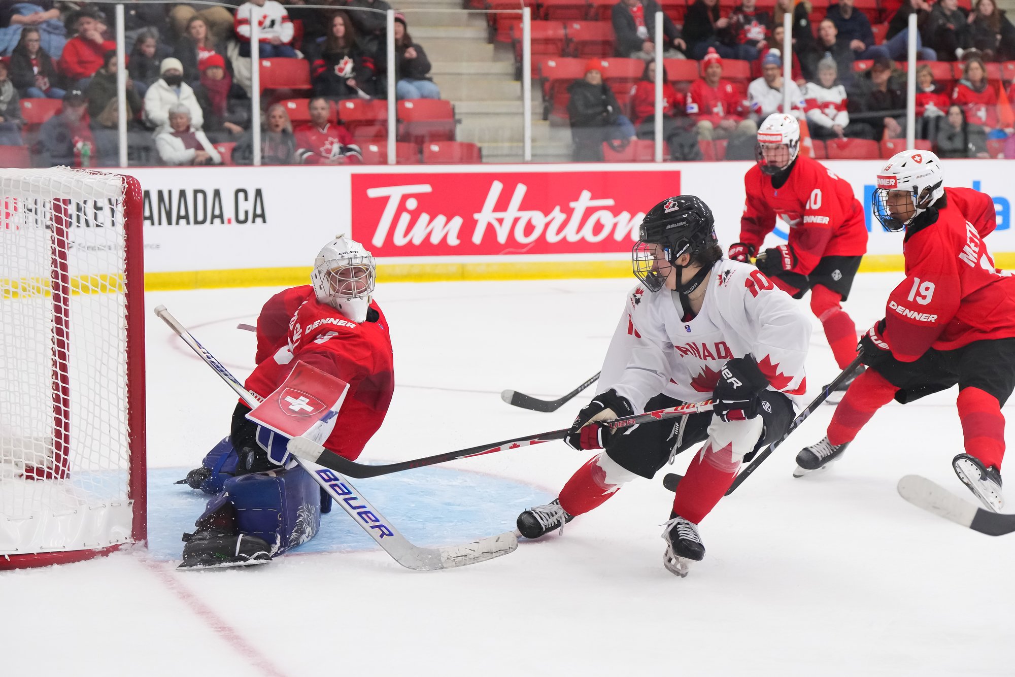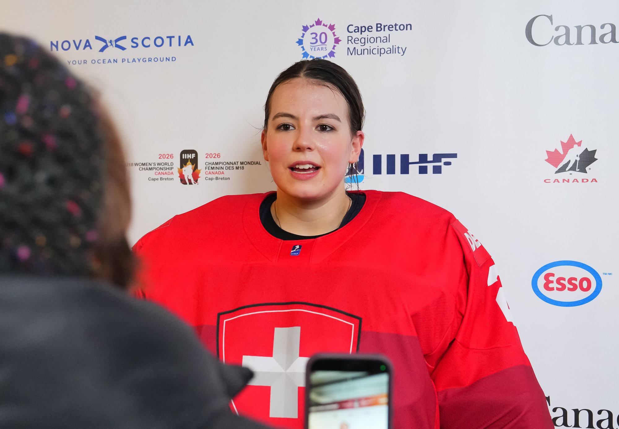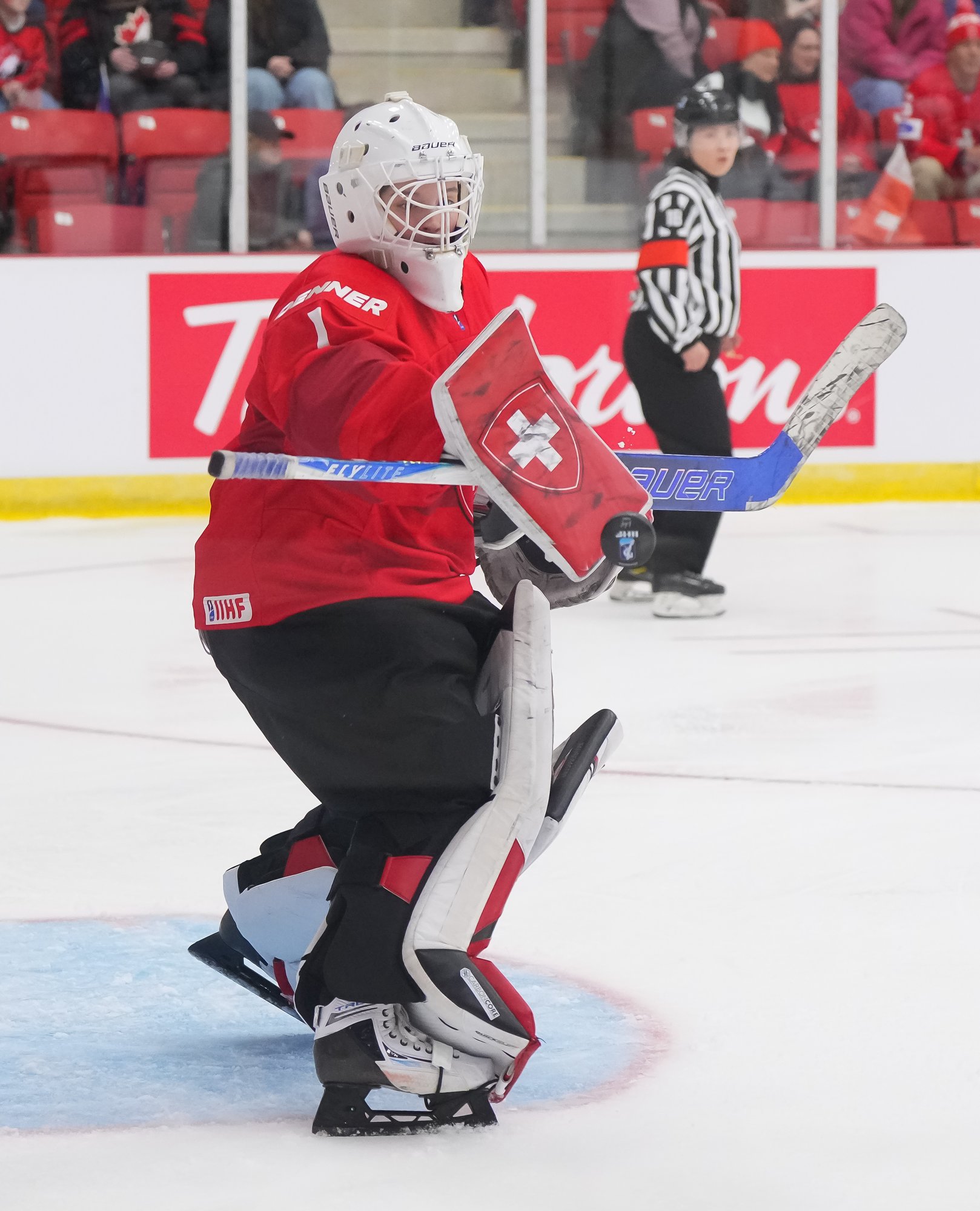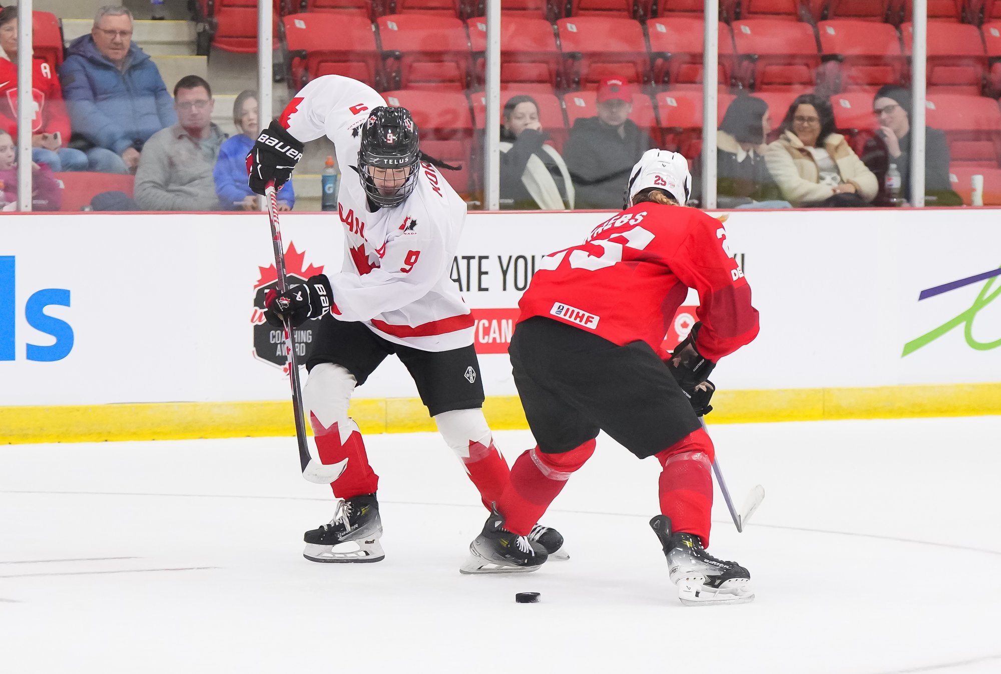 It was a sea of red and white on the ice and in the stands at the Sport and Wellness Centre in Membertou, Nova Scotia as Canada started its gold-medal defense at the 2026 U18 Women’s World Championship with a convincing 9-0 win over Switzerland to close out Day 1 of round-robin action.