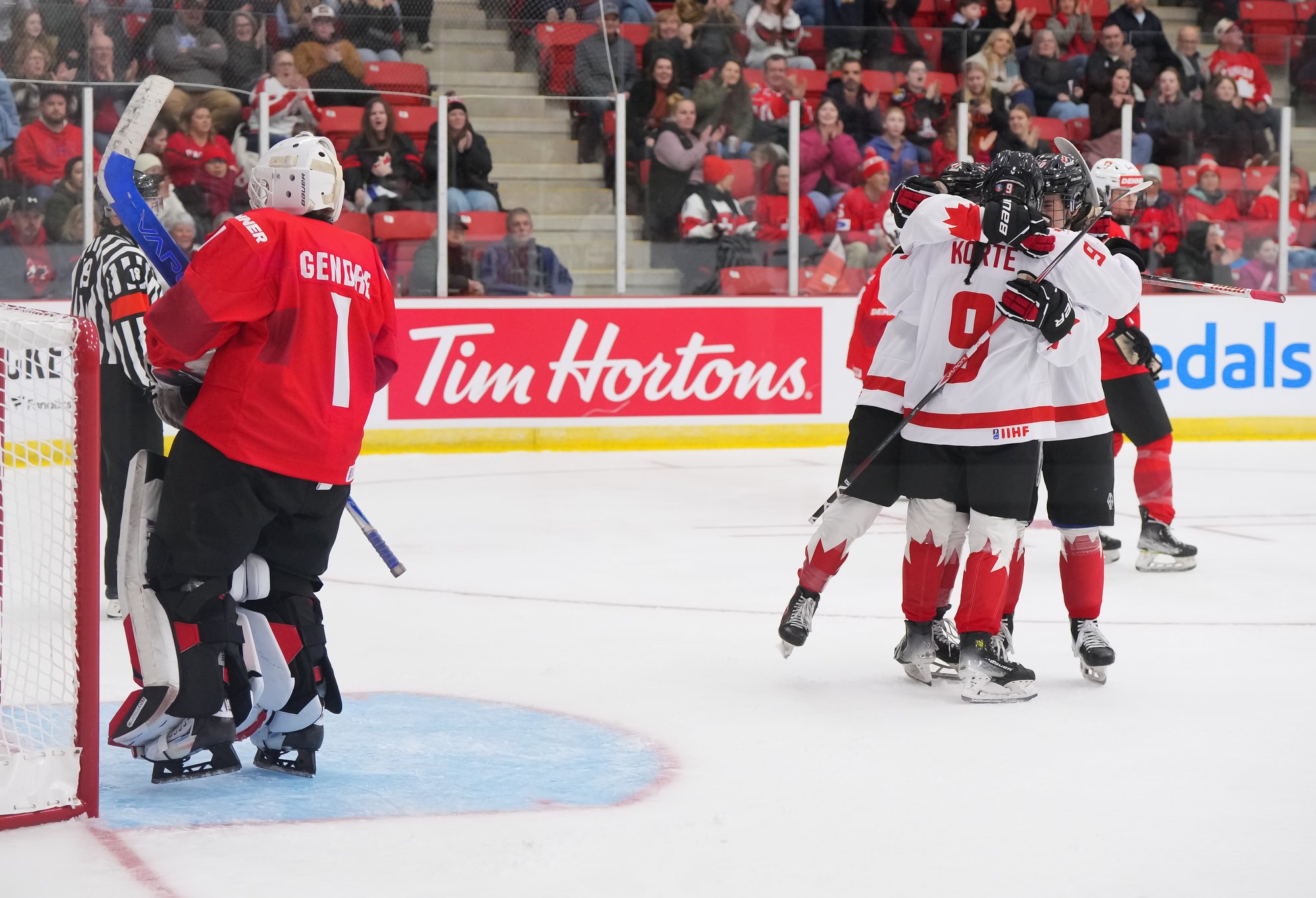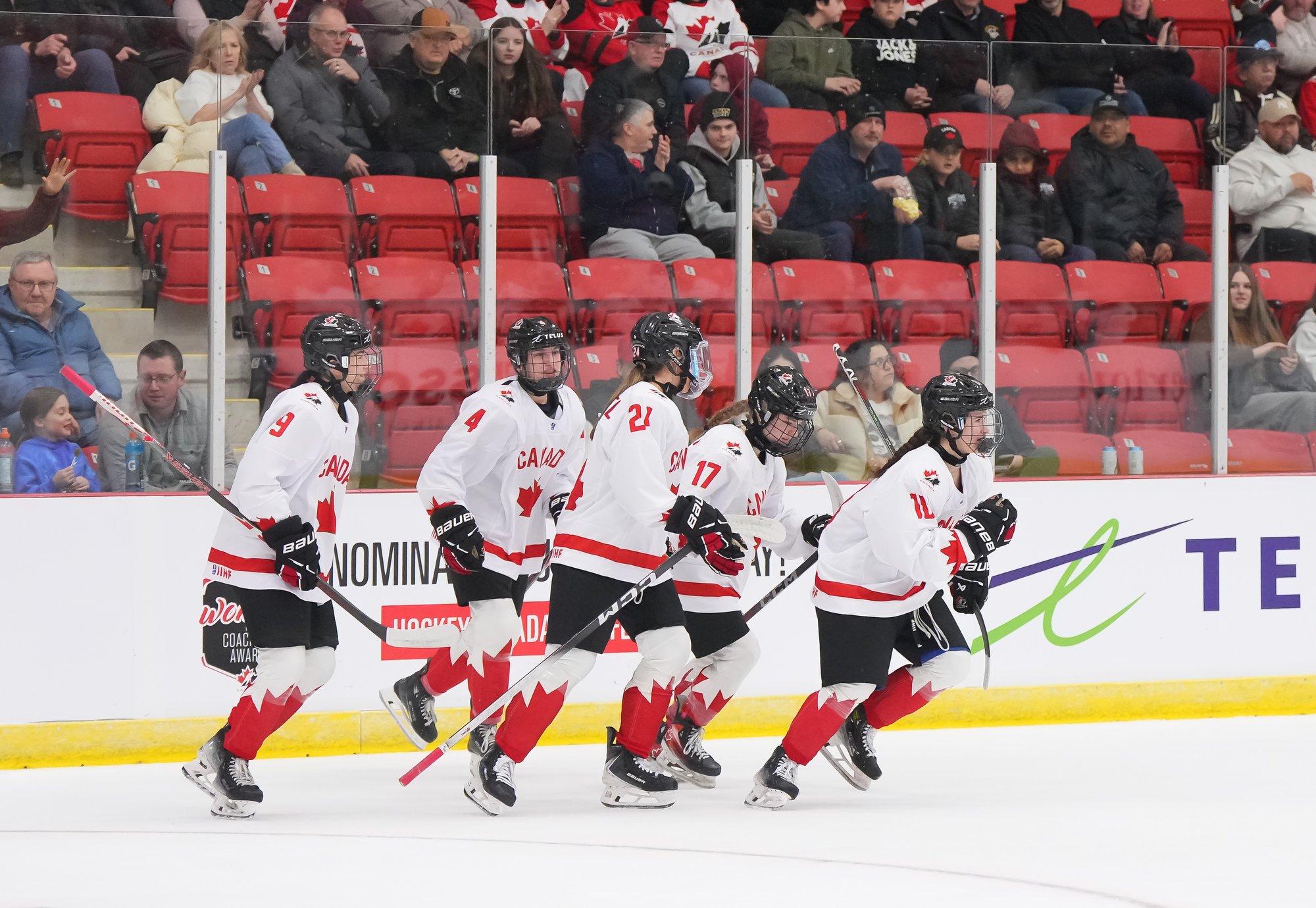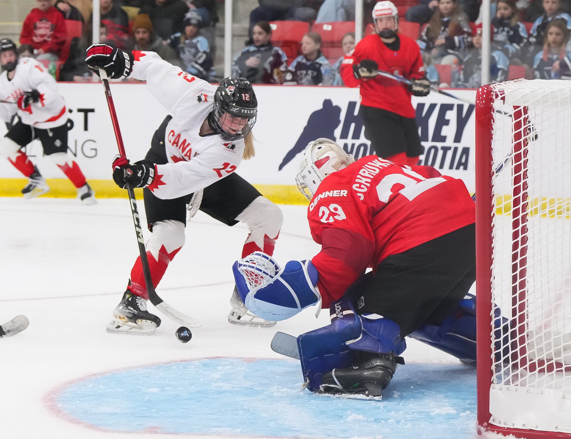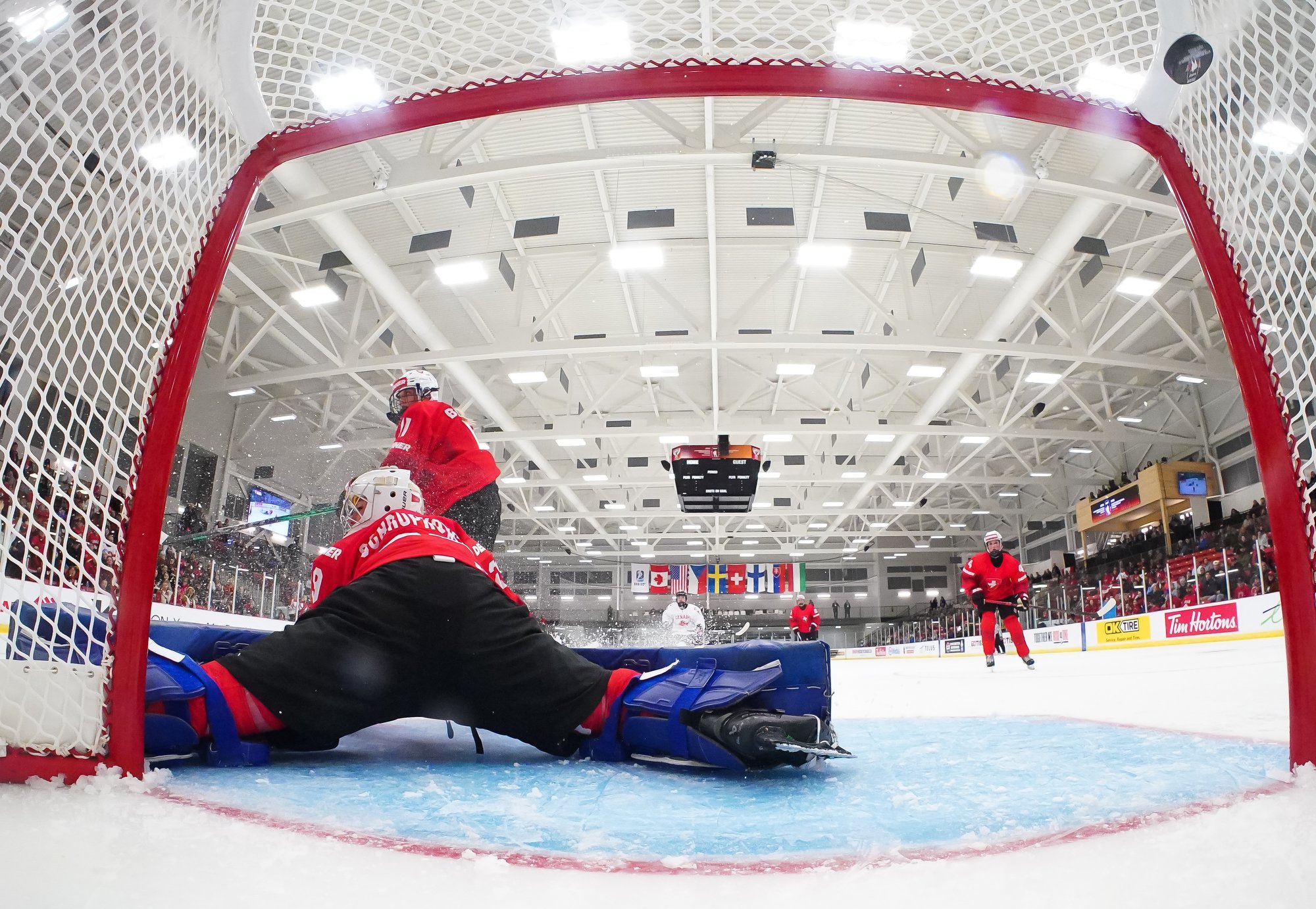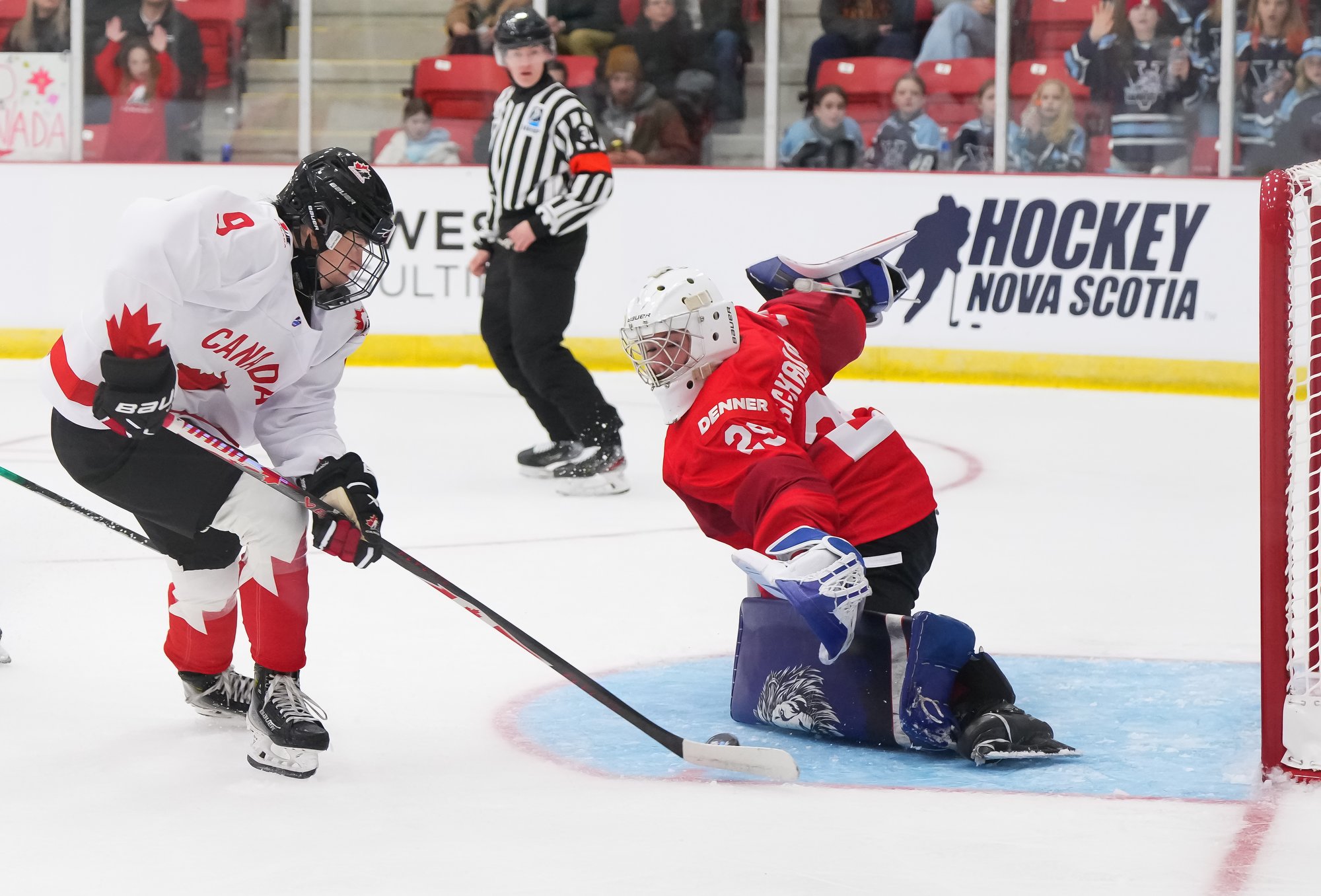 It was a sea of red and white on the ice and in the stands at the Sport and Wellness Centre in Membertou, Nova Scotia as Canada started its gold-medal defense at the 2026 U18 Women’s World Championship with a convincing 9-0 win over Switzerland to close out Day 1 of round-robin action.