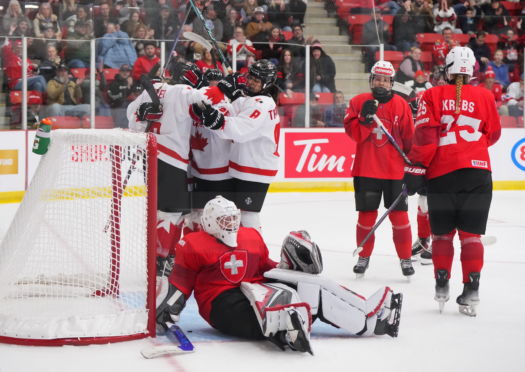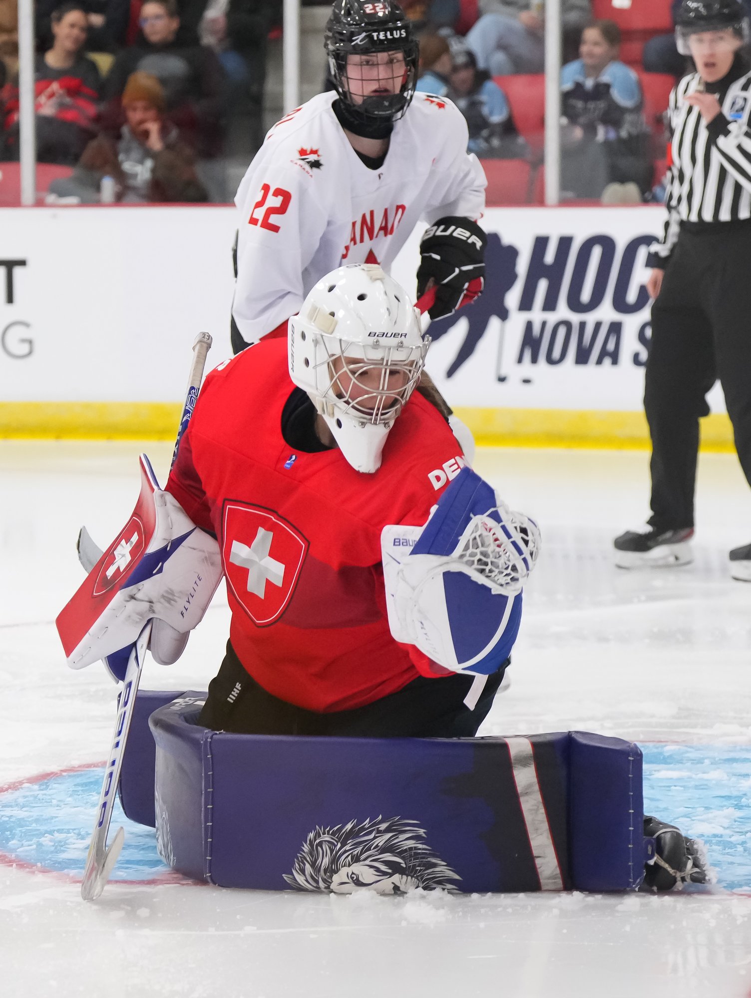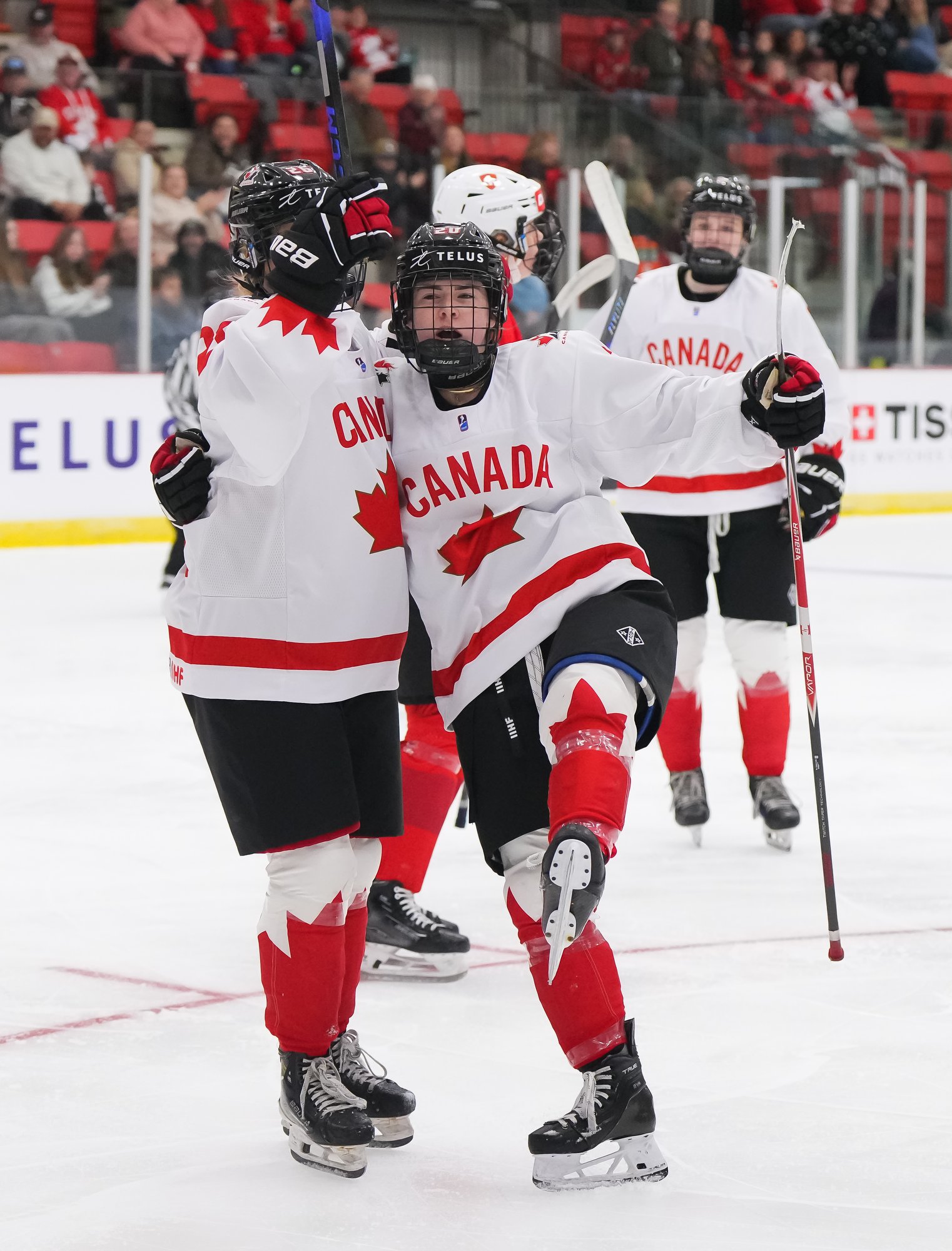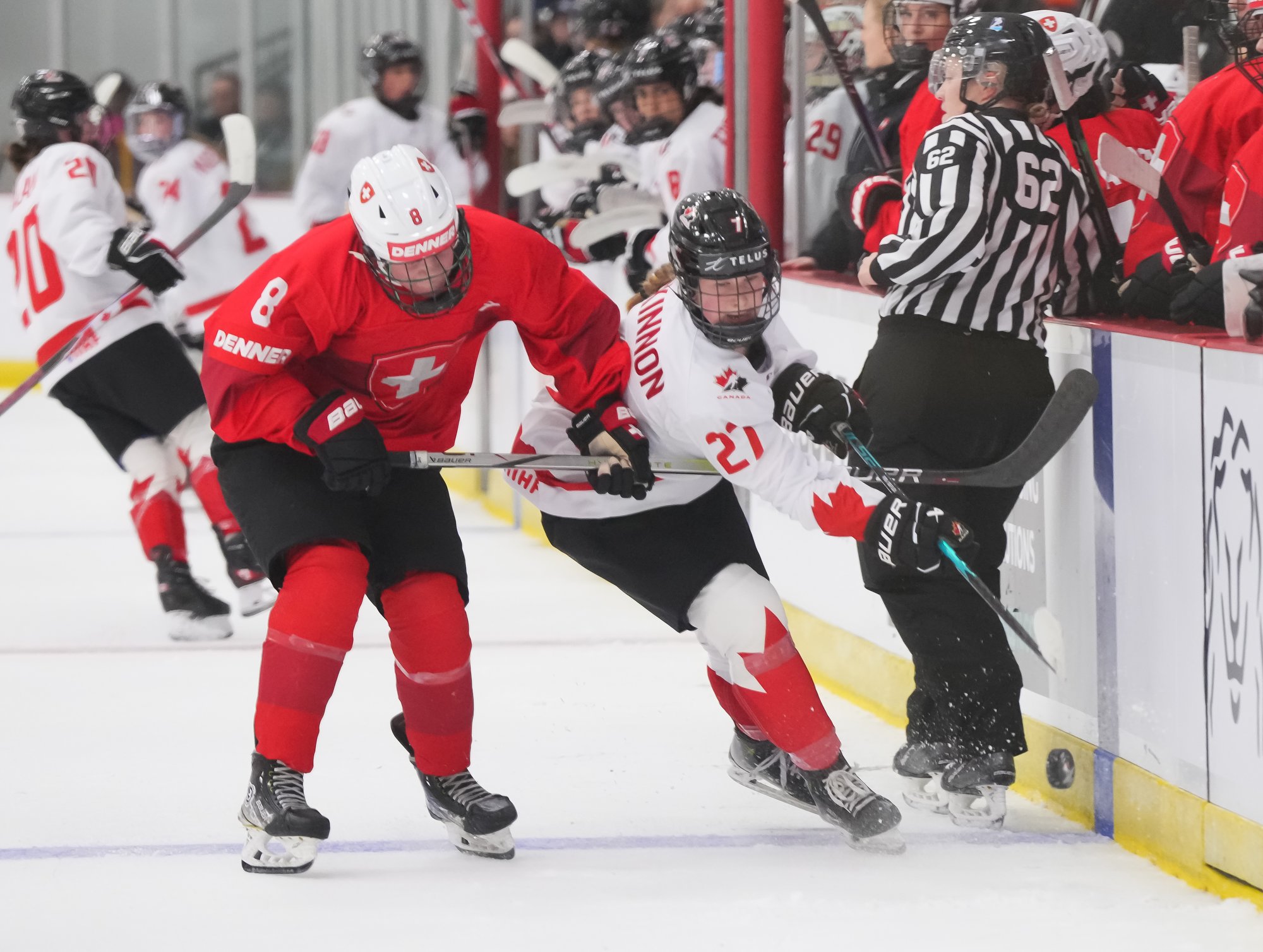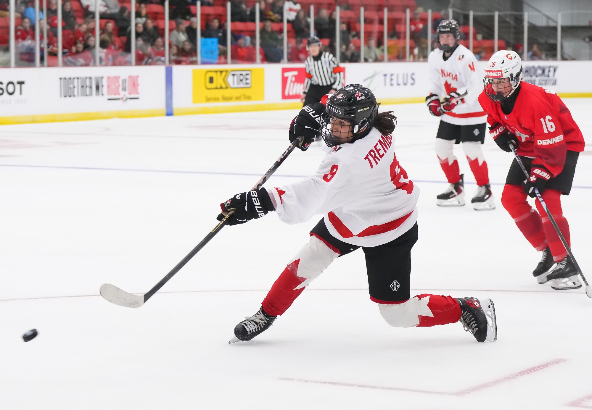 It was a sea of red and white on the ice and in the stands at the Sport and Wellness Centre in Membertou, Nova Scotia as Canada started its gold-medal defense at the 2026 U18 Women’s World Championship with a convincing 9-0 win over Switzerland to close out Day 1 of round-robin action.