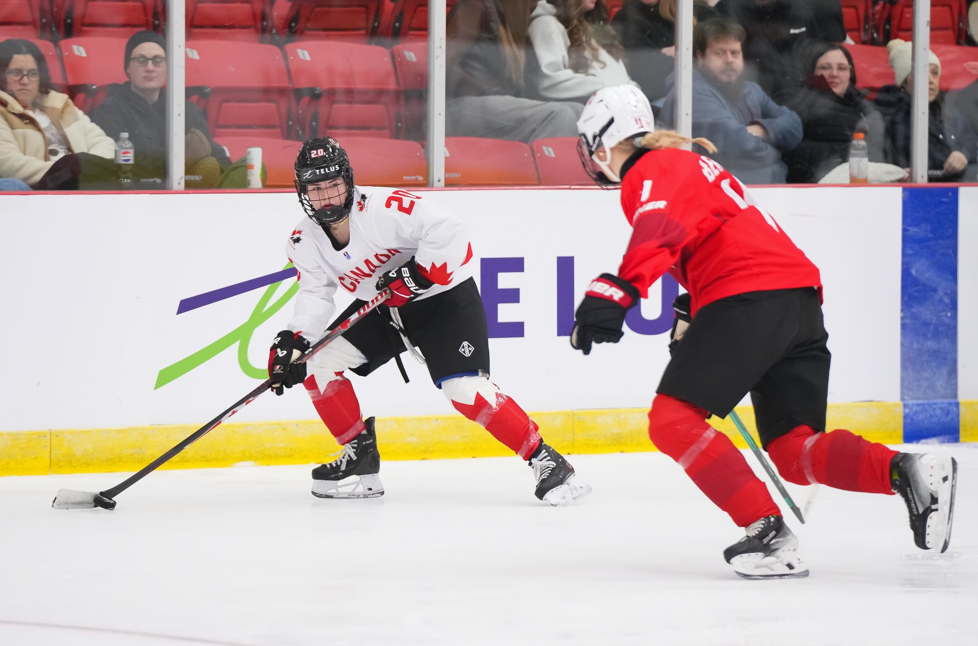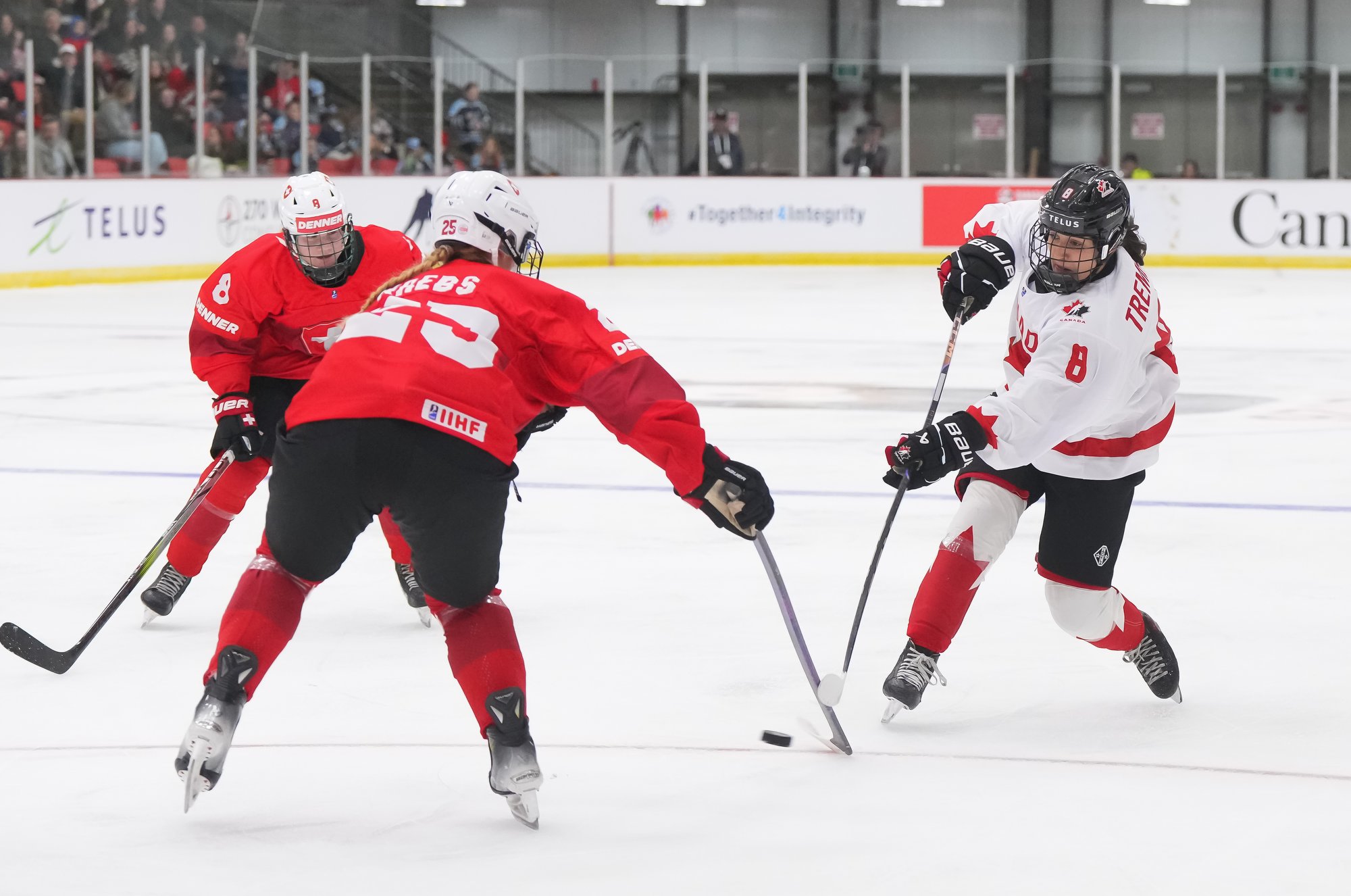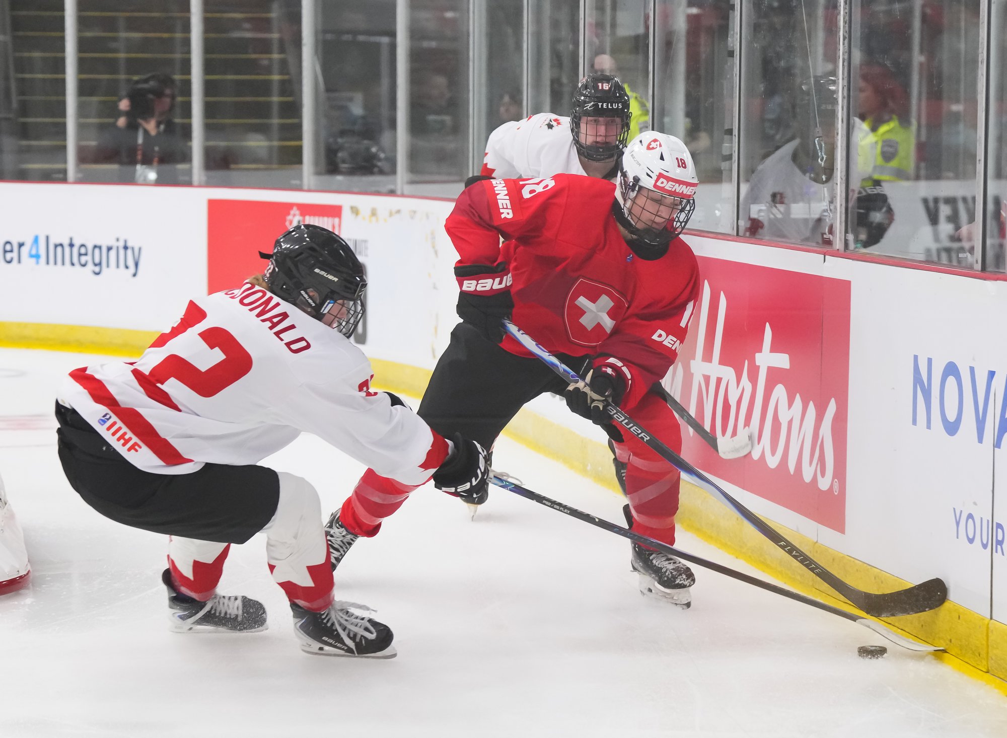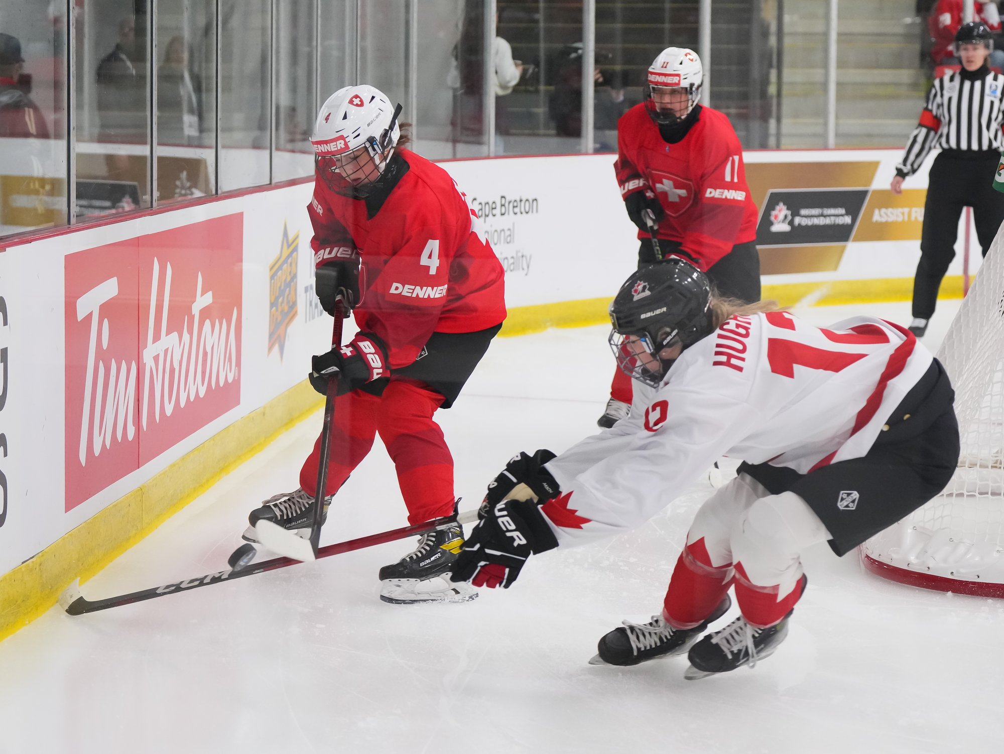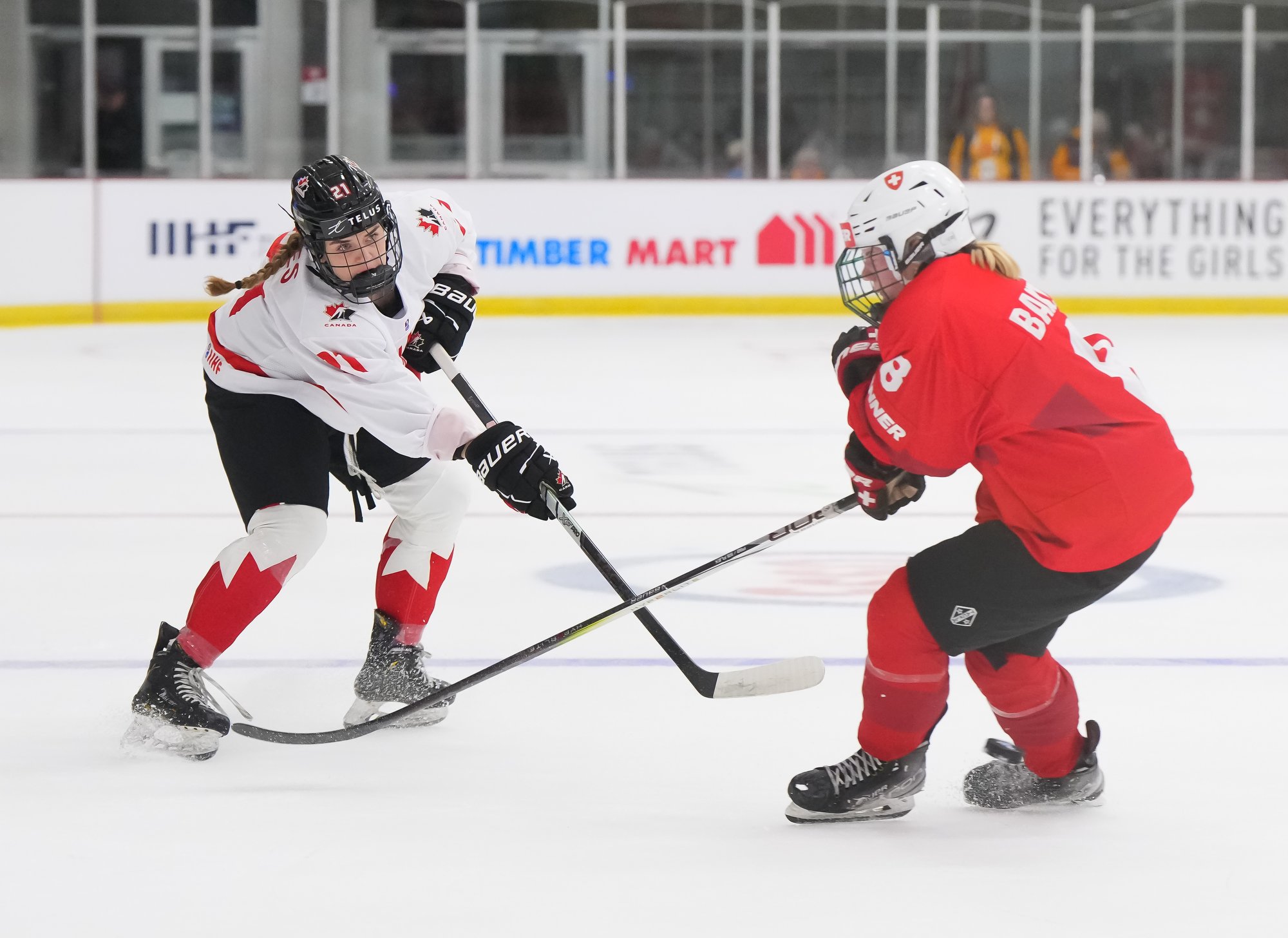 It was a sea of red and white on the ice and in the stands at the Sport and Wellness Centre in Membertou, Nova Scotia as Canada started its gold-medal defense at the 2026 U18 Women’s World Championship with a convincing 9-0 win over Switzerland to close out Day 1 of round-robin action.