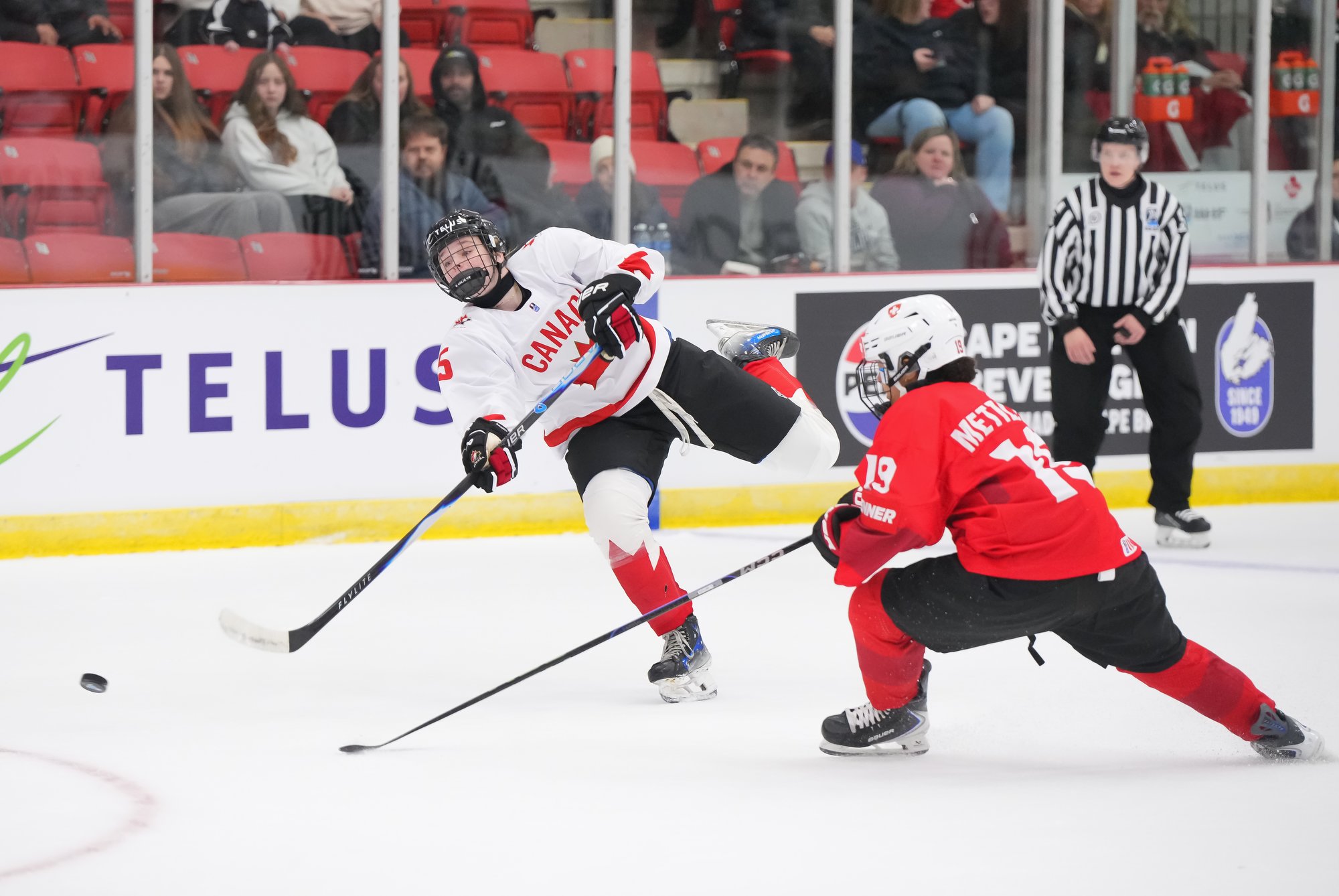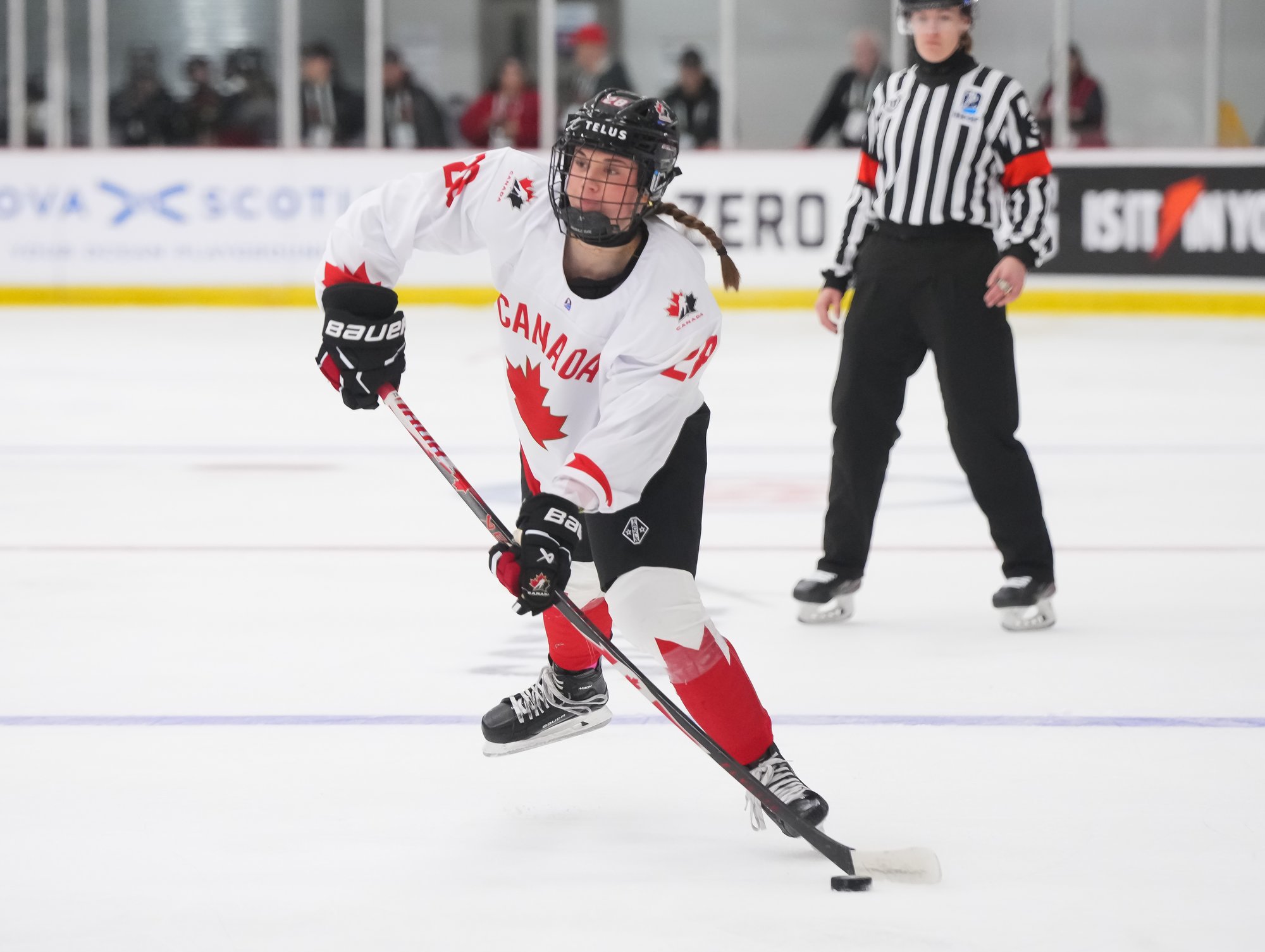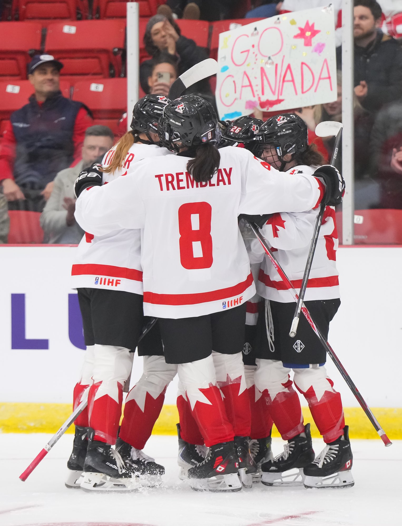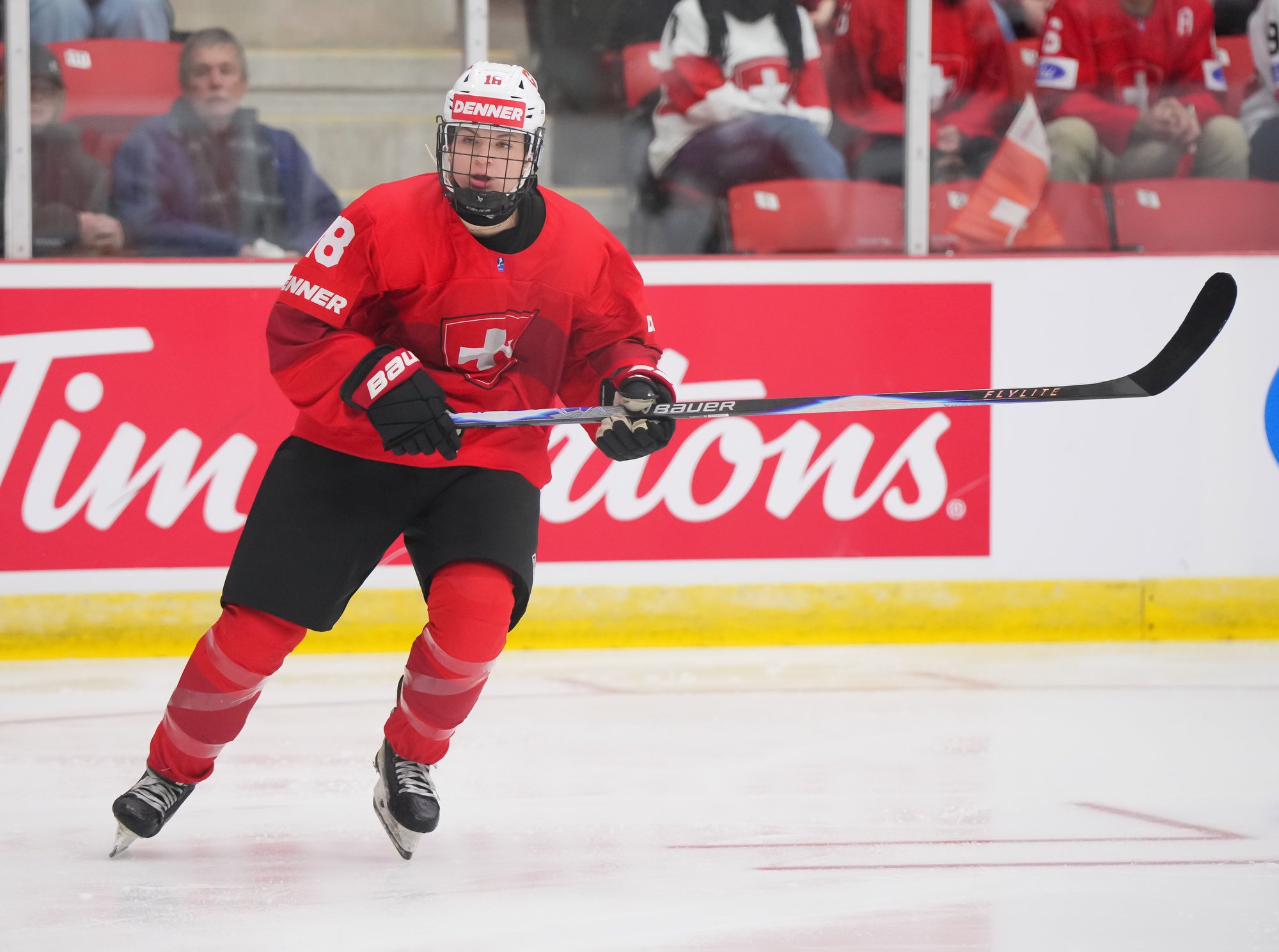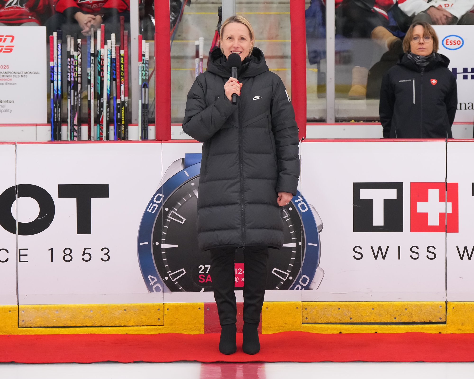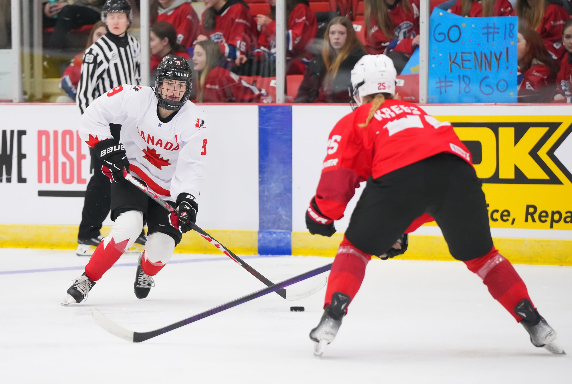 It was a sea of red and white on the ice and in the stands at the Sport and Wellness Centre in Membertou, Nova Scotia as Canada started its gold-medal defense at the 2026 U18 Women’s World Championship with a convincing 9-0 win over Switzerland to close out Day 1 of round-robin action.