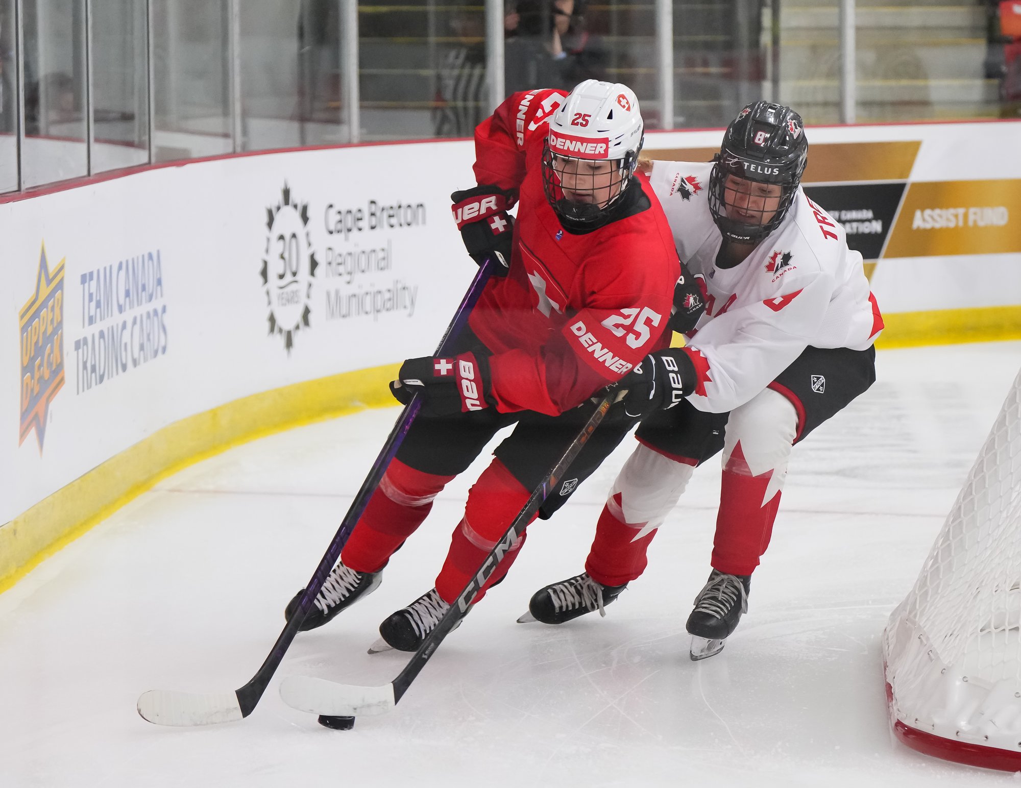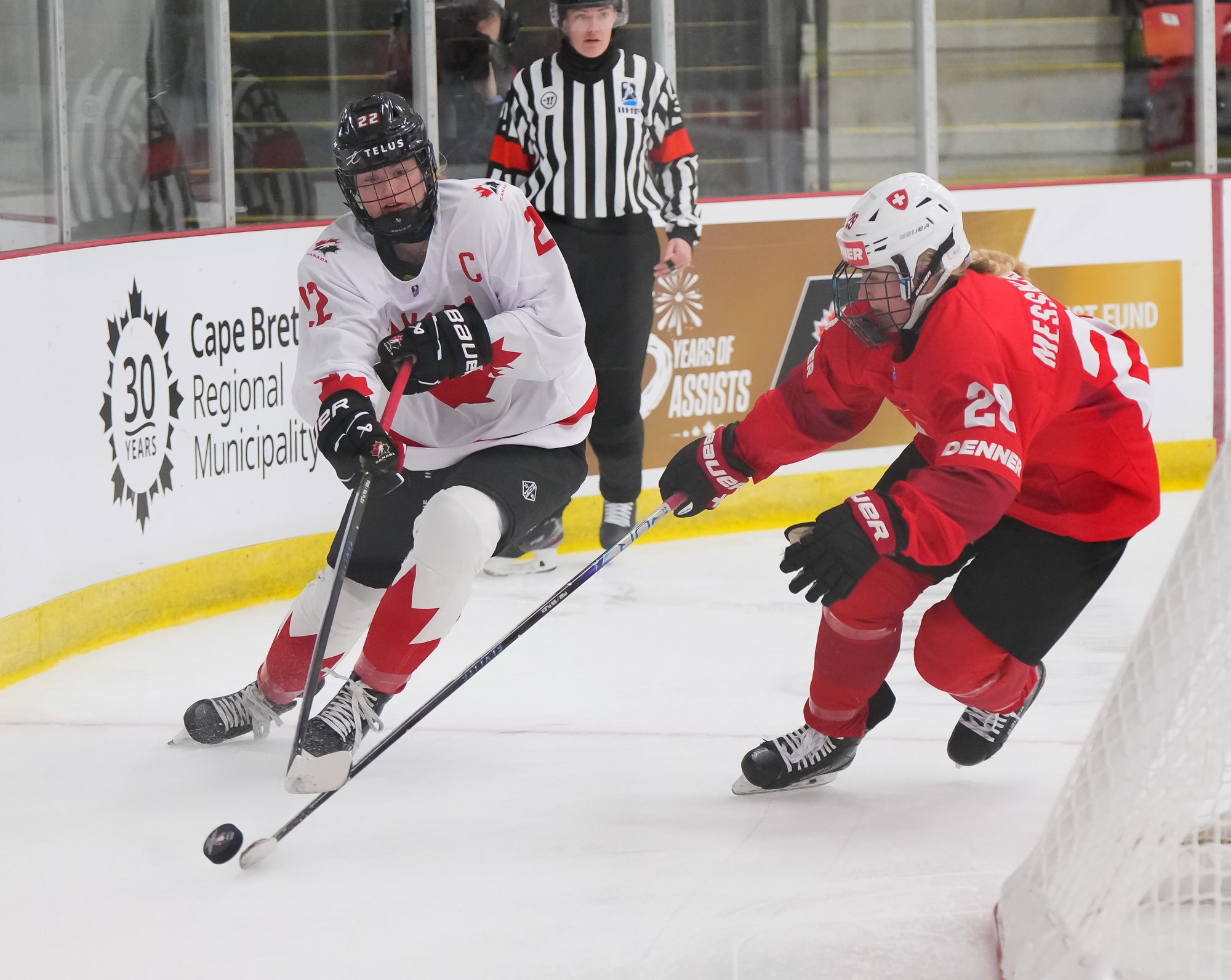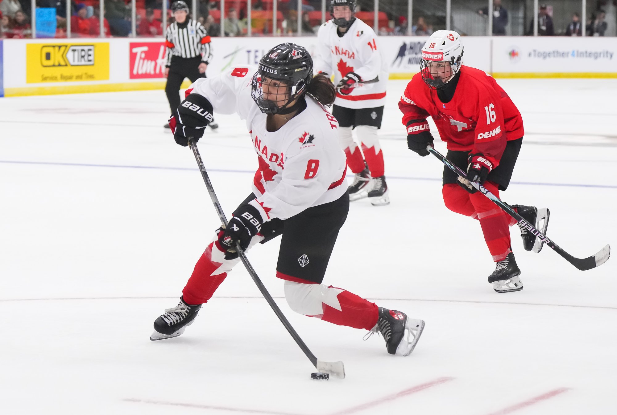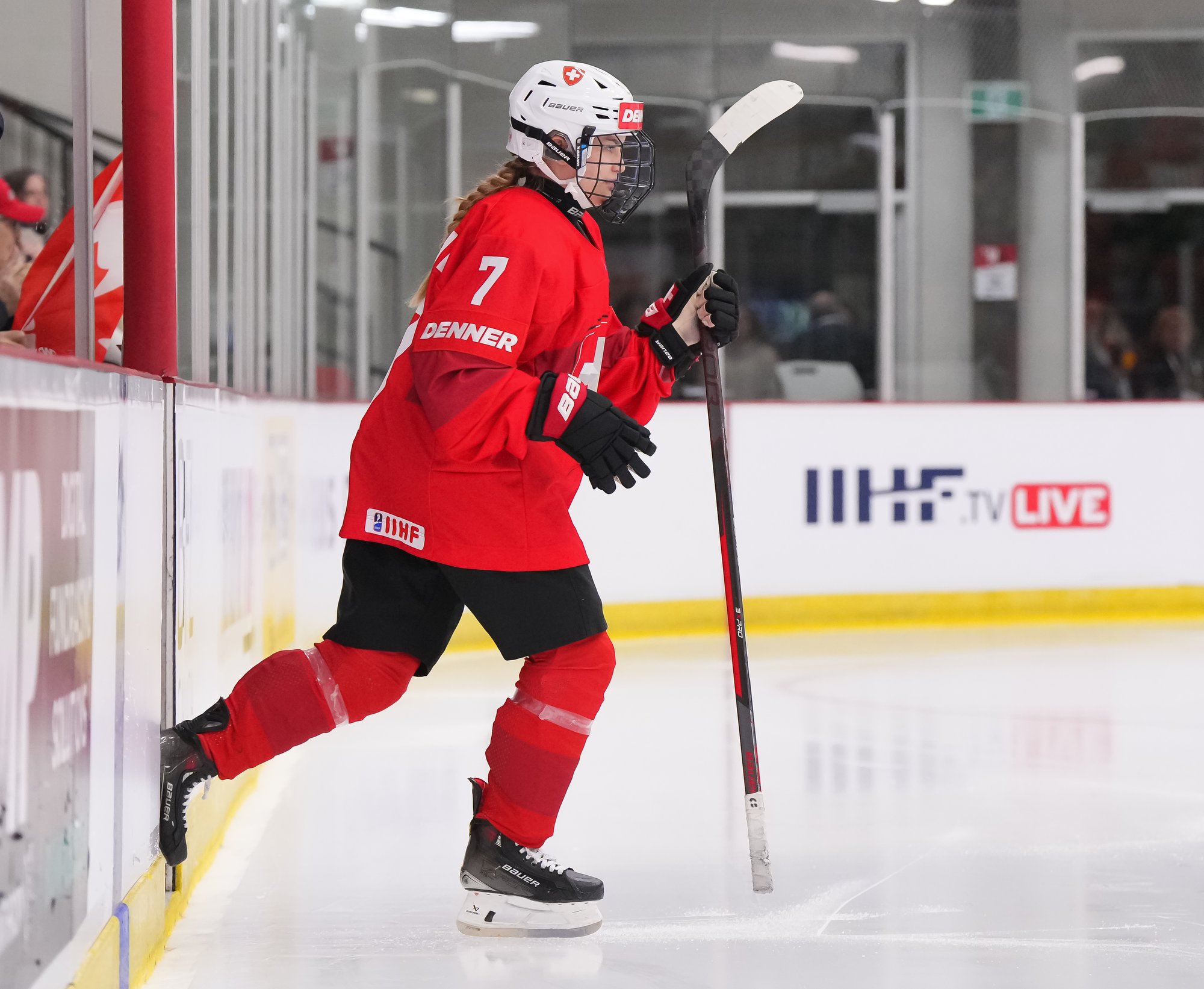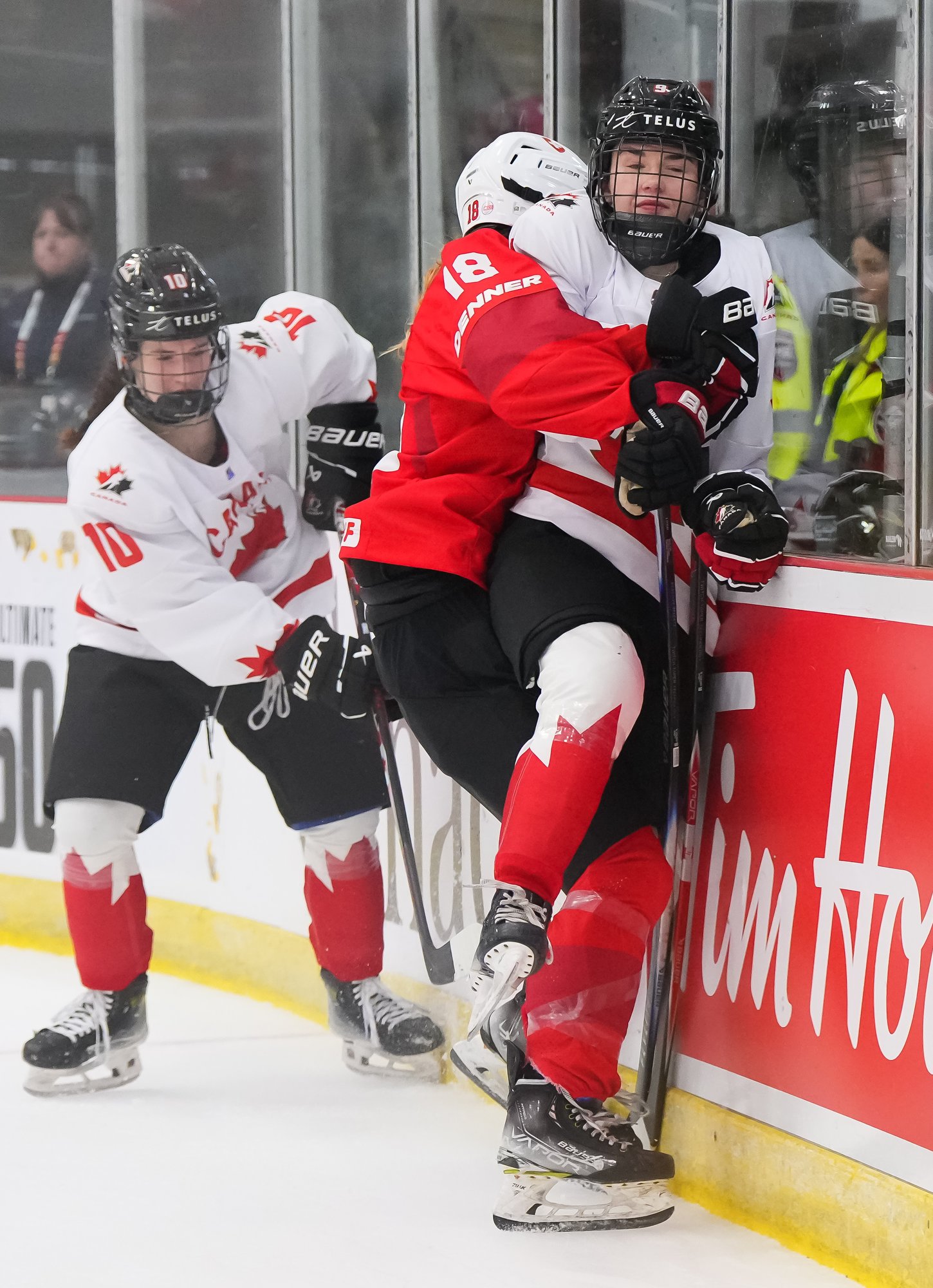 It was a sea of red and white on the ice and in the stands at the Sport and Wellness Centre in Membertou, Nova Scotia as Canada started its gold-medal defense at the 2026 U18 Women’s World Championship with a convincing 9-0 win over Switzerland to close out Day 1 of round-robin action.