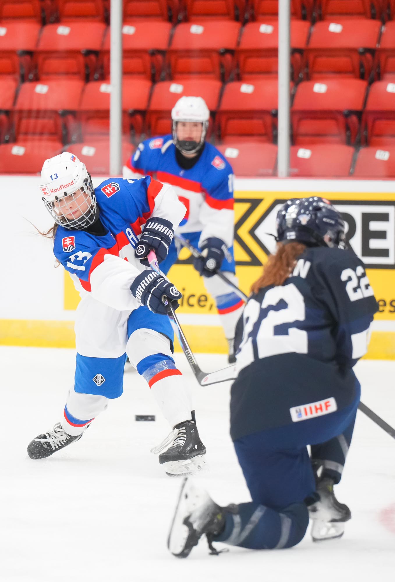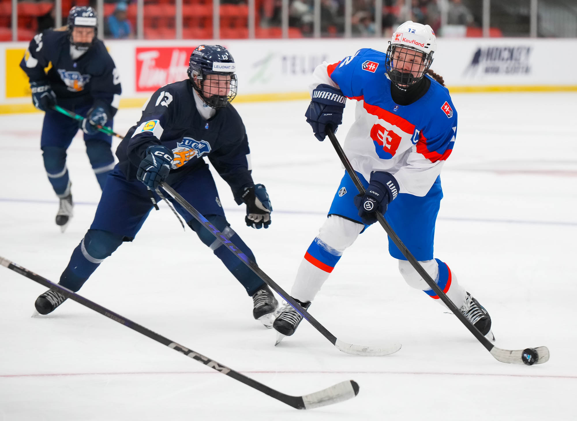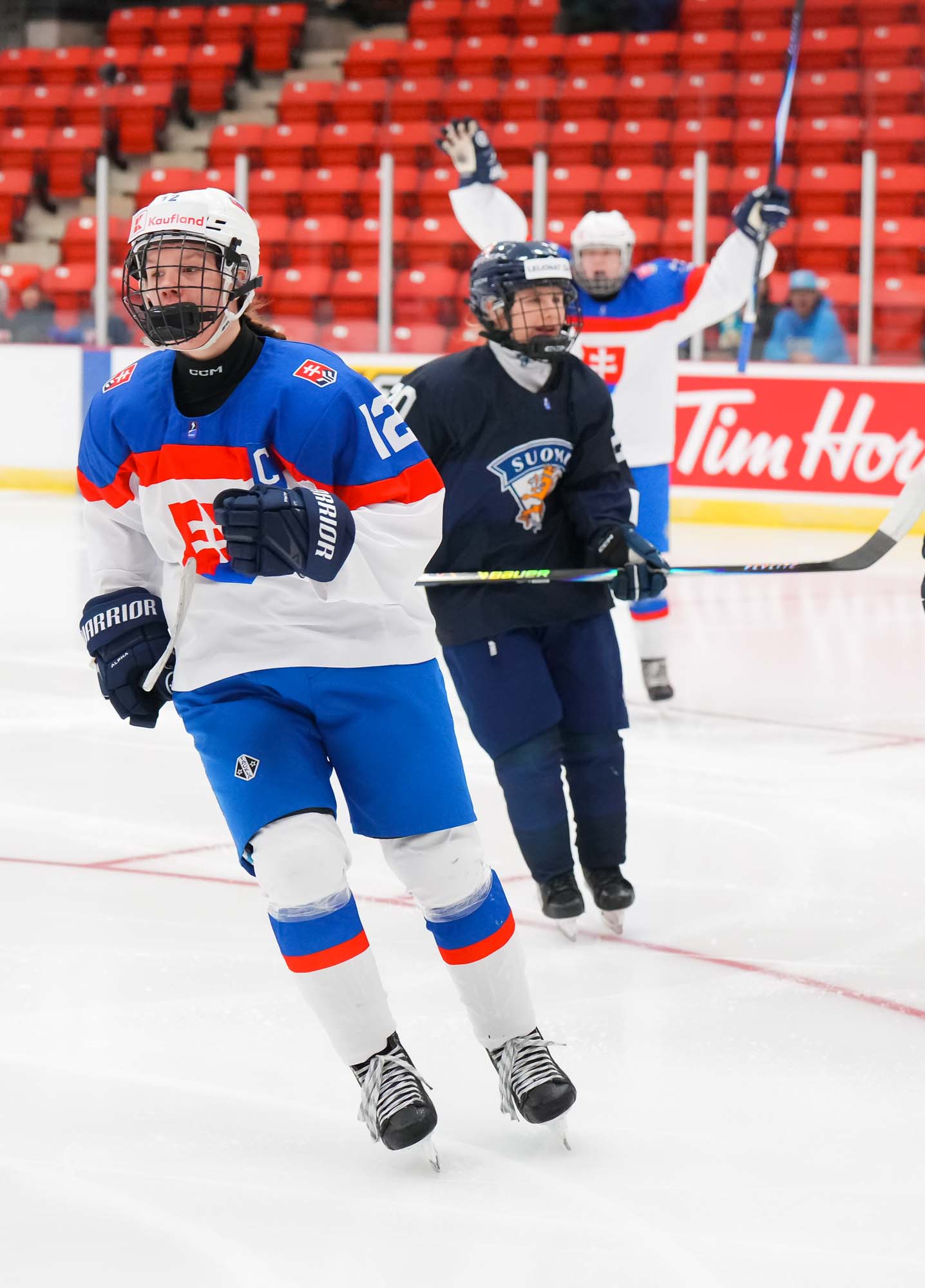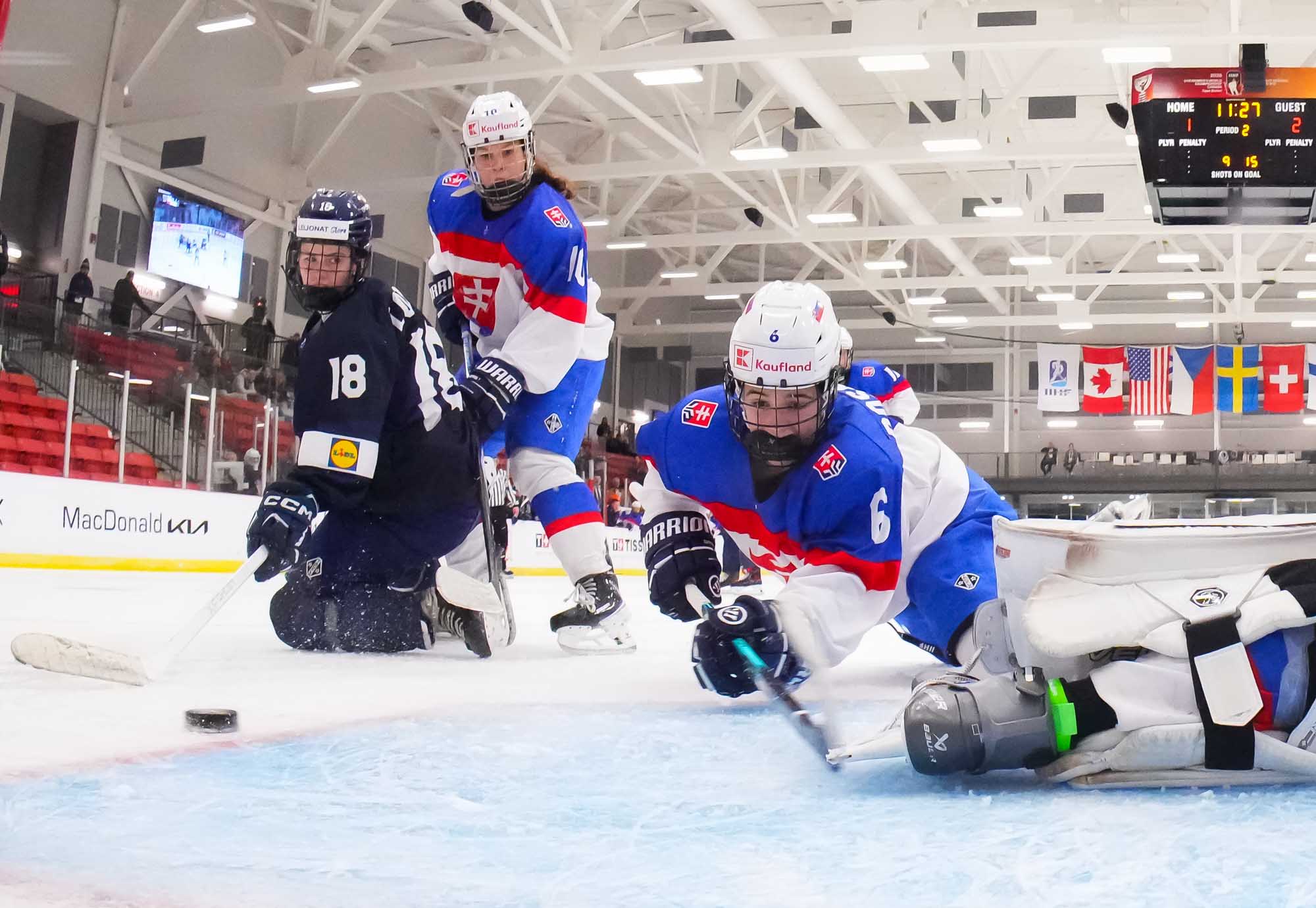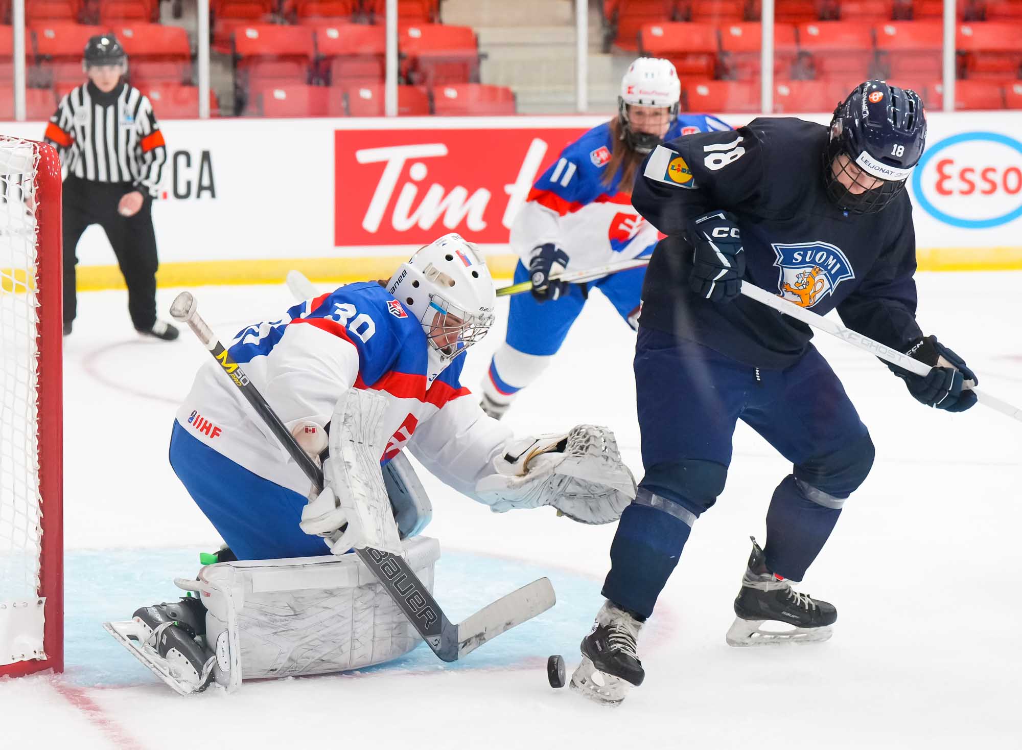 Returning to action barely 24 hours after facing 52 shots in two periods against the Americans on Saturday, Slovak goaltender Mariana Sumegova was steady in earning the win, making 20 saves. Eerika Kujala stopped 24 shots.