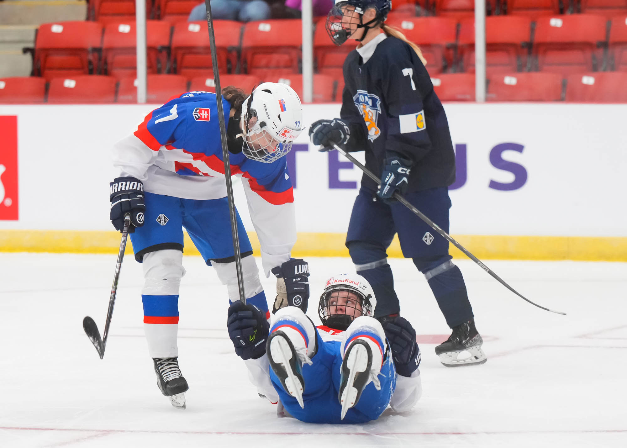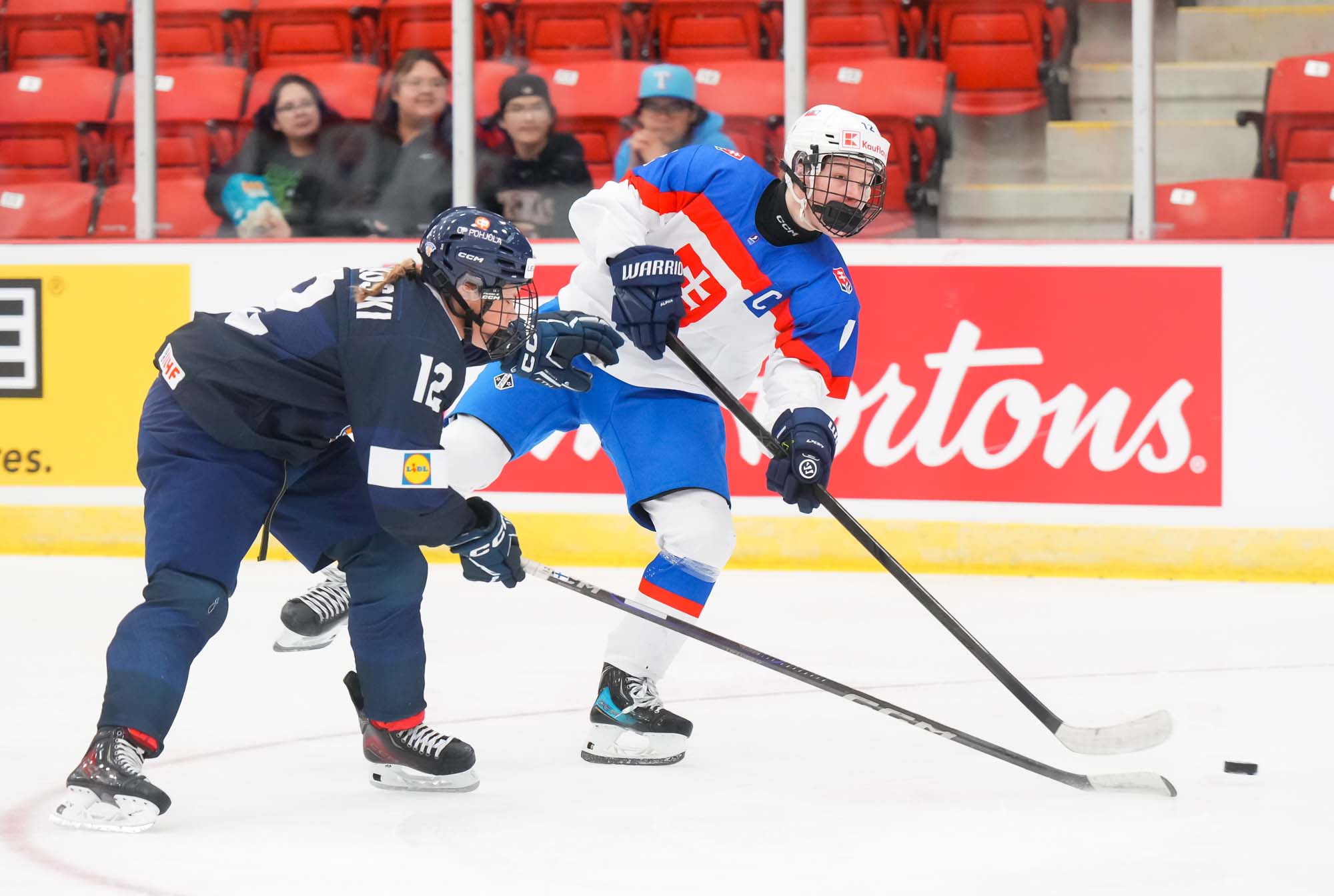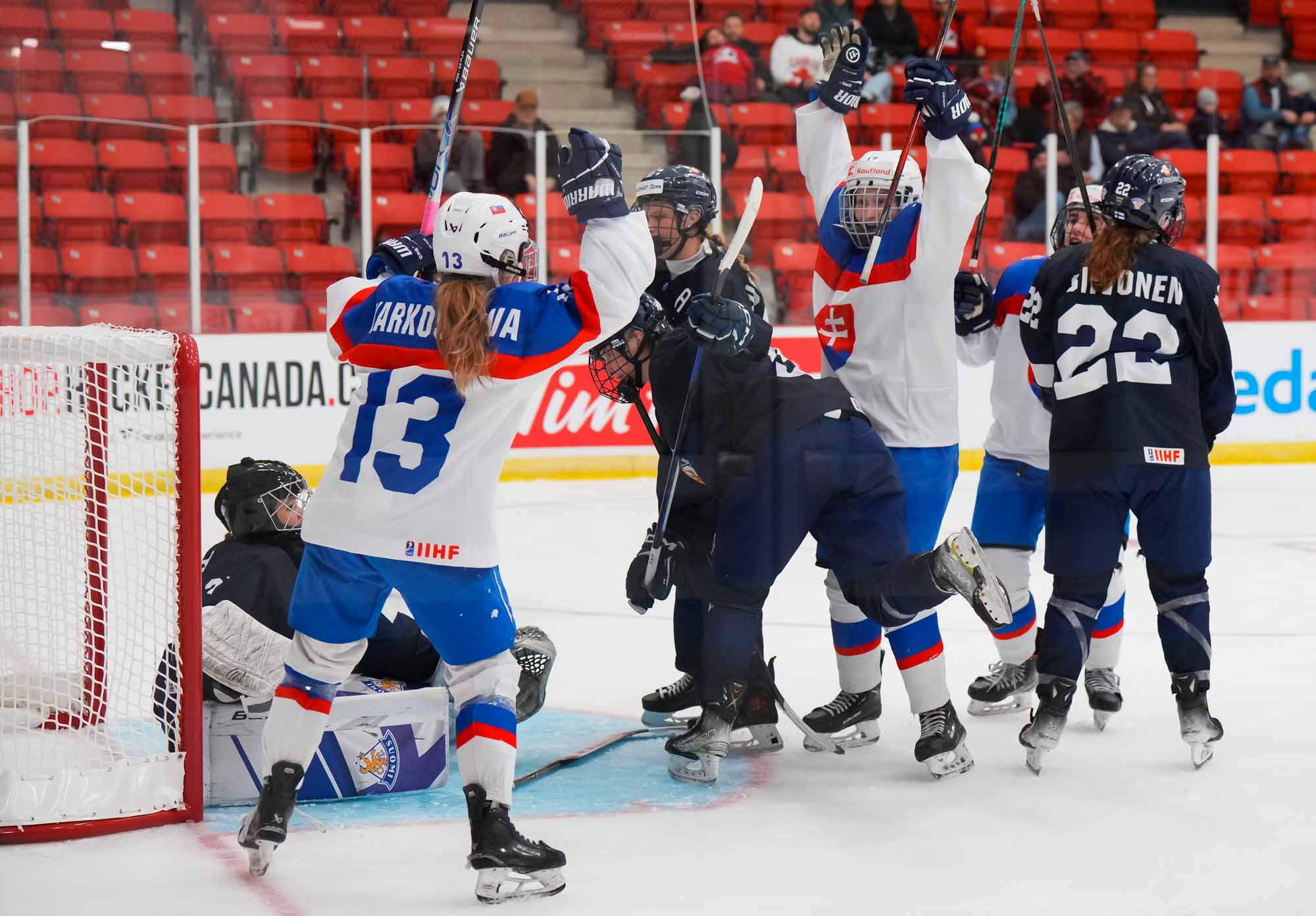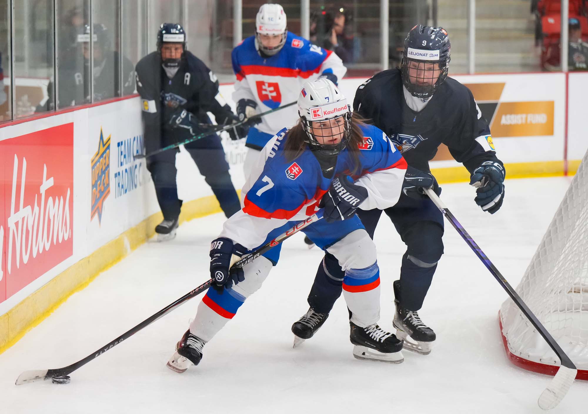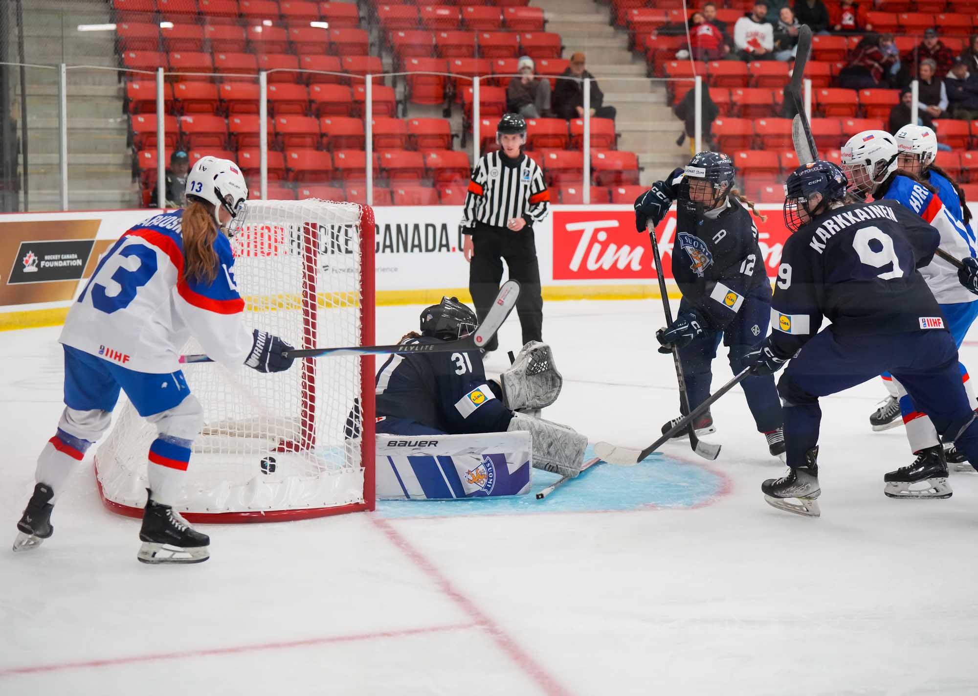Returning to action barely 24 hours after facing 52 shots in two periods against the Americans on Saturday, Slovak goaltender Mariana Sumegova was steady in earning the win, making 20 saves. Eerika Kujala stopped 24 shots.