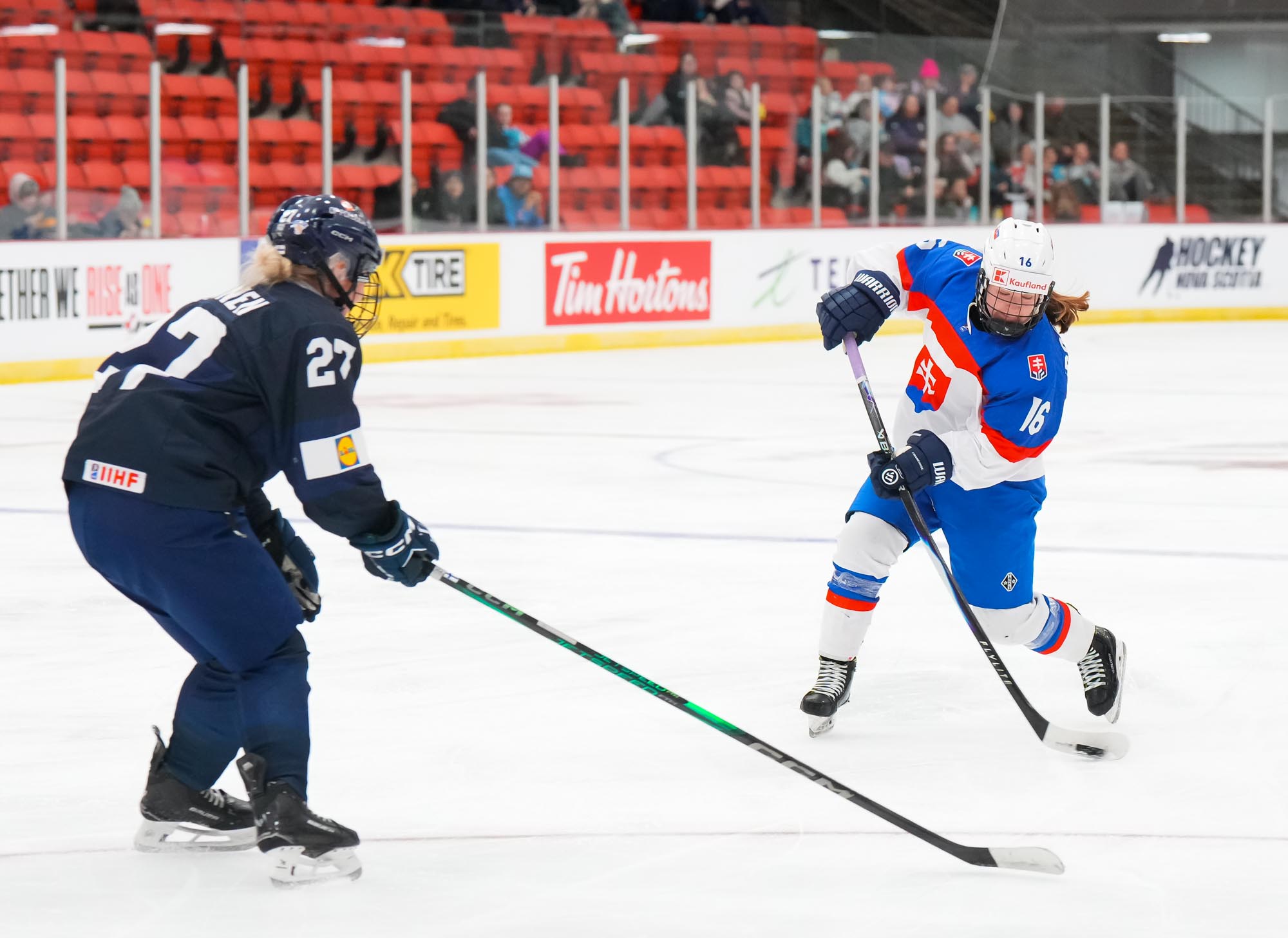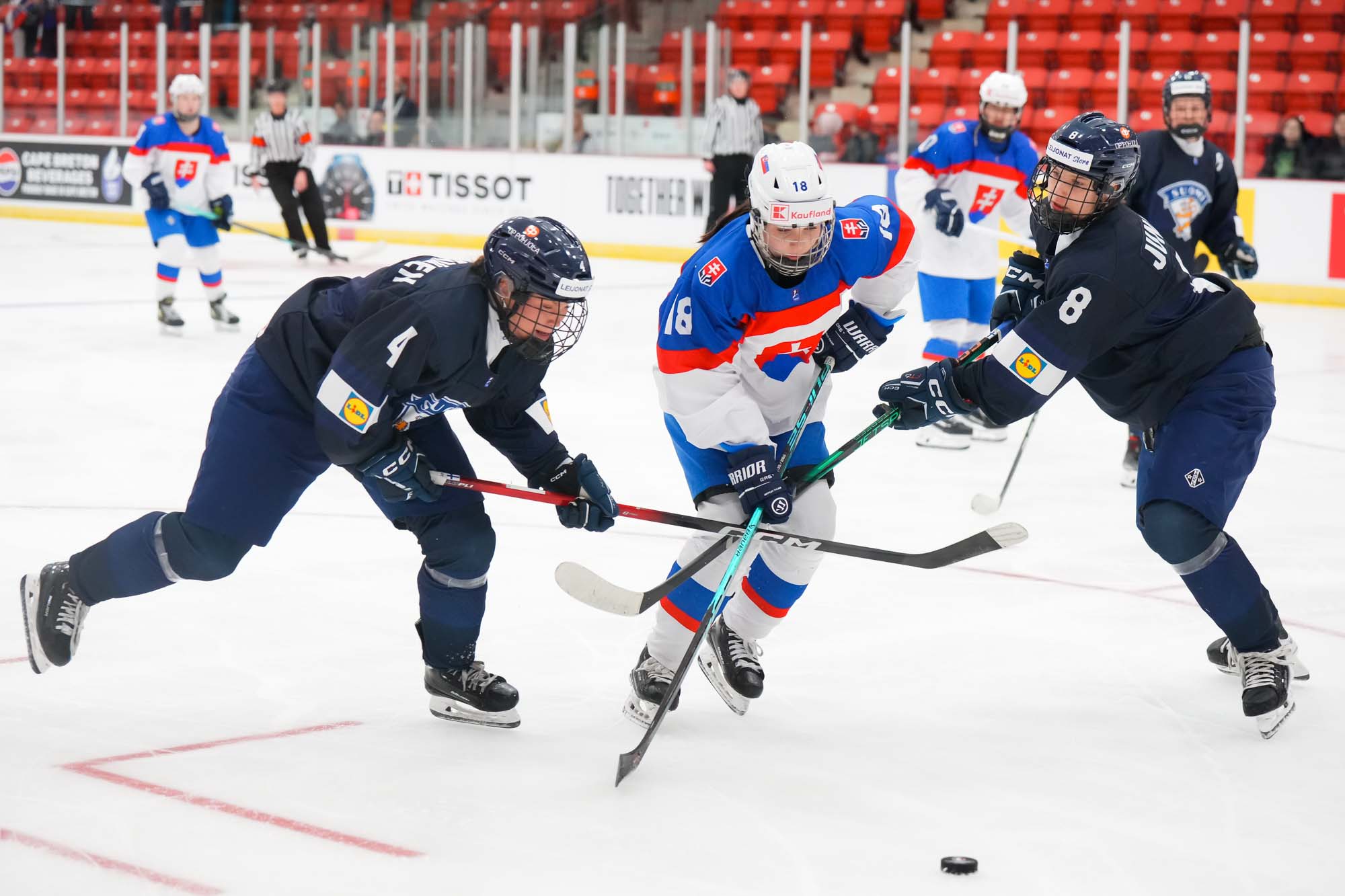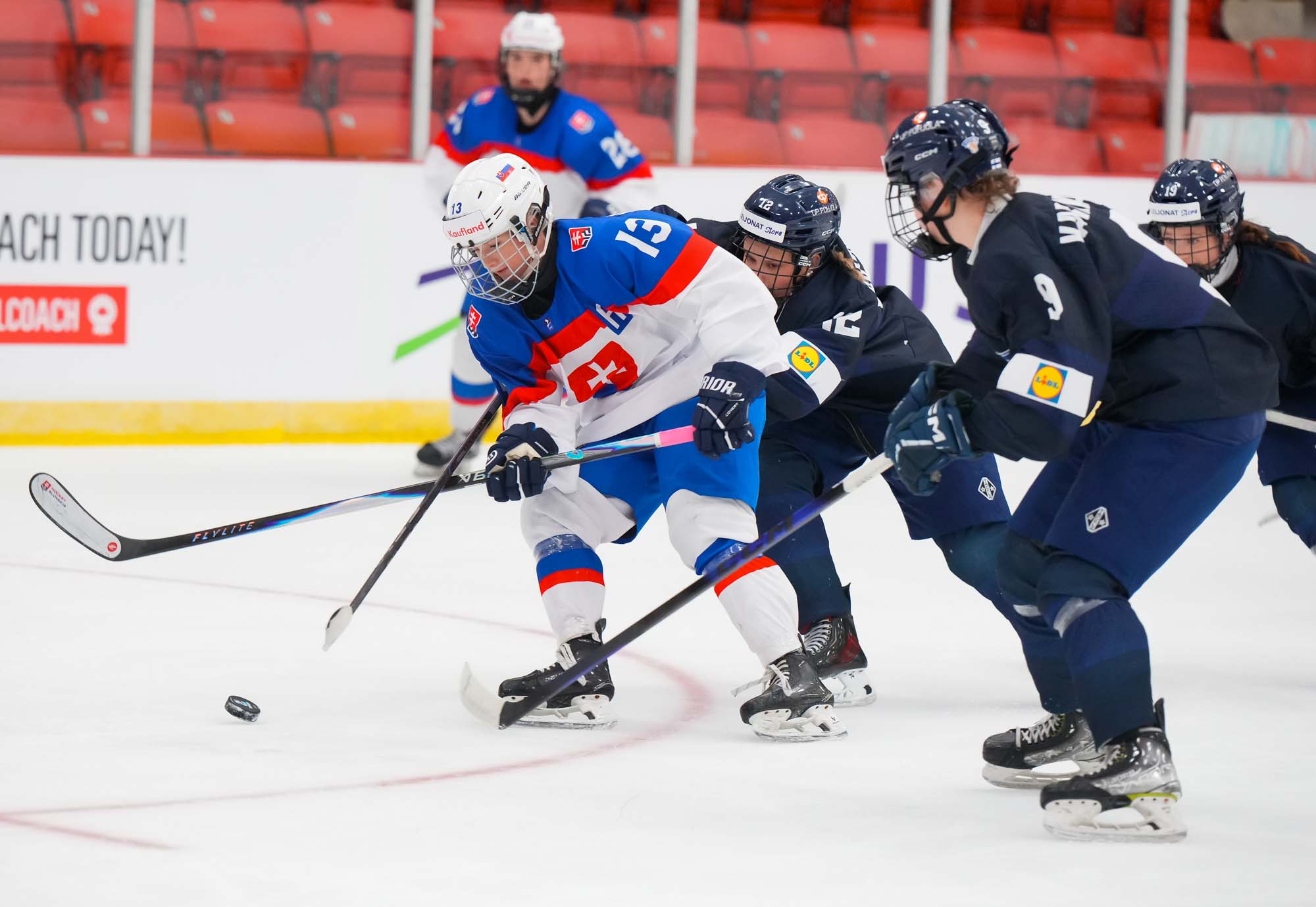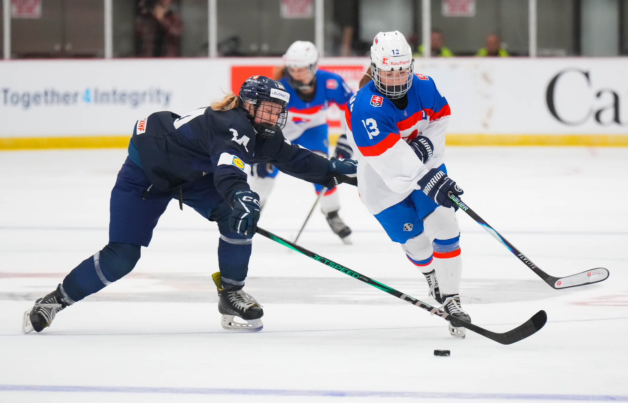 Returning to action barely 24 hours after facing 52 shots in two periods against the Americans on Saturday, Slovak goaltender Mariana Sumegova was steady in earning the win, making 20 saves. Eerika Kujala stopped 24 shots.