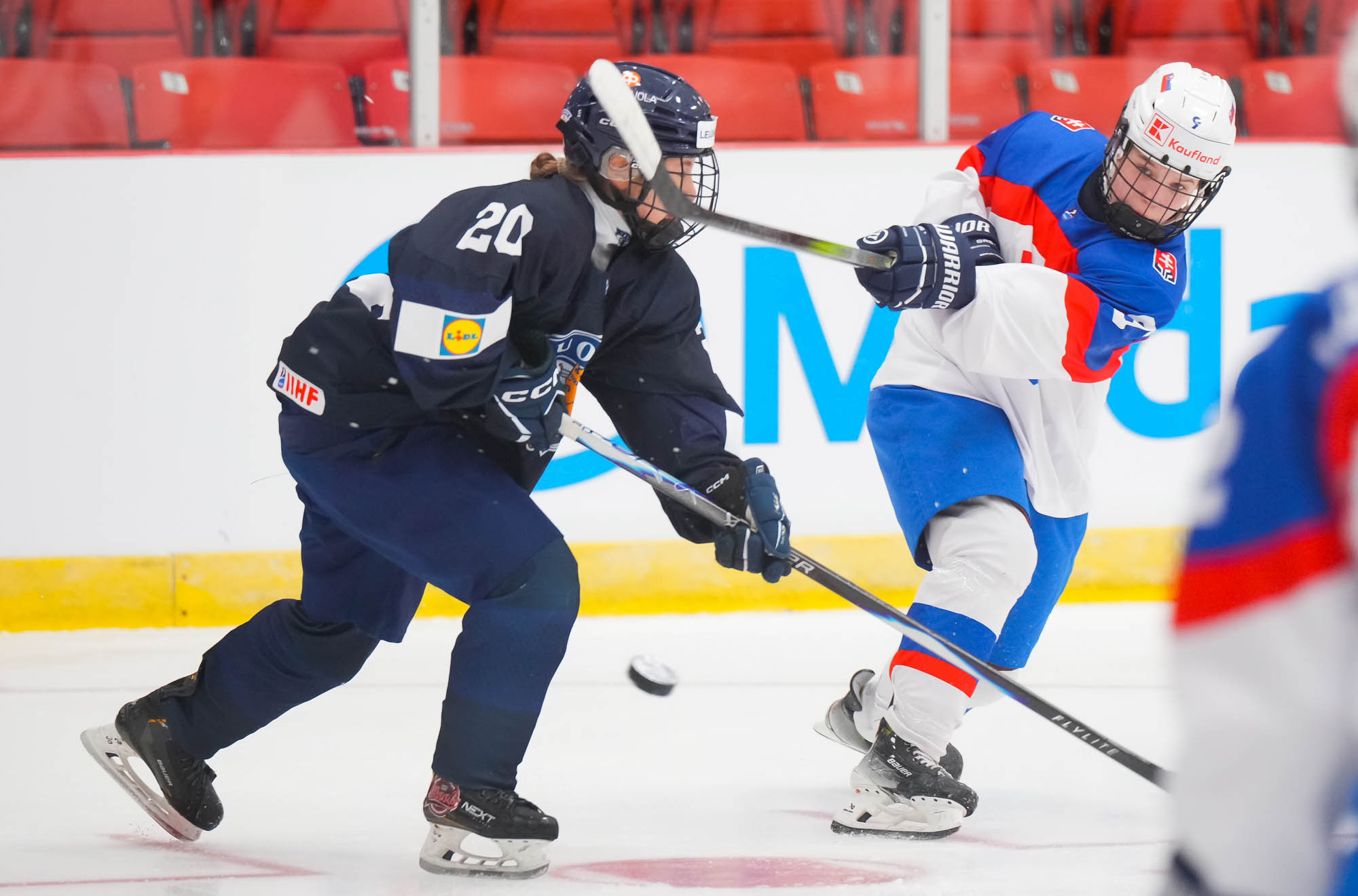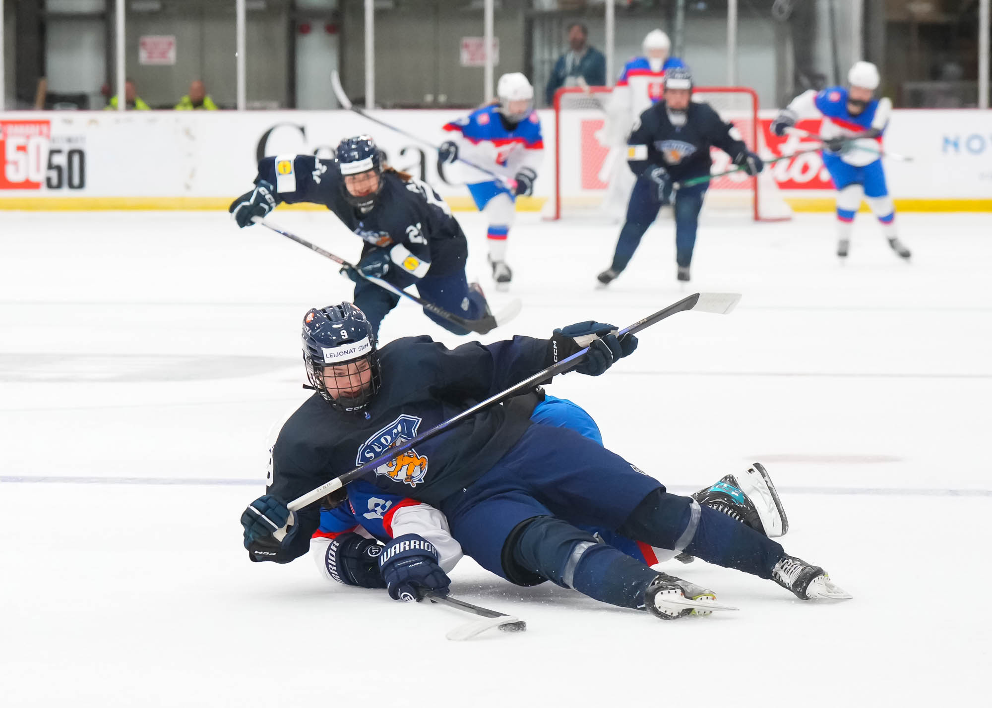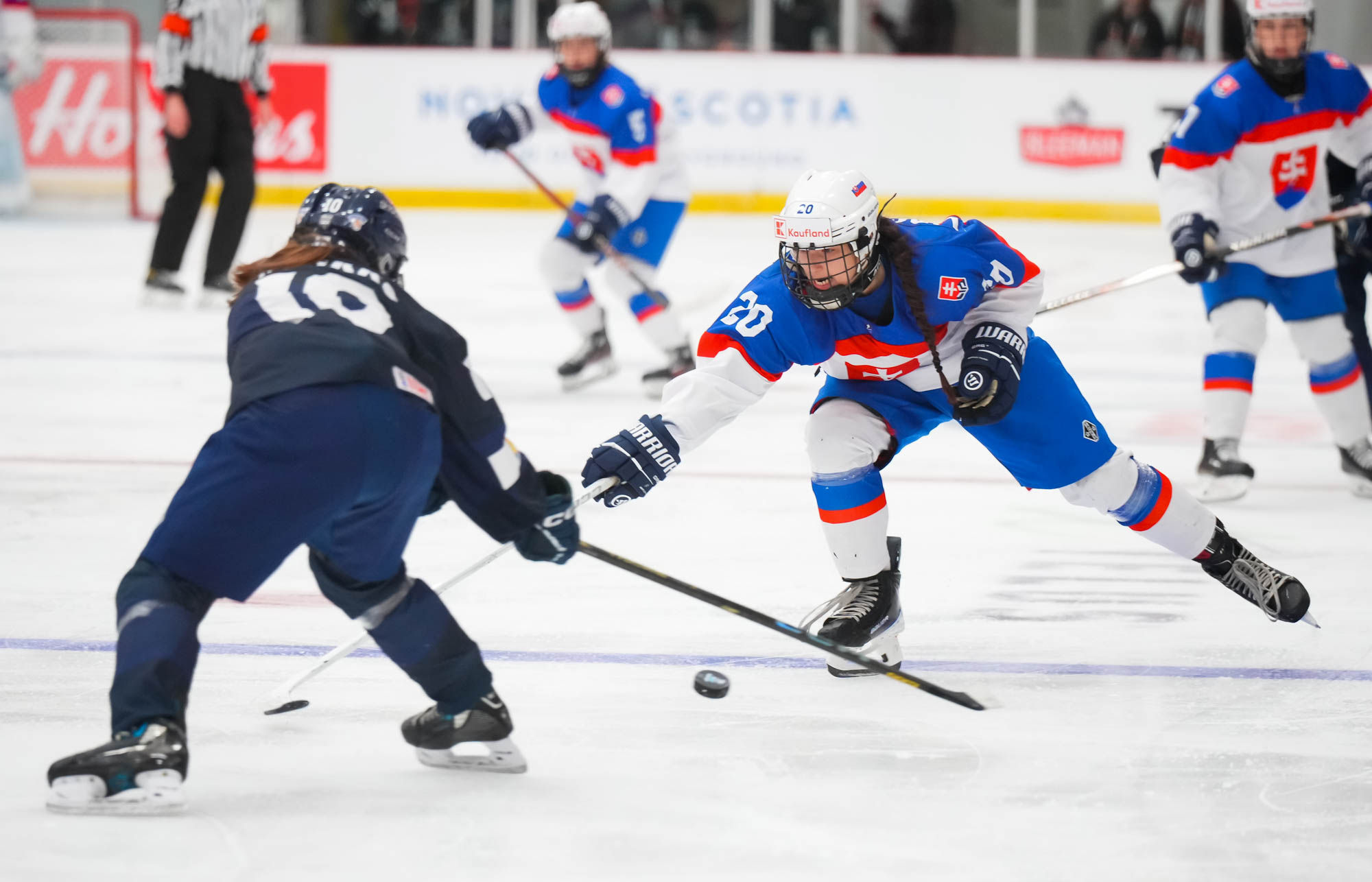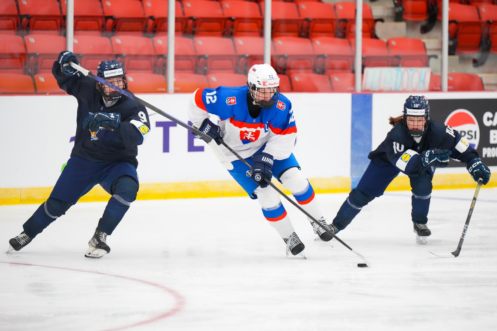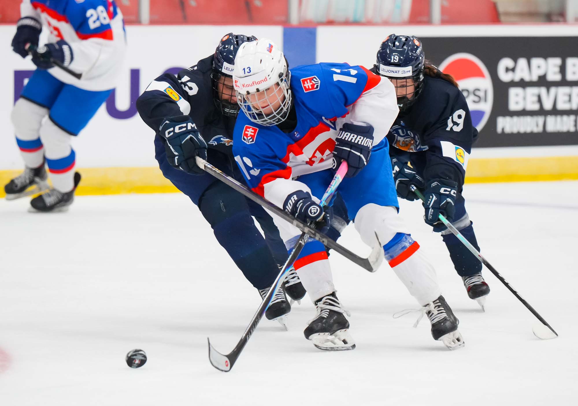 Returning to action barely 24 hours after facing 52 shots in two periods against the Americans on Saturday, Slovak goaltender Mariana Sumegova was steady in earning the win, making 20 saves. Eerika Kujala stopped 24 shots.