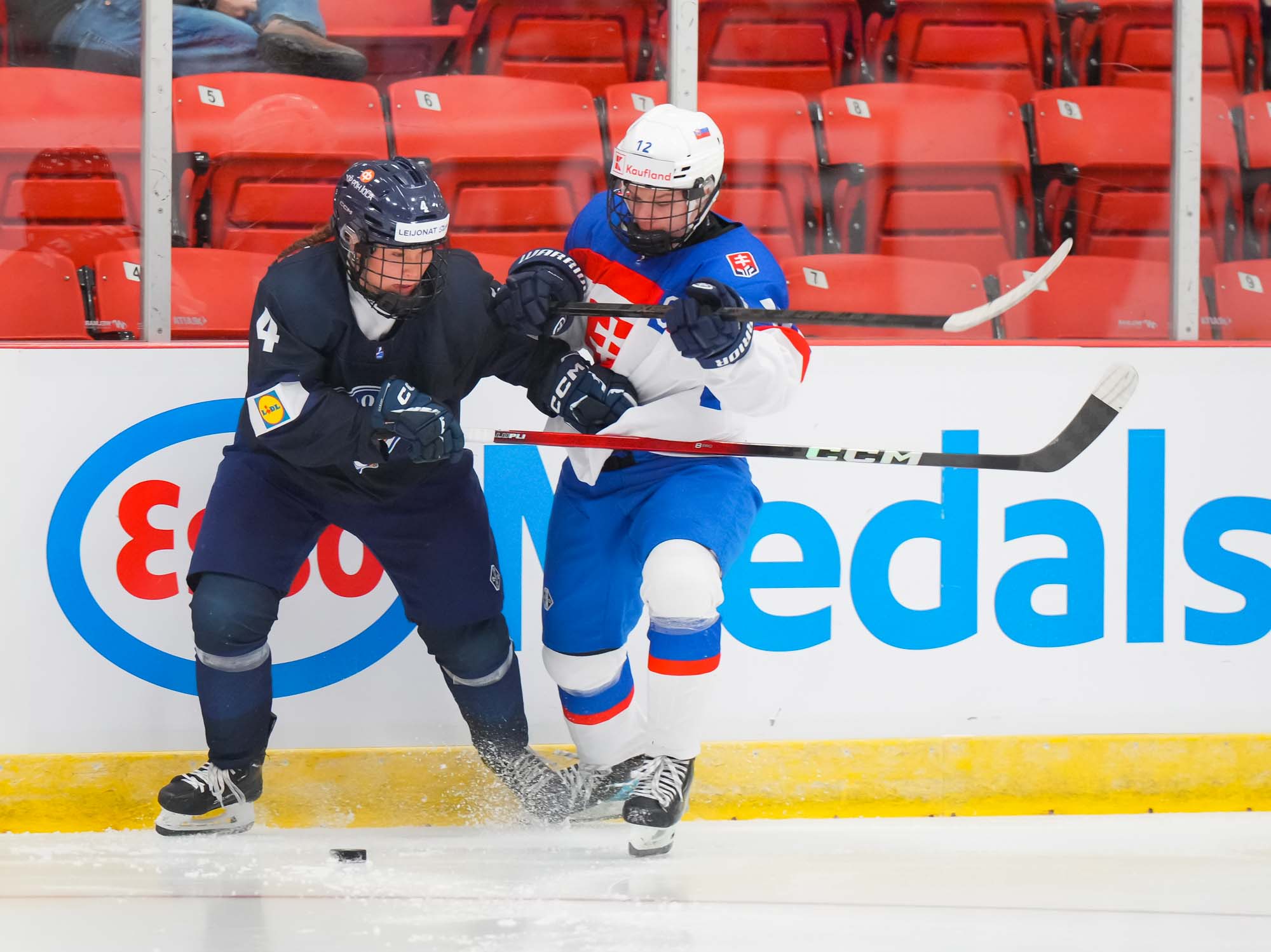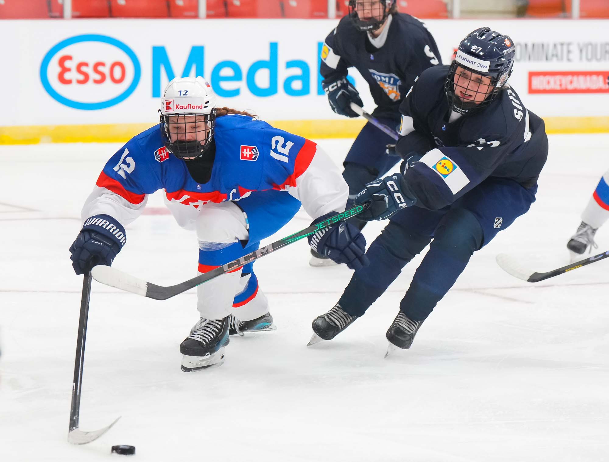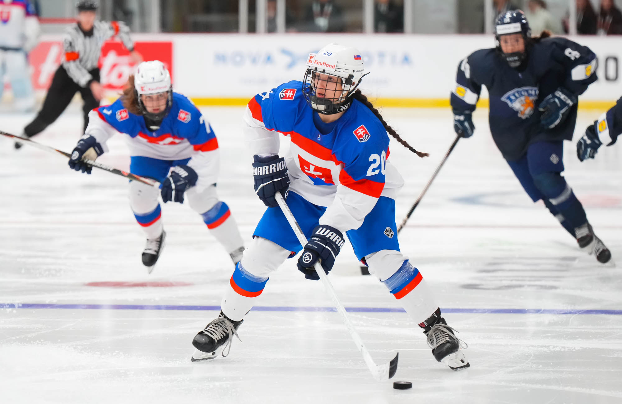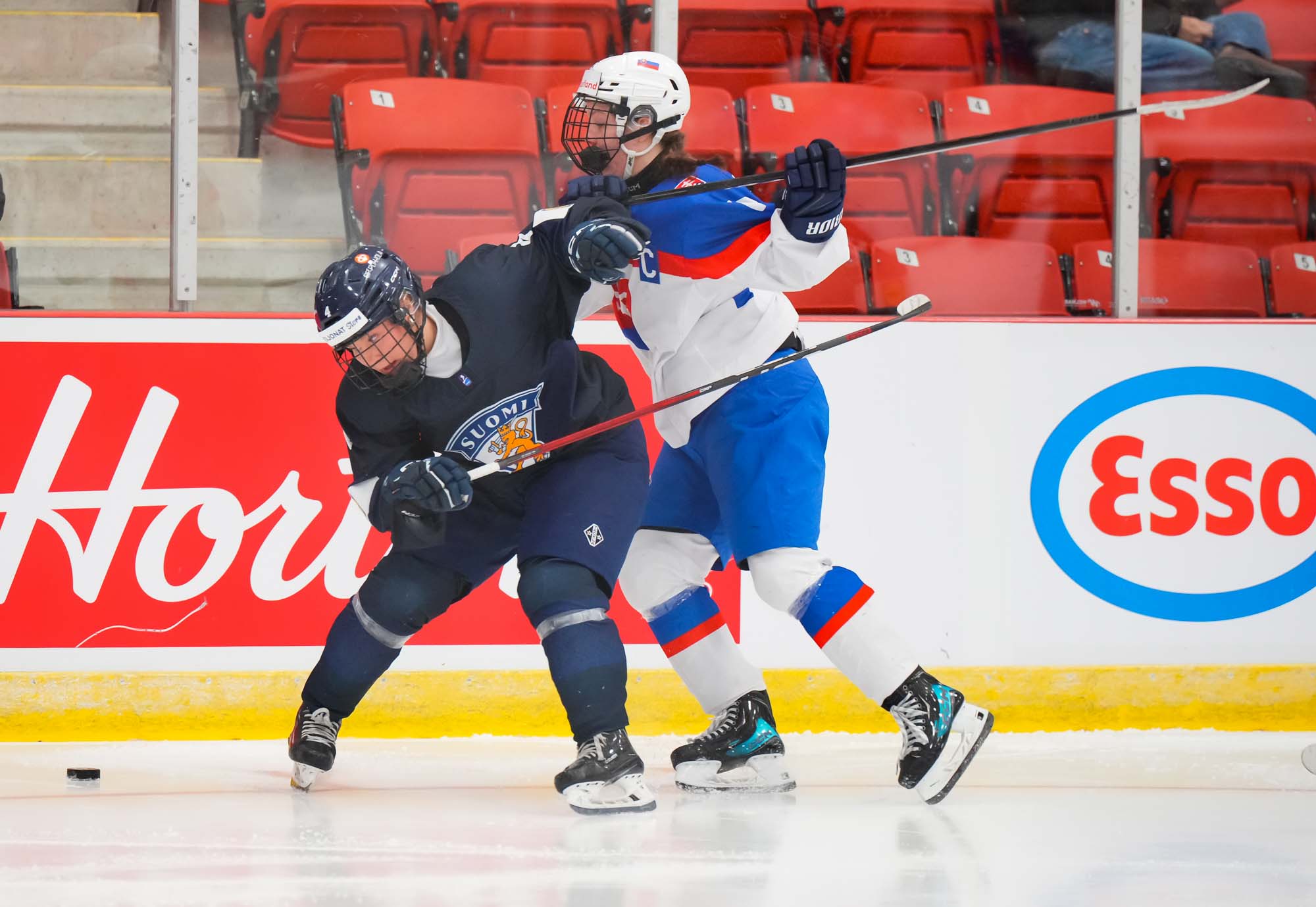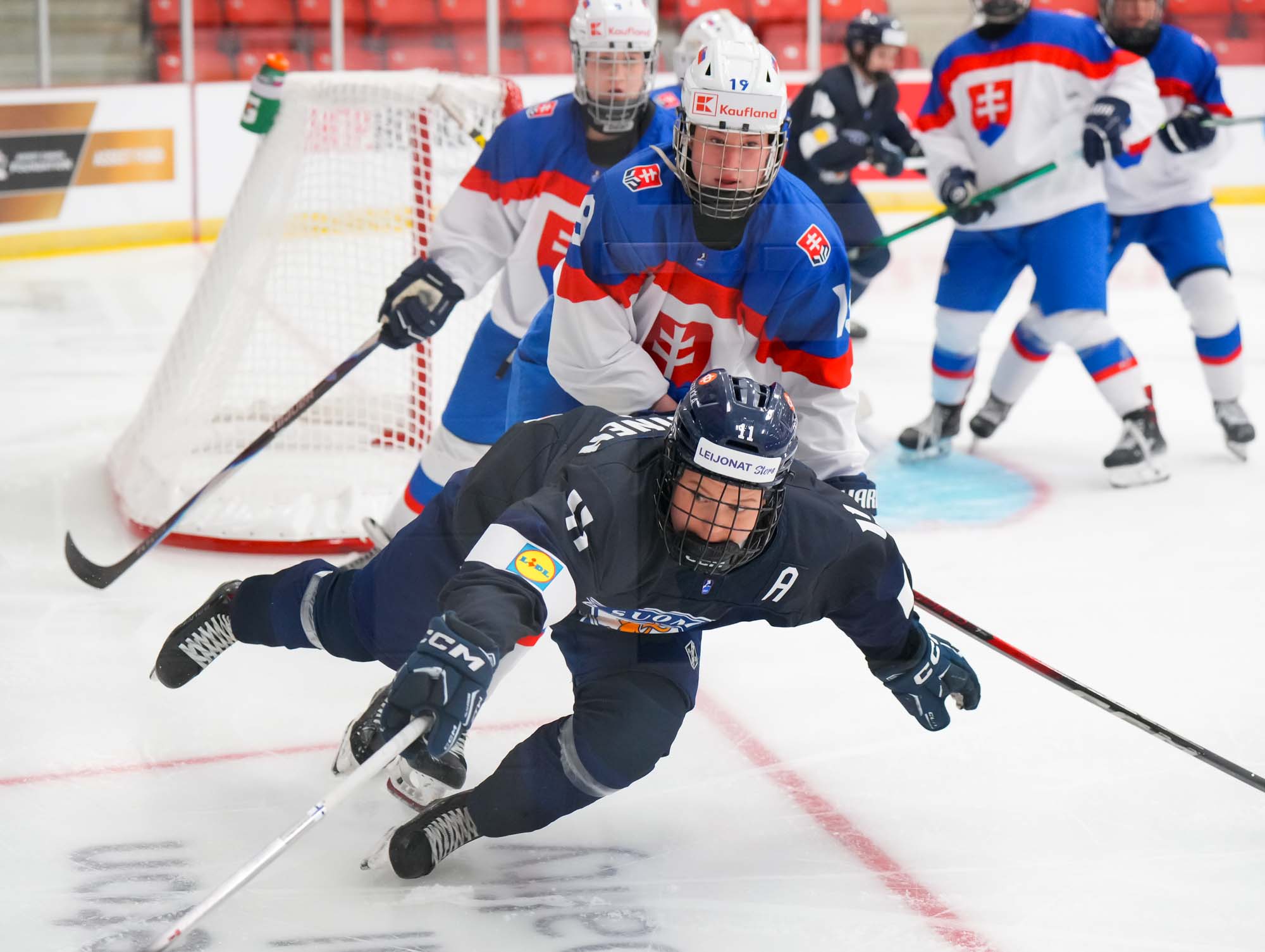 Returning to action barely 24 hours after facing 52 shots in two periods against the Americans on Saturday, Slovak goaltender Mariana Sumegova was steady in earning the win, making 20 saves. Eerika Kujala stopped 24 shots.