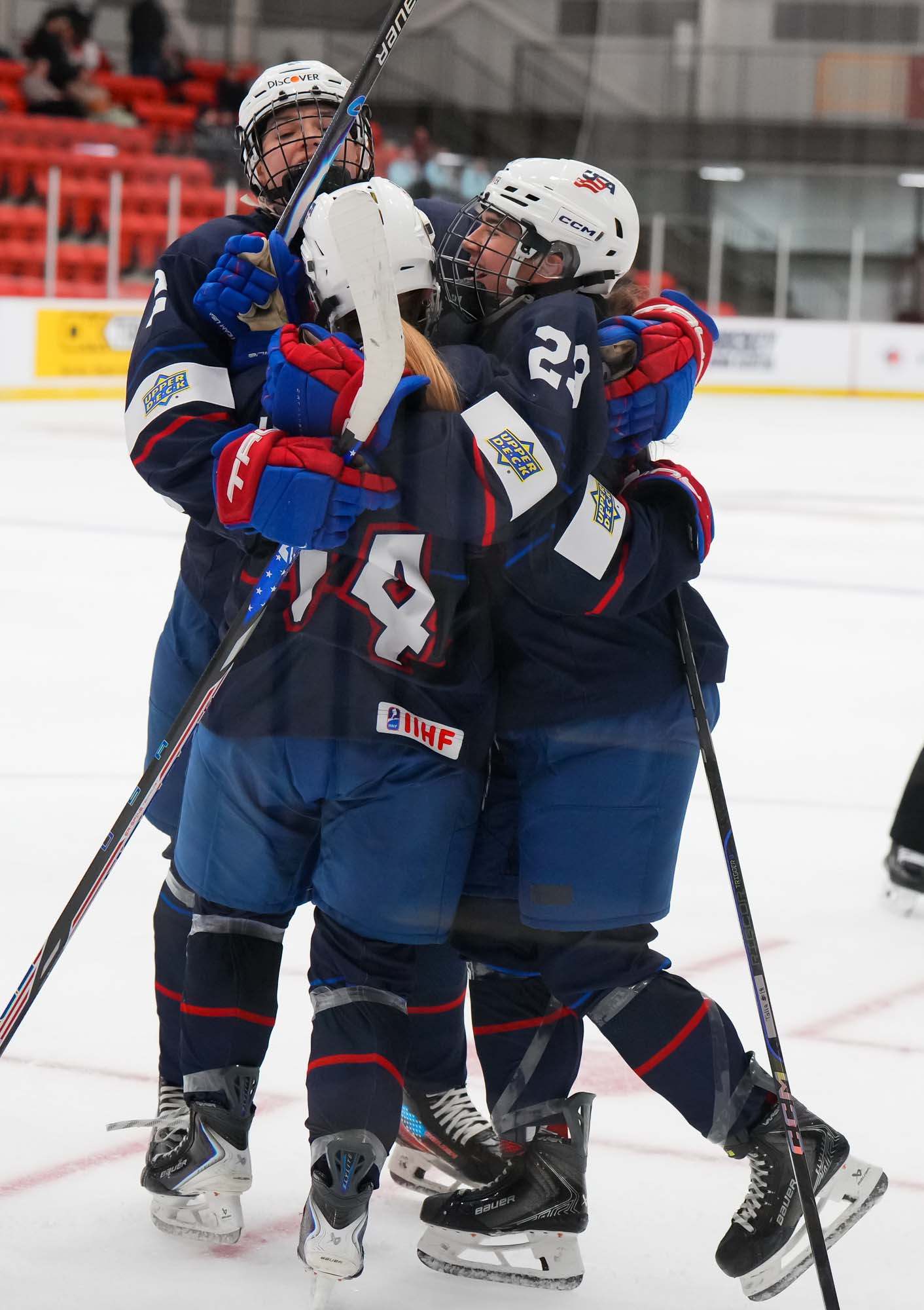 Jane Daley netted a hat trick for the Americans, becoming the first player in WW18 history to record three consecutive, three-goal games. Some 15 players had at least one point, and five players had four. Morgan Stickney stopped just seven shots for her second shutout of the tournament.