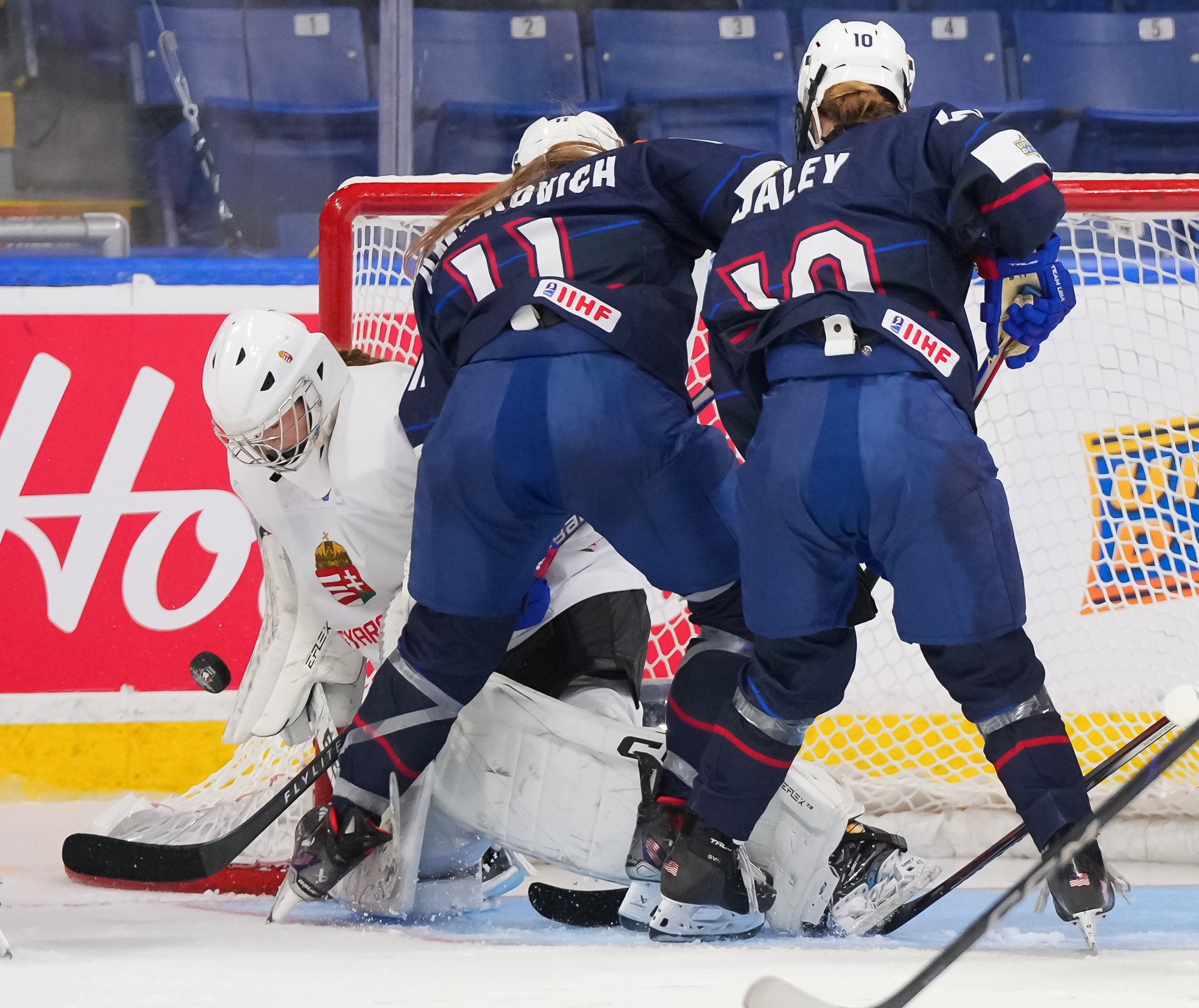 Hungary’s goaltender Csenge Csordas gamely tried to keep the powerful Americans at bay. After the U.S. team fired 42 shots on goal through the first two periods, and nine of them counted for goals, Csordas thwarted multiple Grade A chances among 14 shots, for a clean sheet in the third and 56 shots in total.