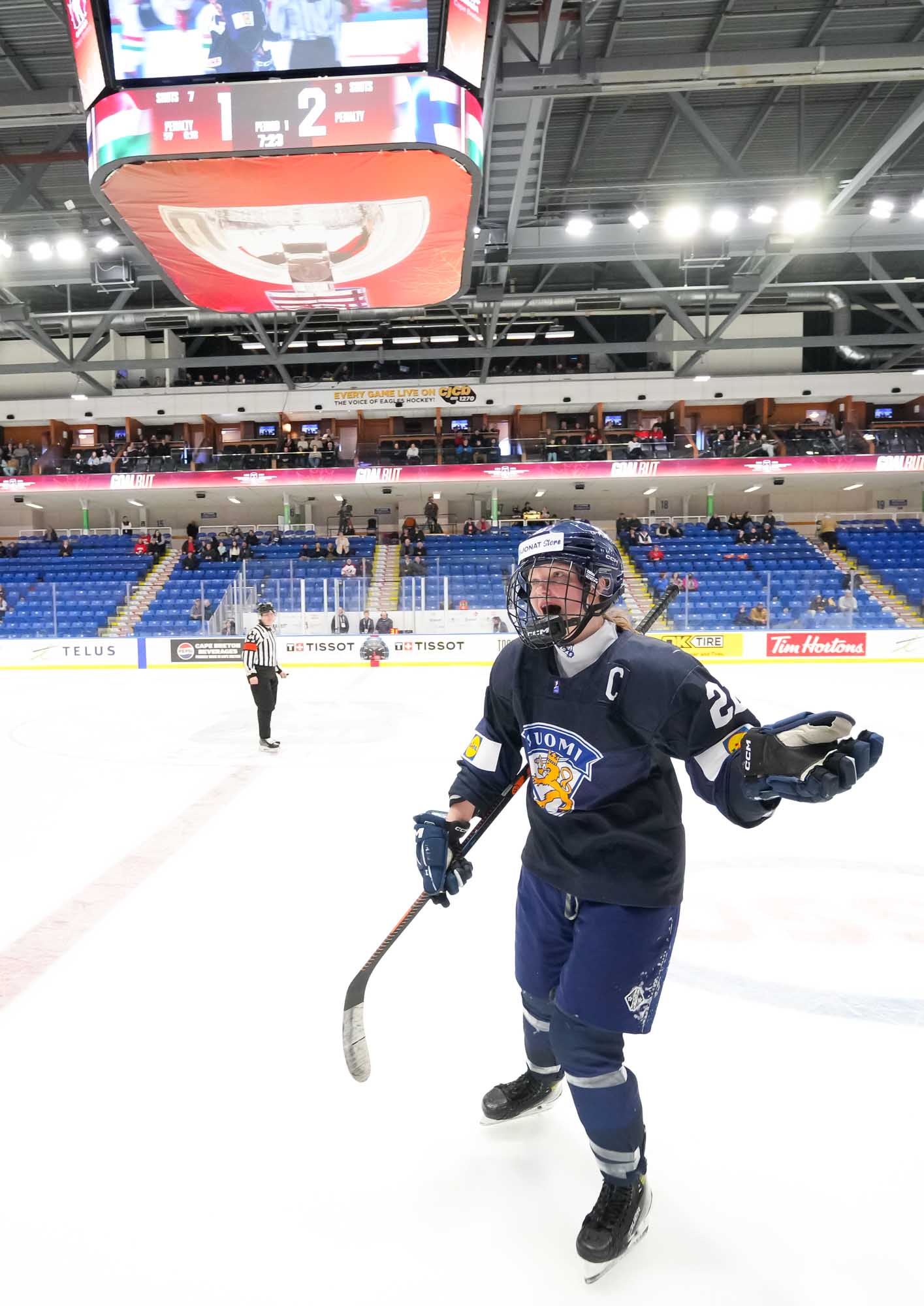 With 3:57 left to play and her team trailing by two, Finnish coach Mira Kuisma called time out while bringing Kujala to the bench for the extra attacker. After heavy pressure with Finland buzzing in the offensive zone, Siivonen got her team within one with 2:05 left to play, before Polonyi notched her hat trick into the empty net with 1:13 remaining.