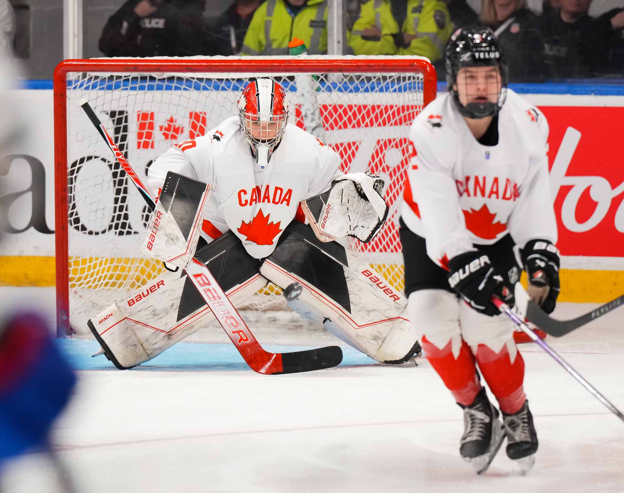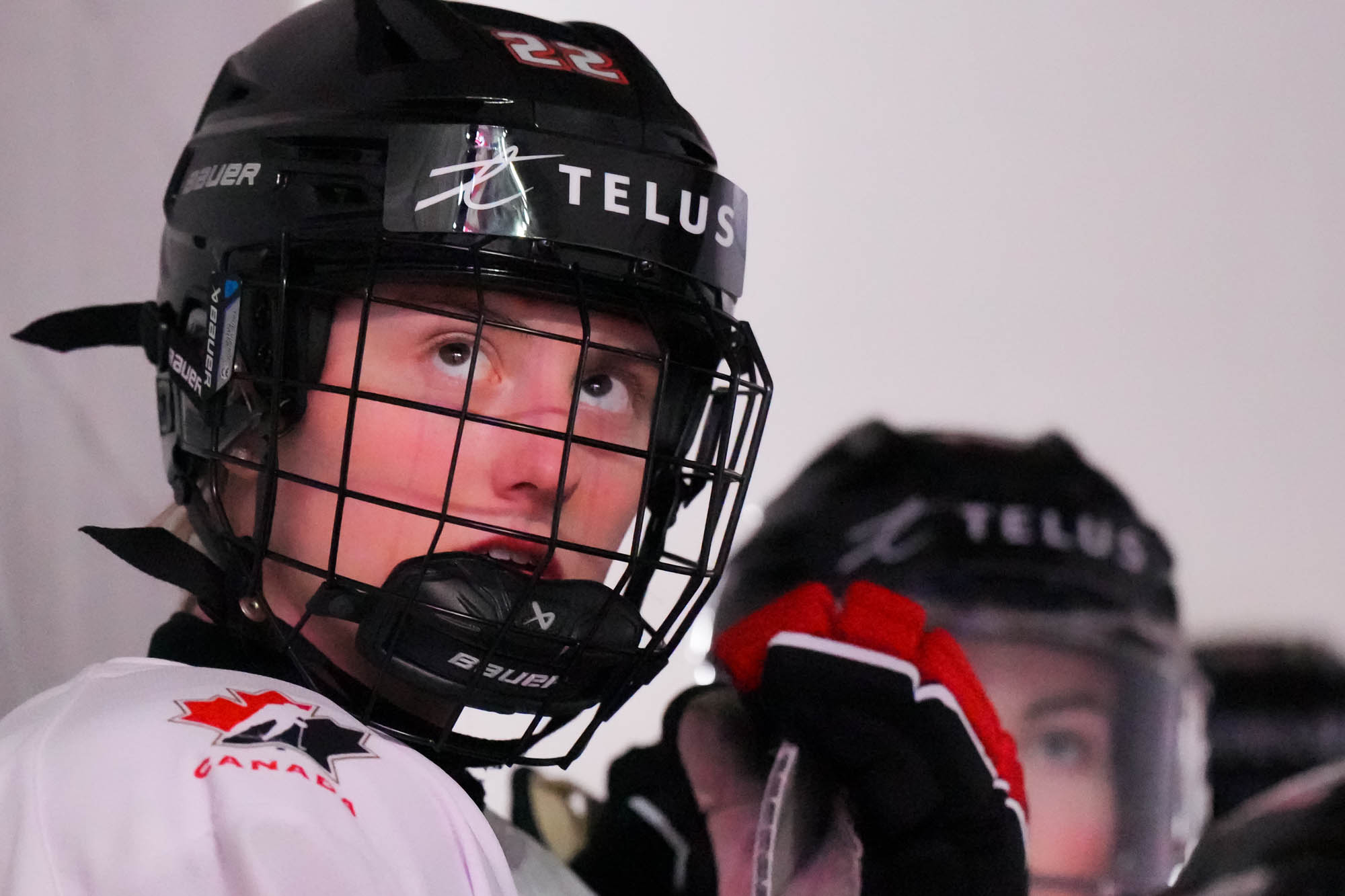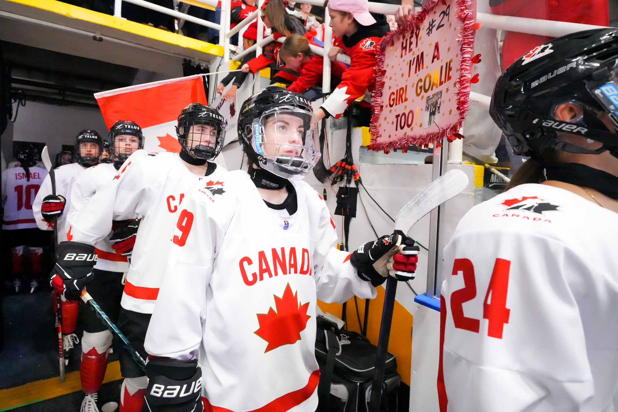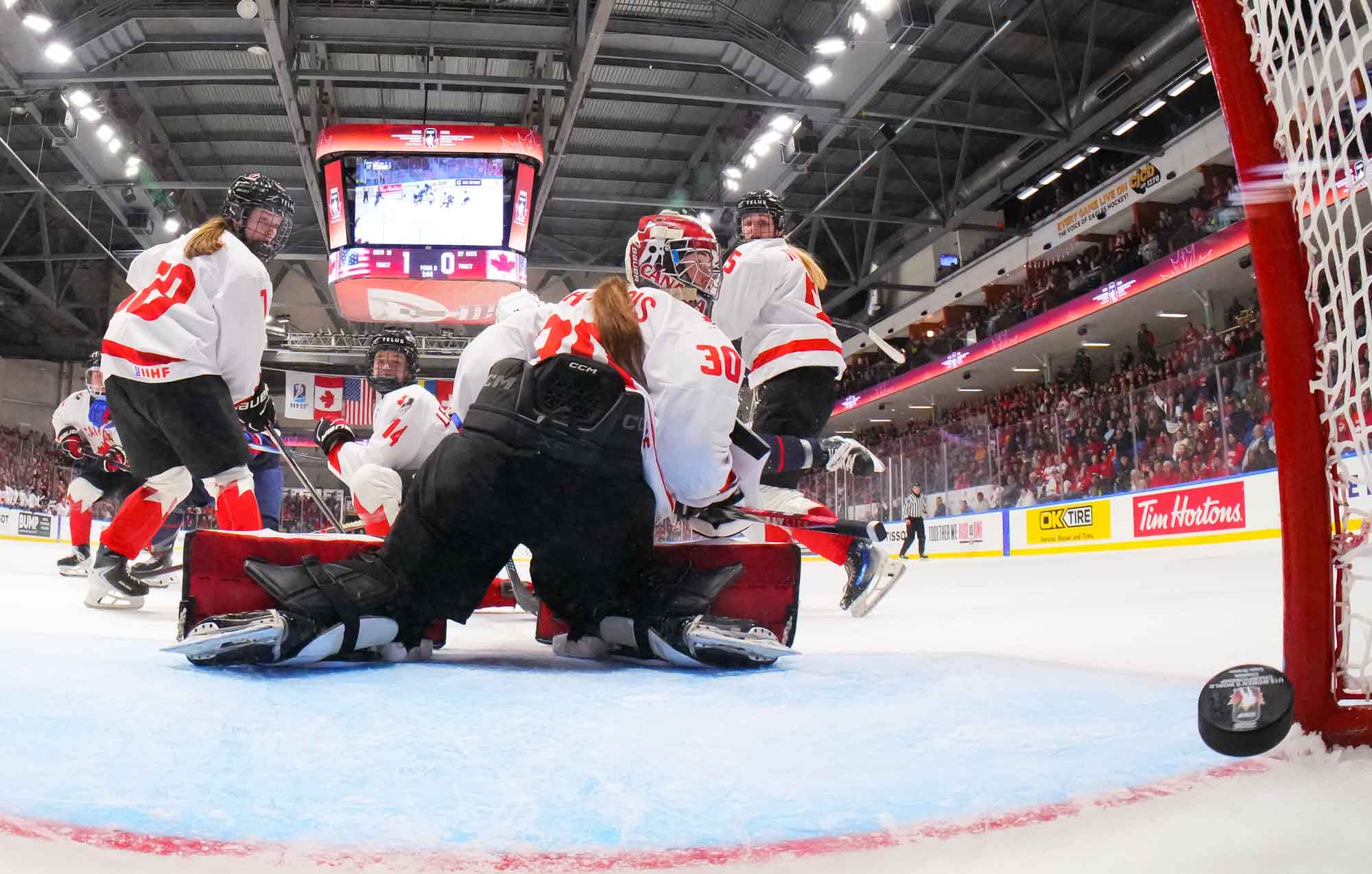 At the other end, Kylie Amelkovich tried a wraparound that went through the crease, and soon after the Canadians had the first power play when Maggie Averill inadvertently put the puck over the glass in her end.