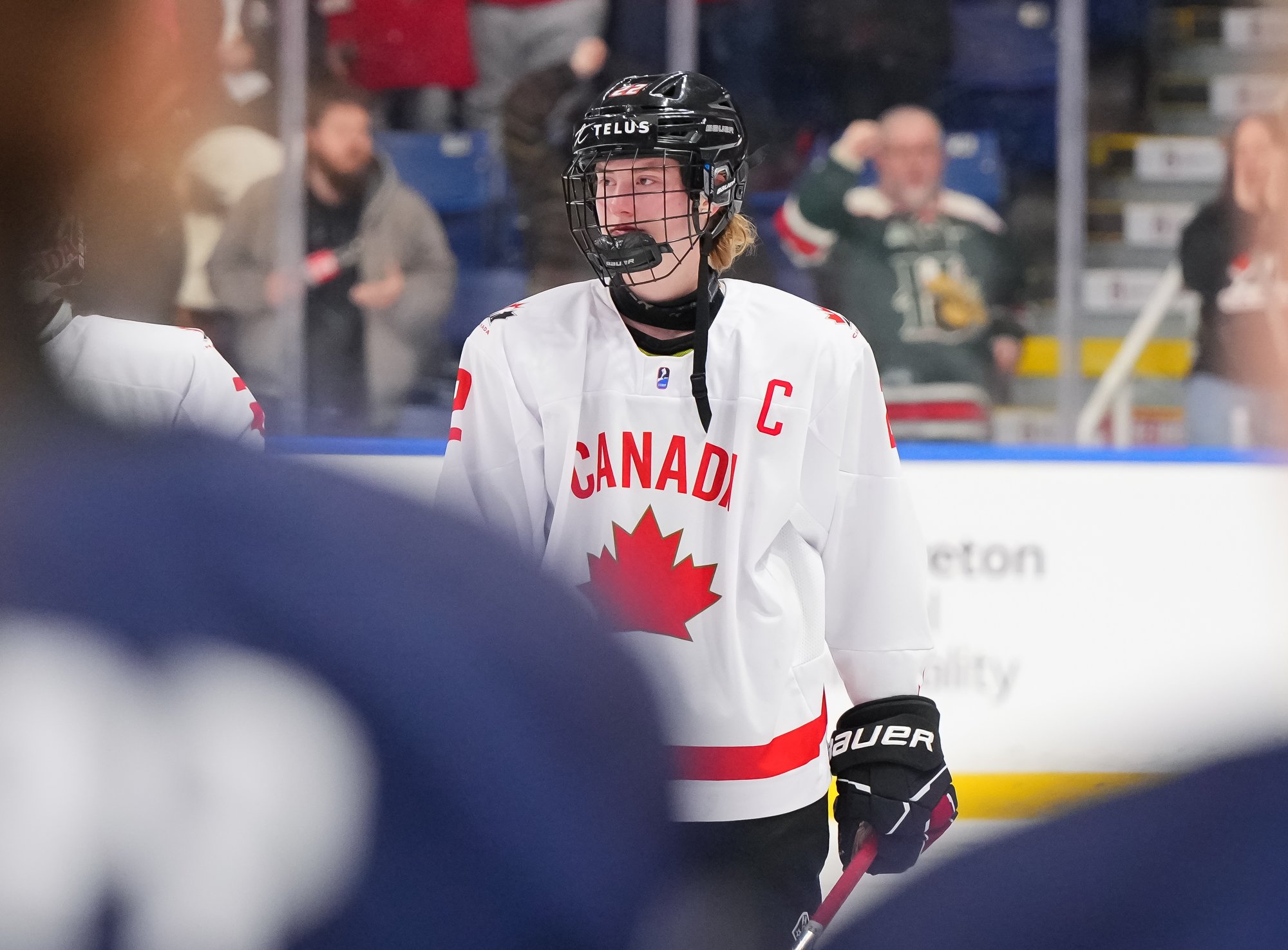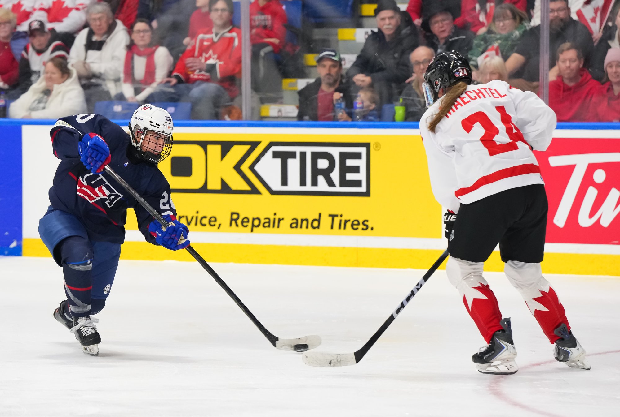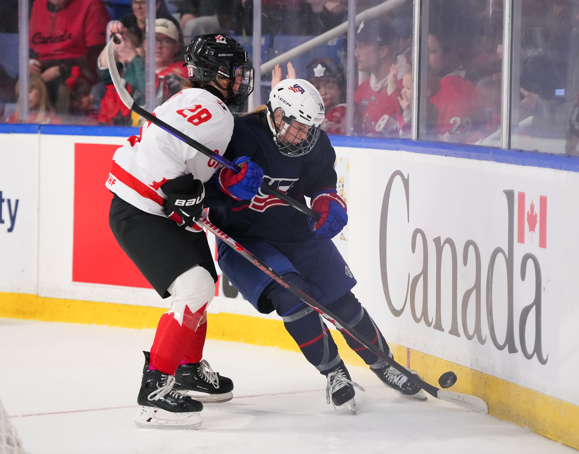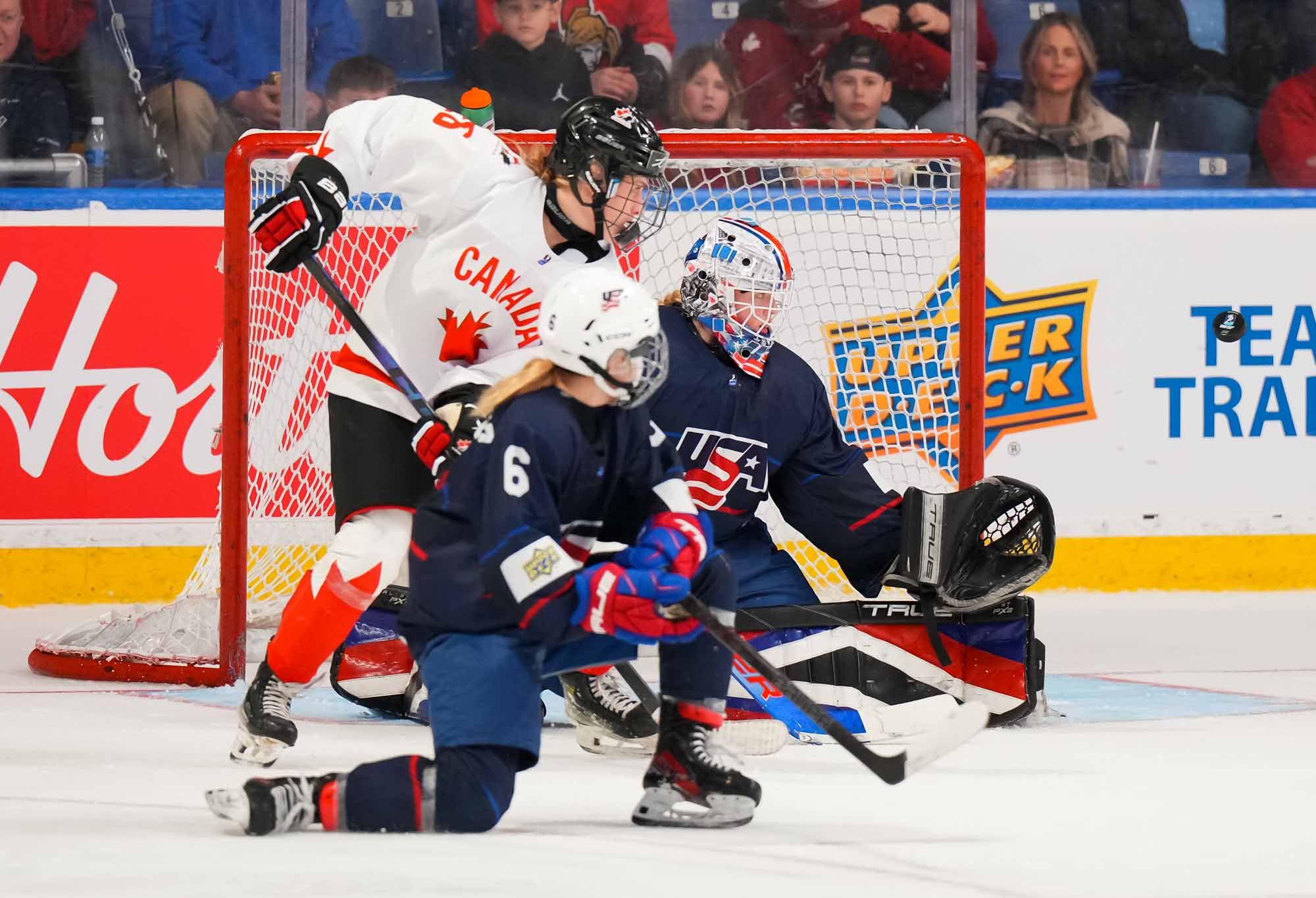 Although Canada moved the puck around crisply and generated several shots, none got past Birrittieri. And then, at 14:08, the Americans opened the scoring on a set faceoff play in the Canada end.