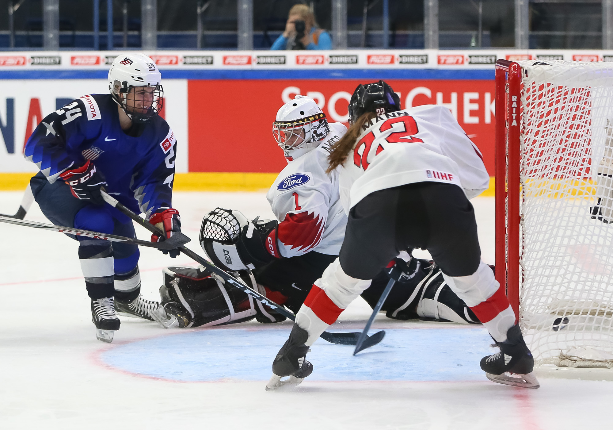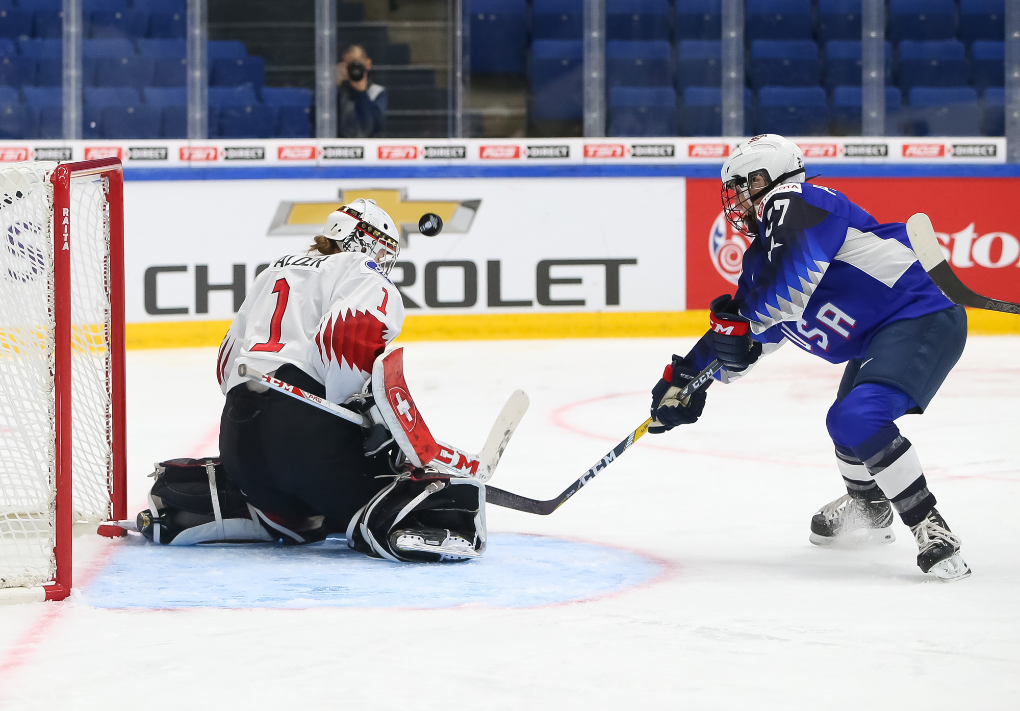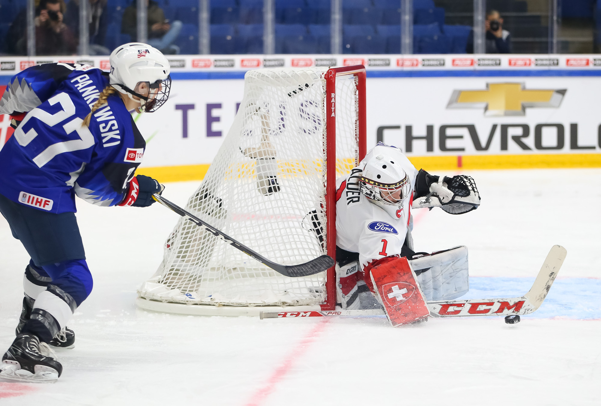 Amerikkalaisten Maddie Rooney sai ensimmäisen IIHF:n pelinsä maalissa sitten Kanadaa vastaan pelatun kultapelin PyeongChangissa. Tämä 21-vuotias University of Minnesota-Duluth Bulldogs -tähti oli paljon vähemmän kiireinen kuin sveitsiläinen kollegansa. Kuten oli arvattavissakin USA laukoi kohti Sveitsin Janine Alderia ottelussa koko ajan. Lopullinen määrä oli 57-6.