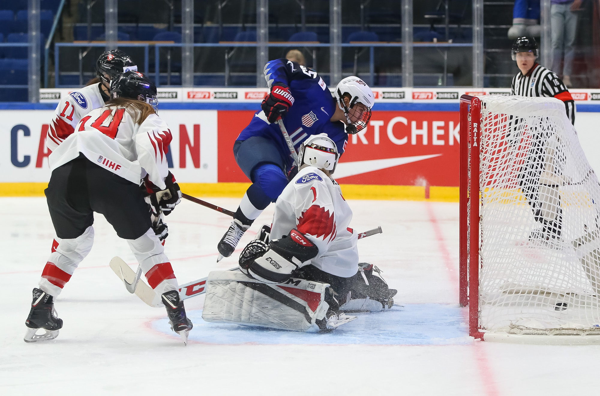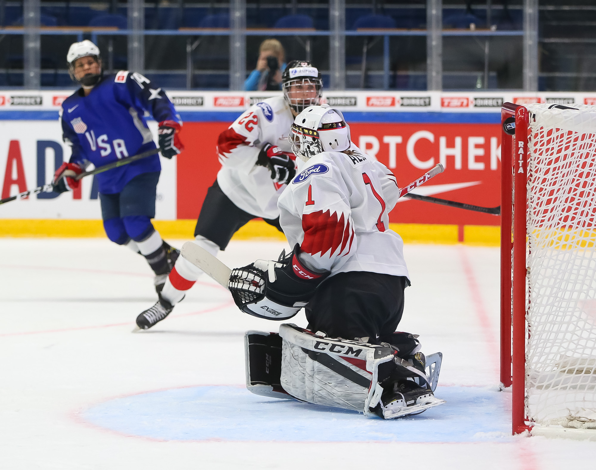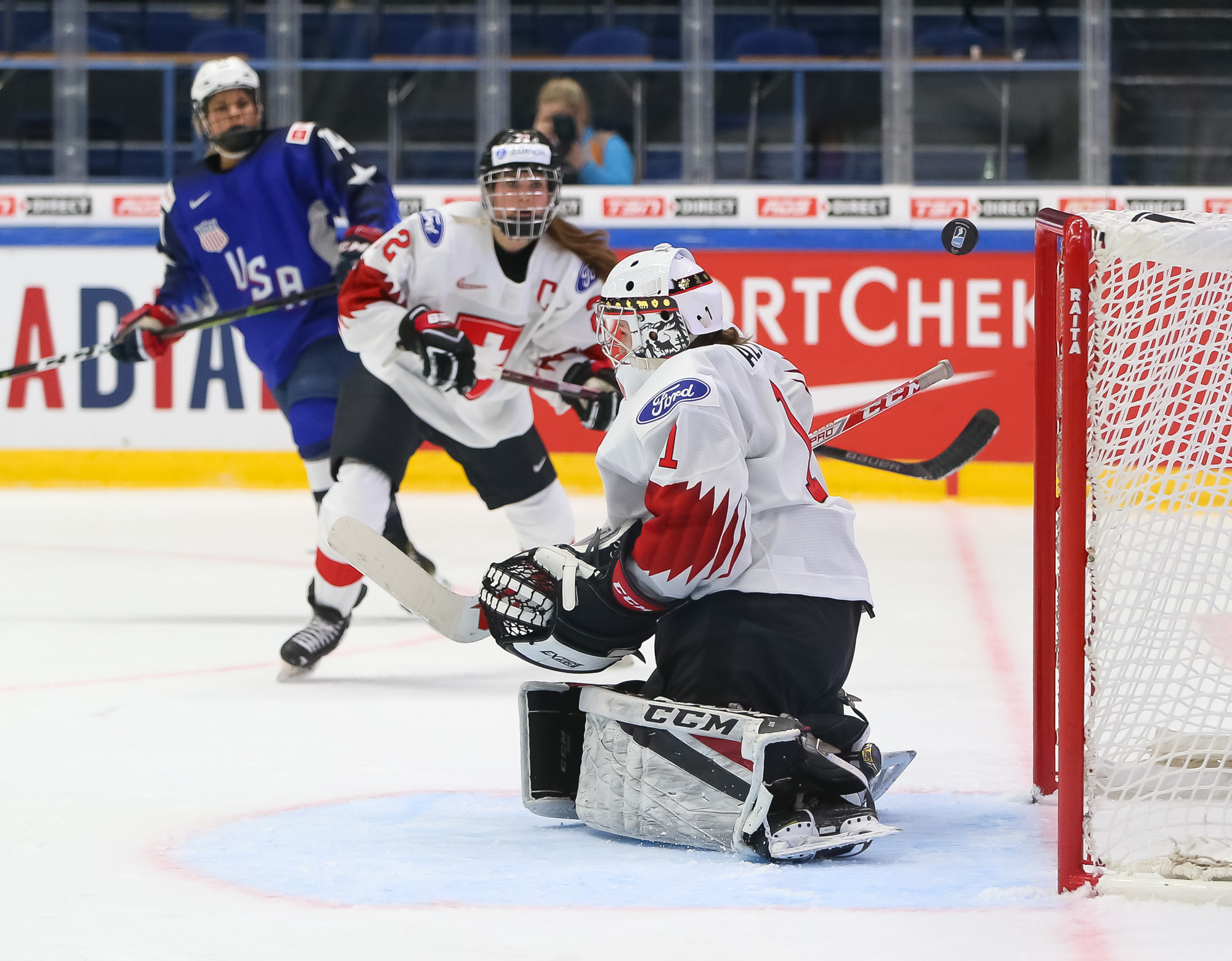 Amerikkalaisten Maddie Rooney sai ensimmäisen IIHF:n pelinsä maalissa sitten Kanadaa vastaan pelatun kultapelin PyeongChangissa. Tämä 21-vuotias University of Minnesota-Duluth Bulldogs -tähti oli paljon vähemmän kiireinen kuin sveitsiläinen kollegansa. Kuten oli arvattavissakin USA laukoi kohti Sveitsin Janine Alderia ottelussa koko ajan. Lopullinen määrä oli 57-6.