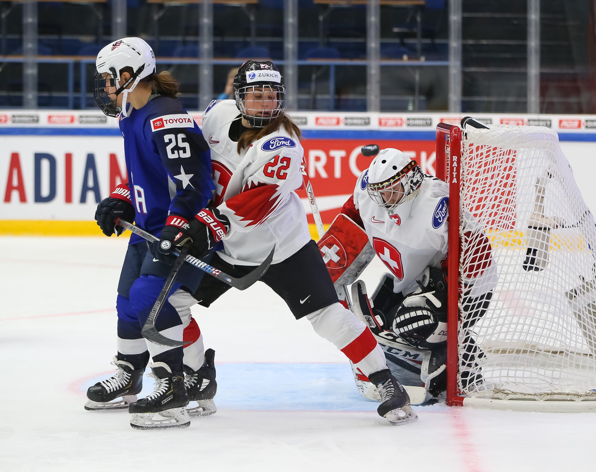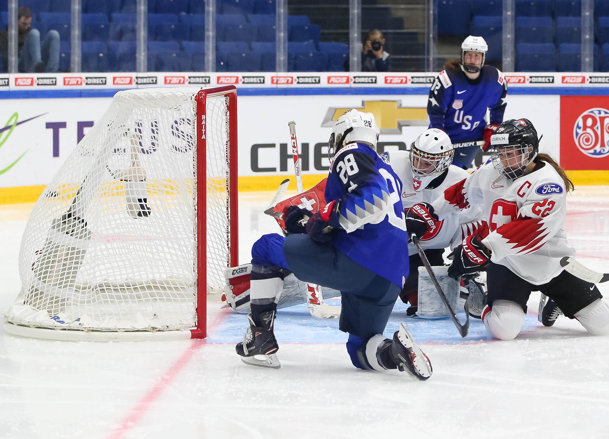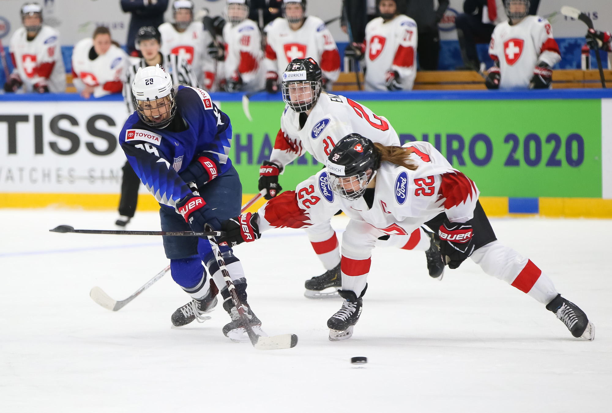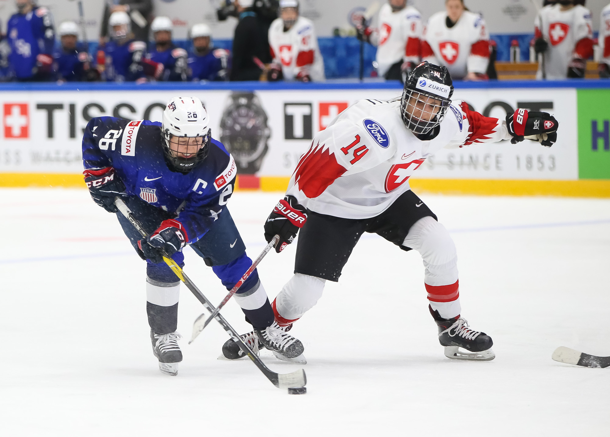 USA pelasi kuudella puolustajalla, sillä veteraani Kacey Bellamy, seitsenkertainen maailmanmestari ja 2018 olympiakultamitalisti, oli sairaana. Hannah Brandt, kaksinkertainen maailmanmestari ja 2018 olympiakultamitalisti, istui jo toisen pelin tulokas Jesse Compherin hyväksi, joka pelasi keskellä Hilary Knightin ja Dani Cameranesin ollessa laidoilla. Sveitsin hyökkääjä Lara Stalder oli edelleen loukkaantuneena olkapäävamman vuoksi.