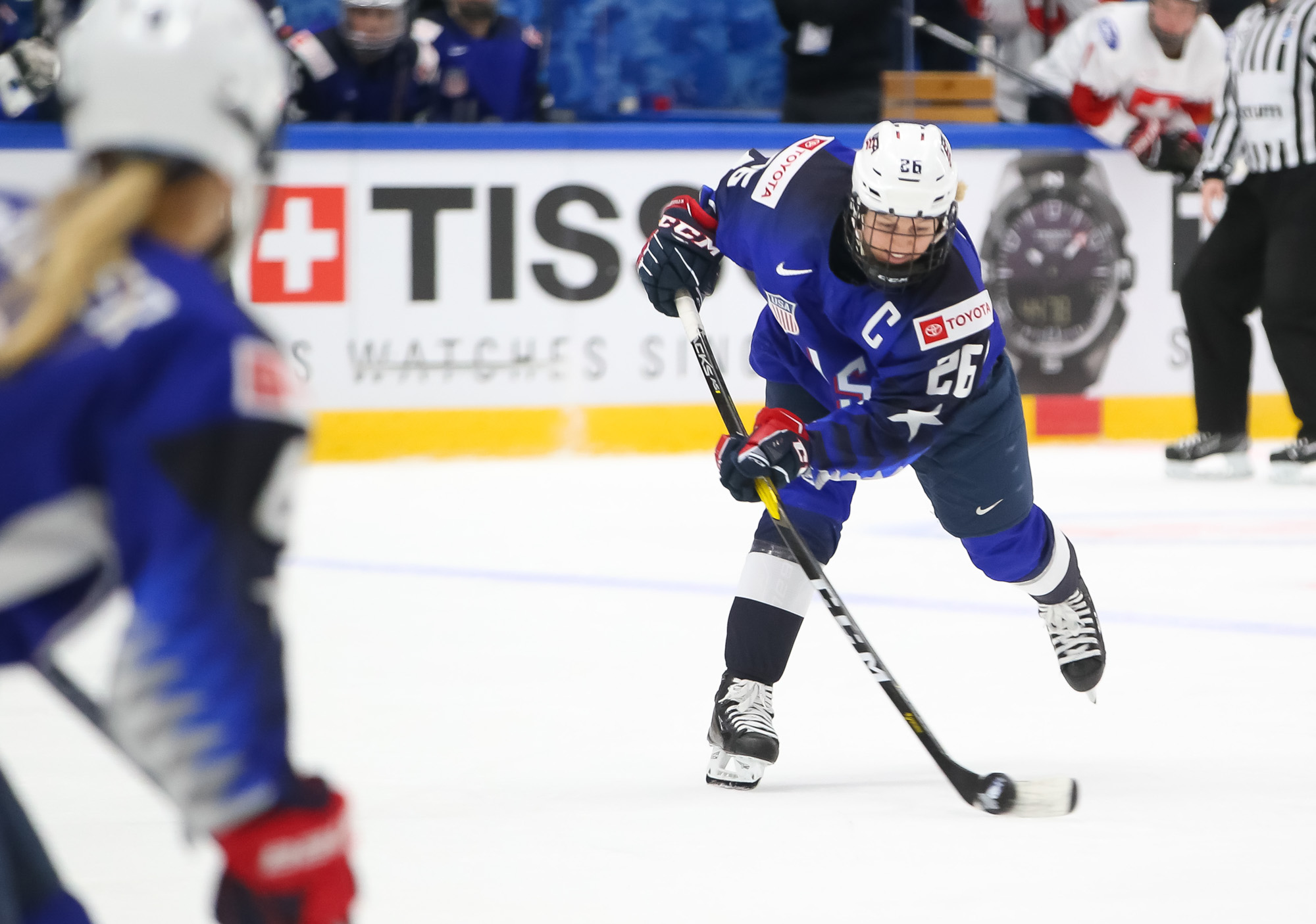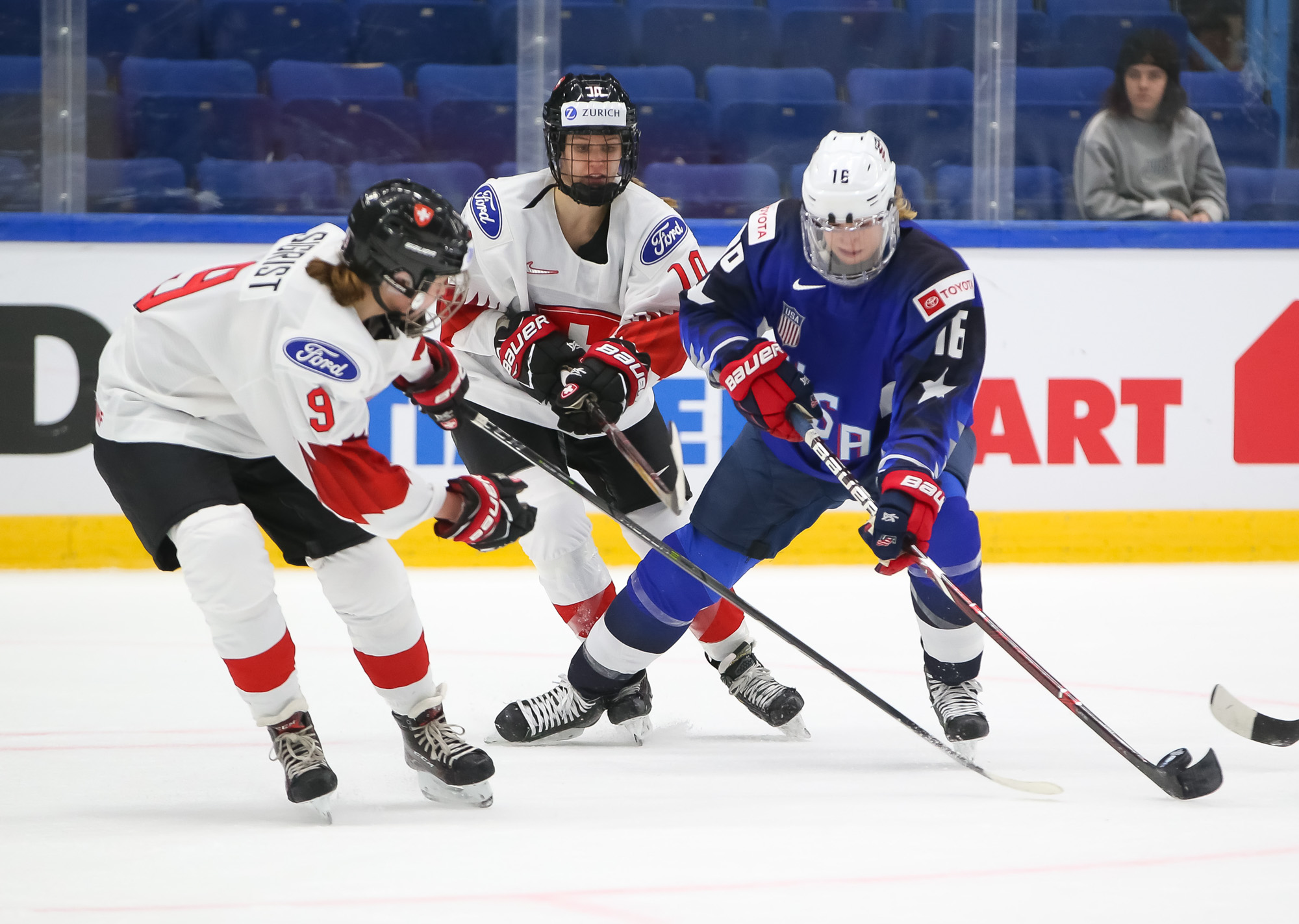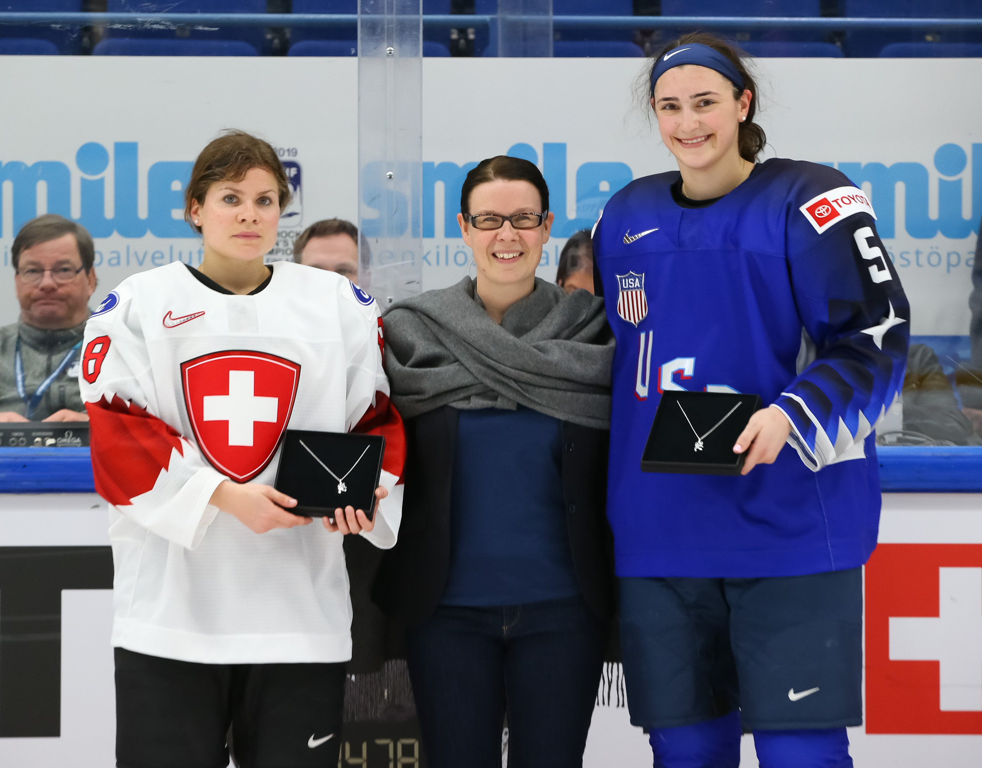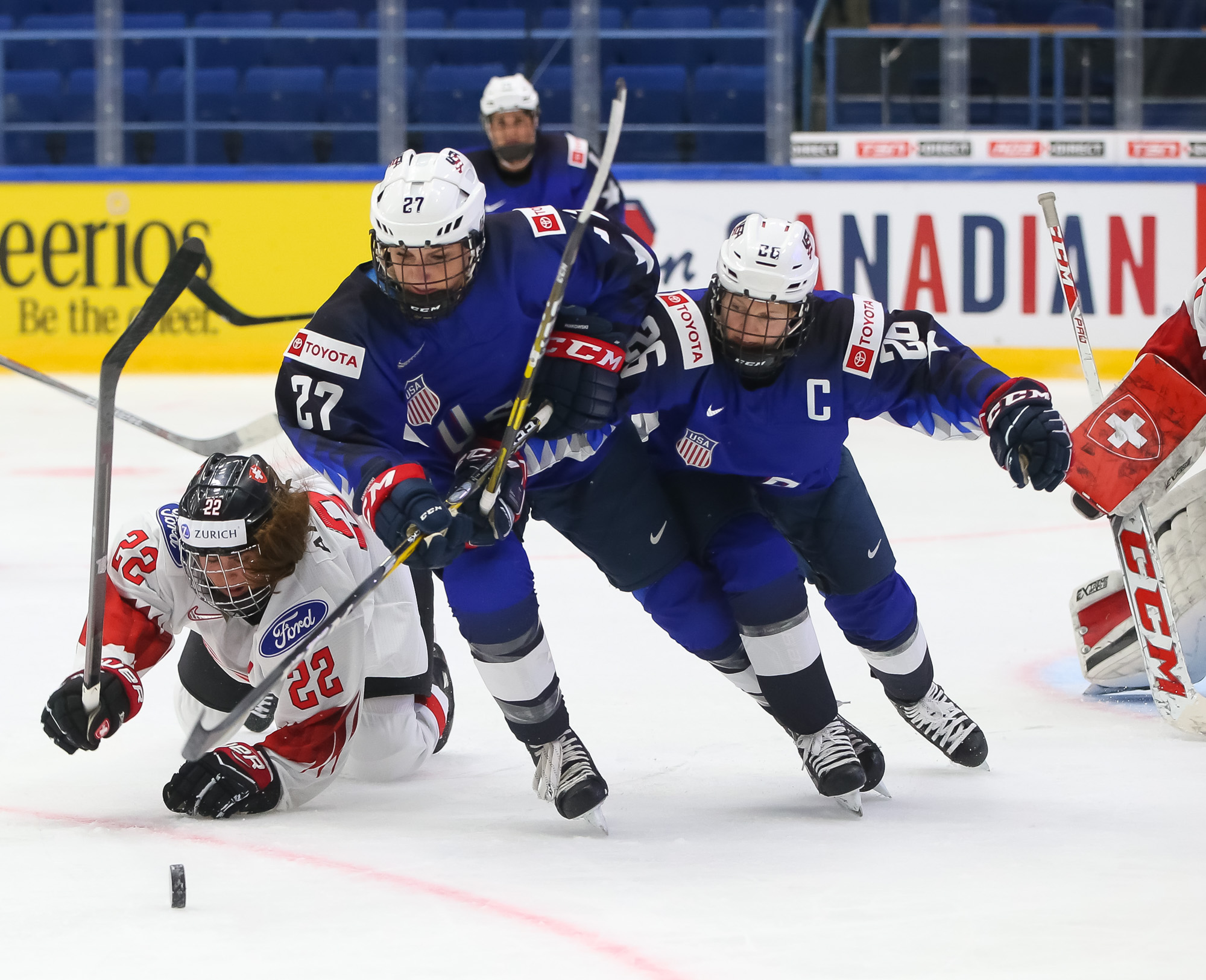 USA pelasi kuudella puolustajalla, sillä veteraani Kacey Bellamy, seitsenkertainen maailmanmestari ja 2018 olympiakultamitalisti, oli sairaana. Hannah Brandt, kaksinkertainen maailmanmestari ja 2018 olympiakultamitalisti, istui jo toisen pelin tulokas Jesse Compherin hyväksi, joka pelasi keskellä Hilary Knightin ja Dani Cameranesin ollessa laidoilla. Sveitsin hyökkääjä Lara Stalder oli edelleen loukkaantuneena olkapäävamman vuoksi.