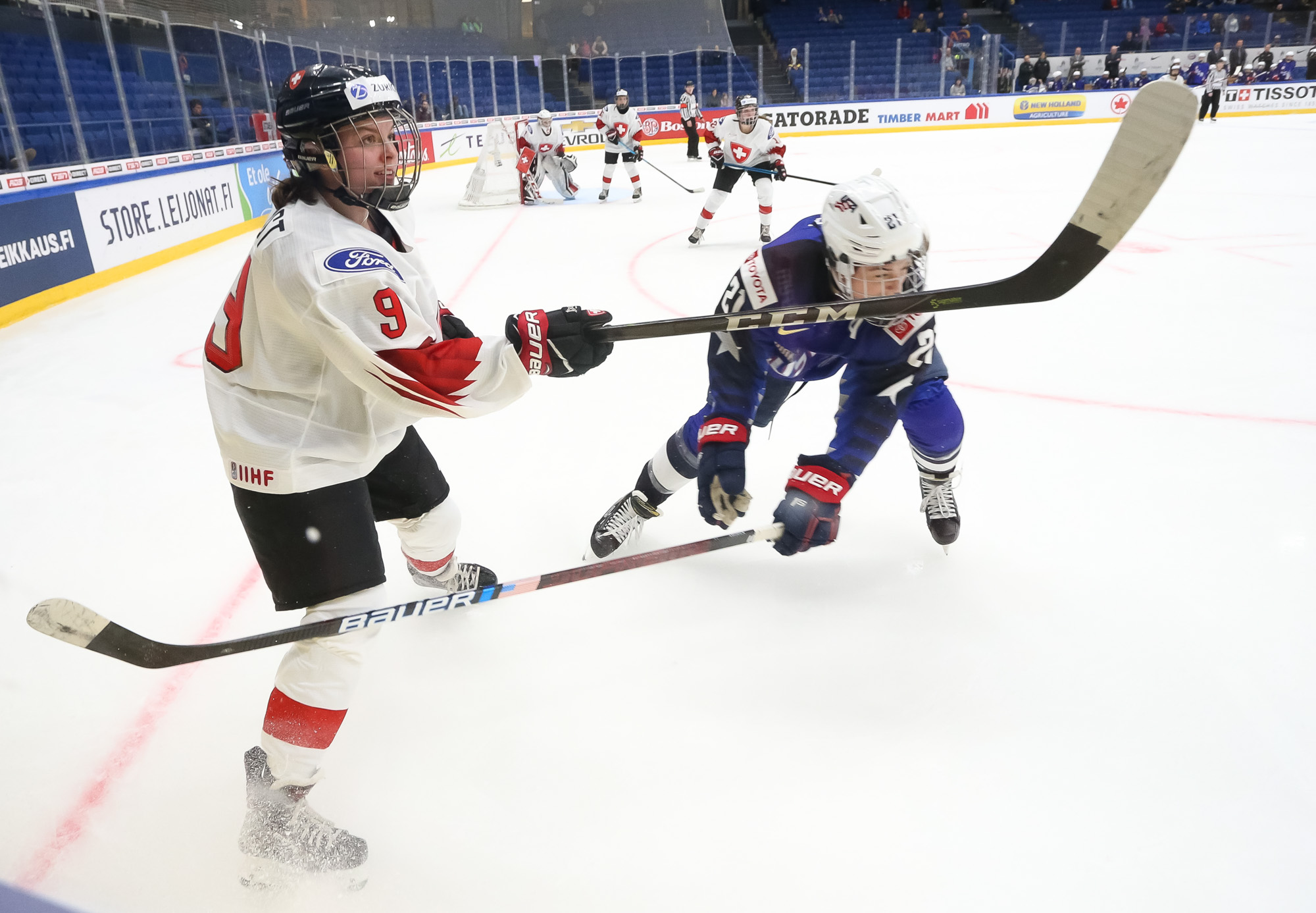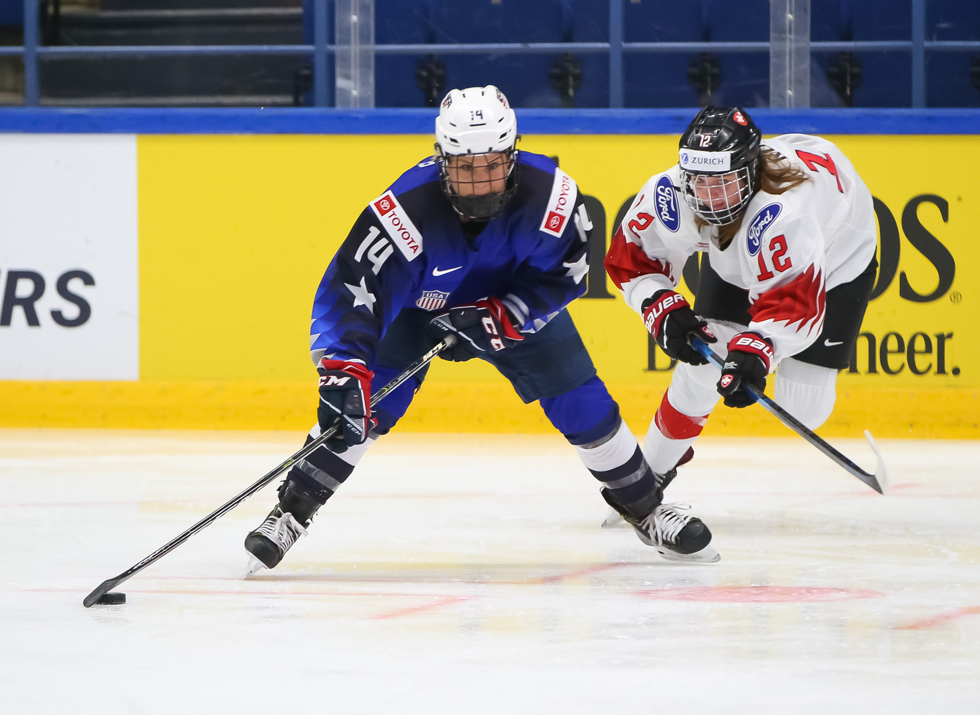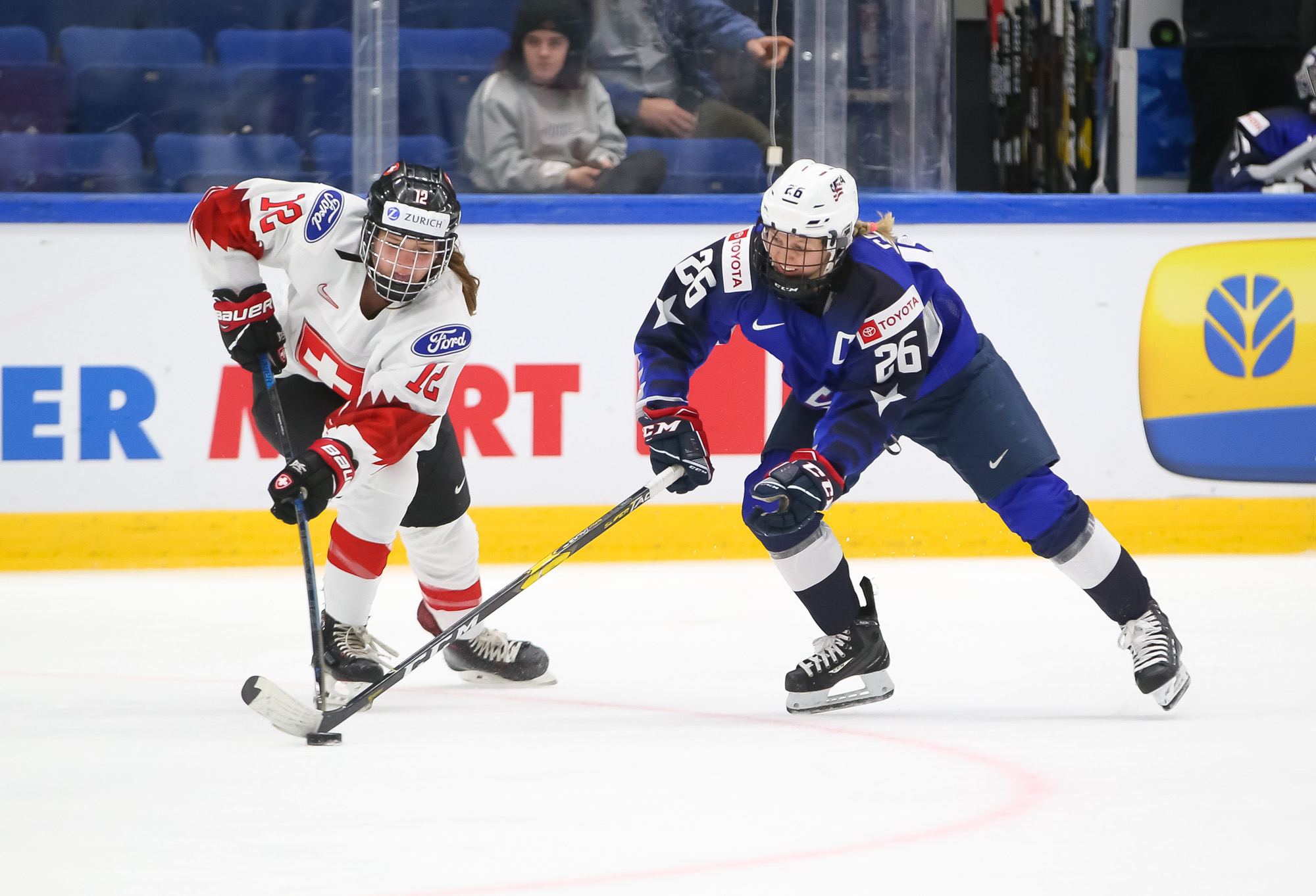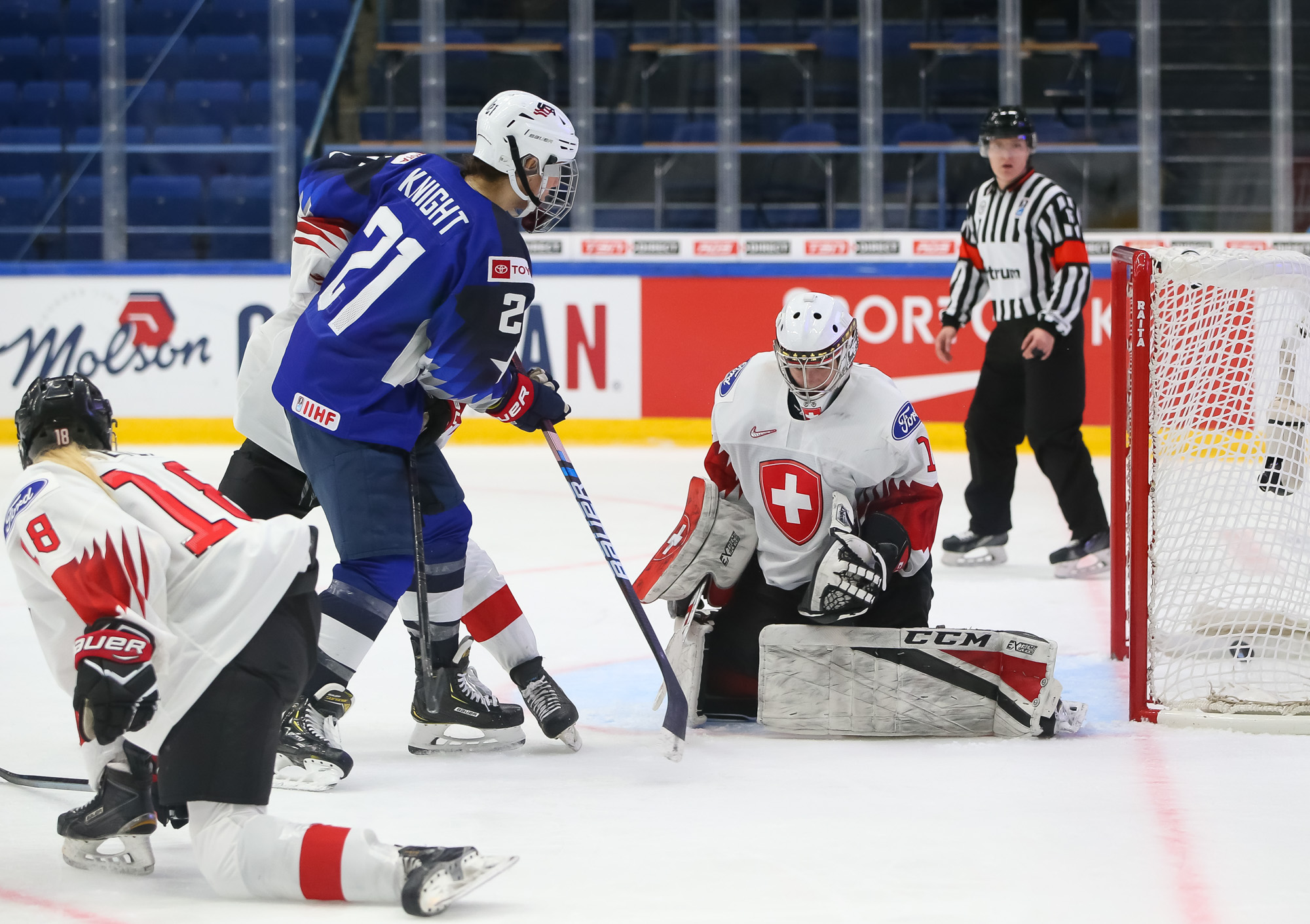 USA pelasi kuudella puolustajalla, sillä veteraani Kacey Bellamy, seitsenkertainen maailmanmestari ja 2018 olympiakultamitalisti, oli sairaana. Hannah Brandt, kaksinkertainen maailmanmestari ja 2018 olympiakultamitalisti, istui jo toisen pelin tulokas Jesse Compherin hyväksi, joka pelasi keskellä Hilary Knightin ja Dani Cameranesin ollessa laidoilla. Sveitsin hyökkääjä Lara Stalder oli edelleen loukkaantuneena olkapäävamman vuoksi.