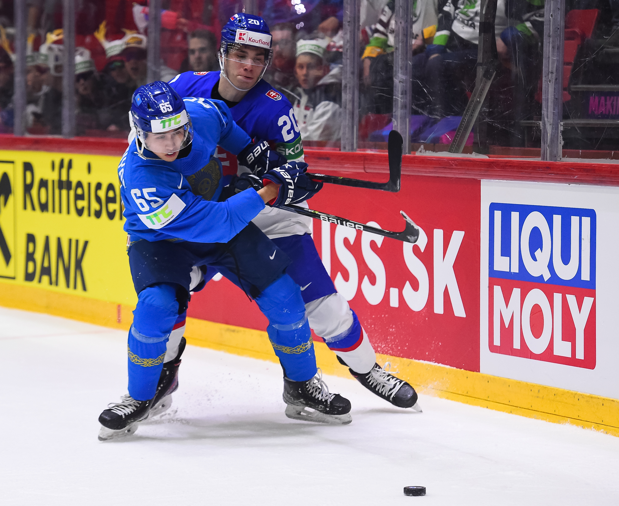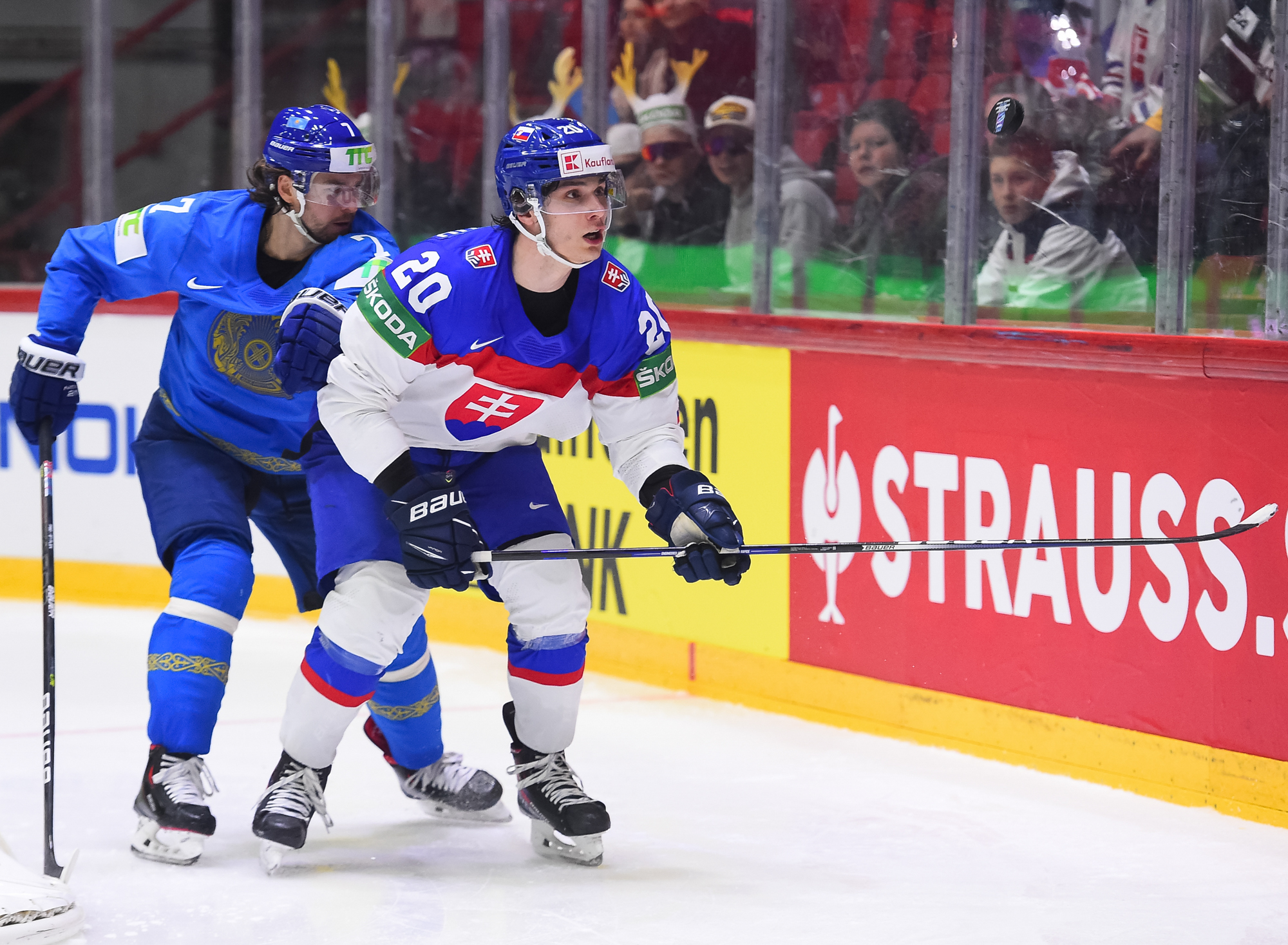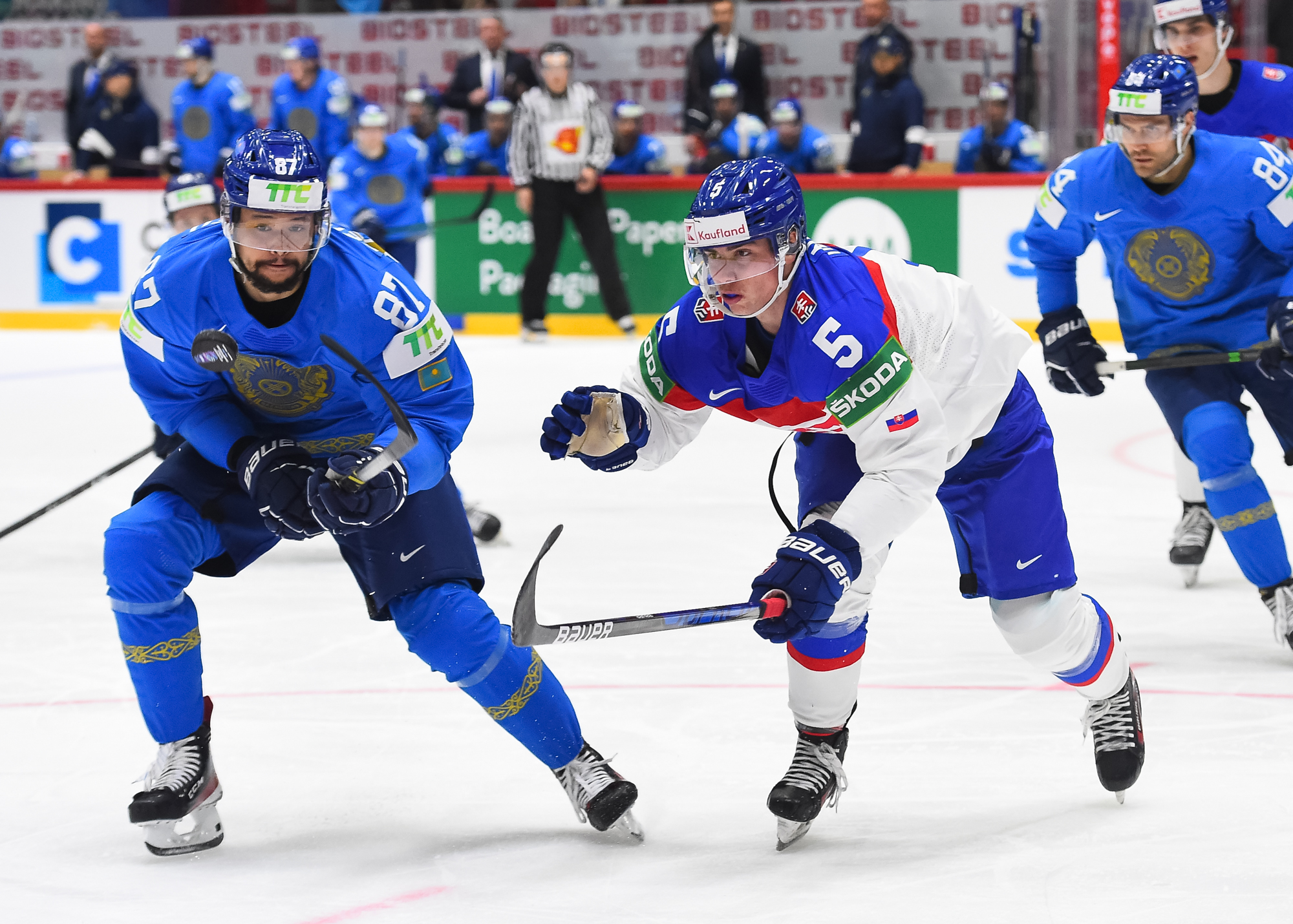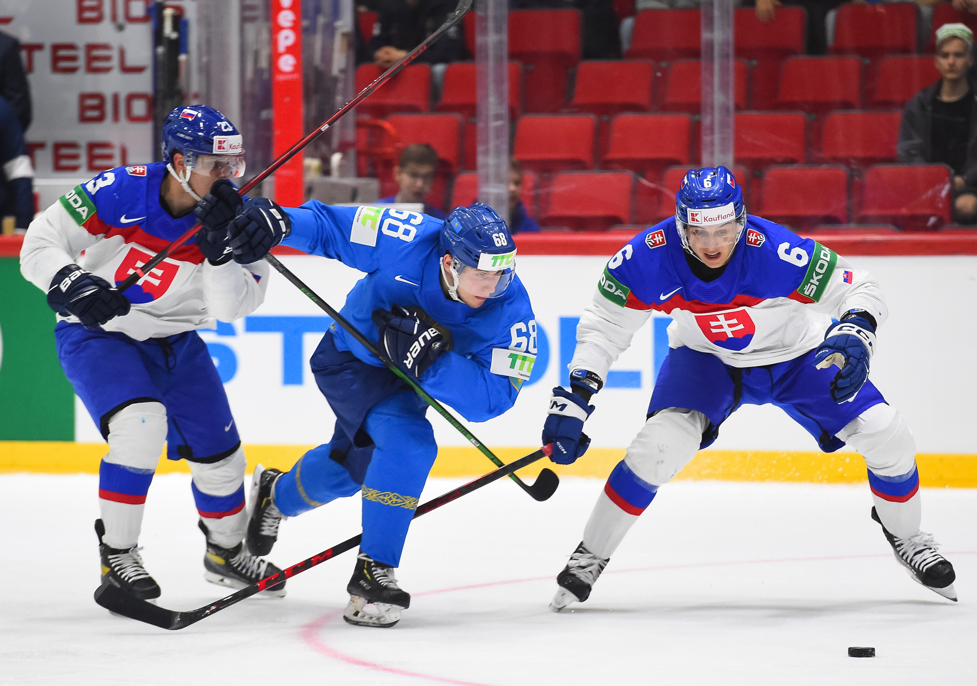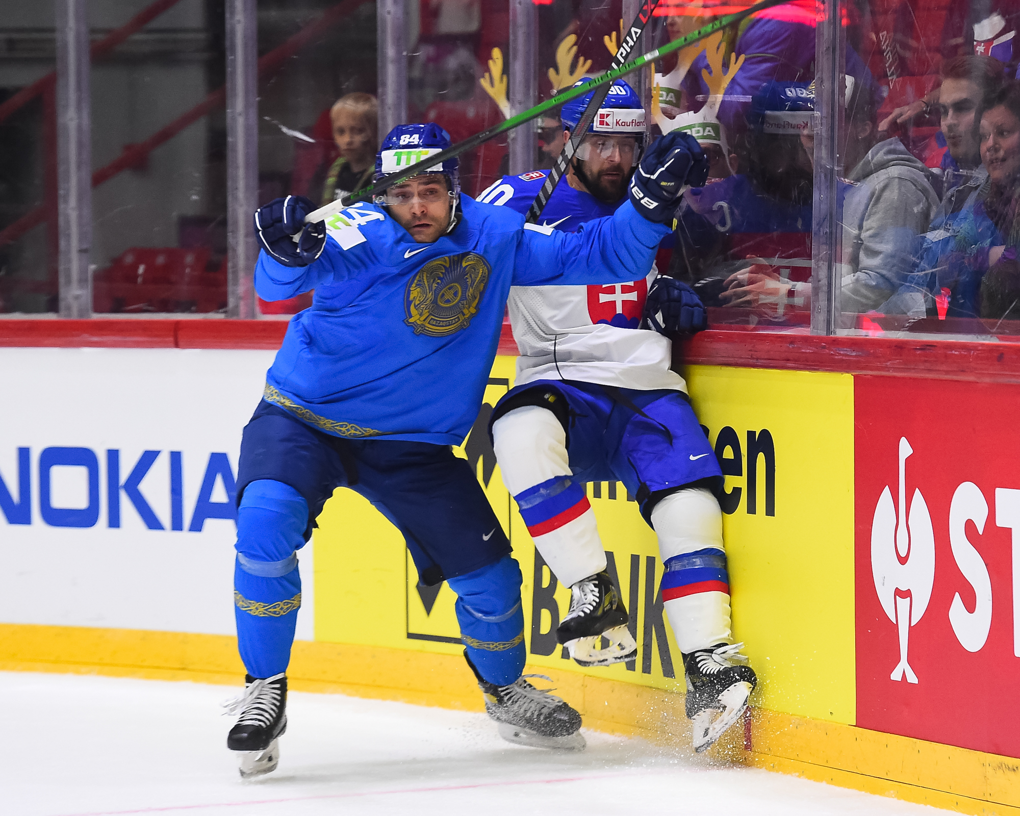Kazakstanin Pavol Akolzin pääsi slovakialaisten ihon alle taklattuaan kovaa Milos Romania Slovakian maalin takana. Kristian Pospisil otti samassa vaihdossa ottelun ensimmäisen jäähyn poikittaisesta mailasta.