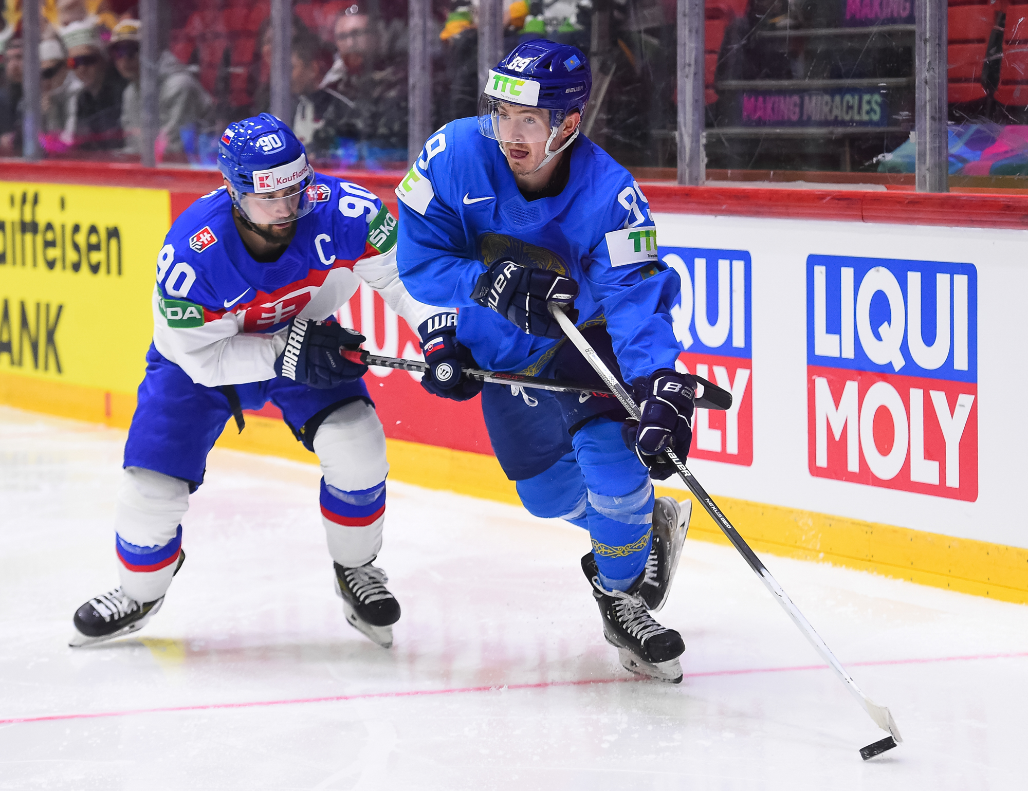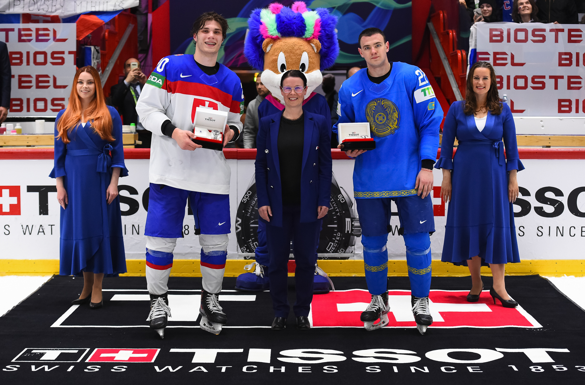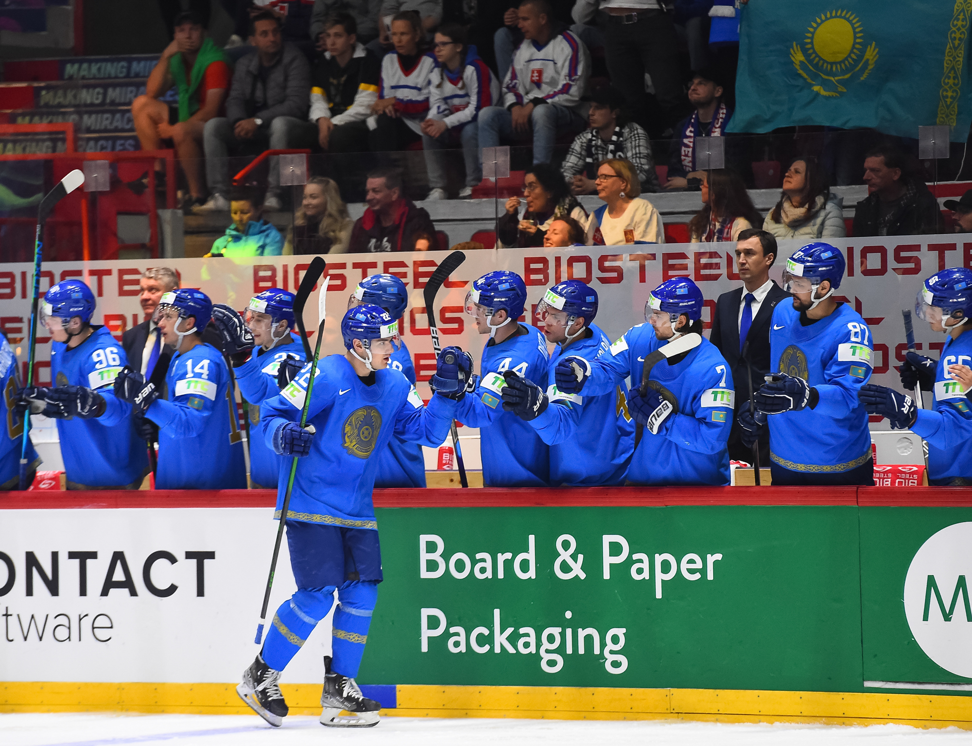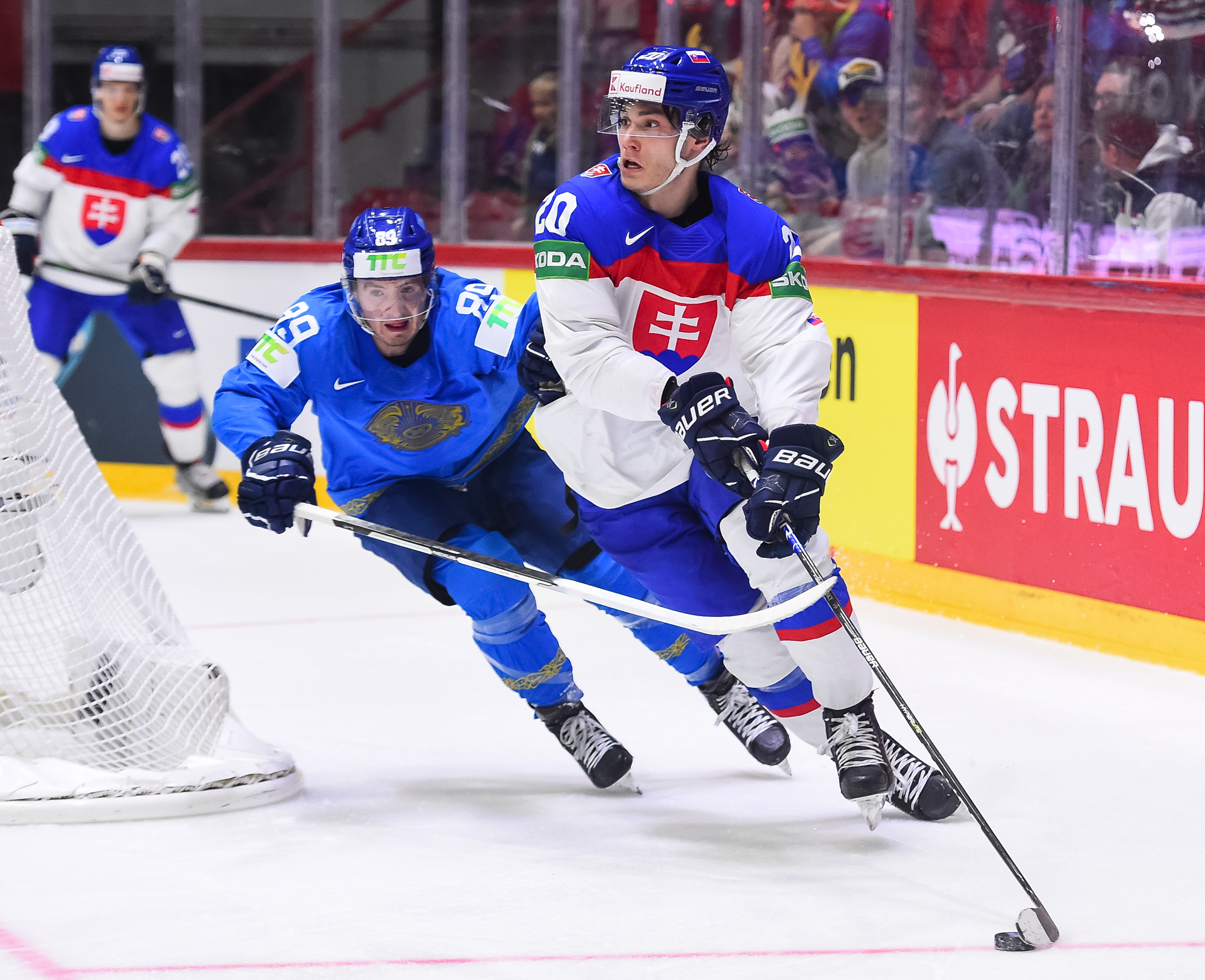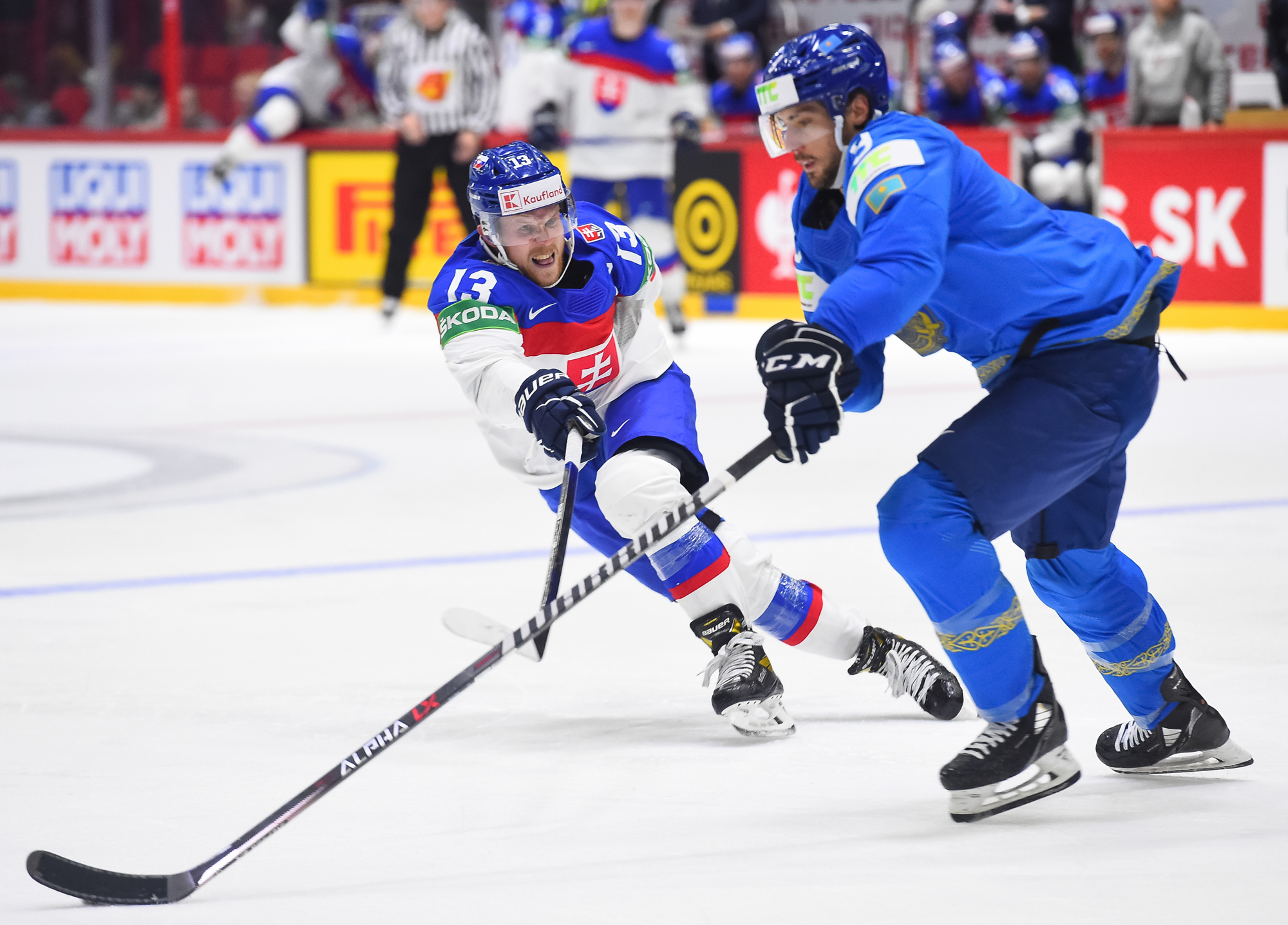 Kazakstanin Pavol Akolzin pääsi slovakialaisten ihon alle taklattuaan kovaa Milos Romania Slovakian maalin takana. Kristian Pospisil otti samassa vaihdossa ottelun ensimmäisen jäähyn poikittaisesta mailasta.
