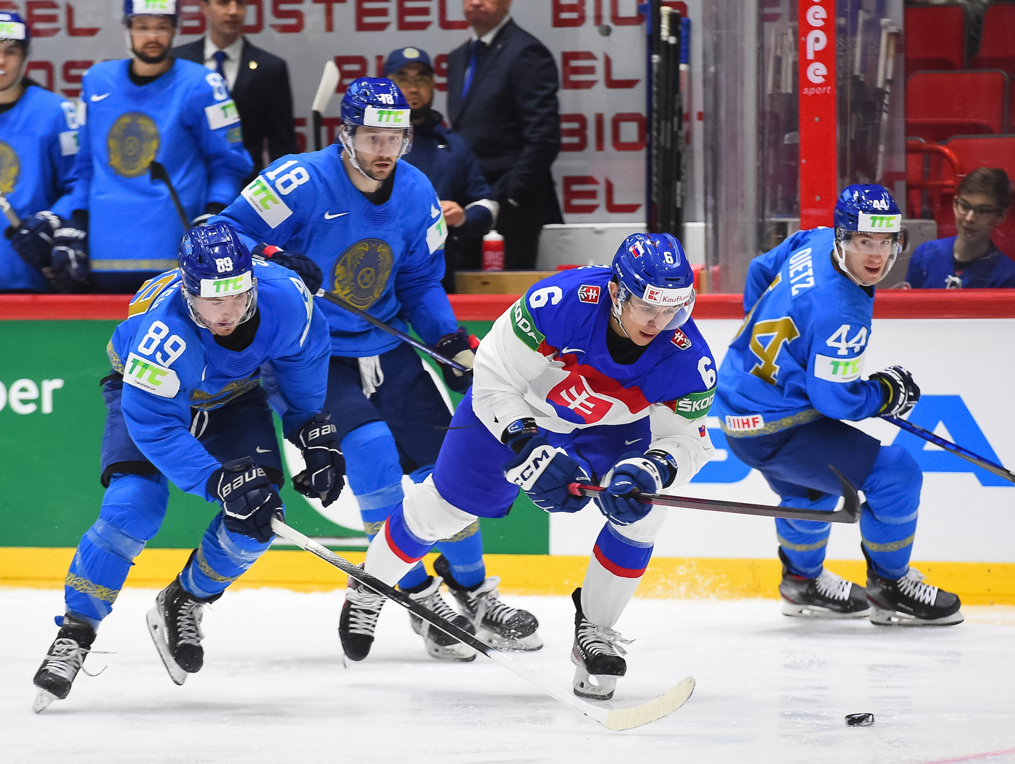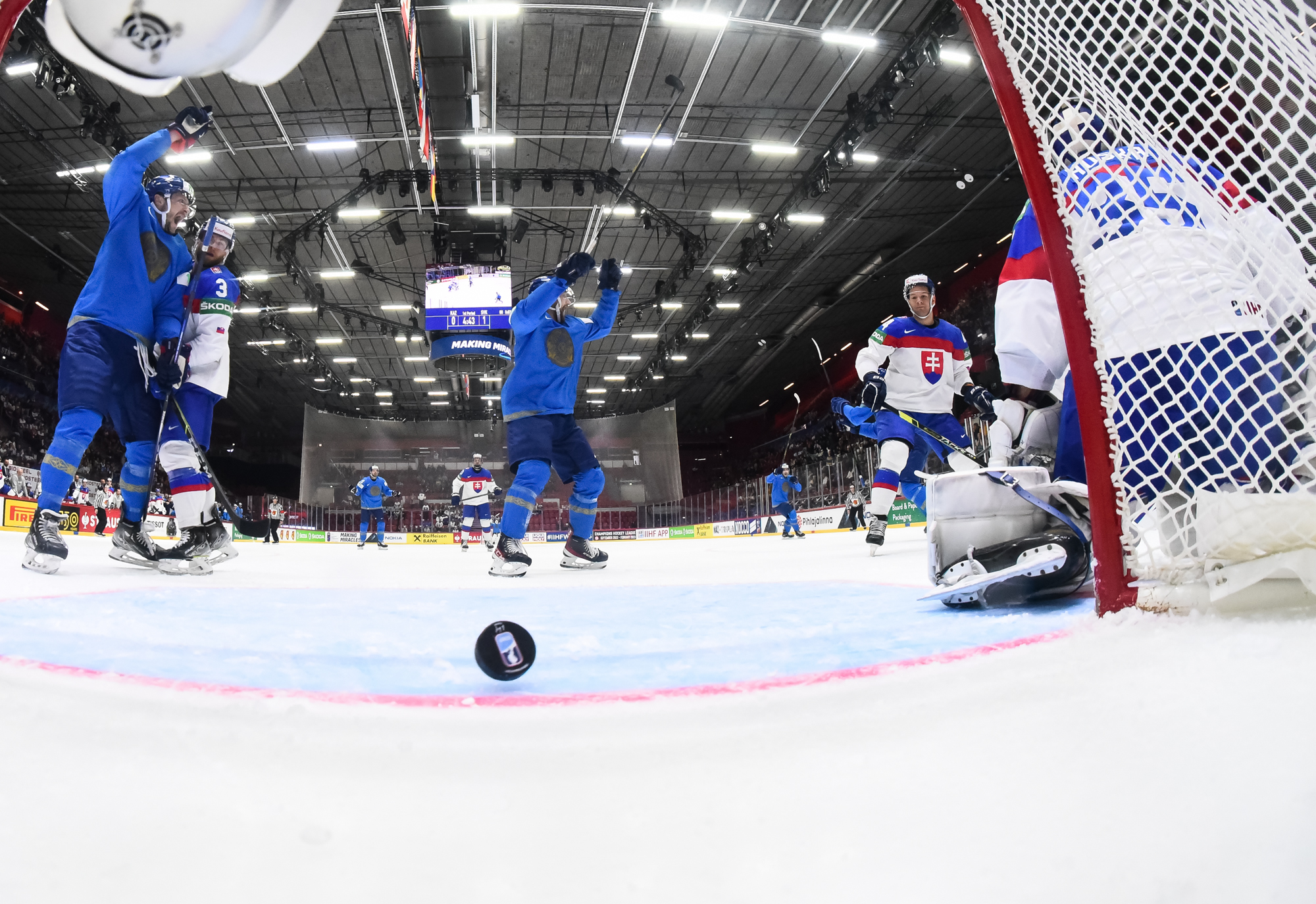 Kun ensimmäistä erää oli jäljellä 04:43, Kazakstan tuli tasoihin ylivoiman turvin. Slovakialaisvahti Huska pysäytti ensin Jesse Blackerin yrityksen, mutta ei saanut paluukiekkoa ohjattua, josta Pnyukhov kiitti erehtymättä.