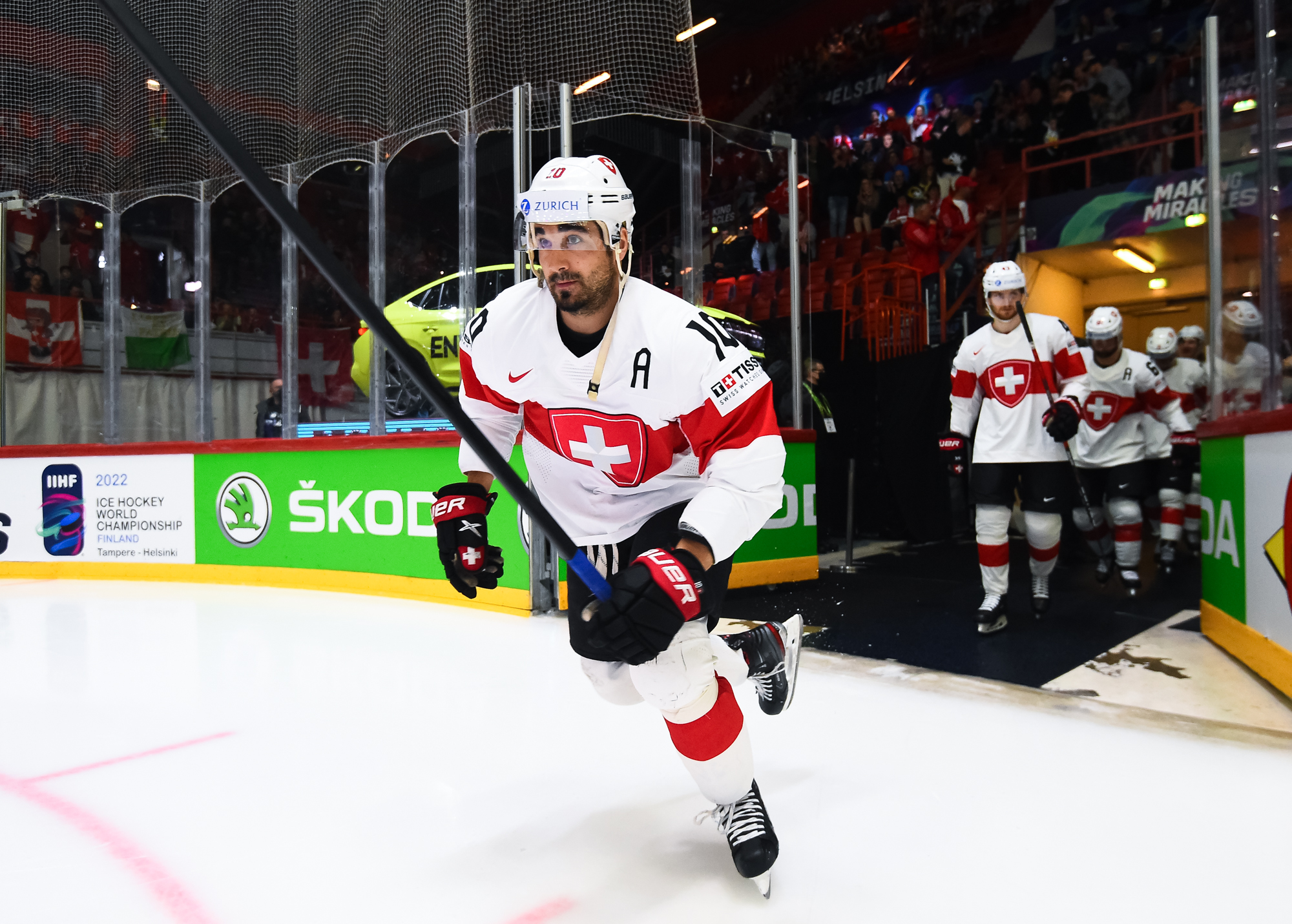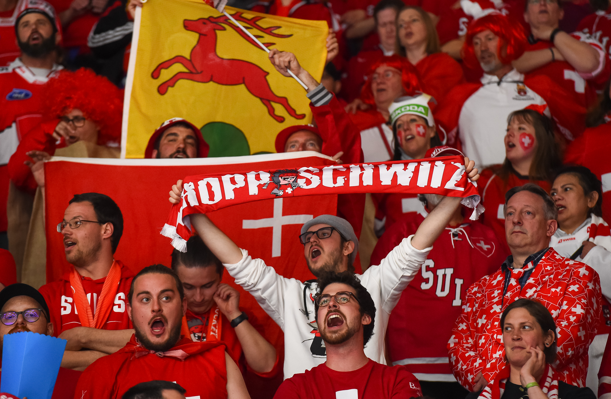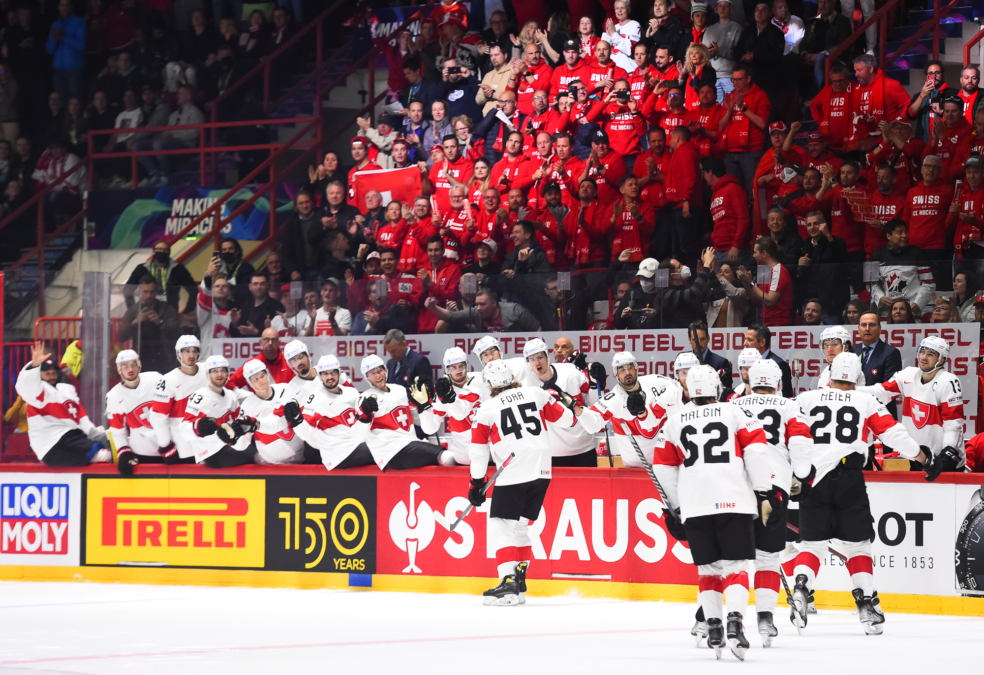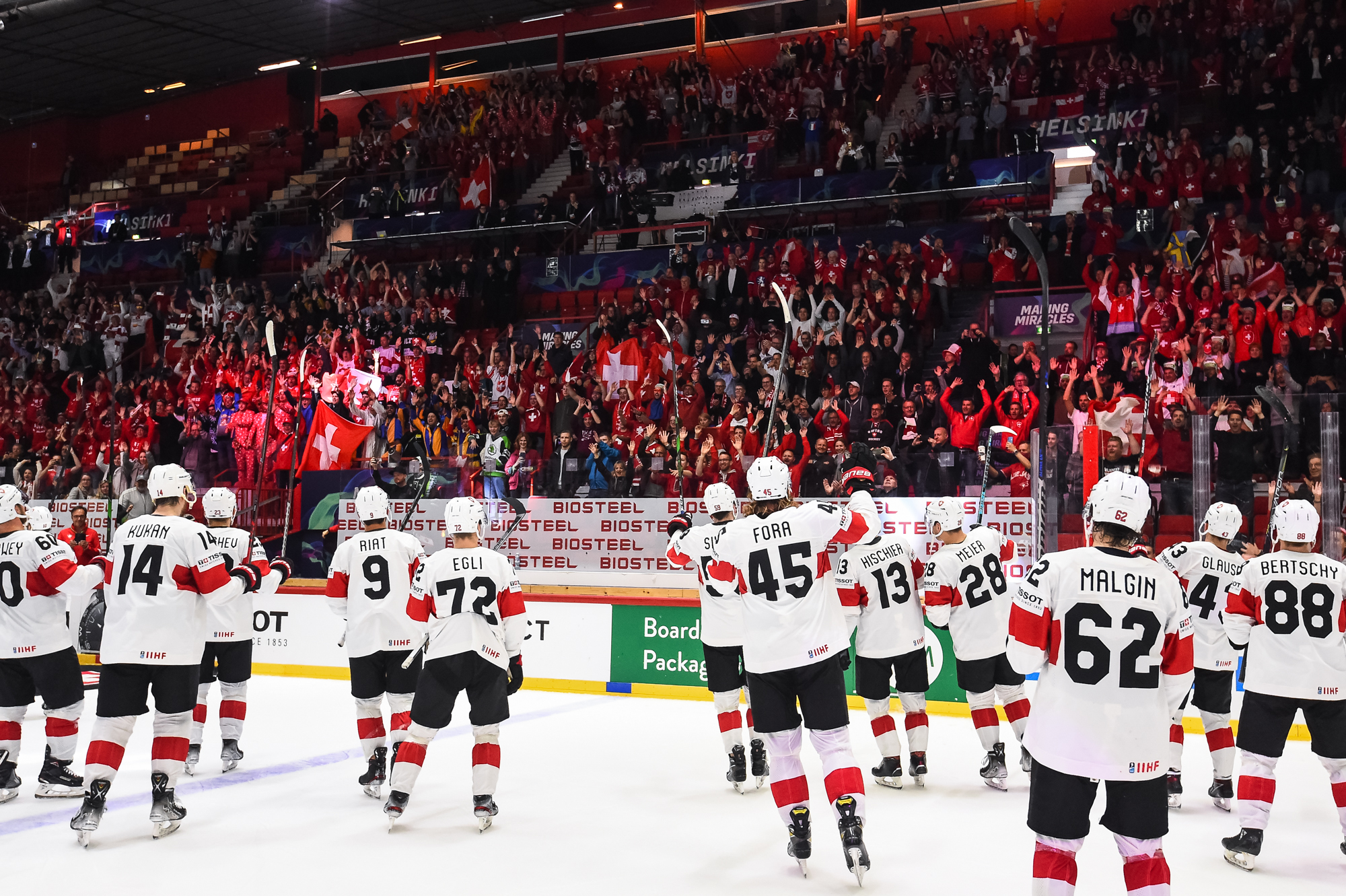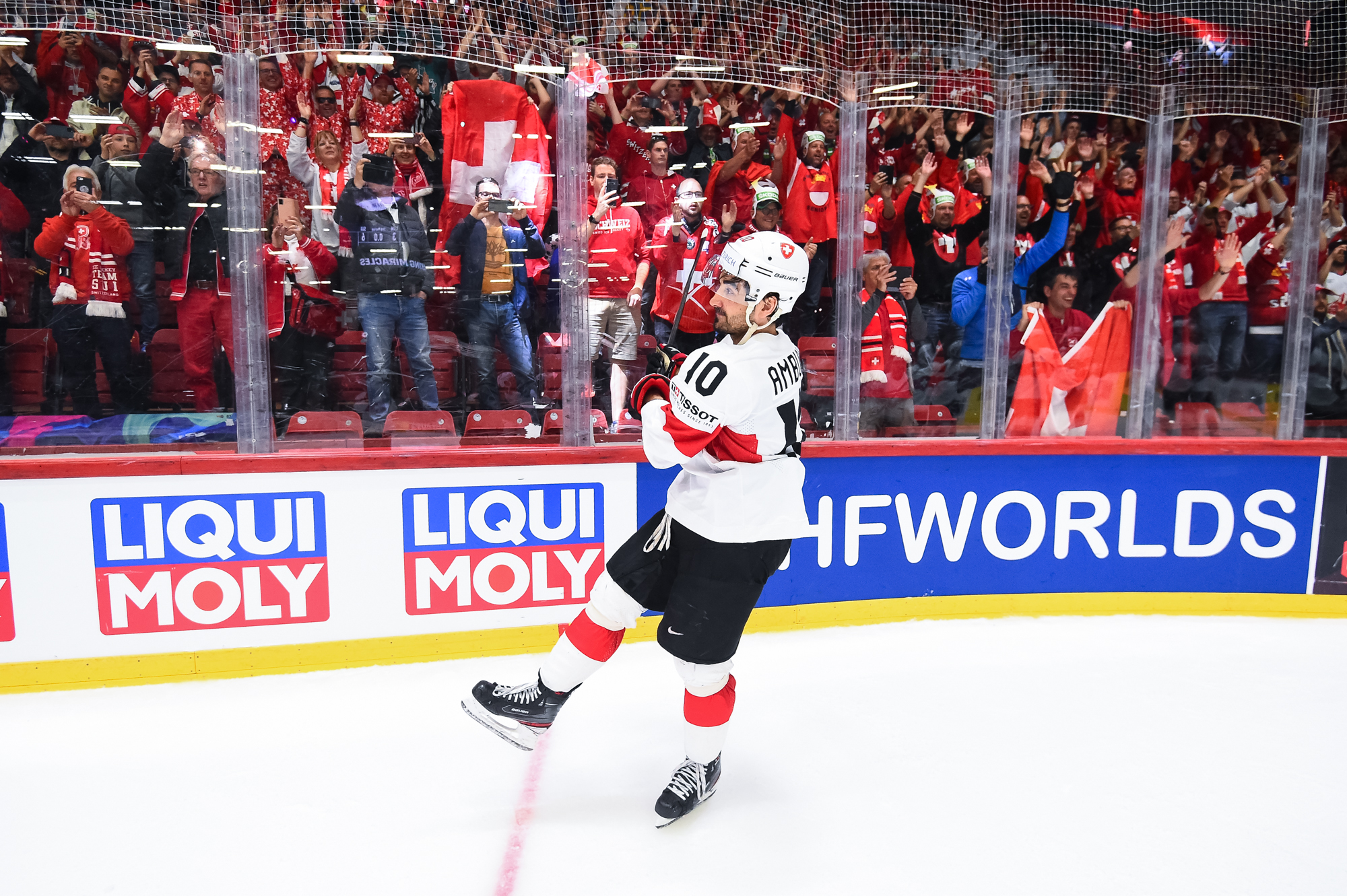 Ensimmäinen erä oli tähän mennessä koko turnauksen kiehtovinta jääkiekkoa. Hallissa meteliä piti suuri joukko sveitsiläisfaneja ja yhteislaulu alkoi jo Ambühlin palkitsemisen yhteydessä. Ensimmäisen erän jälkeen tilanne oli 3-3.
