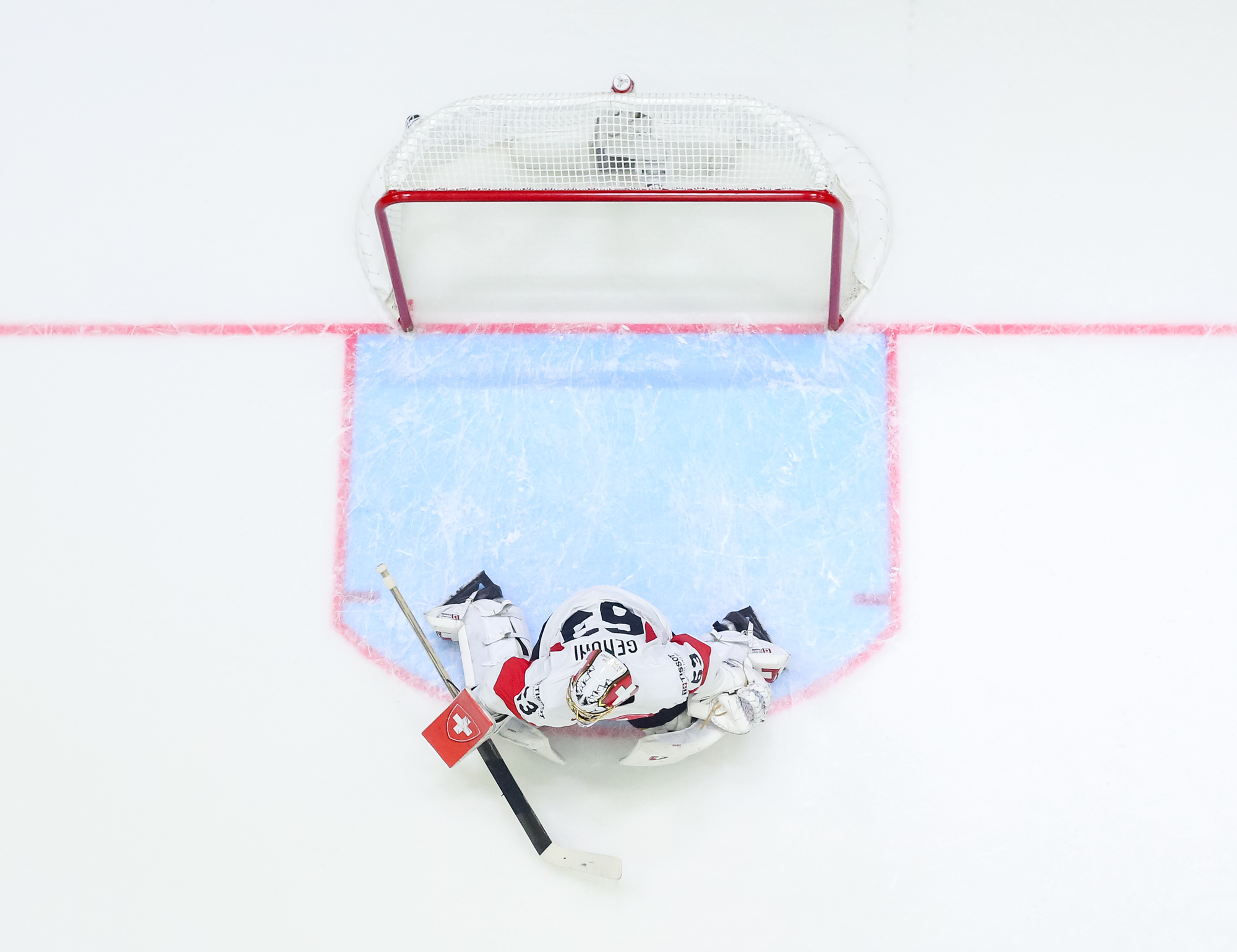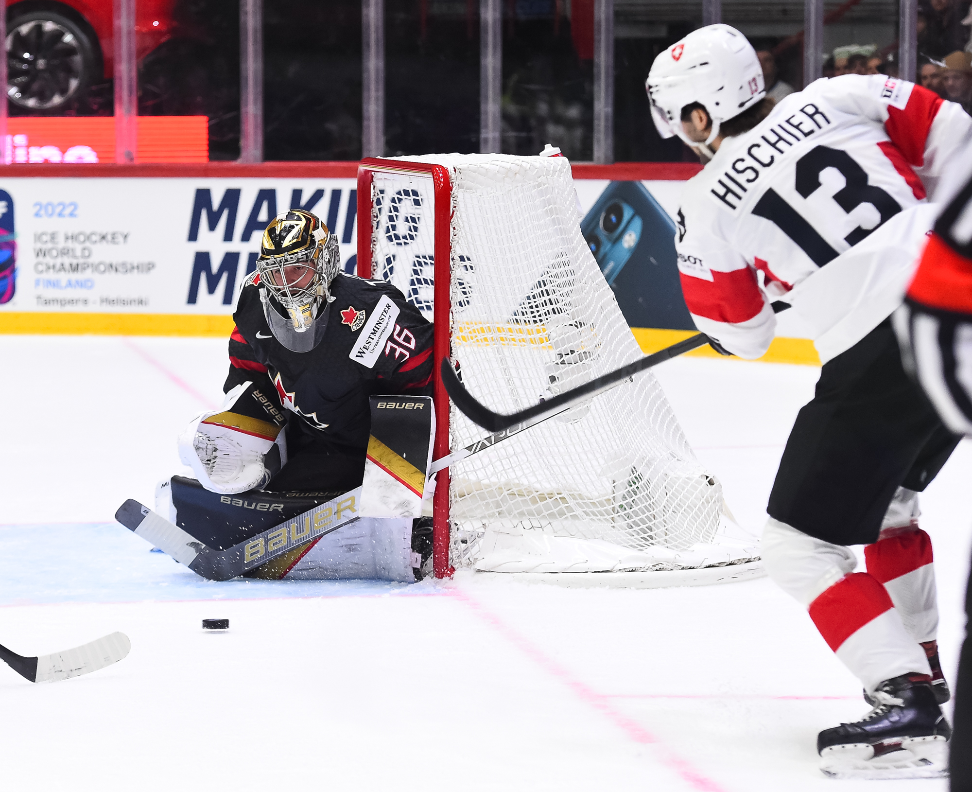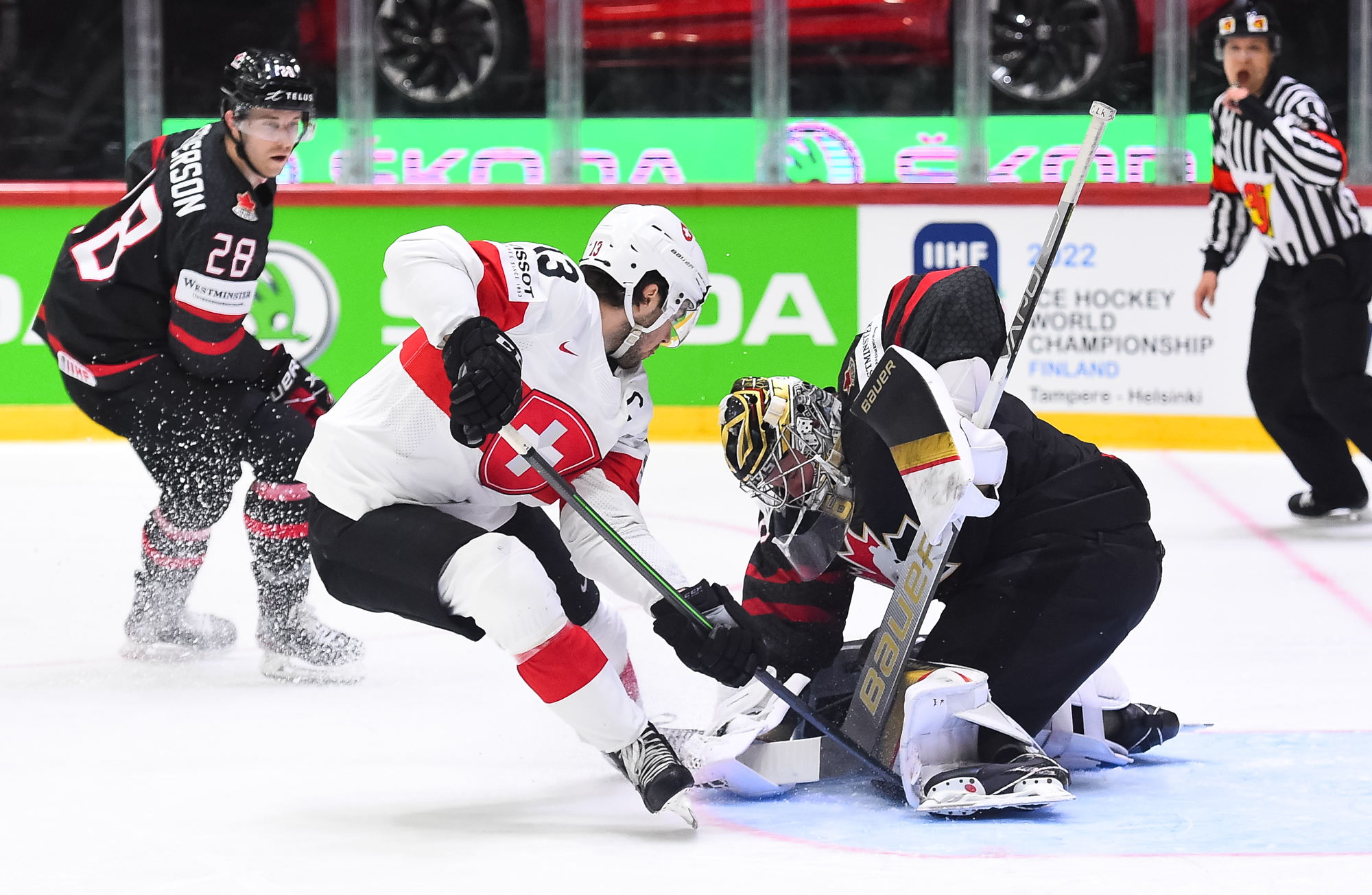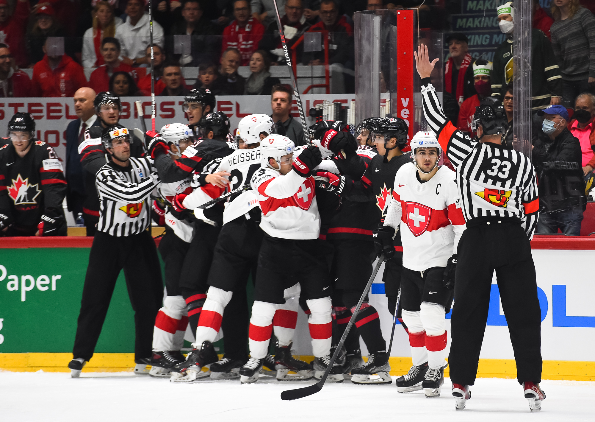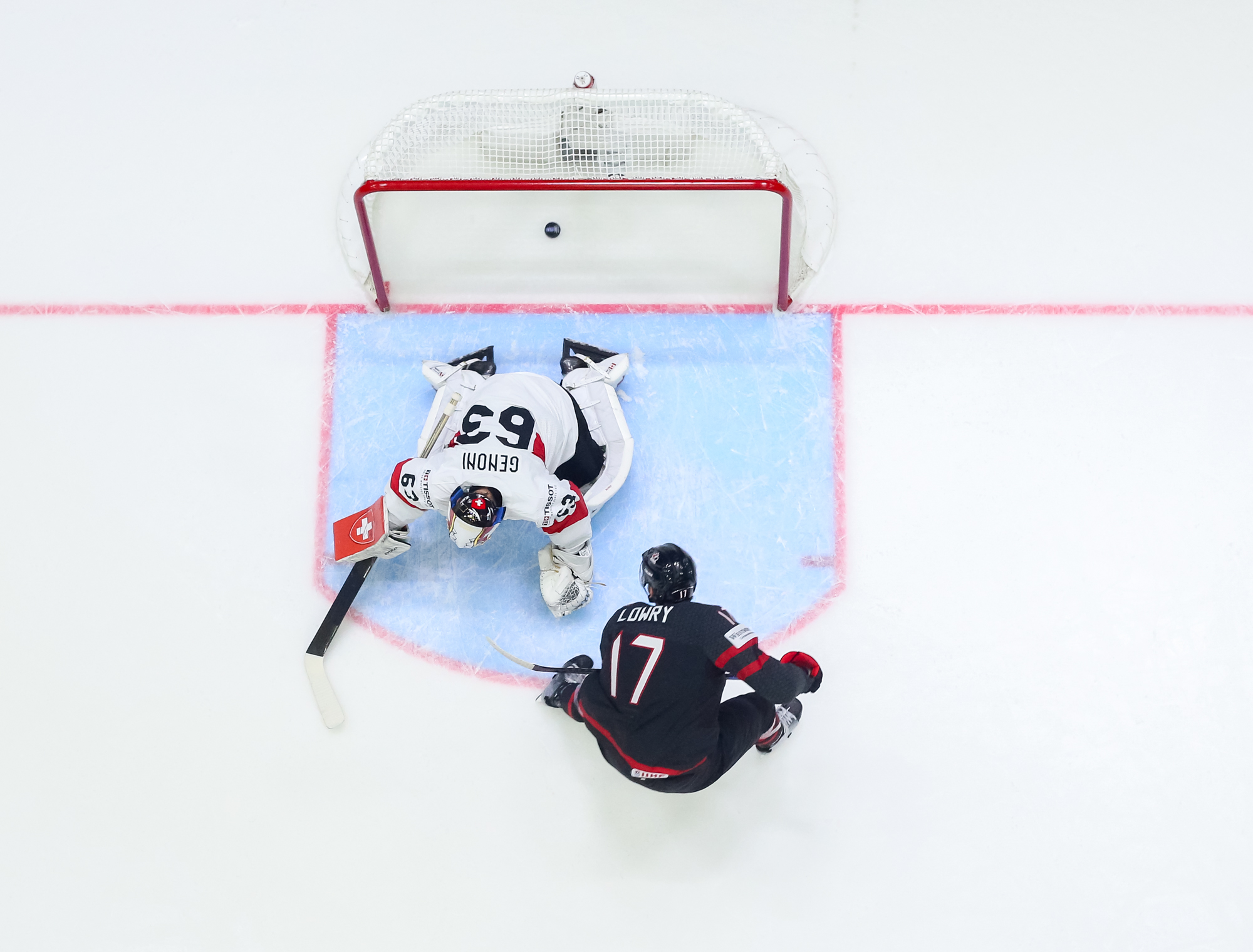 Sveitsiläiset luulivat jo avanneen maalitilinsä, mutta videotarkistuksen perusteella maali hylättiin Nico Hischierin estettyä Logan Thompsonia torjumasta.