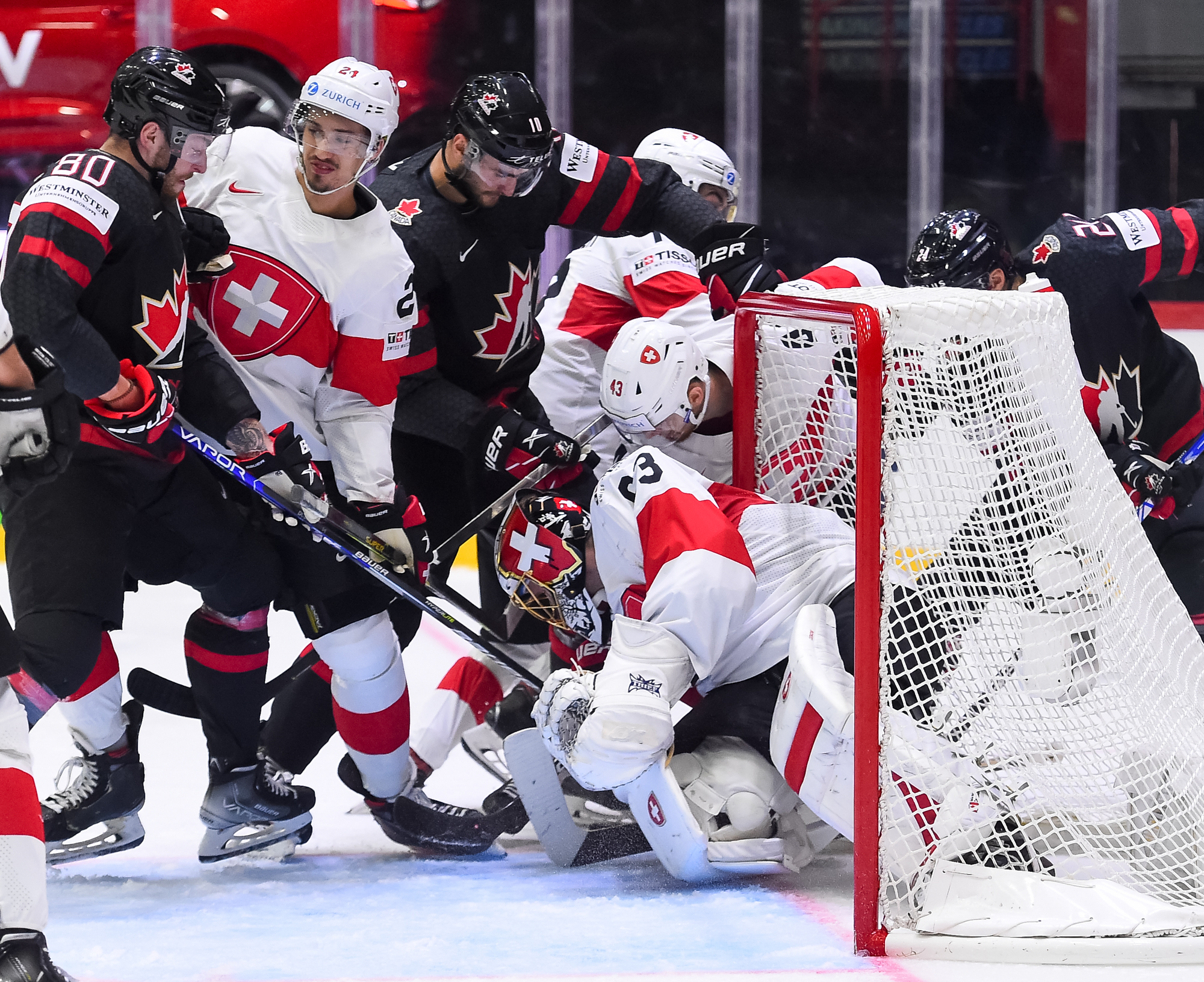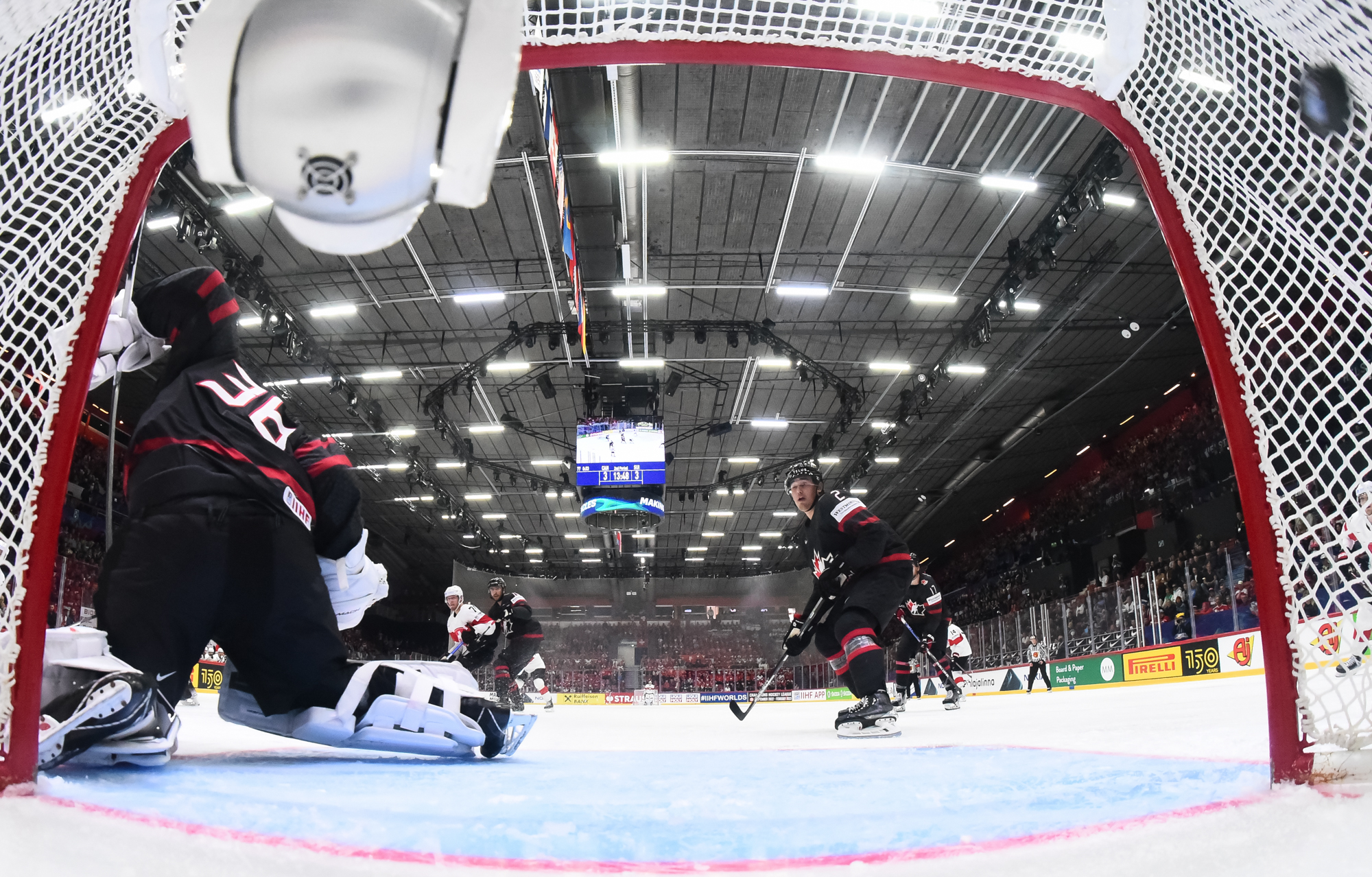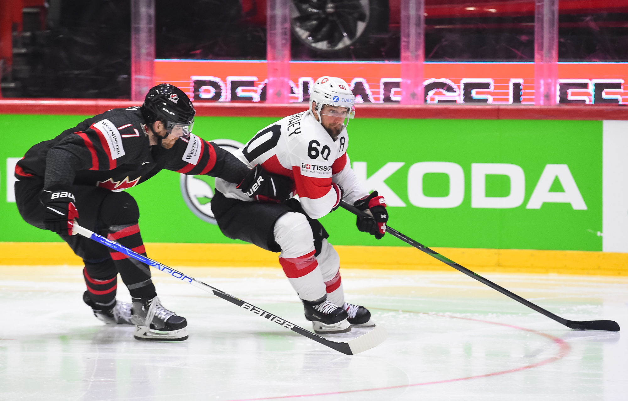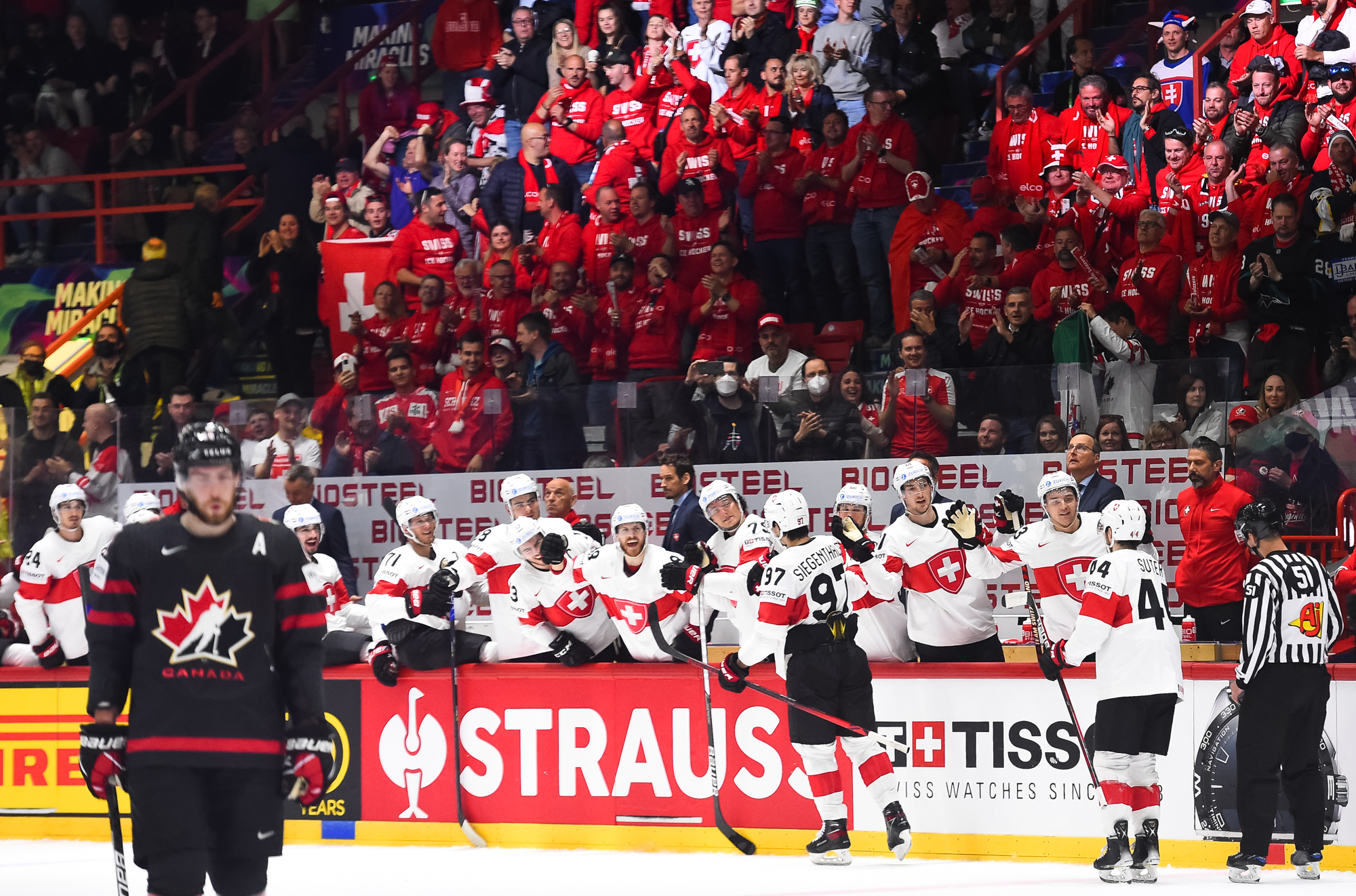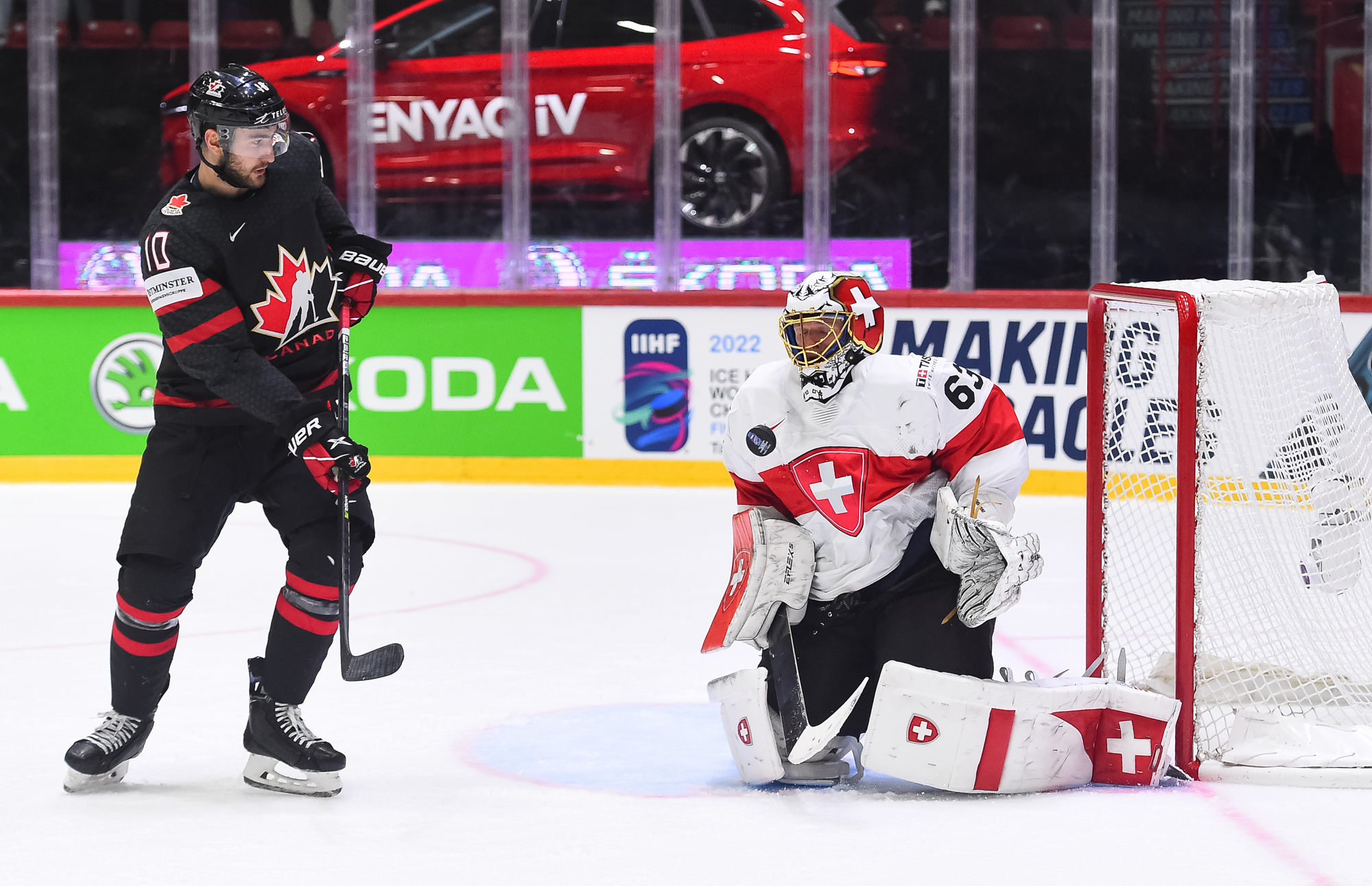 Sveitsiläiset luulivat jo avanneen maalitilinsä, mutta videotarkistuksen perusteella maali hylättiin Nico Hischierin estettyä Logan Thompsonia torjumasta.