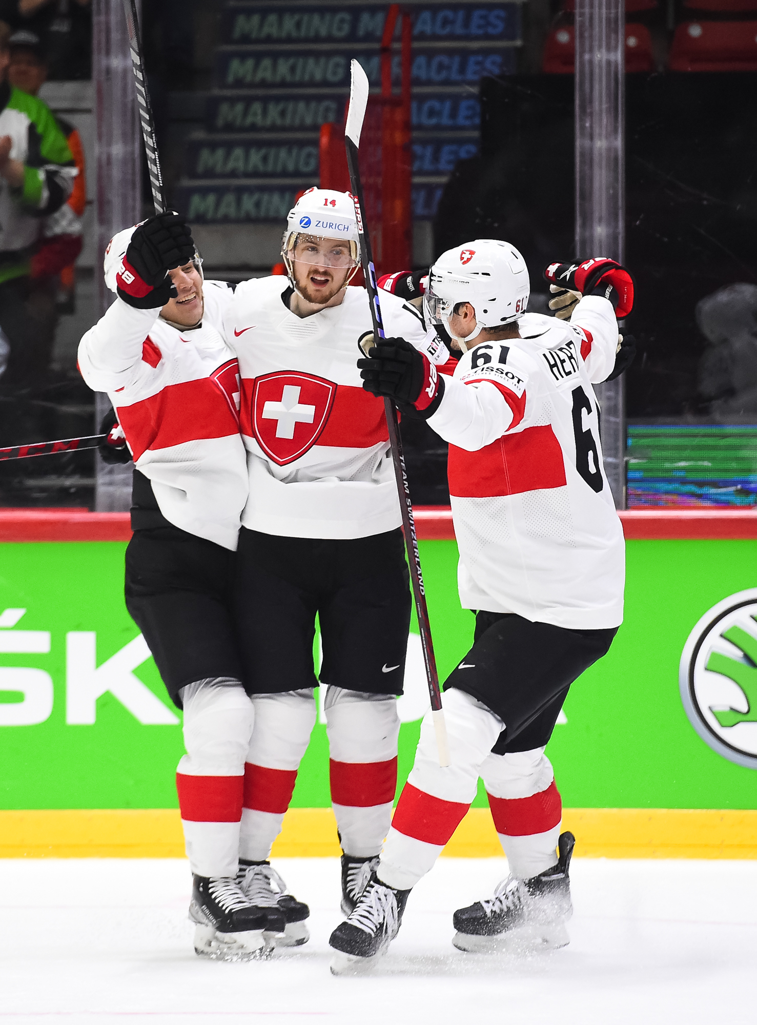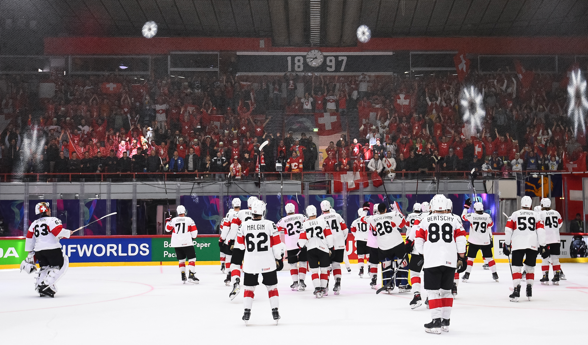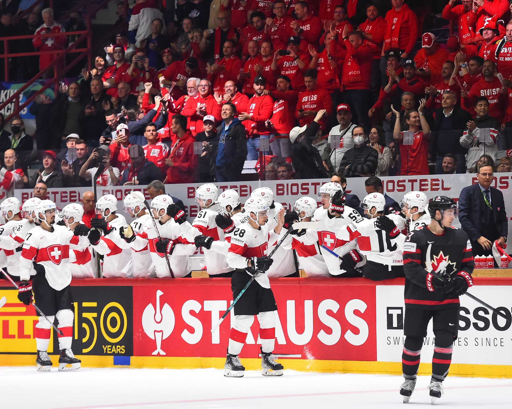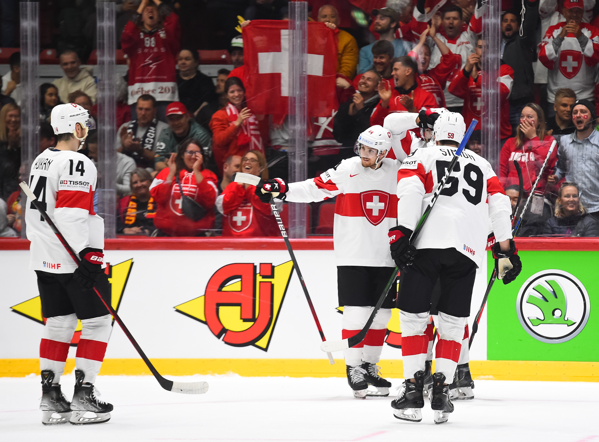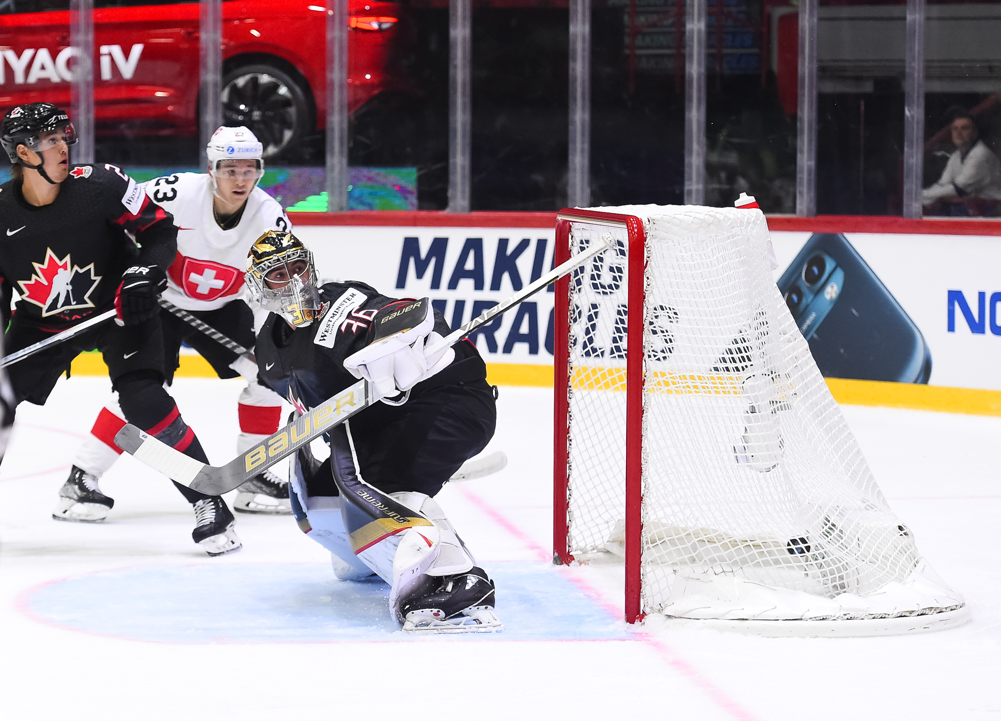 Sveitsiläiset luulivat jo avanneen maalitilinsä, mutta videotarkistuksen perusteella maali hylättiin Nico Hischierin estettyä Logan Thompsonia torjumasta.