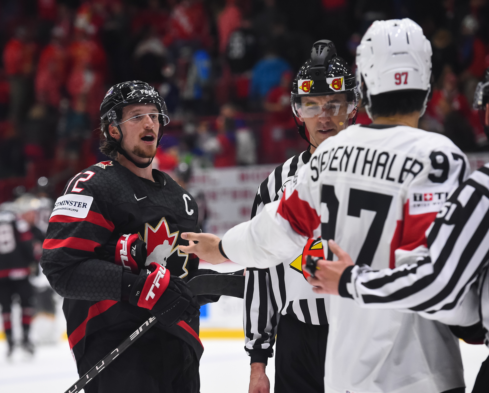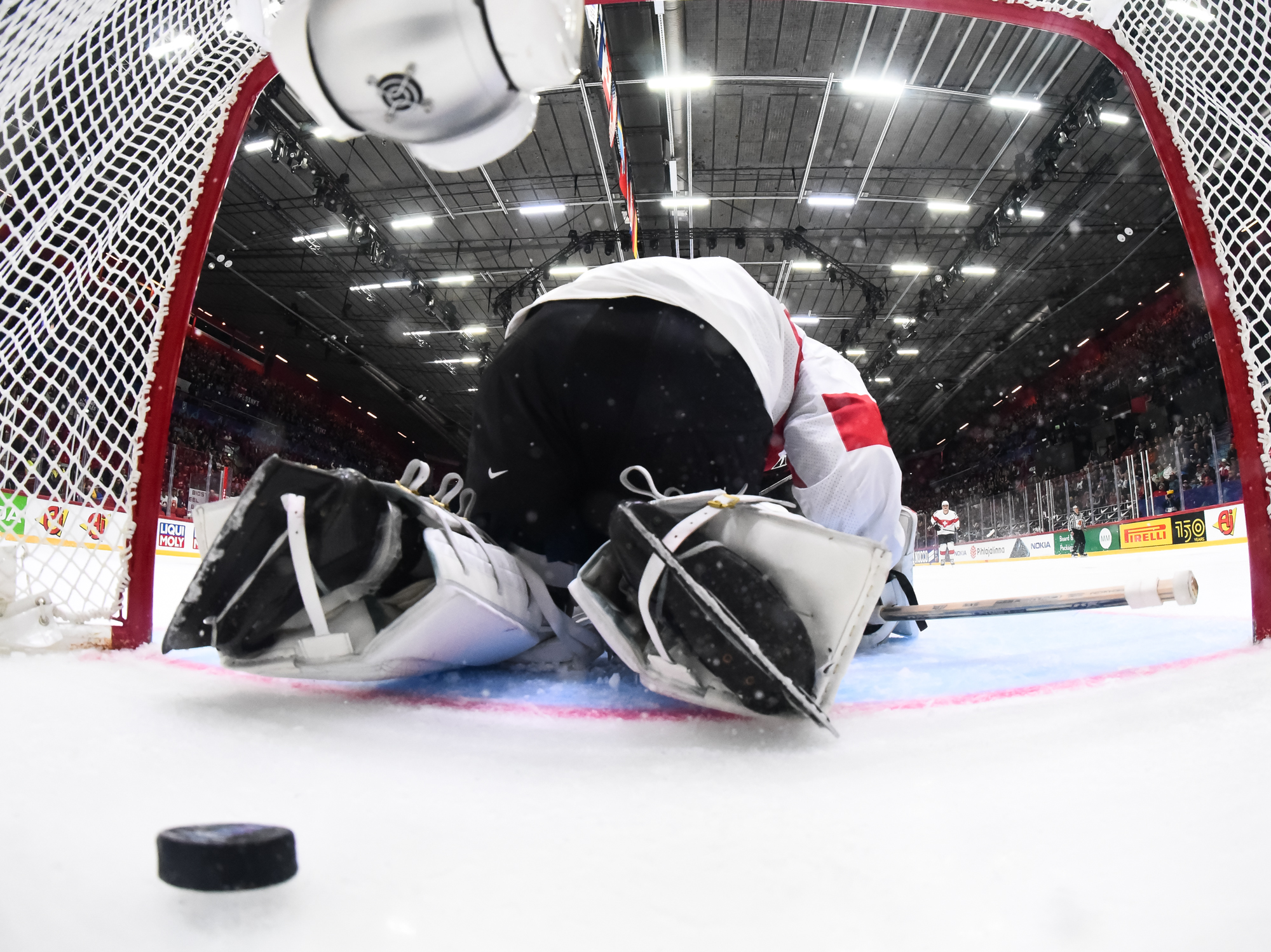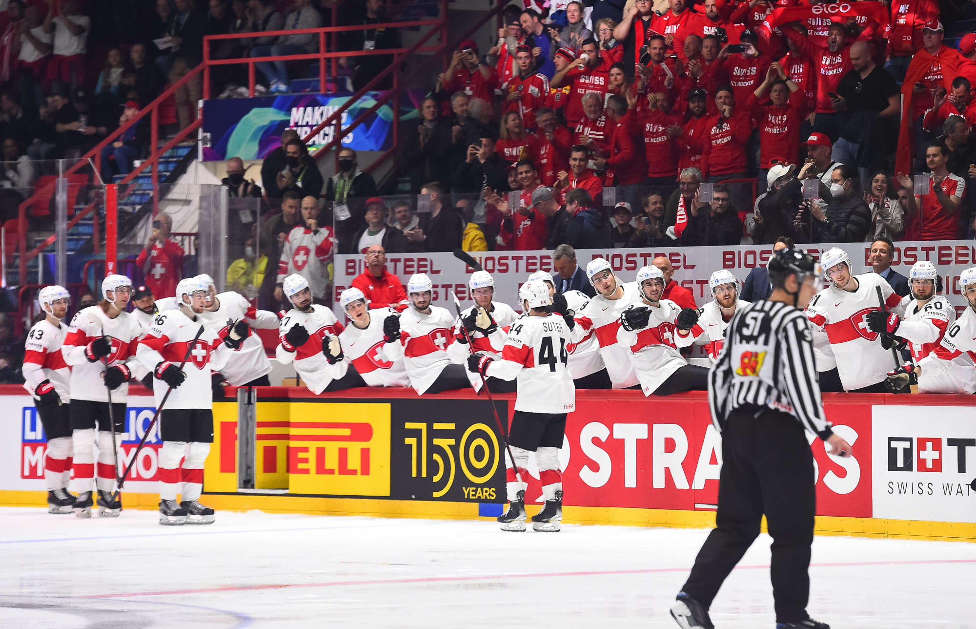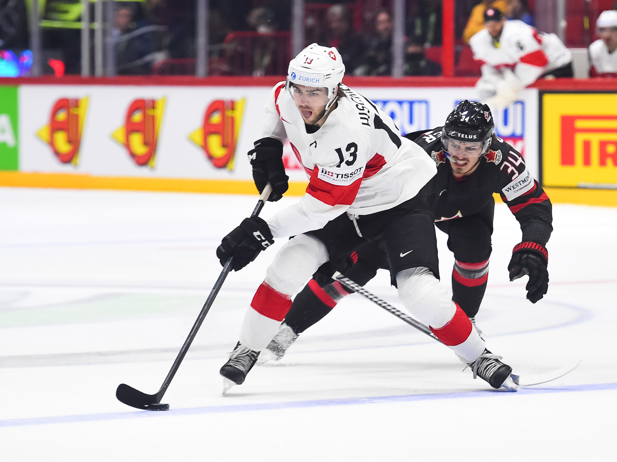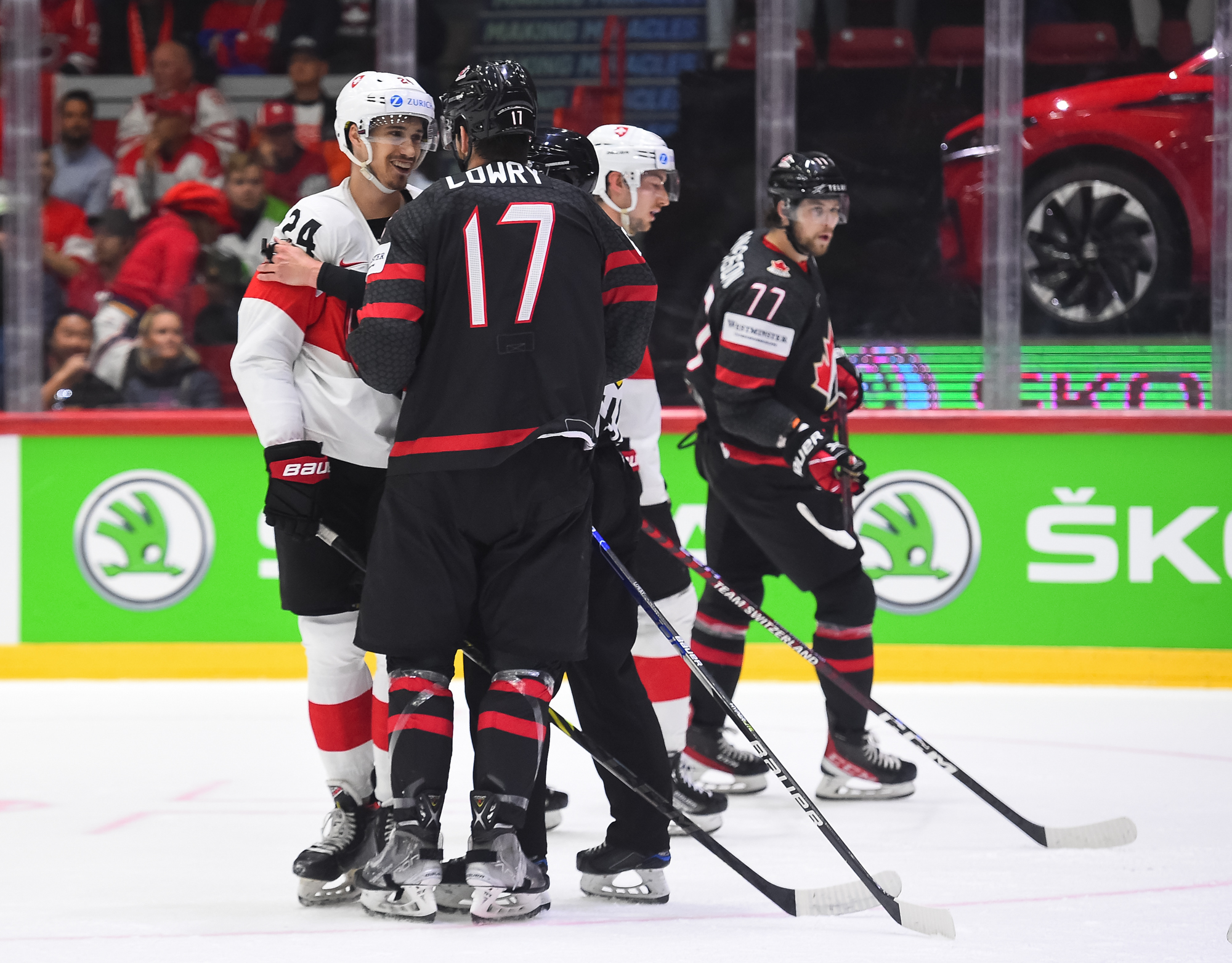 Sveitsiläiset luulivat jo avanneen maalitilinsä, mutta videotarkistuksen perusteella maali hylättiin Nico Hischierin estettyä Logan Thompsonia torjumasta.