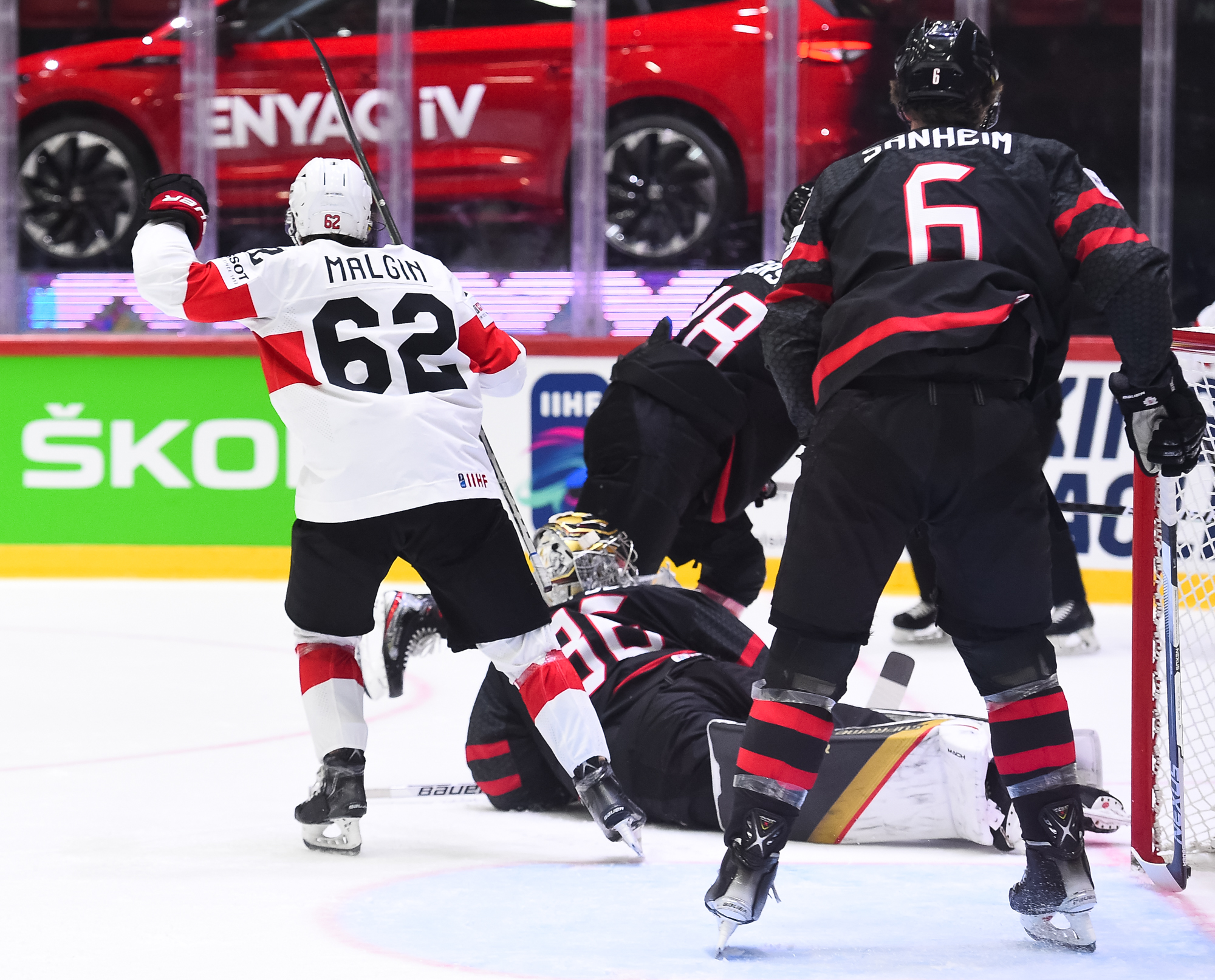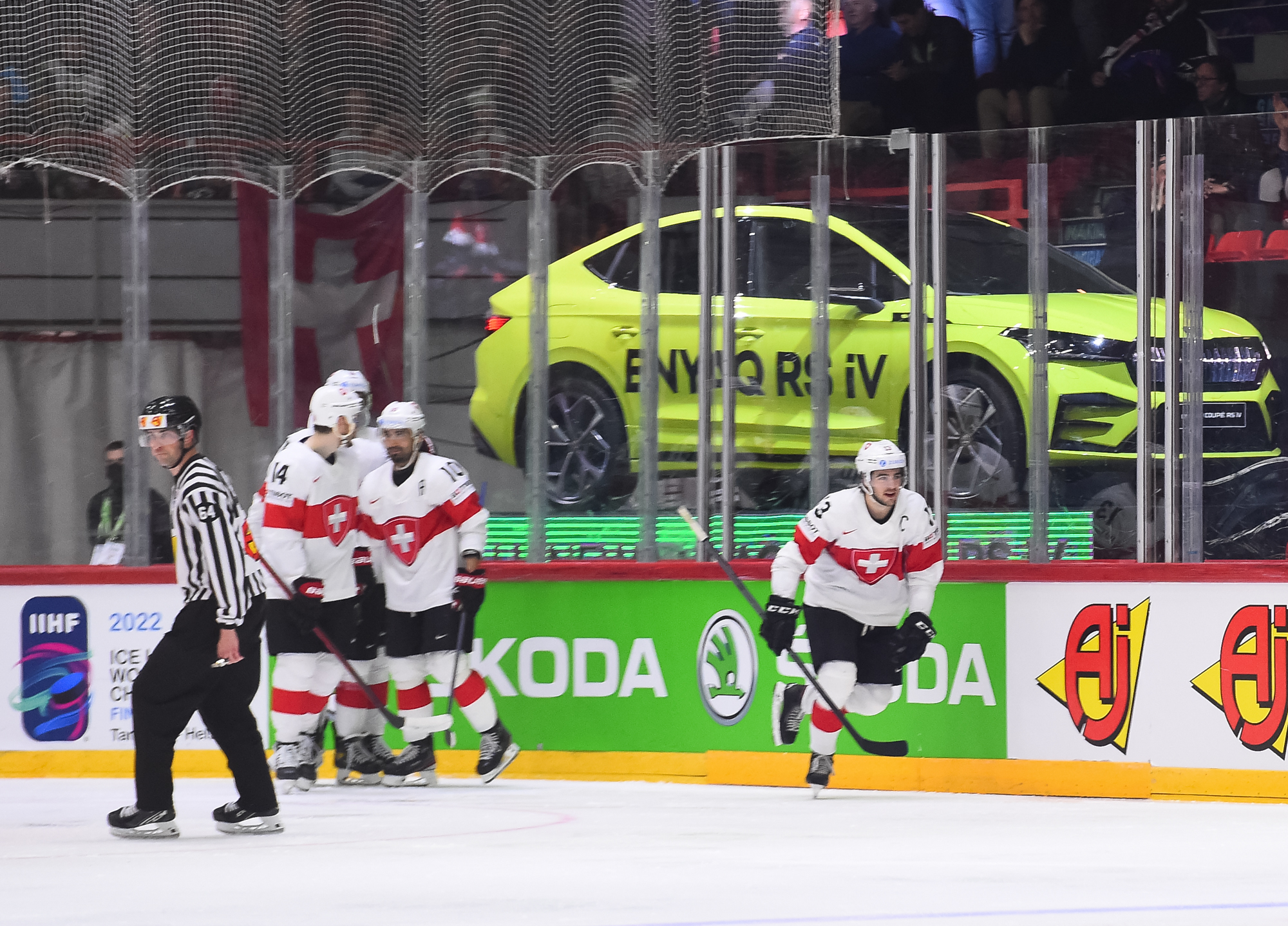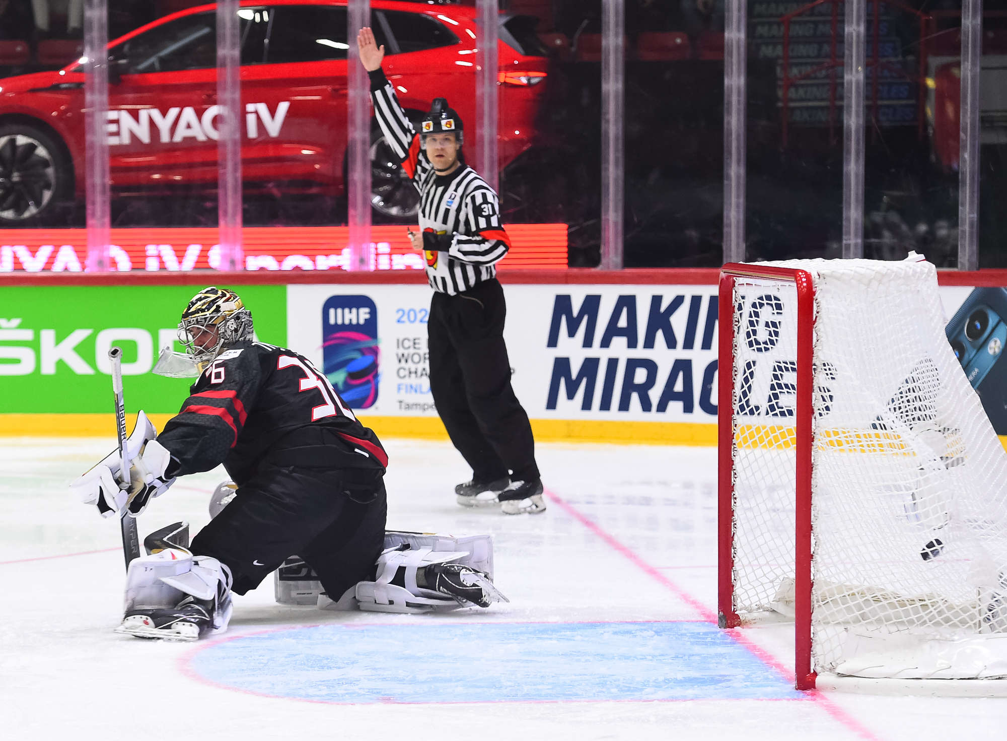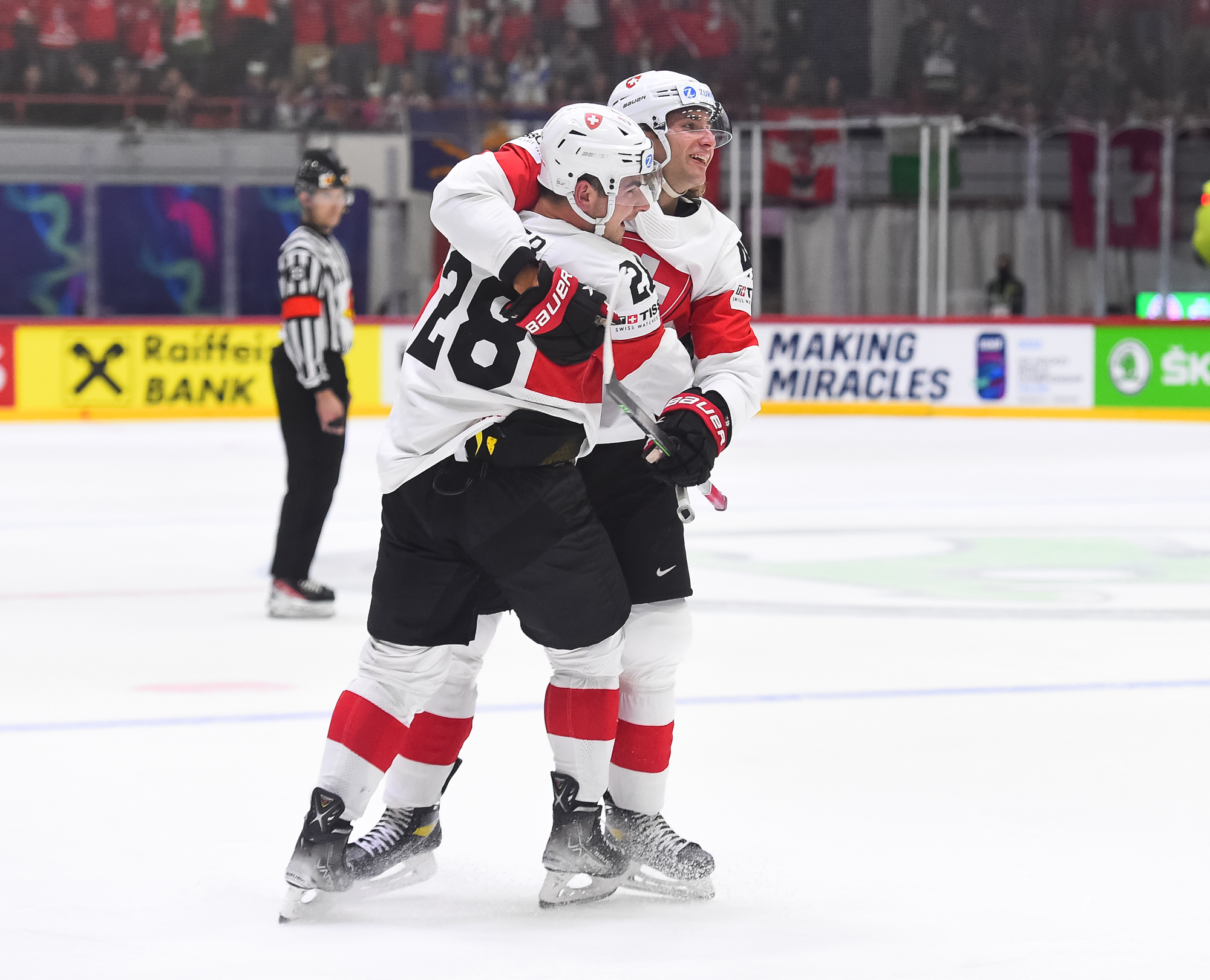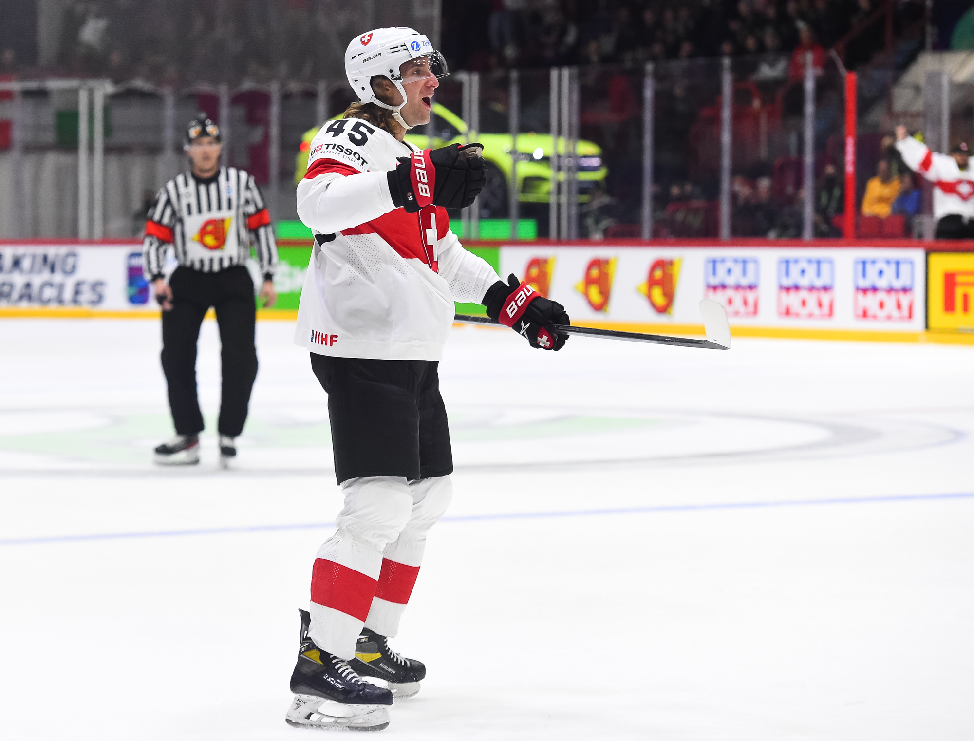 Sveitsiläiset luulivat jo avanneen maalitilinsä, mutta videotarkistuksen perusteella maali hylättiin Nico Hischierin estettyä Logan Thompsonia torjumasta.