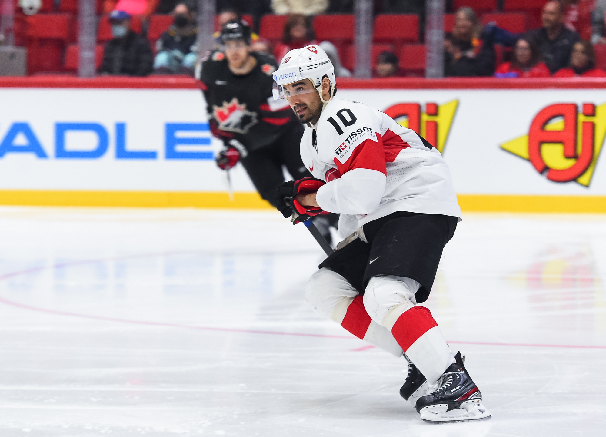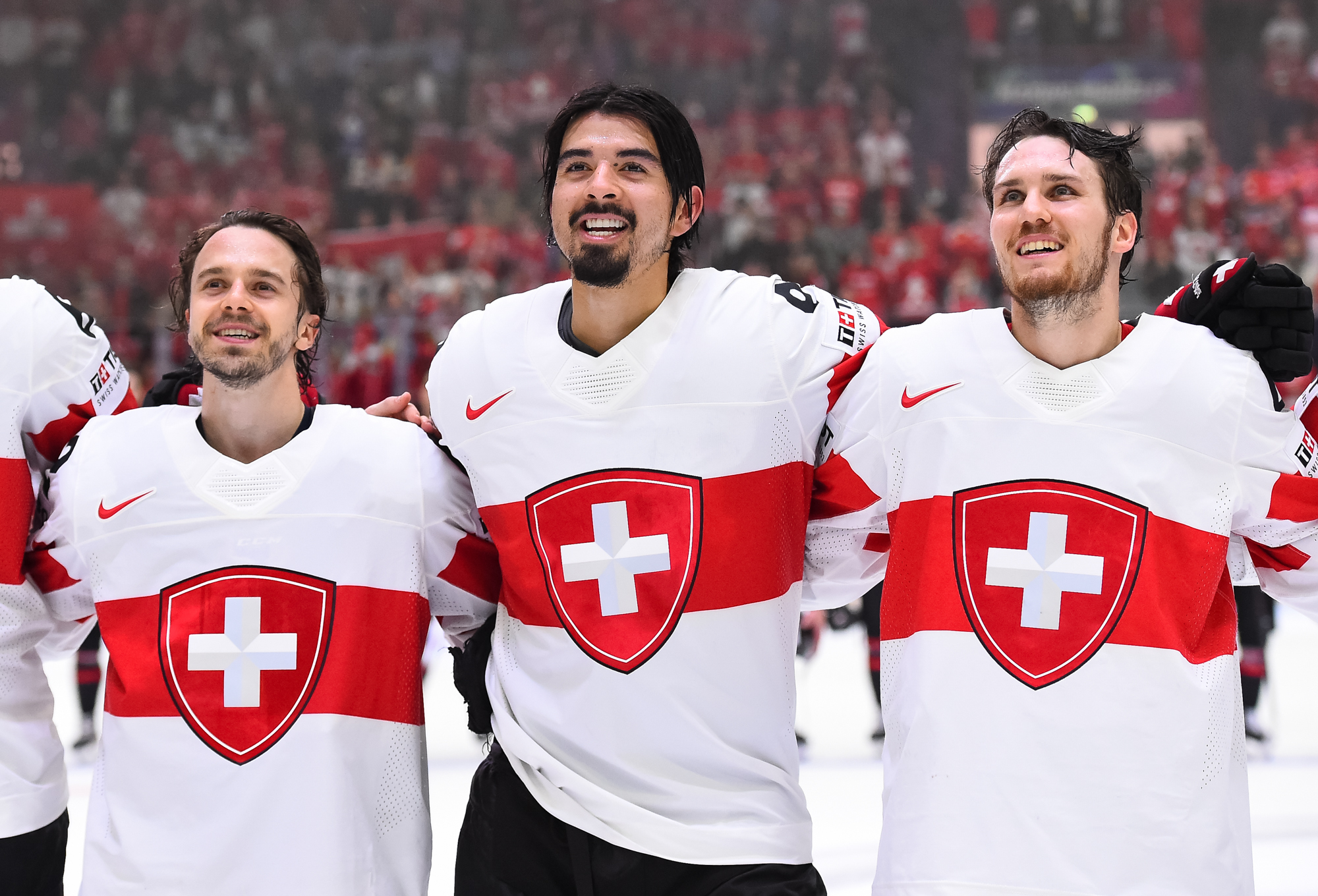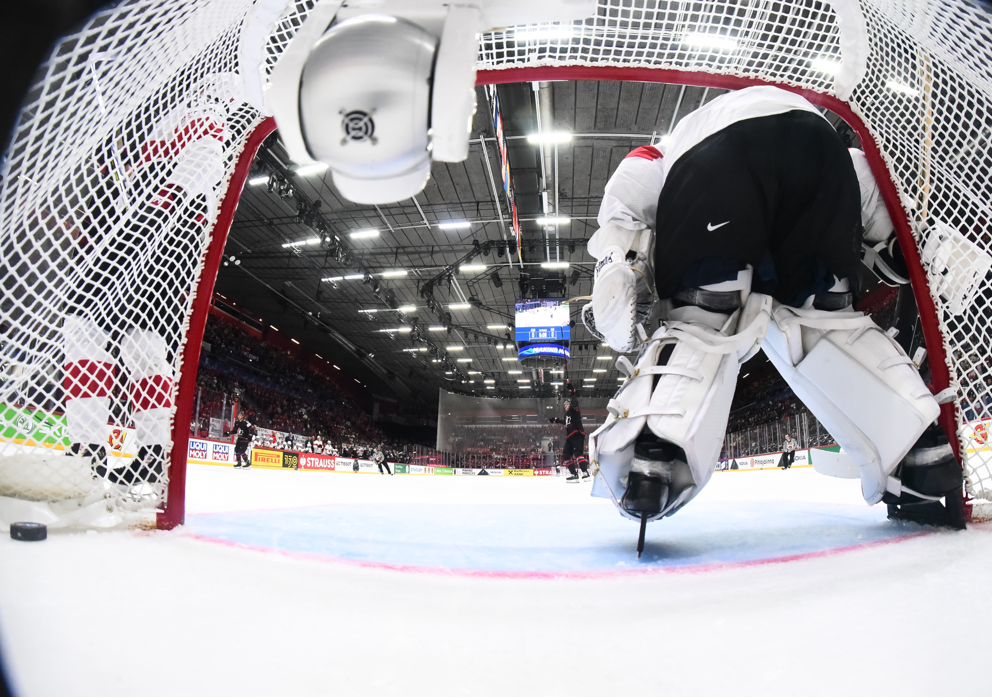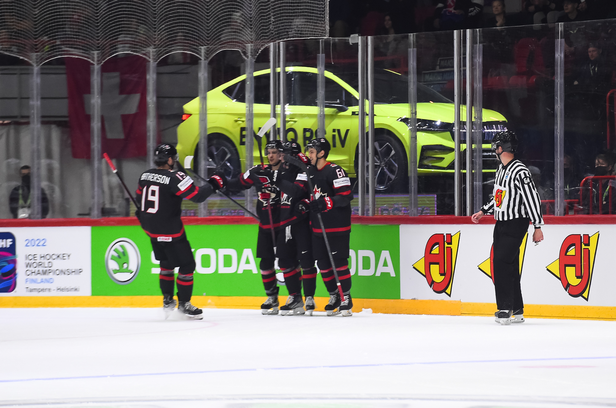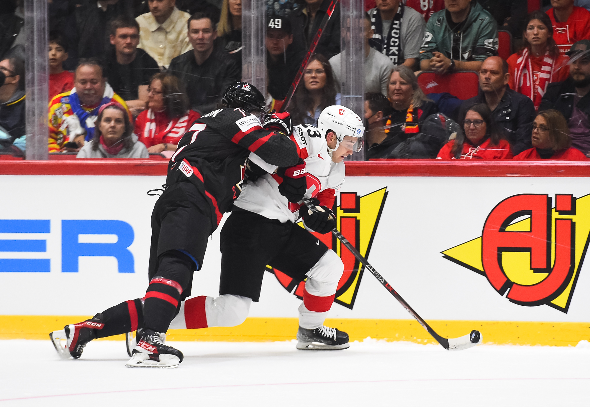 Sveitsiläiset luulivat jo avanneen maalitilinsä, mutta videotarkistuksen perusteella maali hylättiin Nico Hischierin estettyä Logan Thompsonia torjumasta.