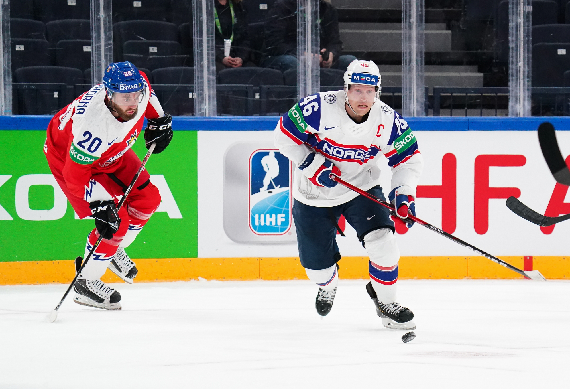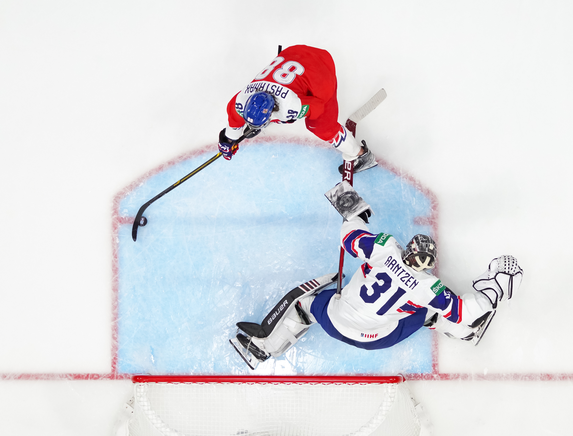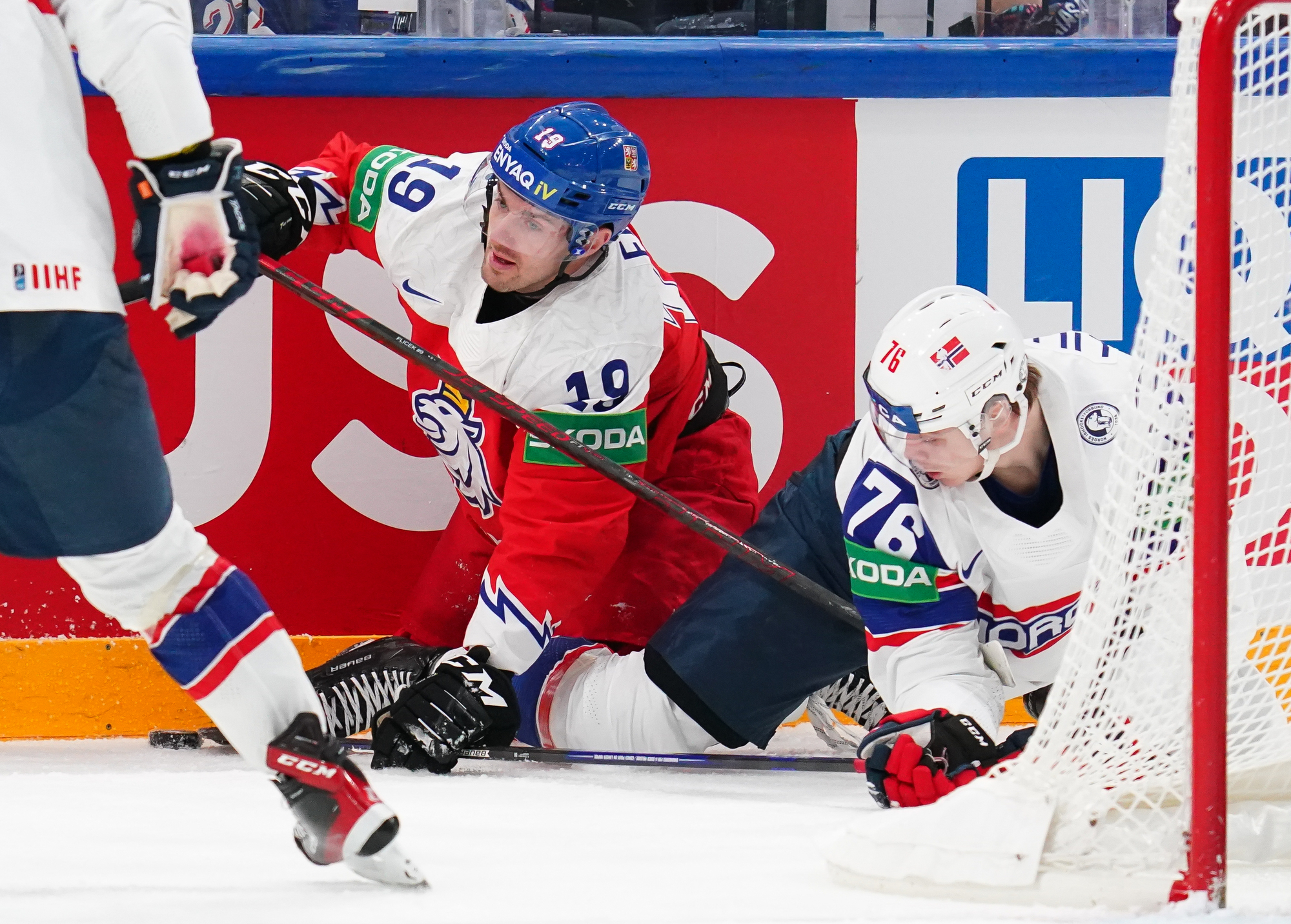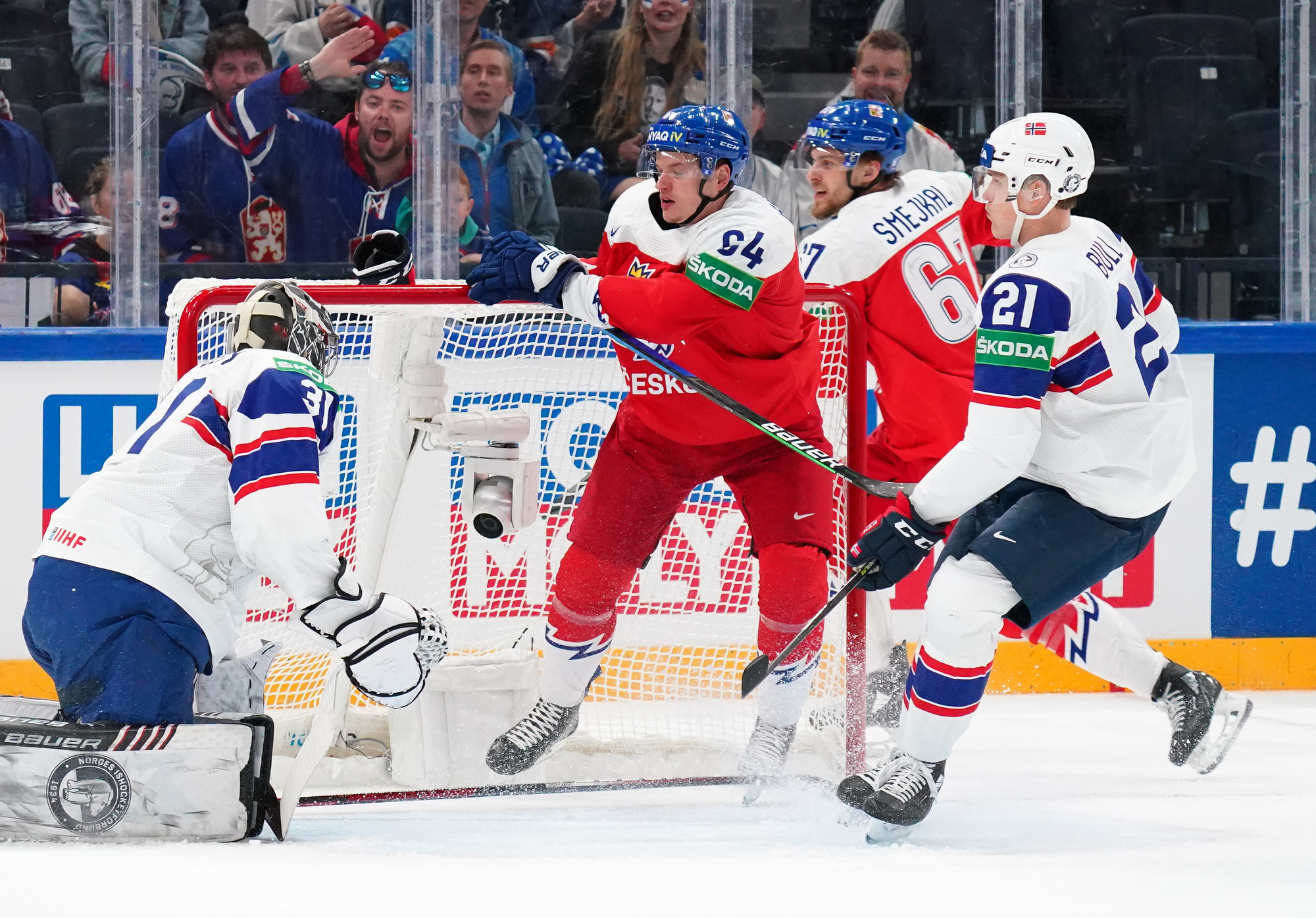 David Pastrnak teki kaksi maalia; ensimmäisessä erässä ylivoimalla ja kolmannessa erässä rangaistuslaukauksesta ja johdatti Tshekin 4-1 voittoon Norjasta 2022 Jääkiekon MM-kisojen B-”lohkossa.