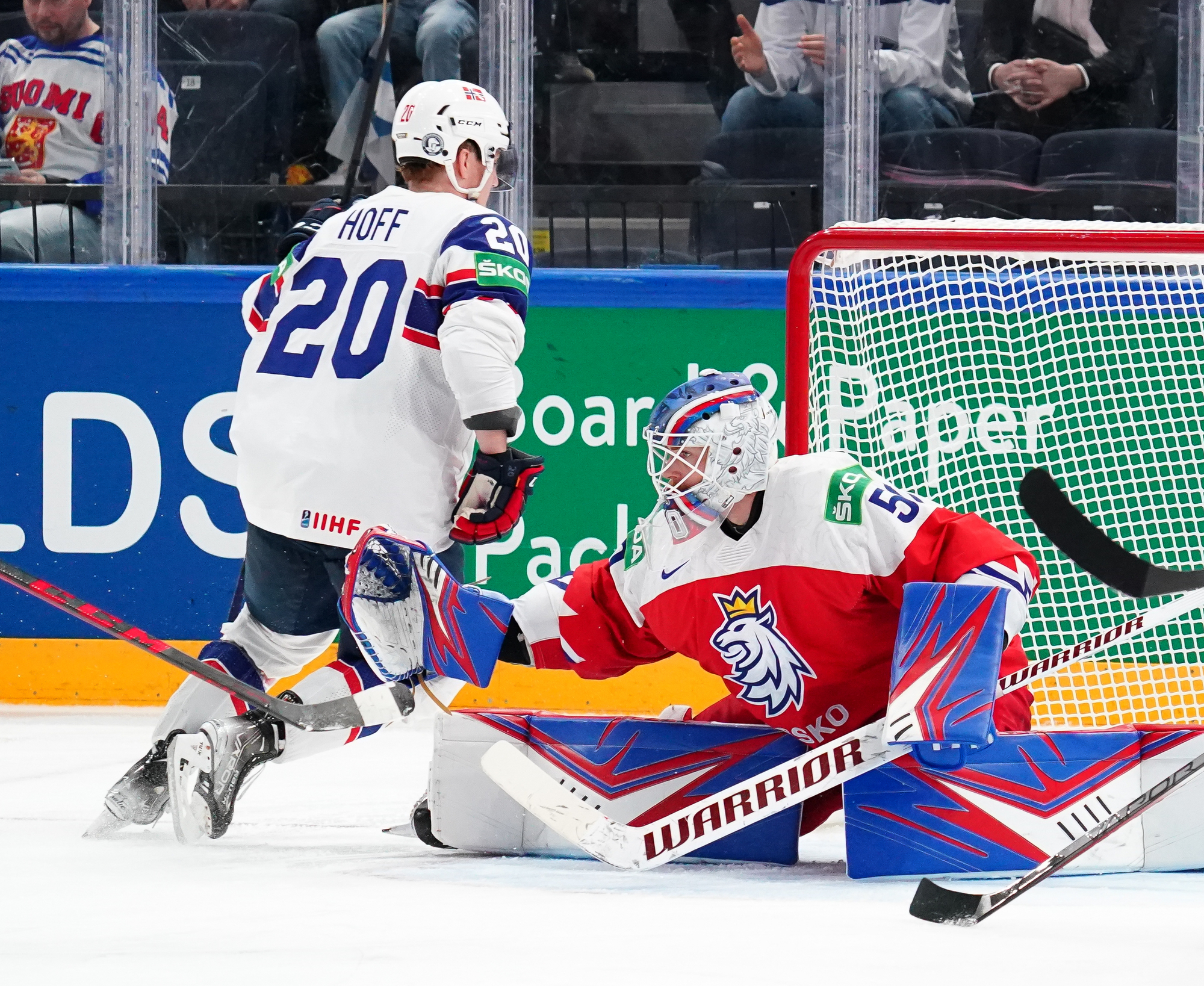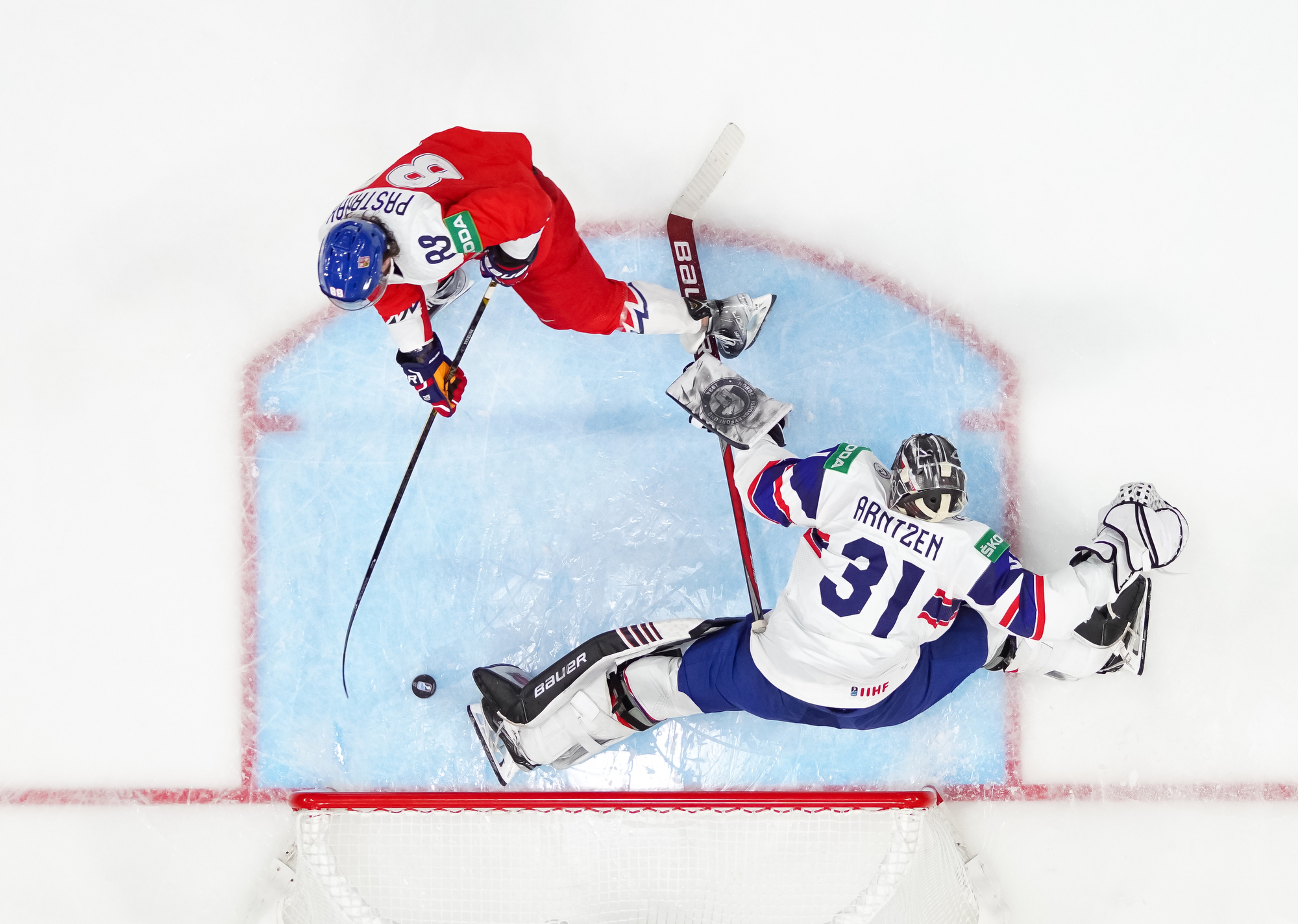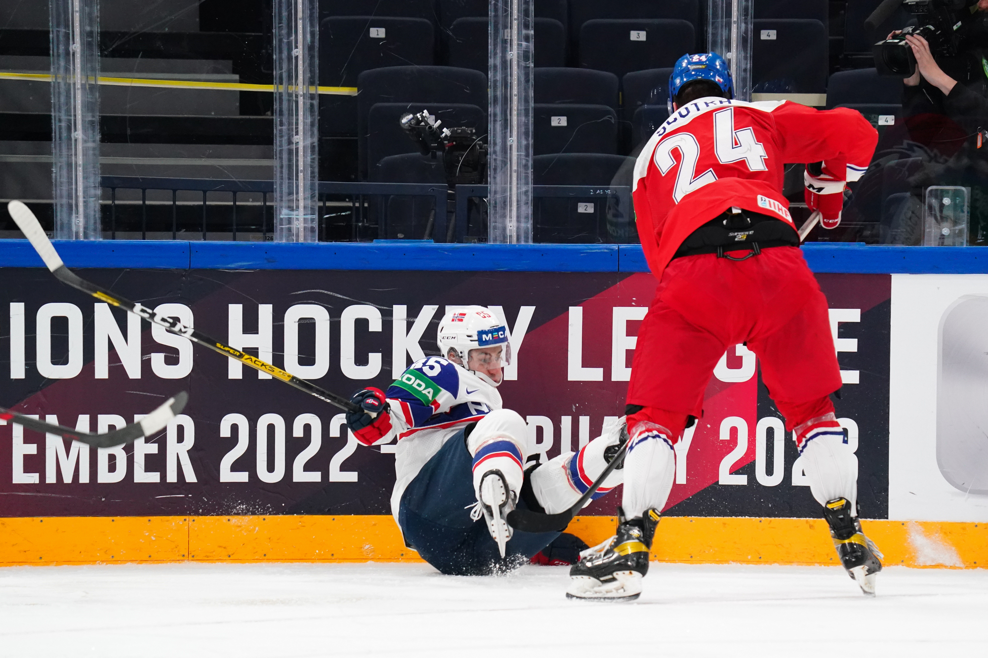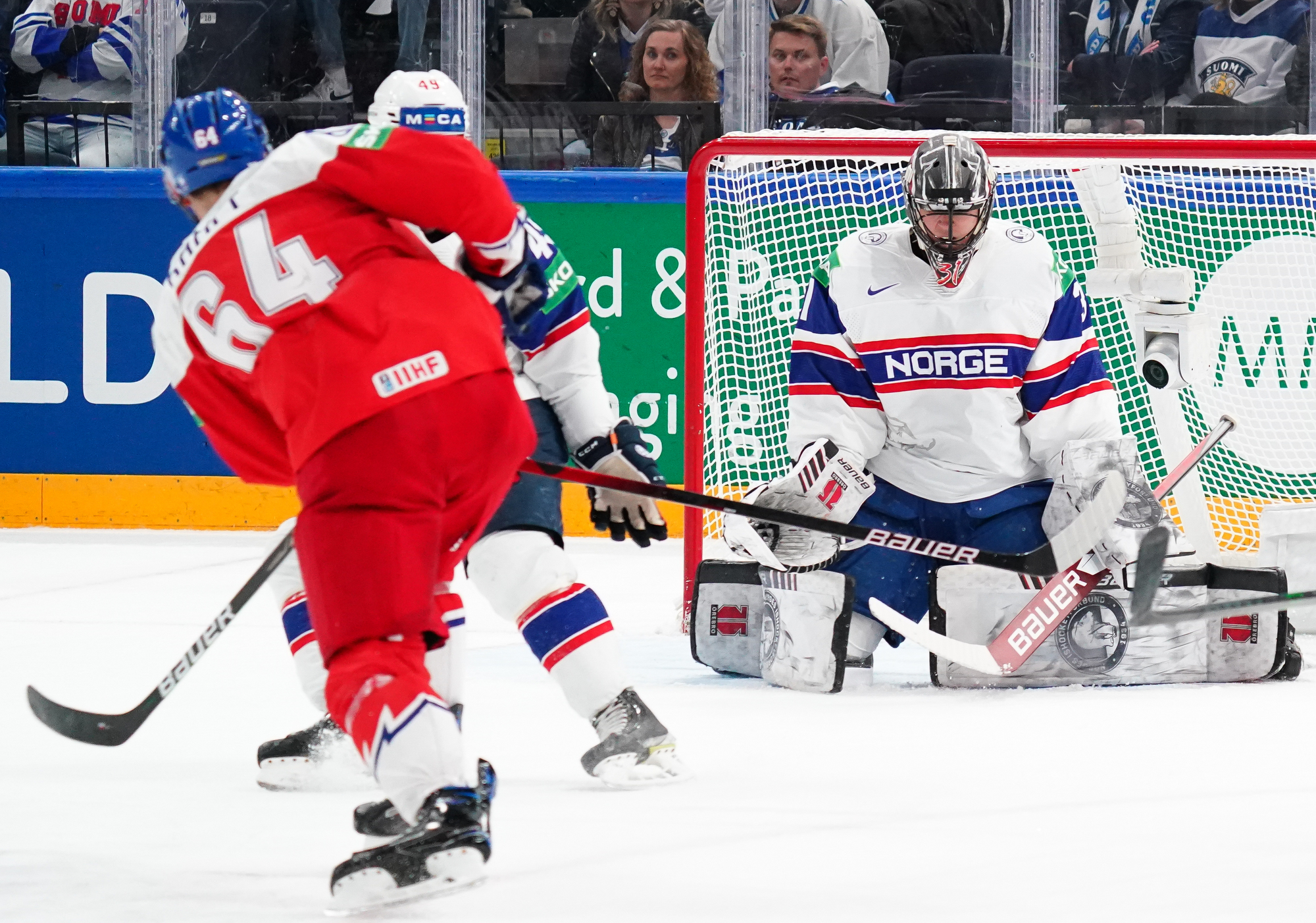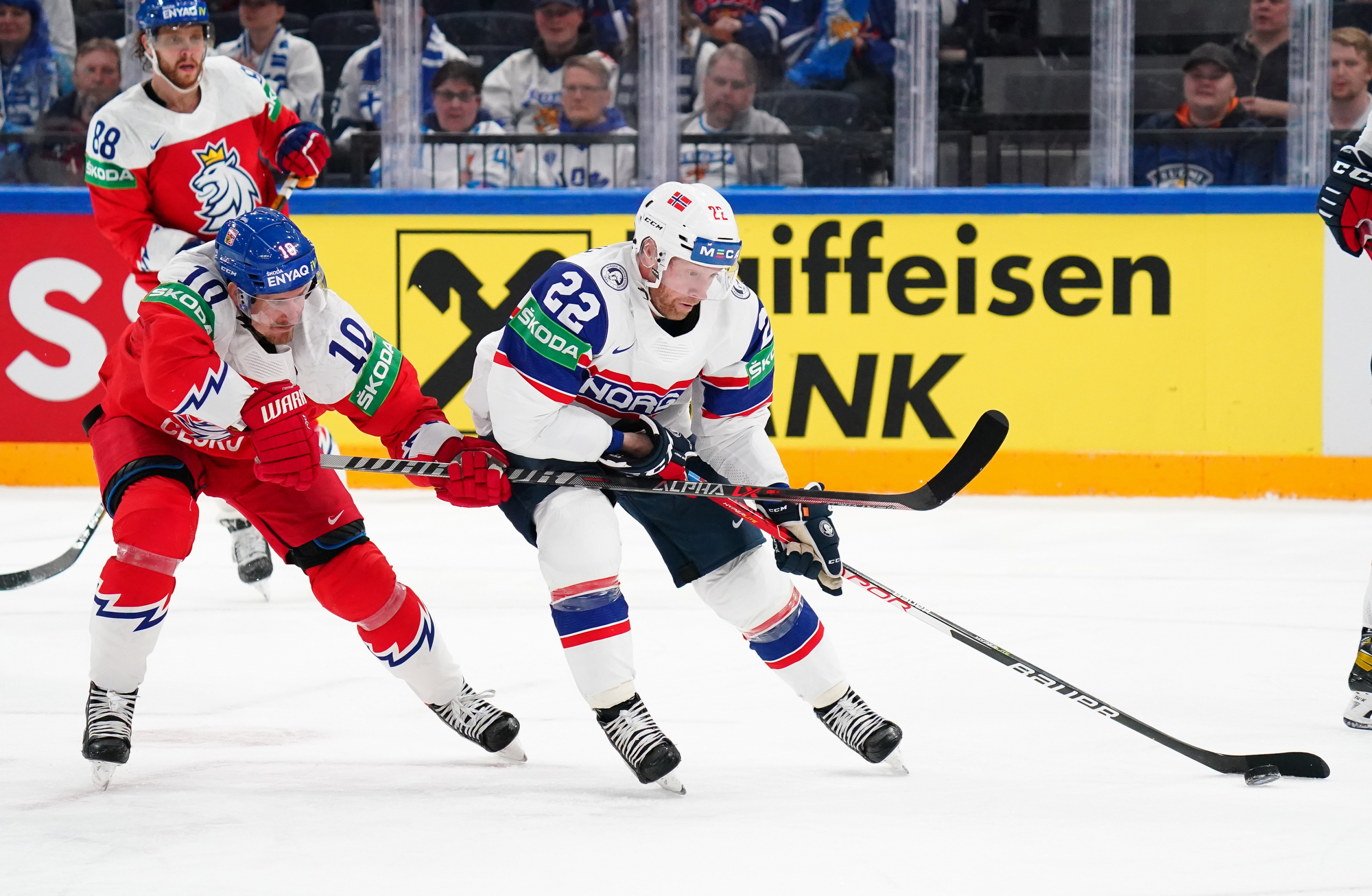David Pastrnak teki kaksi maalia; ensimmäisessä erässä ylivoimalla ja kolmannessa erässä rangaistuslaukauksesta ja johdatti Tshekin 4-1 voittoon Norjasta 2022 Jääkiekon MM-kisojen B-”lohkossa.