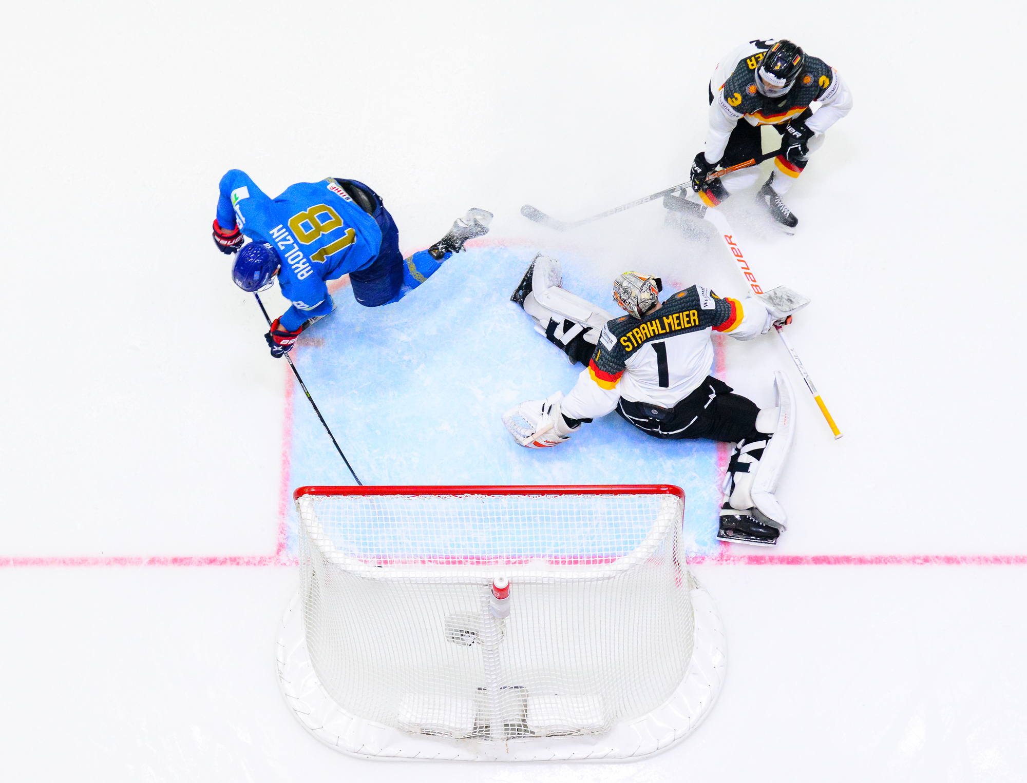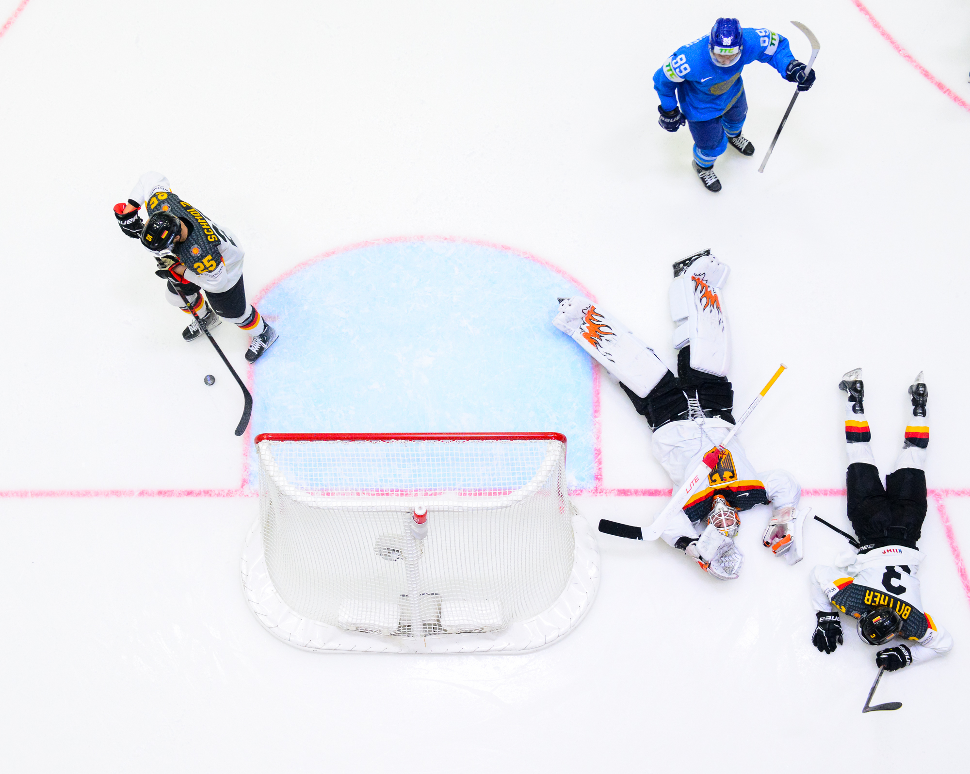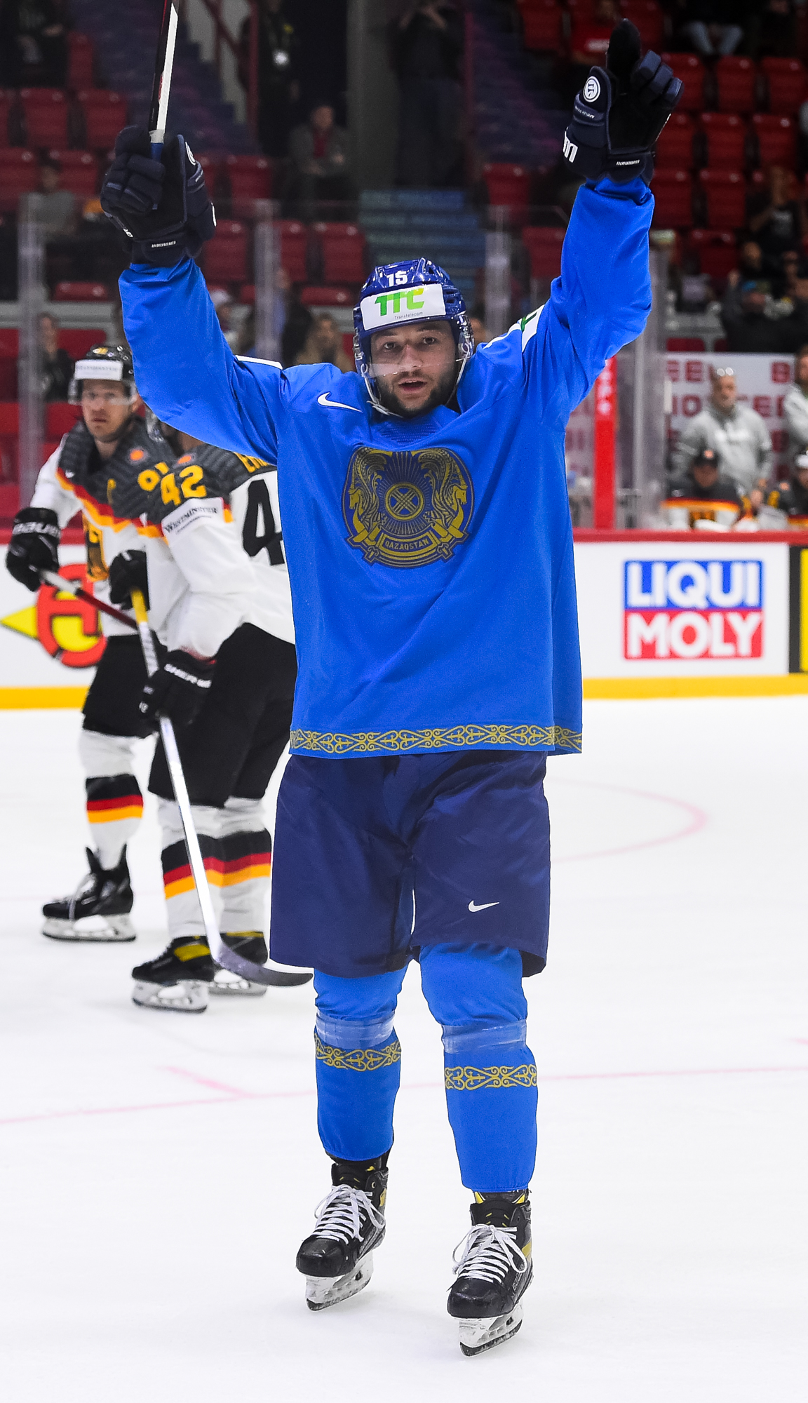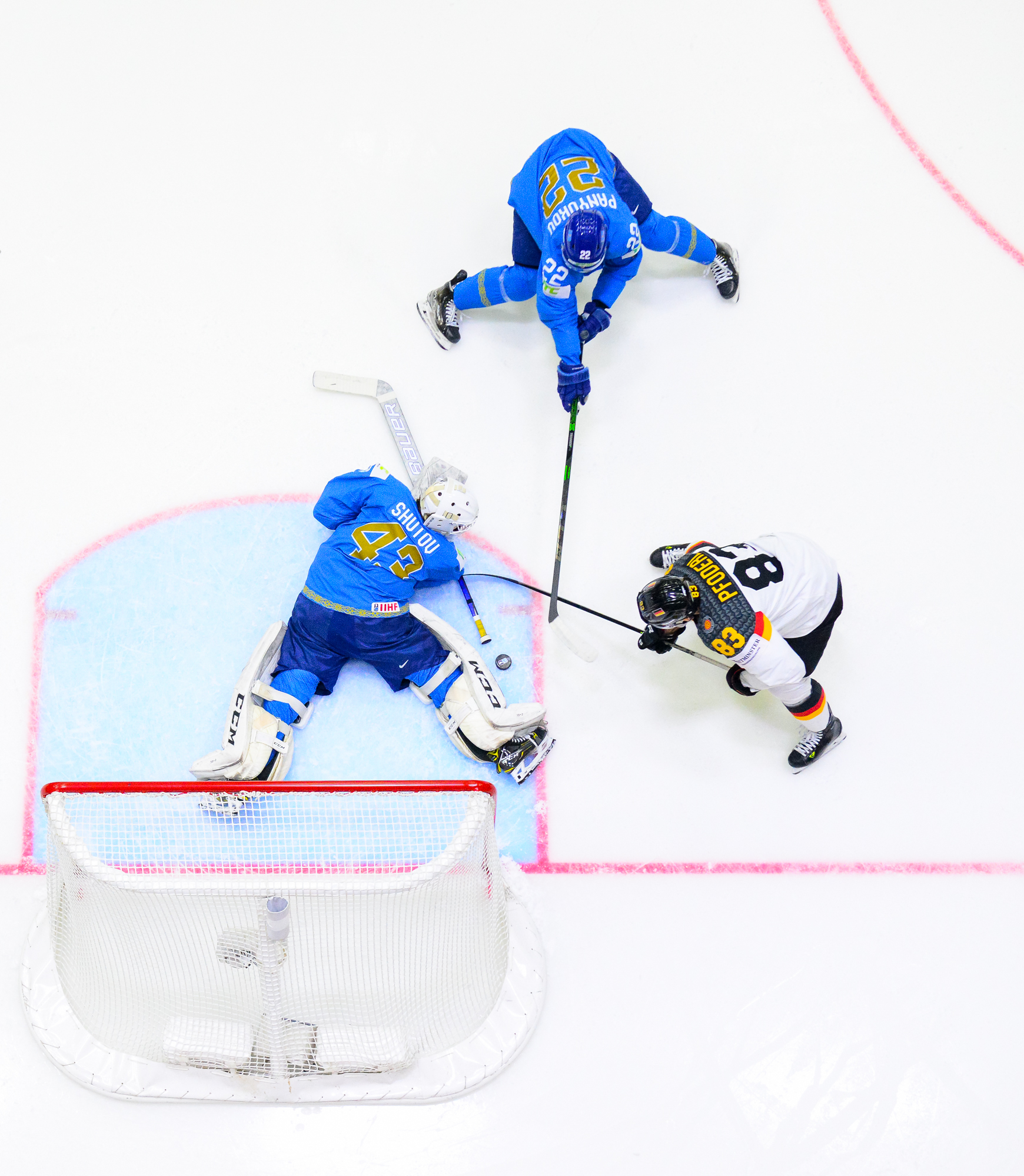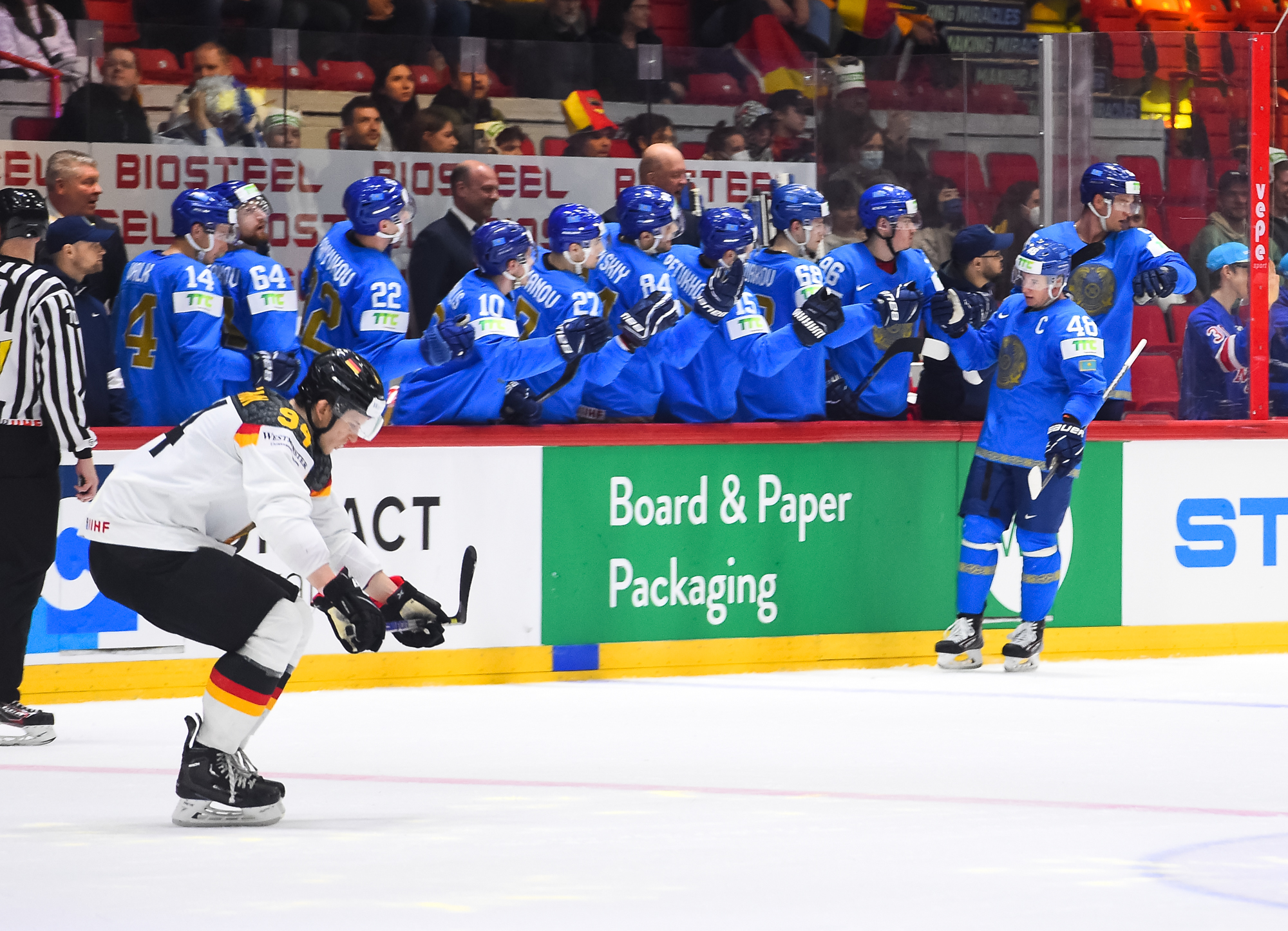 Kazakstanilla oli hetkensä ensimmäisessä erässä. Se johti peliä ensin 1-0 ja myöhemmin 2-1, mutta molemmilla kerroilla joukkue päästi nopean tasoitusmaalin taakseen. Kapteeni Roman Starshenko aloitti maalinteon ajassa 02:57 kääntäessään kiekonmenetyksen edukseen saksalaisten siniviivalla. Maajoukkueessa debyyttiotteluaan pelannut saksalaismaalivahti Dustin Strahlmeier joutui antautumaan kokeneelle kapteenille.