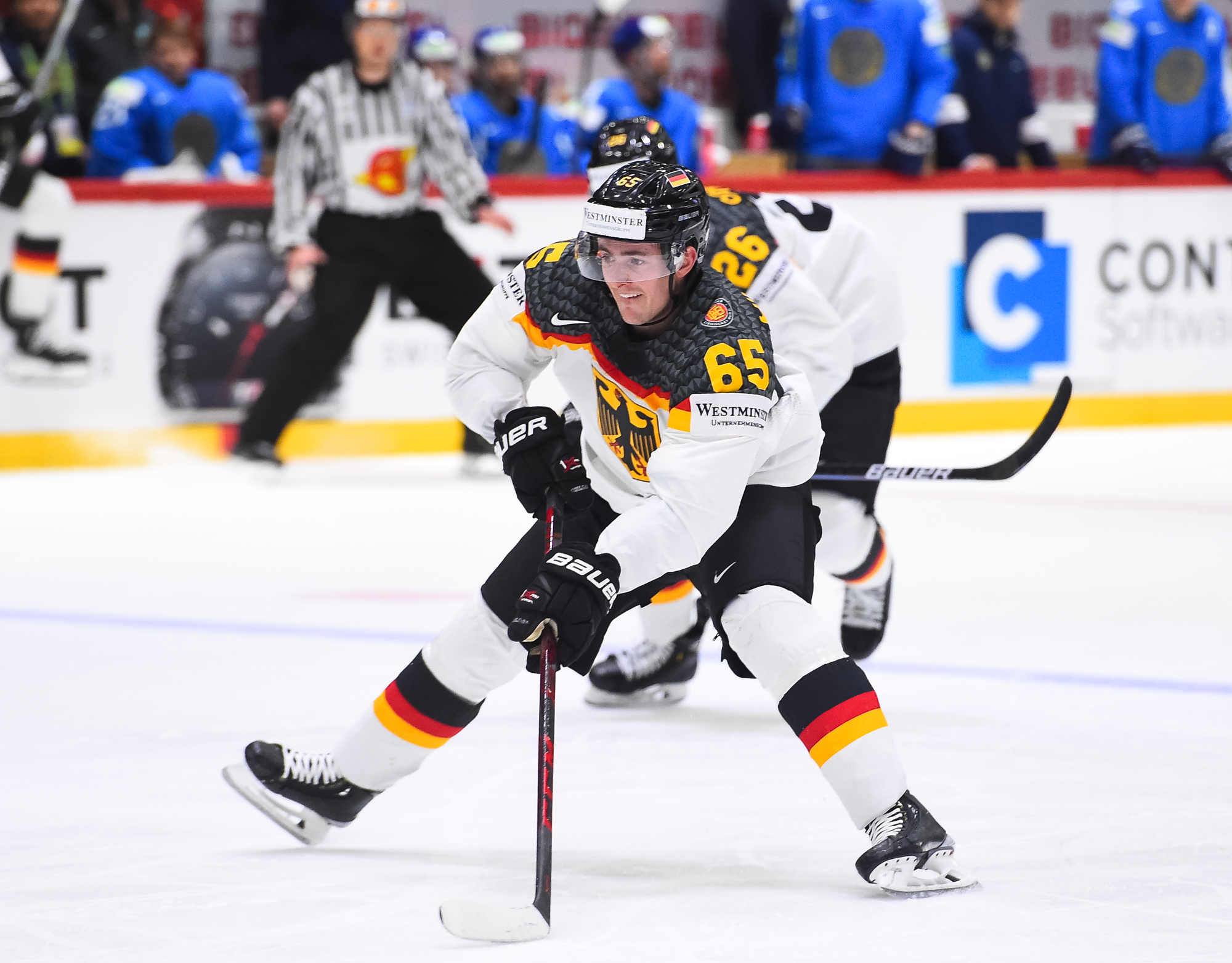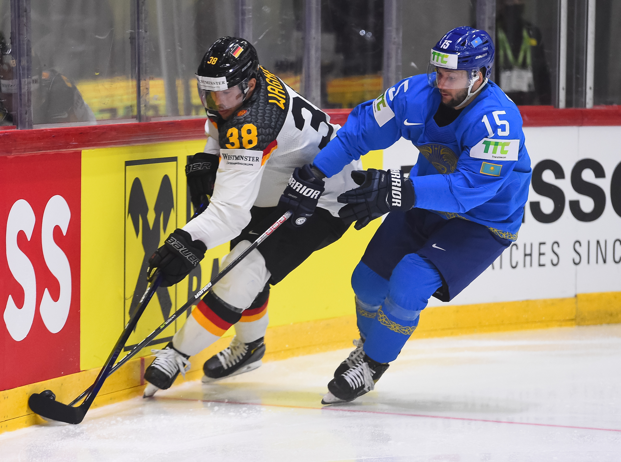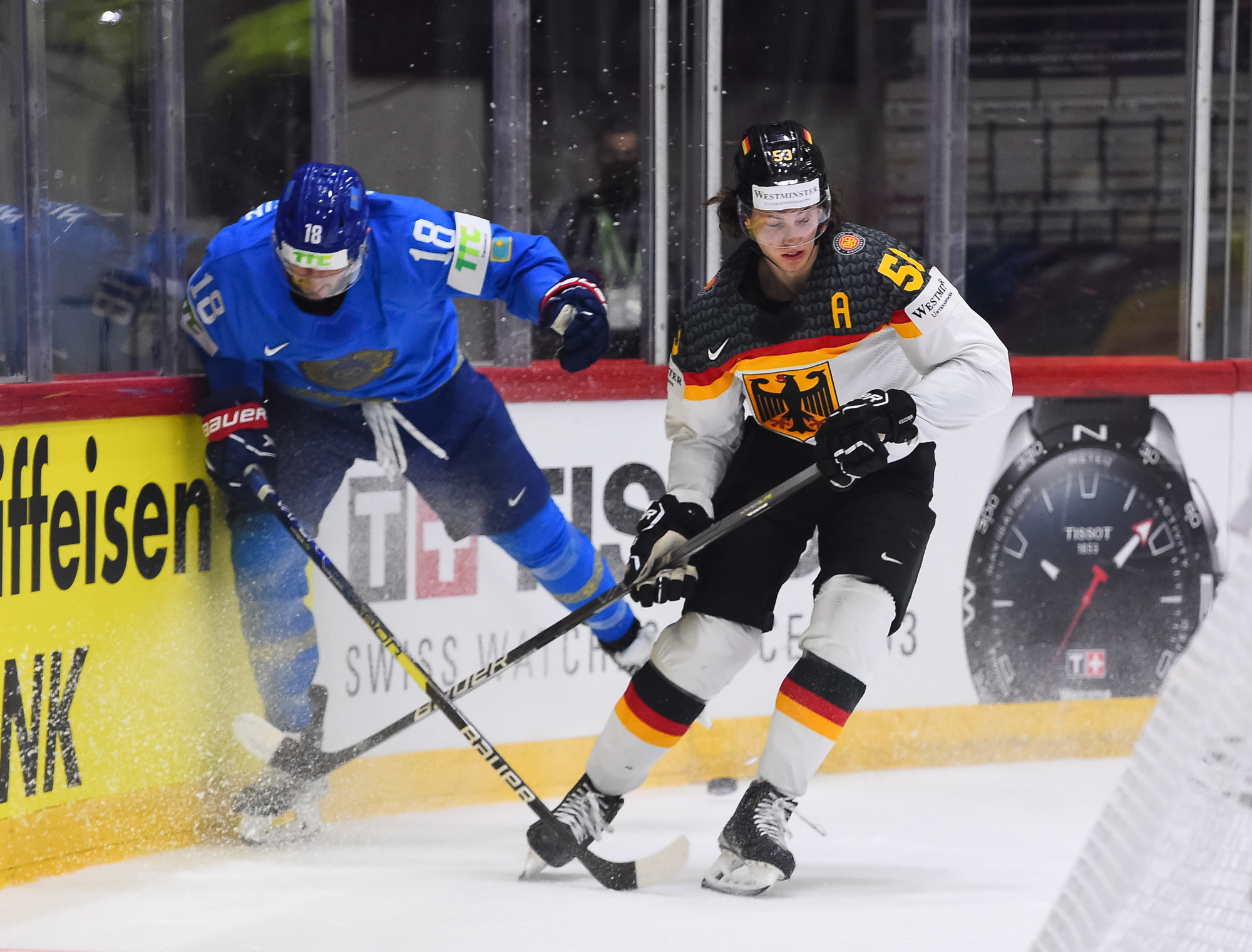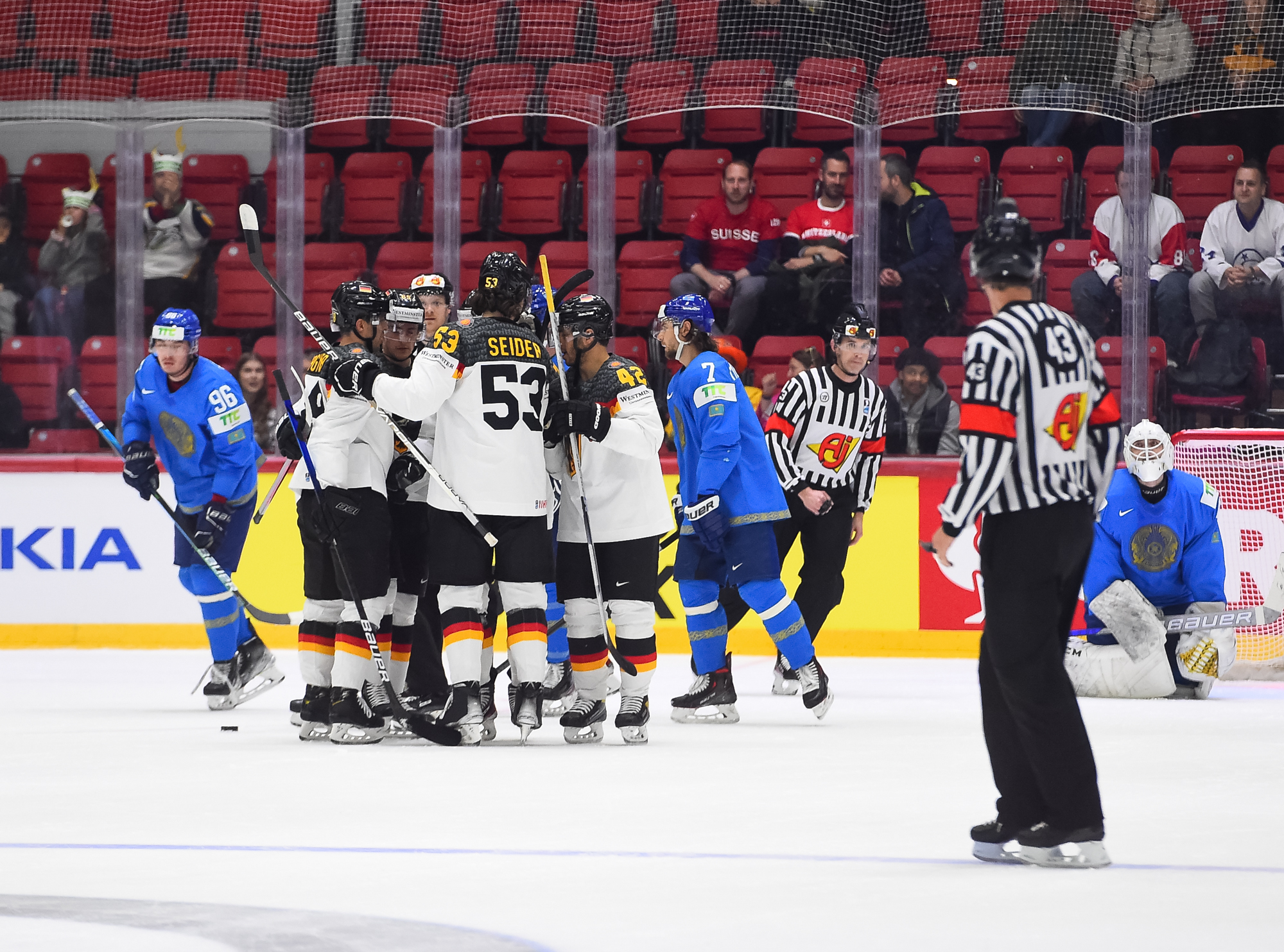 Myöhemmin ensimmäisen erän aikana sama kuvio toistui. Yegor Petukhov upotti kiekon maskin takaa Strahmeierin taakse mutta vain 24 sekuntia myöhemmin Leonhard Pföderl tasoitti ottelun lukemiin 2-2. Saksalaiset pääsivät ensimmäisen kerran johtoon ajassa 18:33 paluukiekosta, jonka Daniel Fischbuch käytti hyödykseen Kazakstanin puolustuksen nukahtaessa.